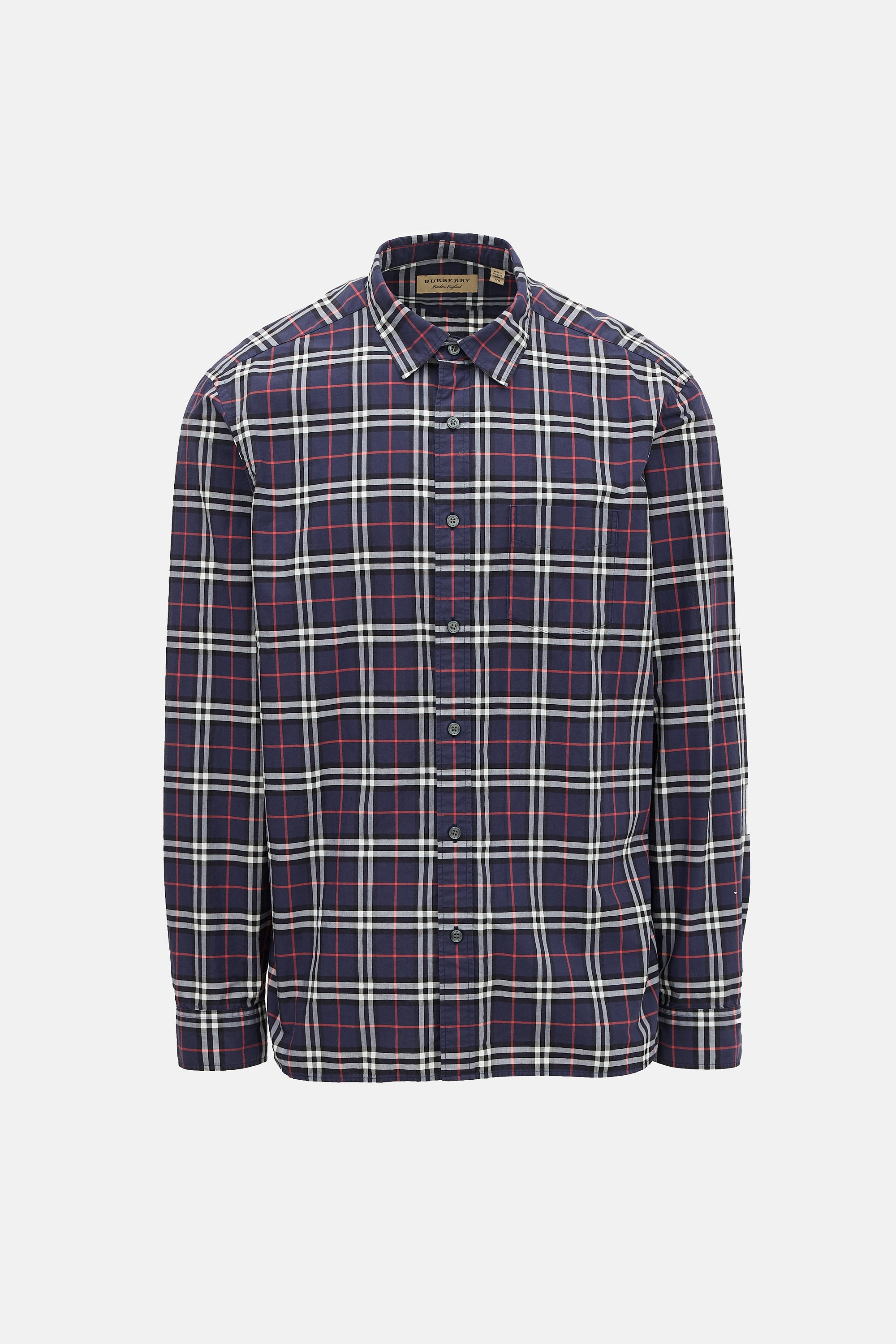 Pre-owned Burberry navy, white, and red shirt featuring signature Check pattern, spread collar, button up front, patch pocket at left chest, and buttoned cuffs.