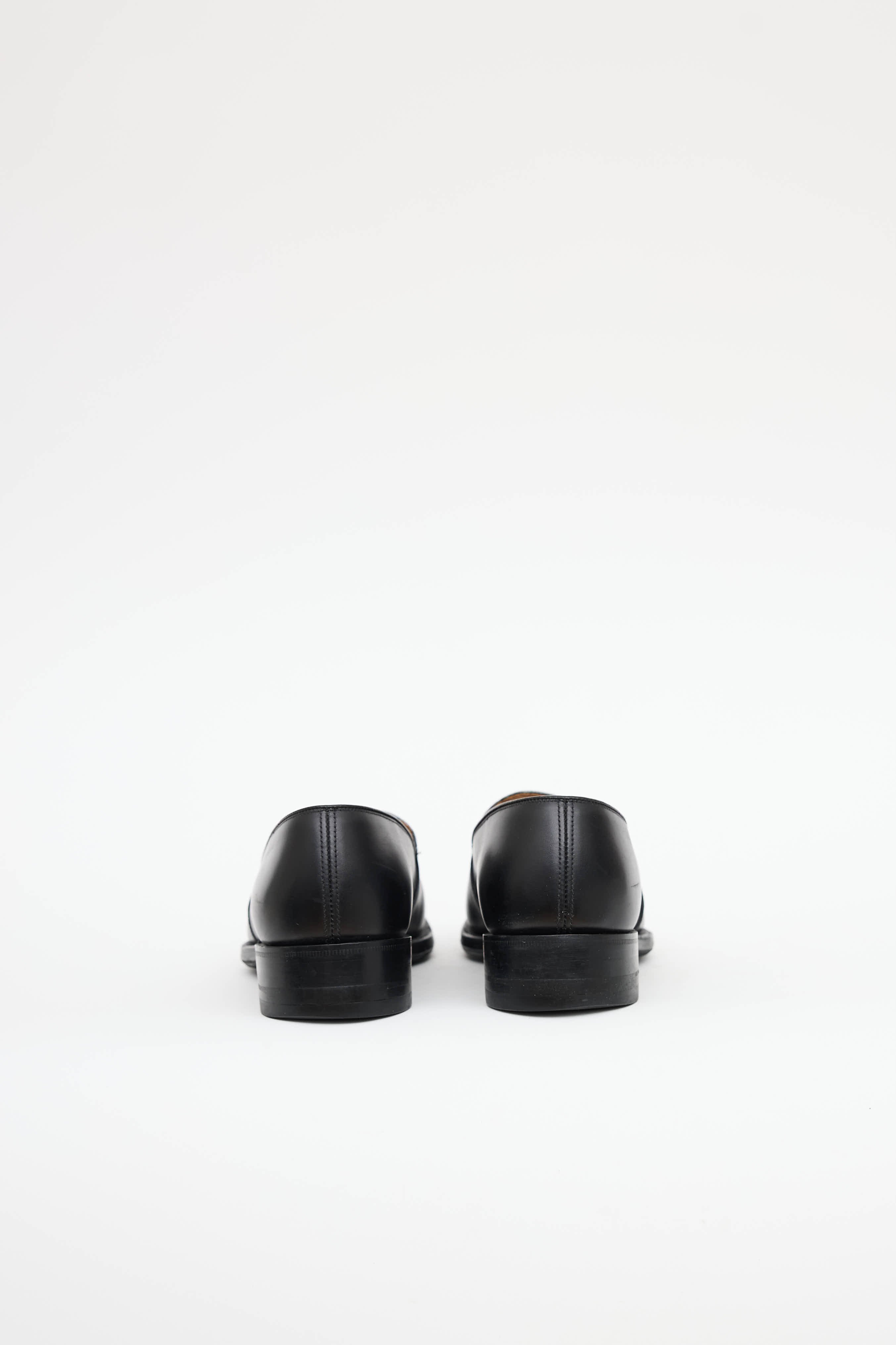 Pre-owned Church's black leather loafer featuring square toe, notched topline, tassel at vamp, and stacked heel.