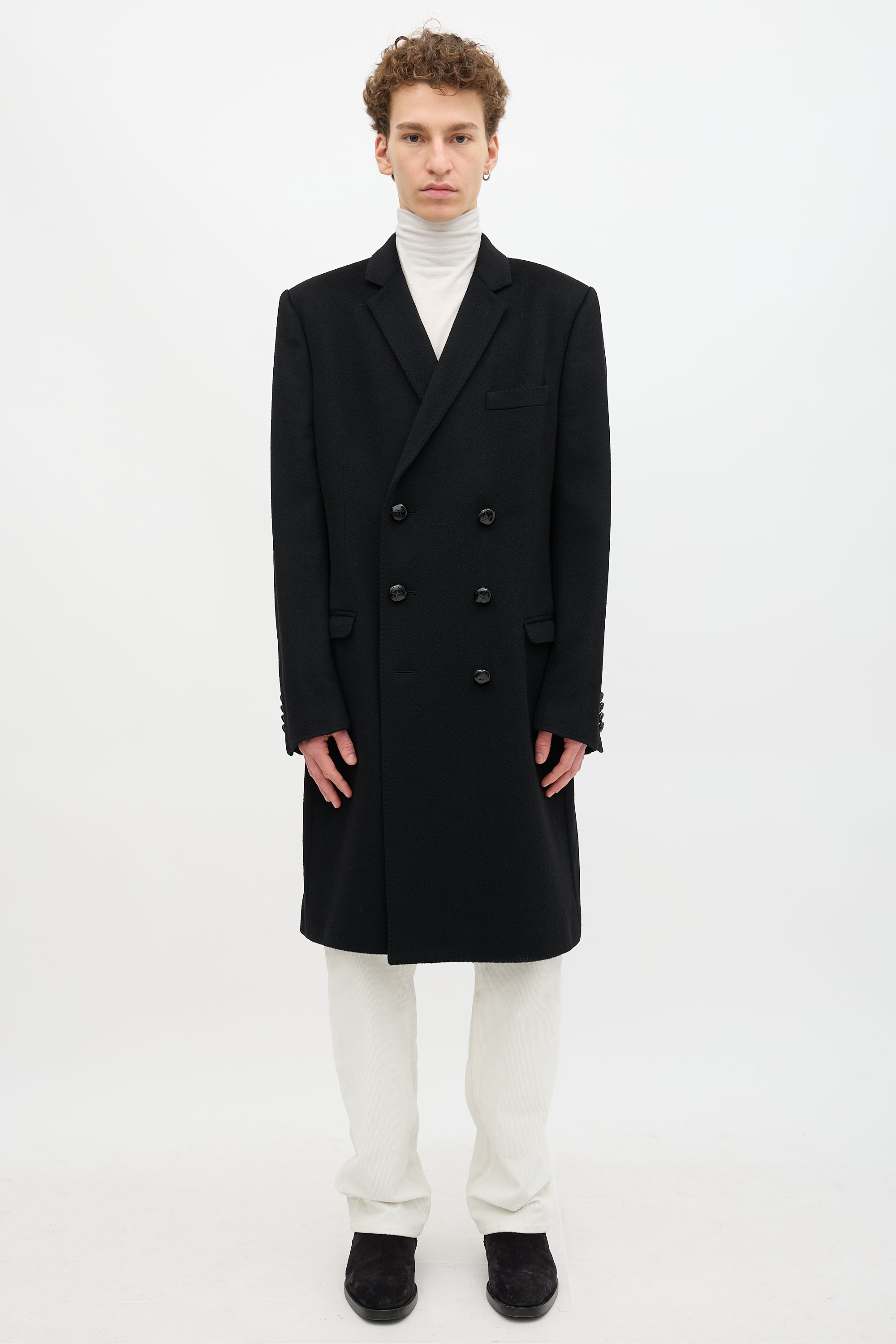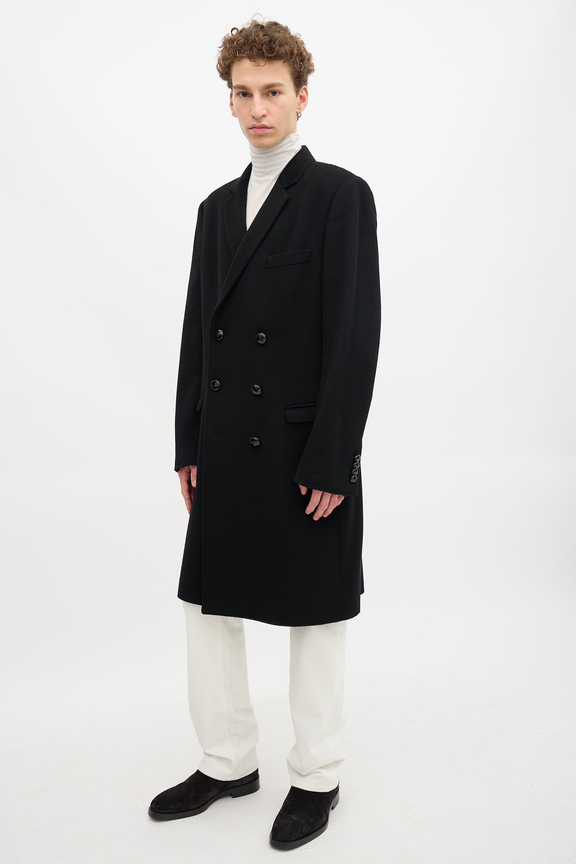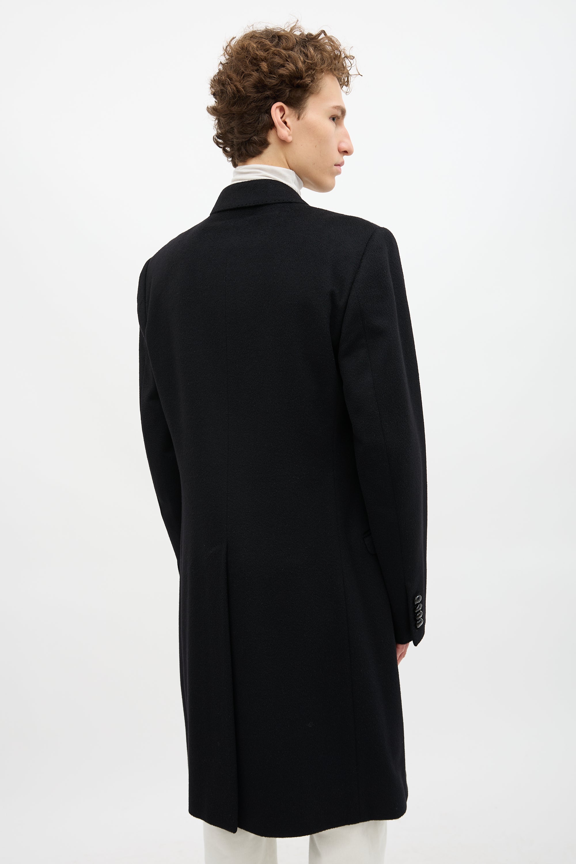 Pre-owned Dolce & Gabbana black cashmere coat featuring notched lapel, double breasted button up front, three front pockets, two interior pockets, back vent, padded shoulders, and buttoned cuffs. Lined.