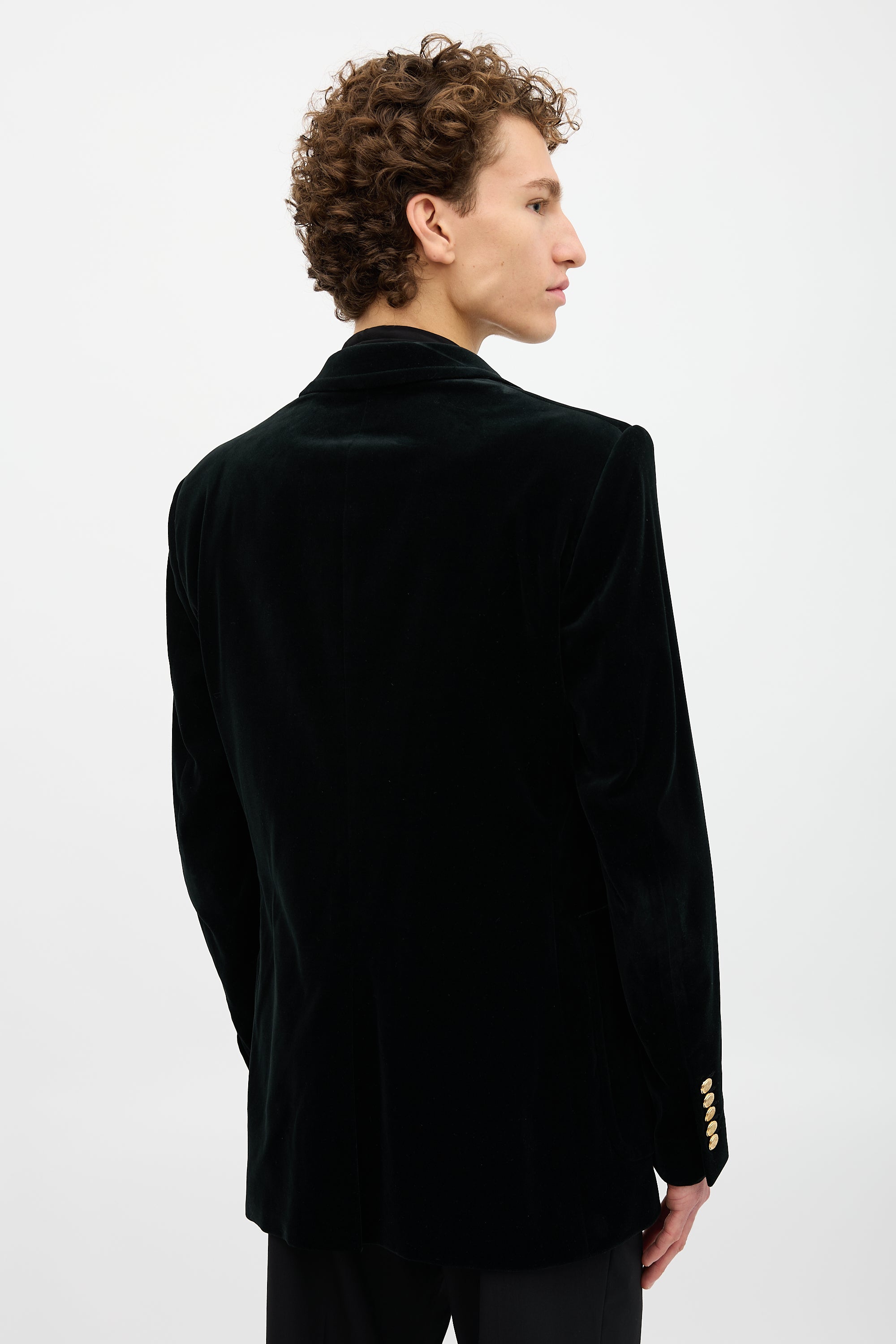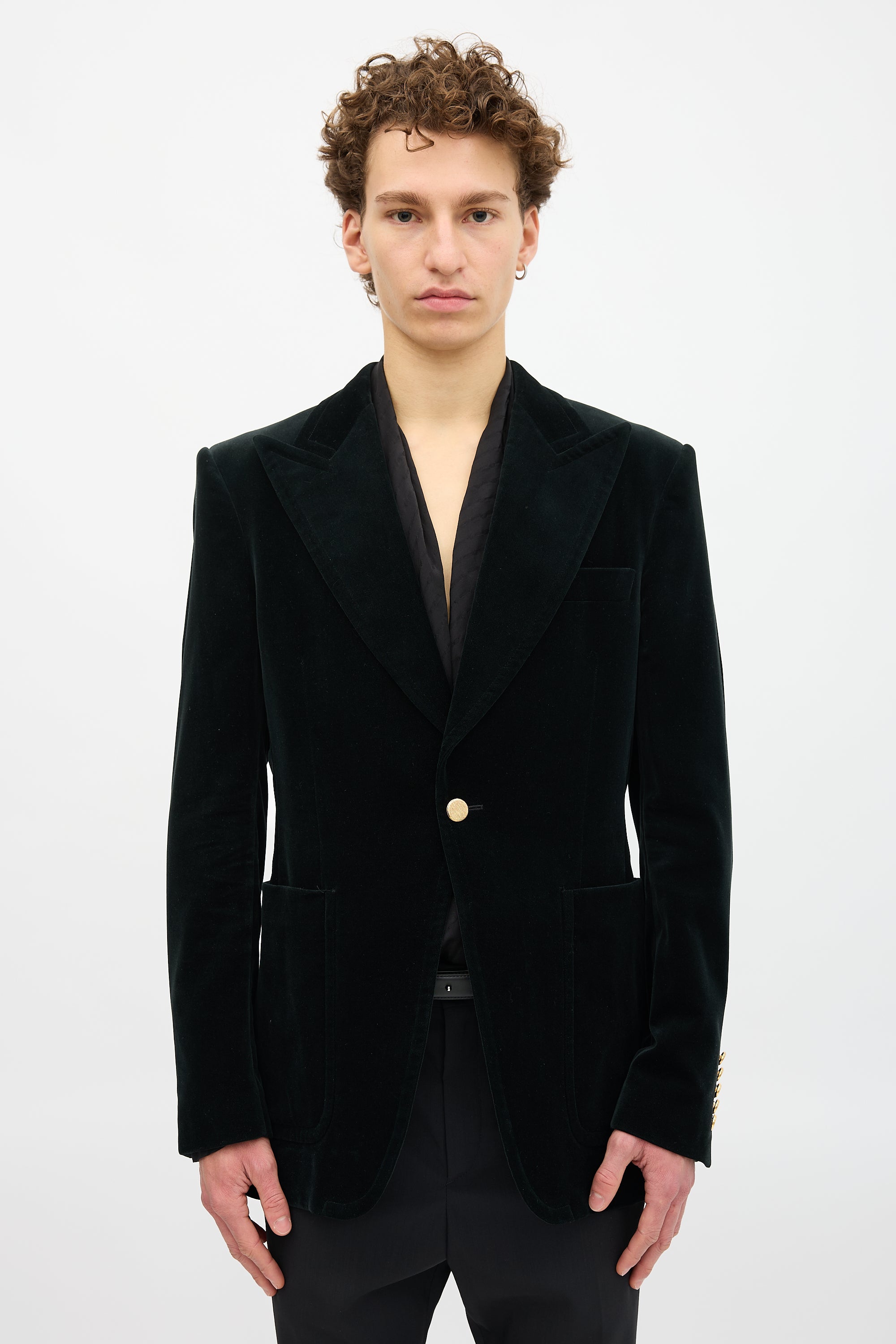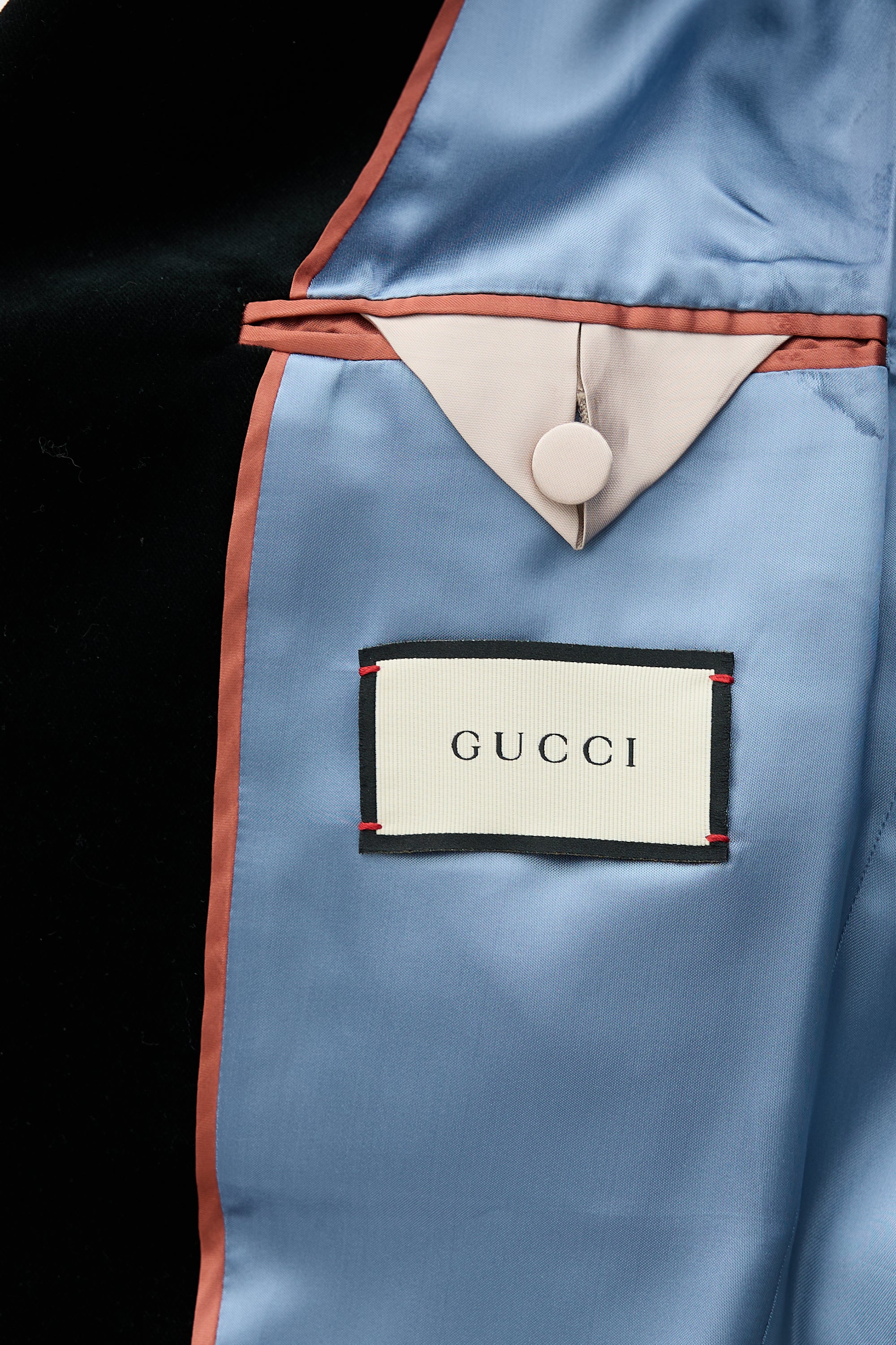 Pre-owned Gucci black velvet blazer featuring peak lapel, single front button closure, three front pockets, back vent, padded shoulders, and buttoned cuffs. Lined.