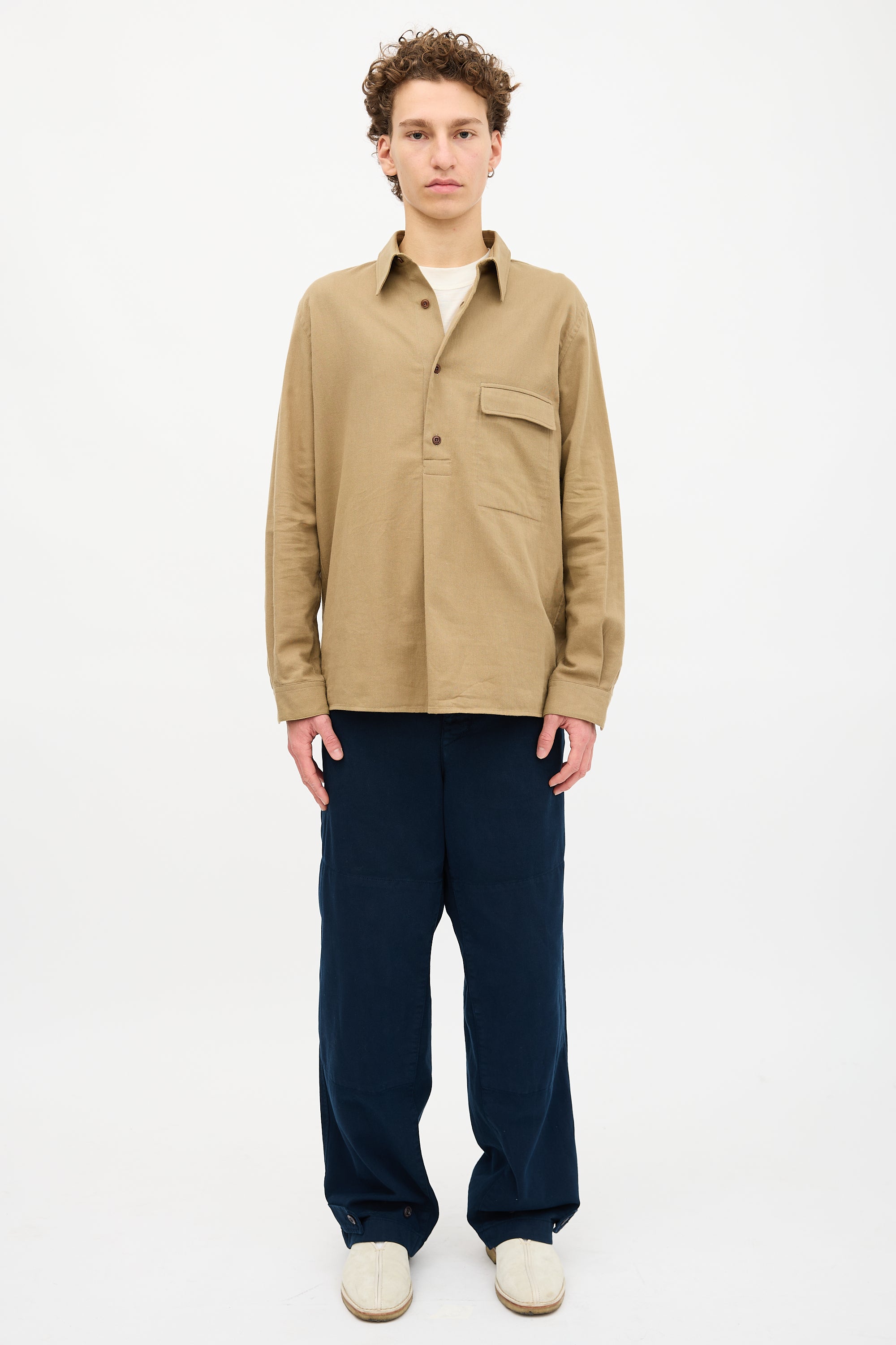 Pre-owned Lemaire brown twill top featuring a spread collar, half button front, and double welt pocket.