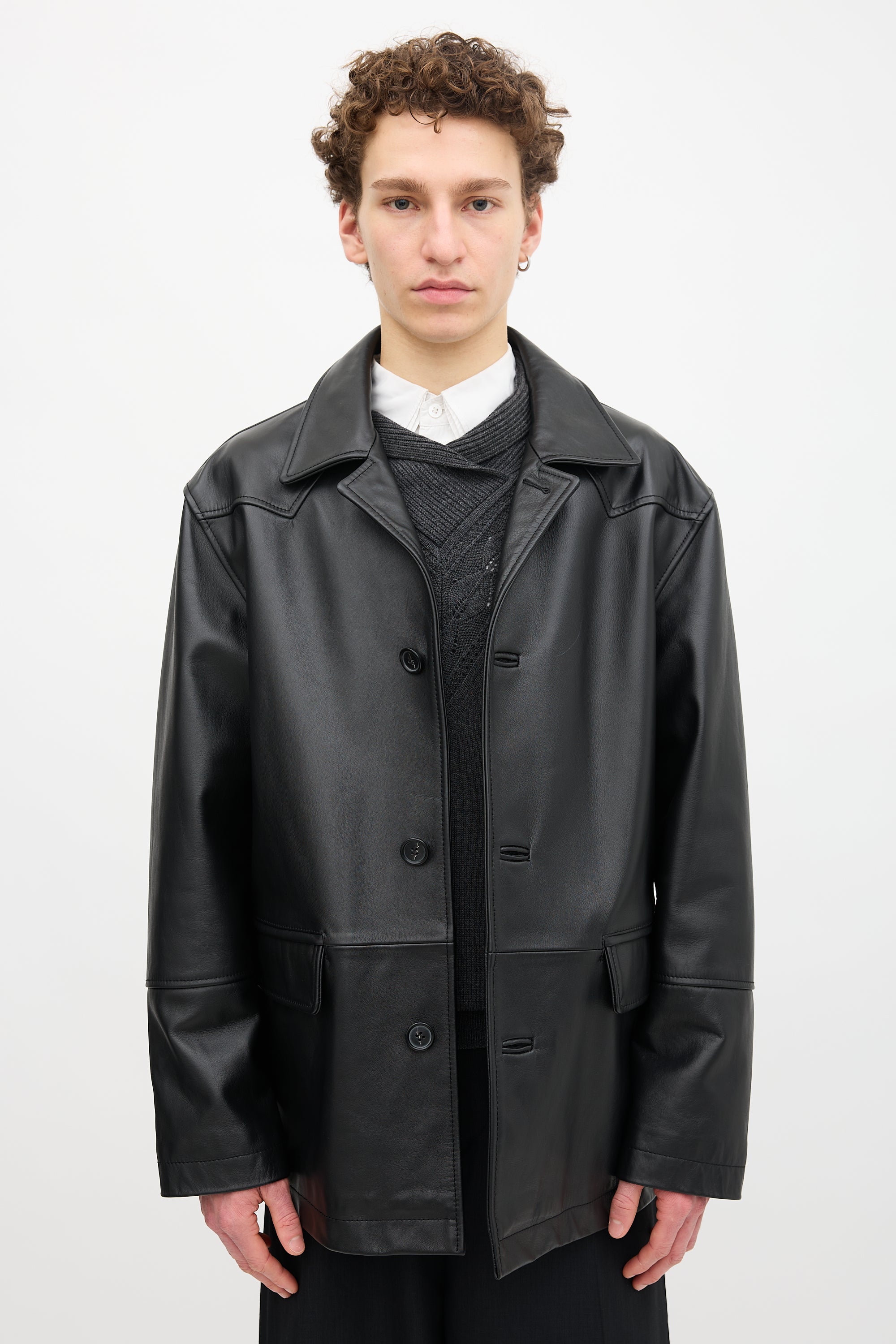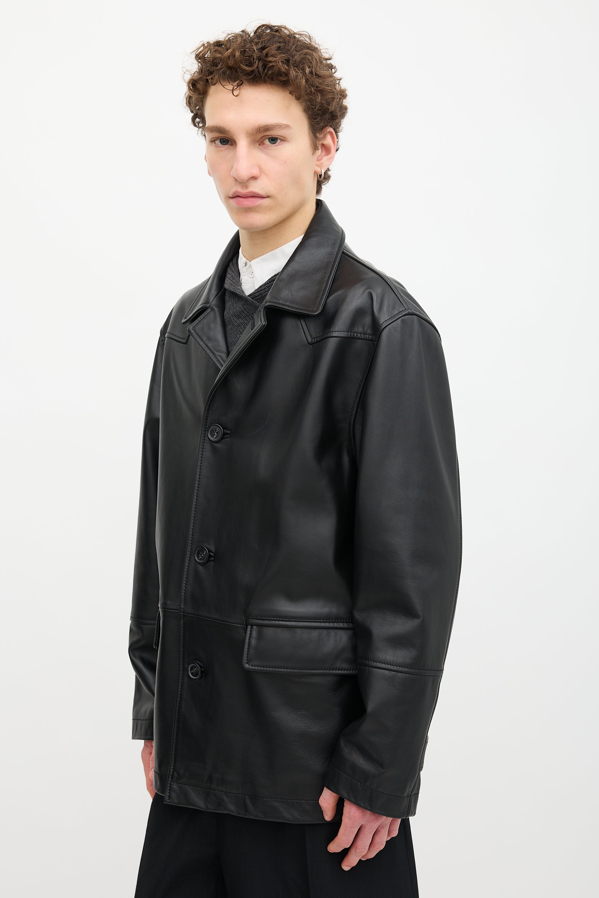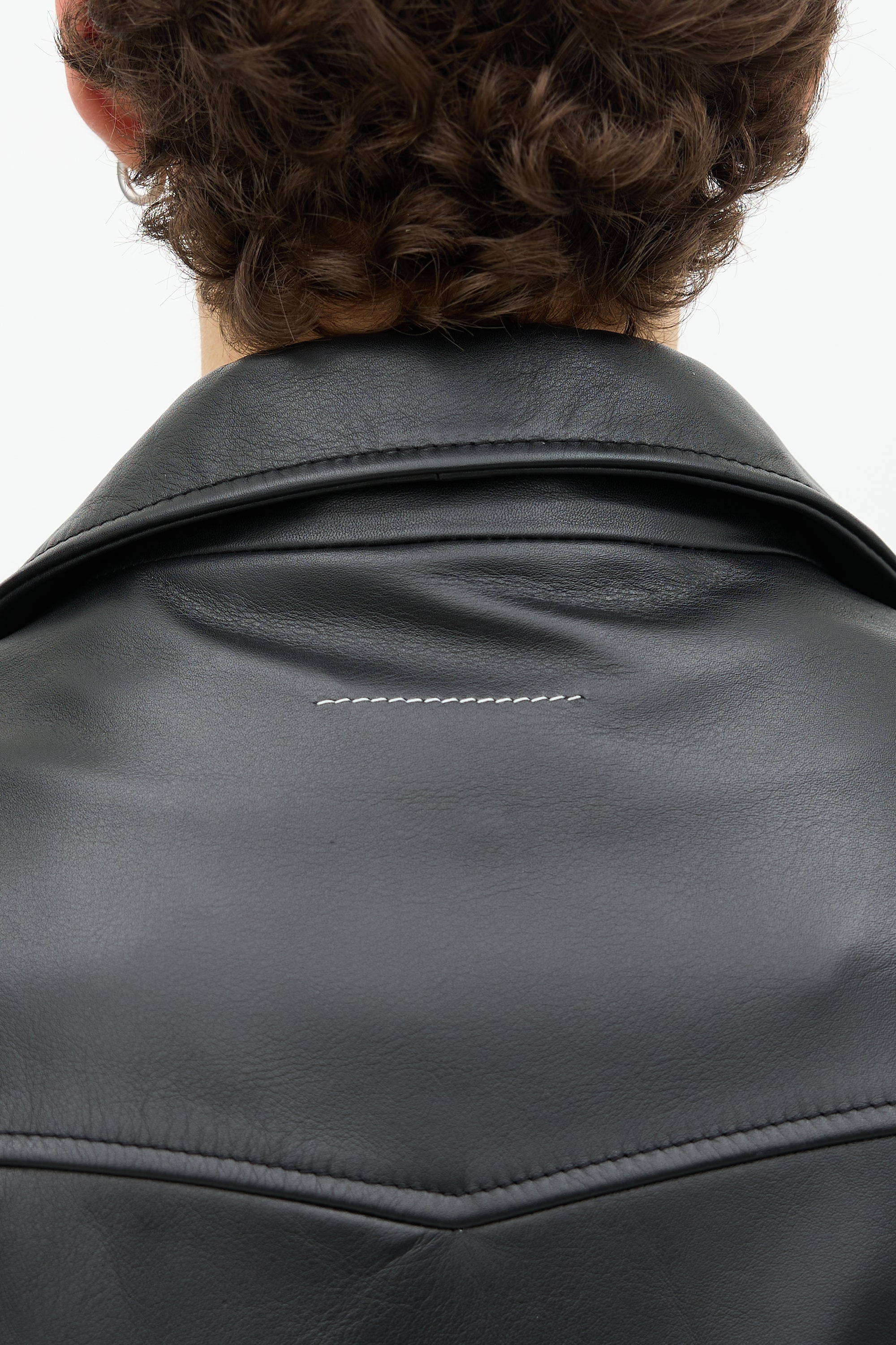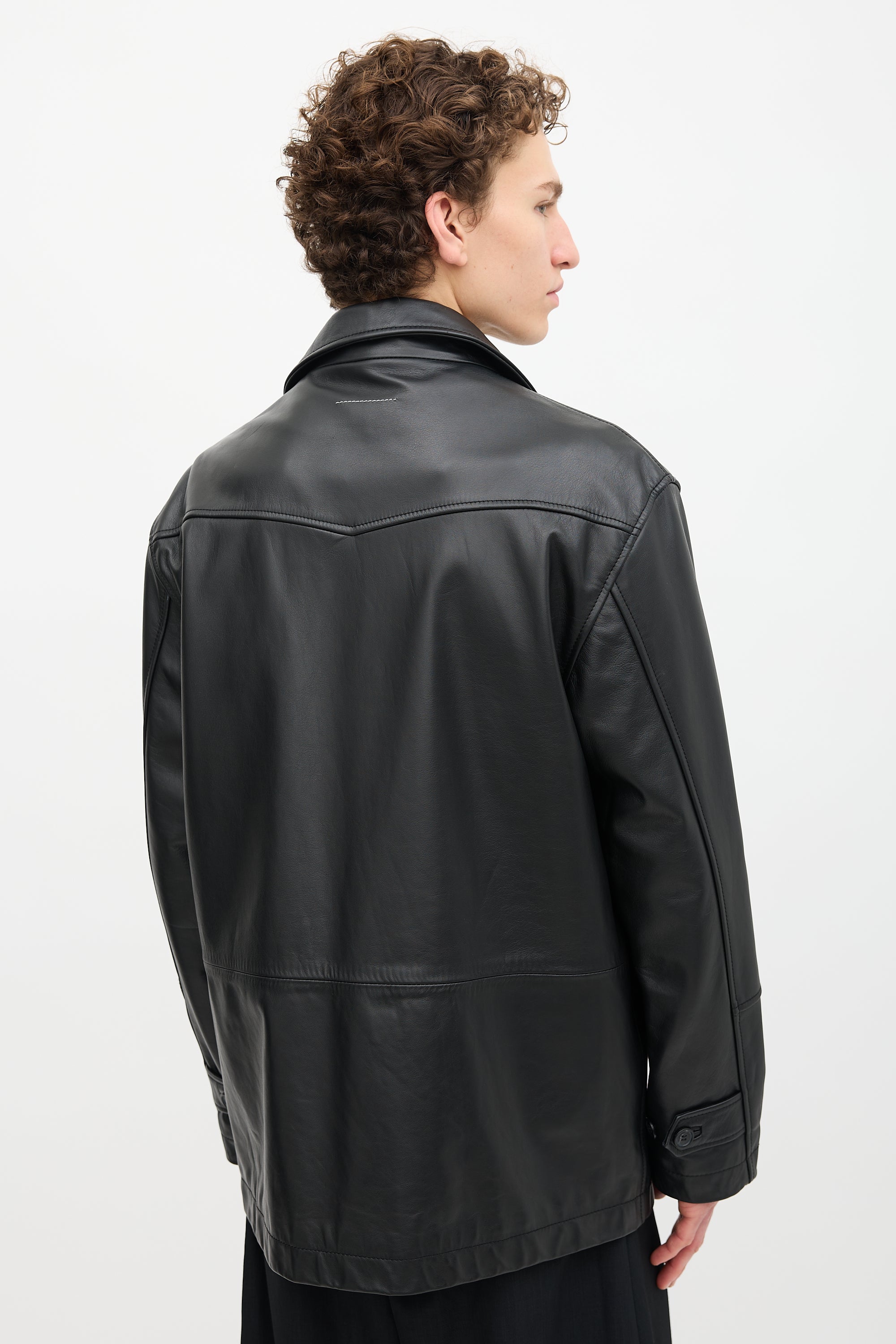 Pre-owned MM6 Maison Margiela black leather coat featuring spread collar, button up front, two front flap pockets, one interior pocket, adjustable cuffs, and signature white stitched line at upper back. Lined.
