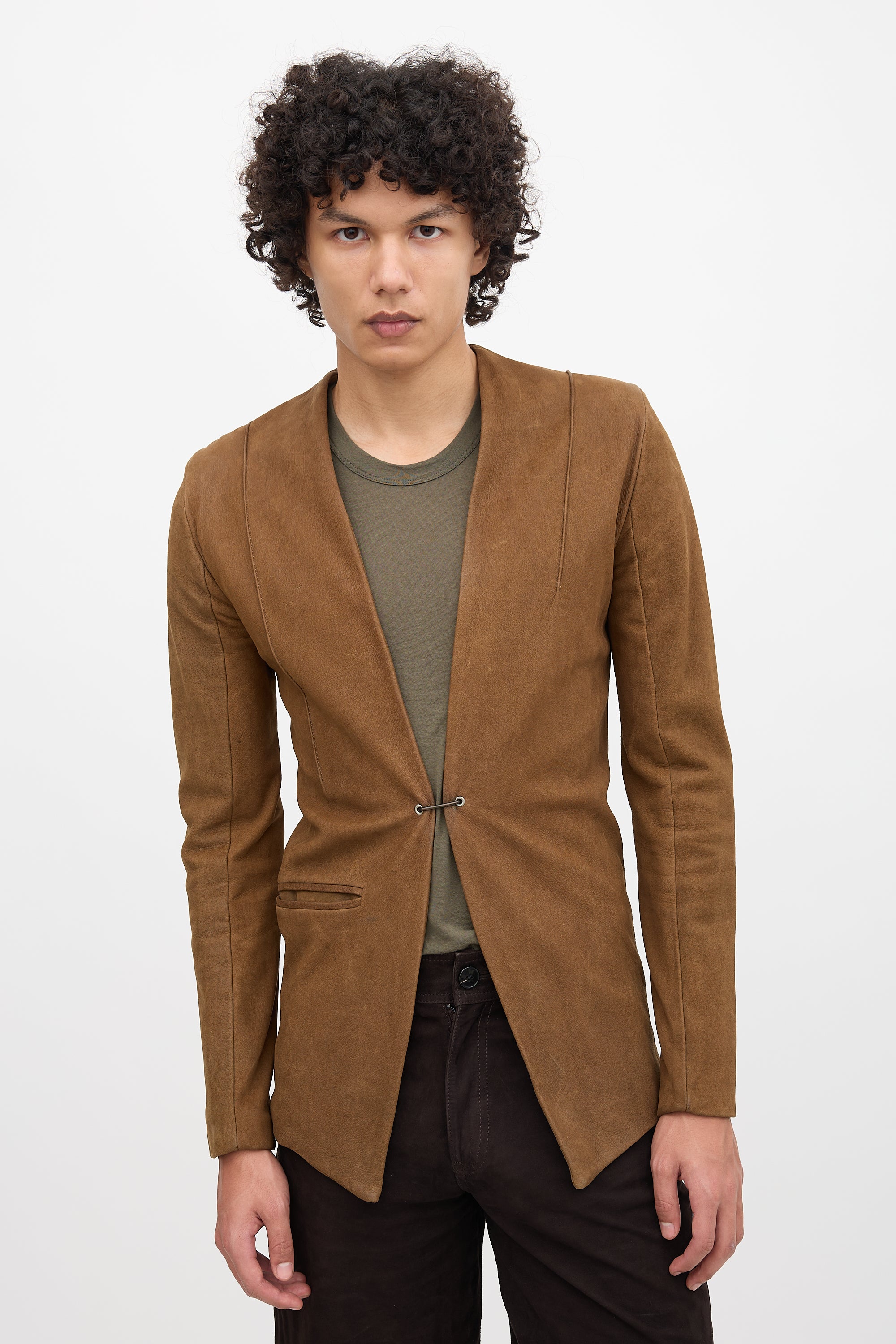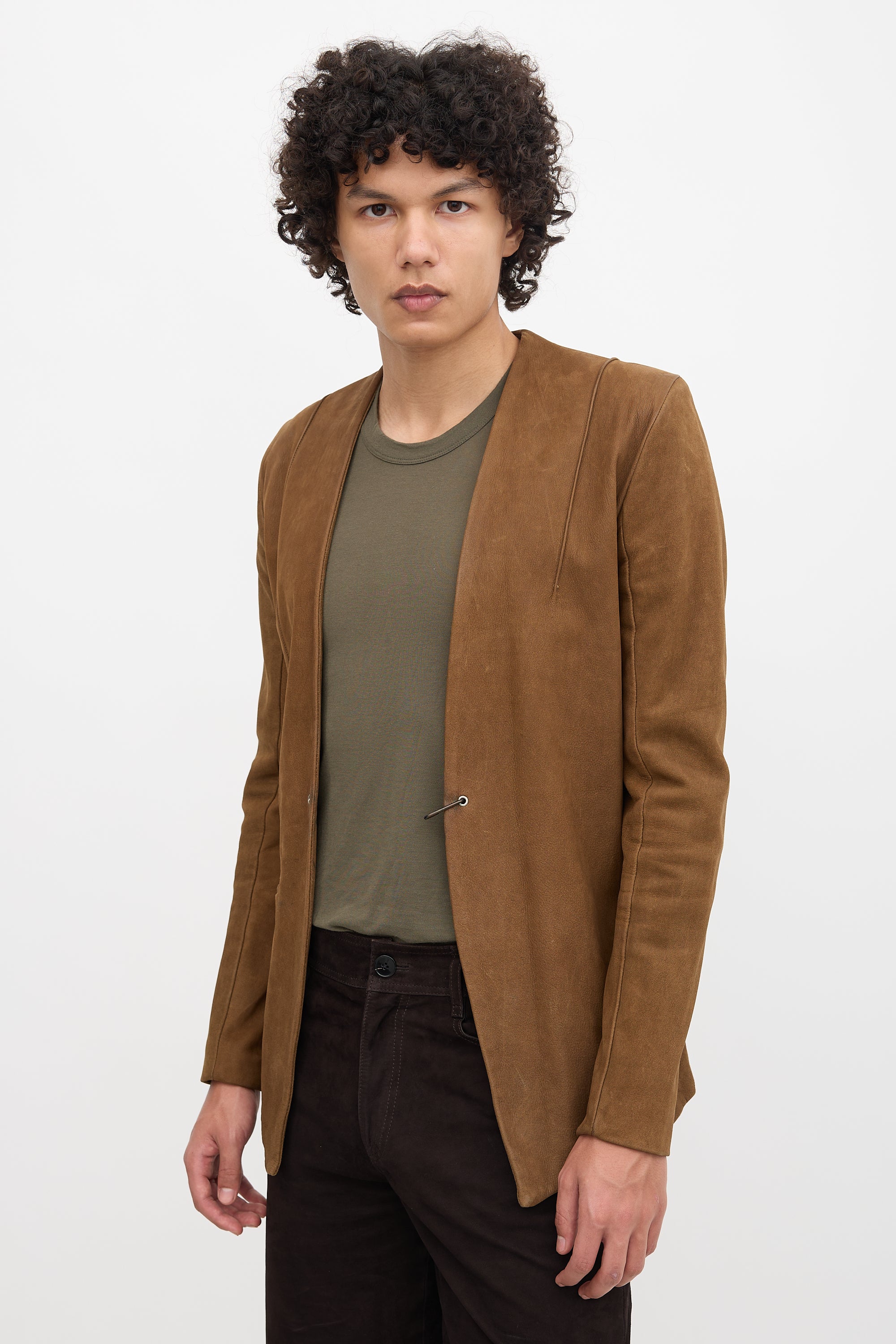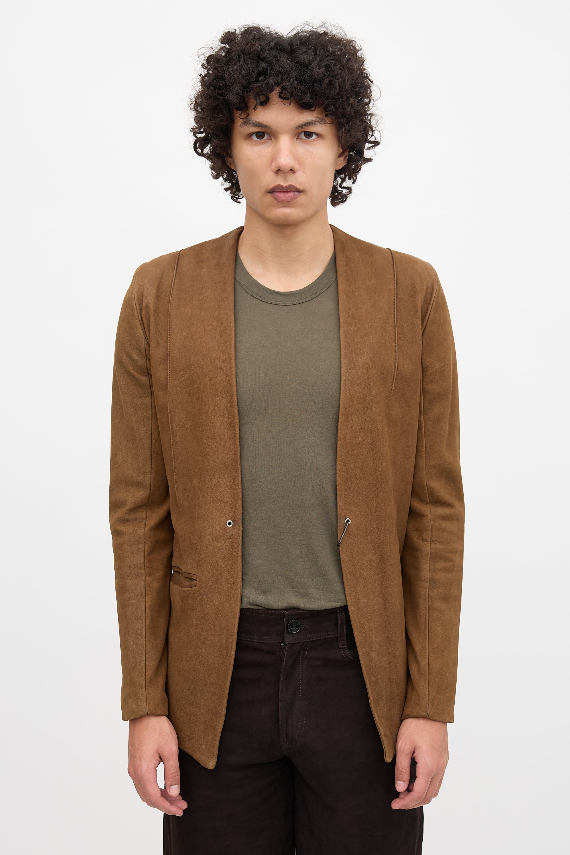 Pre-owned Song For Mute brown suede jacket featuring a collarless styling, padded shoulder, hook and eye closure, and one double welt pocket. Lined.