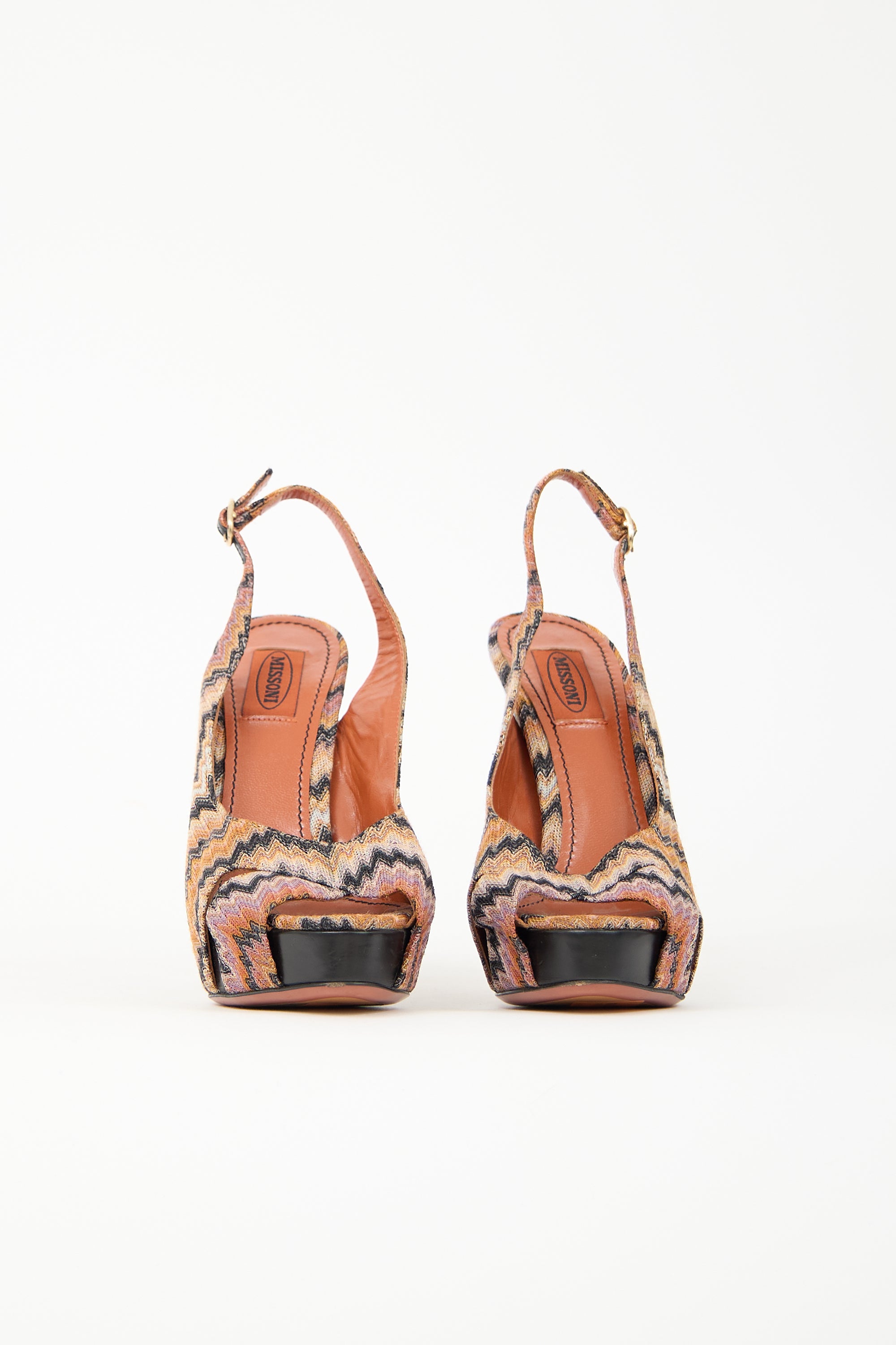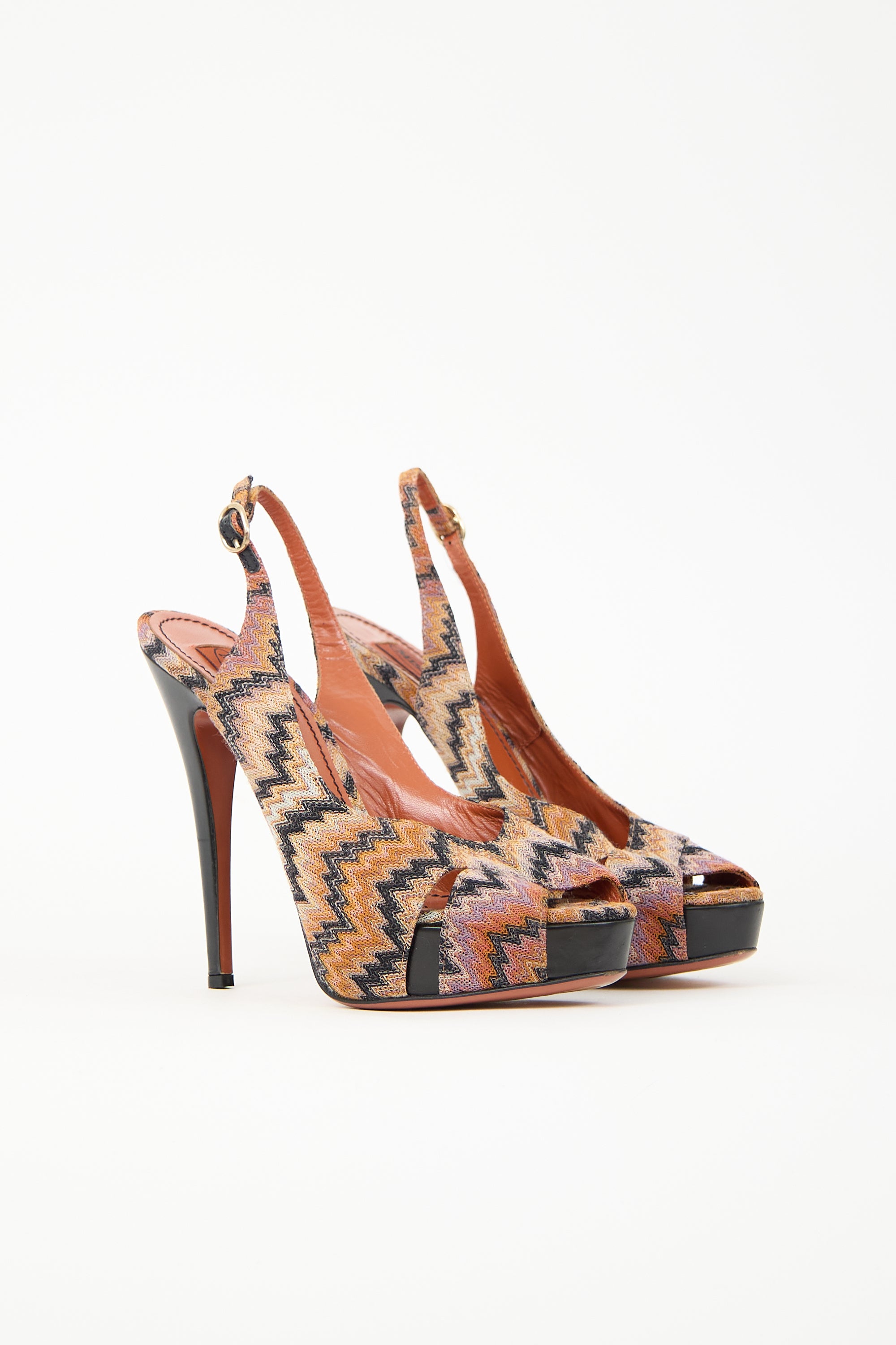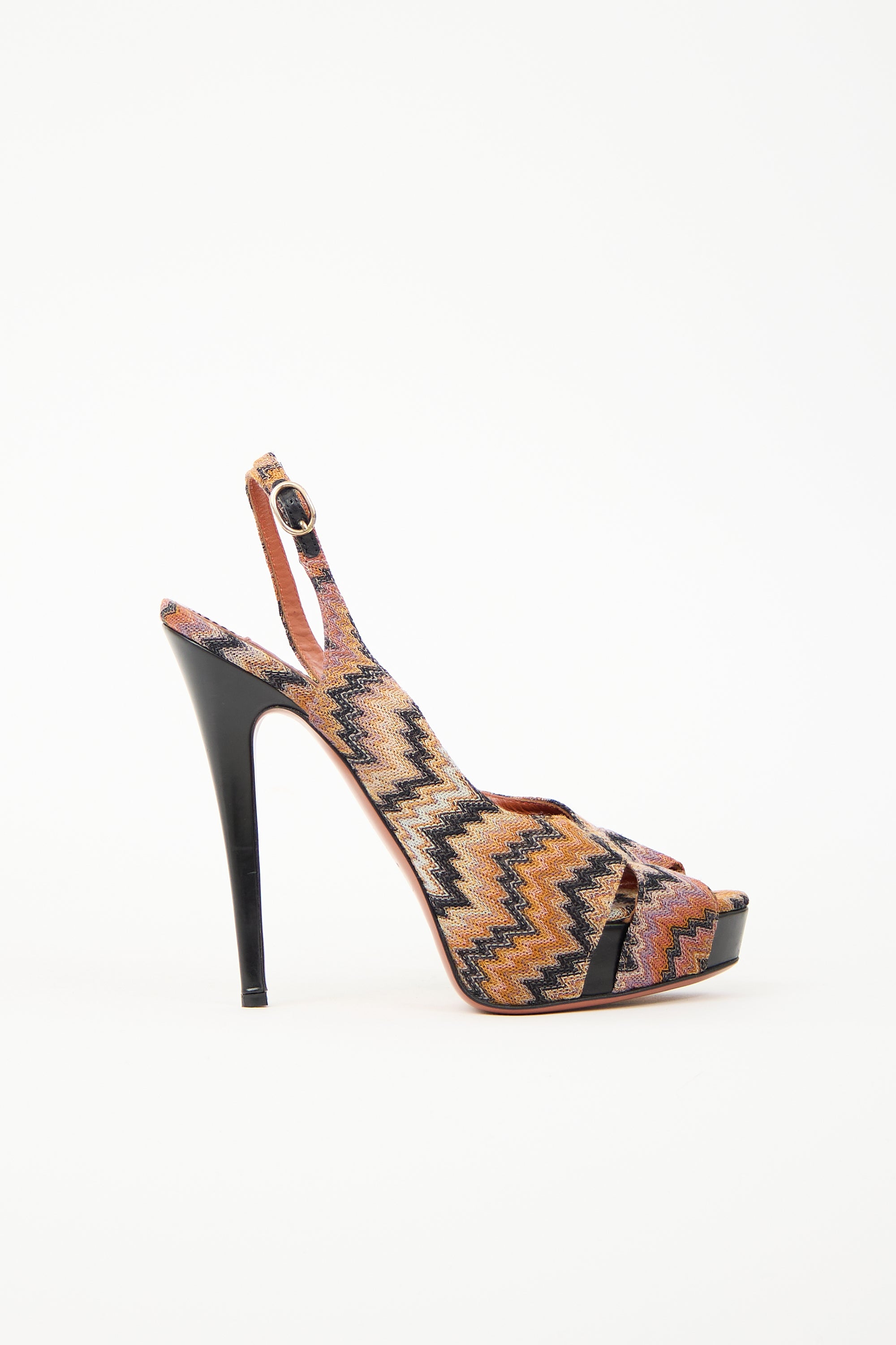 Pre-owned Missoni multicolour heels featuring peep almond toe, signature chevron knit upper, adjustable ankle strap, and stiletto heel.