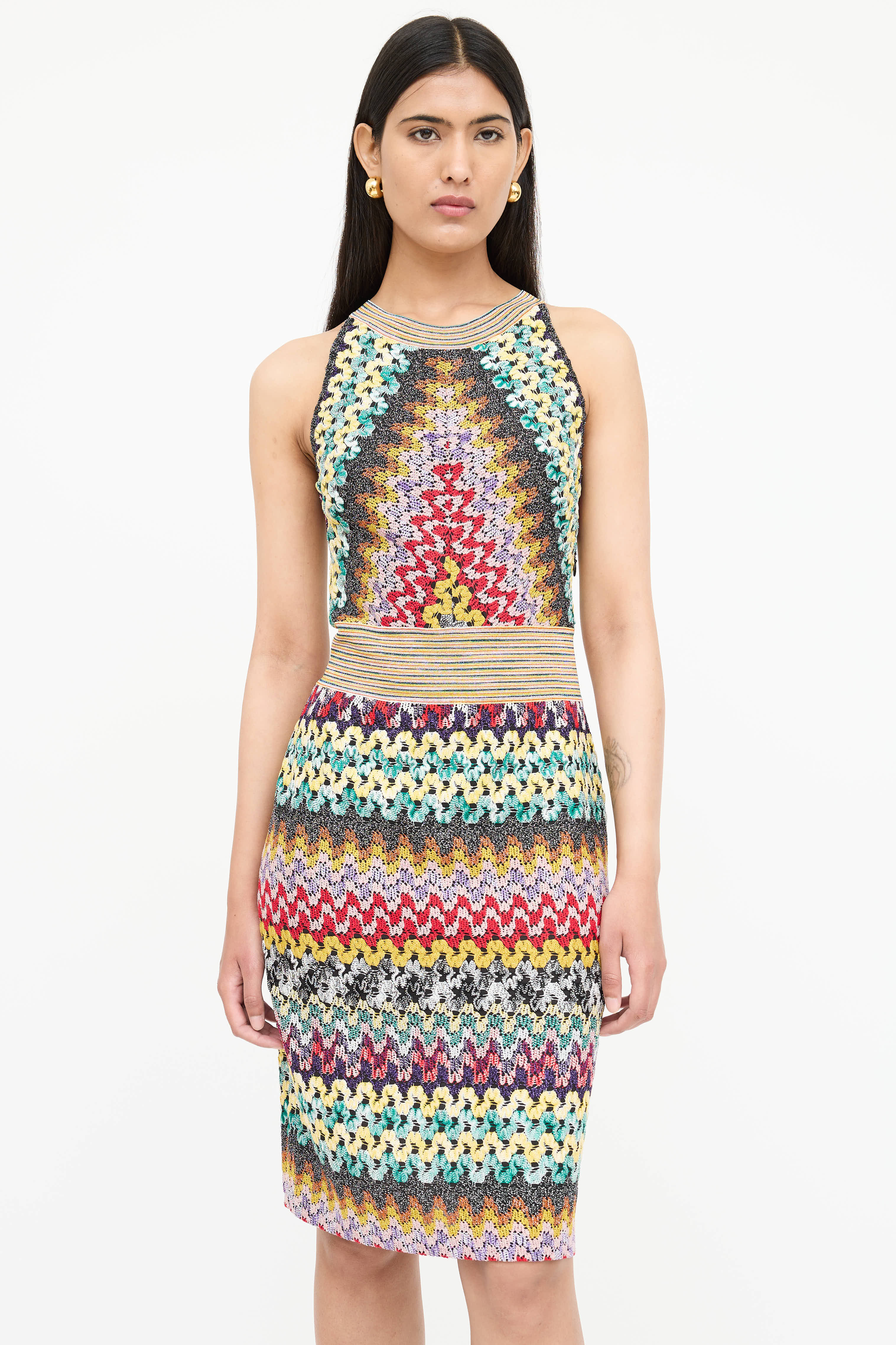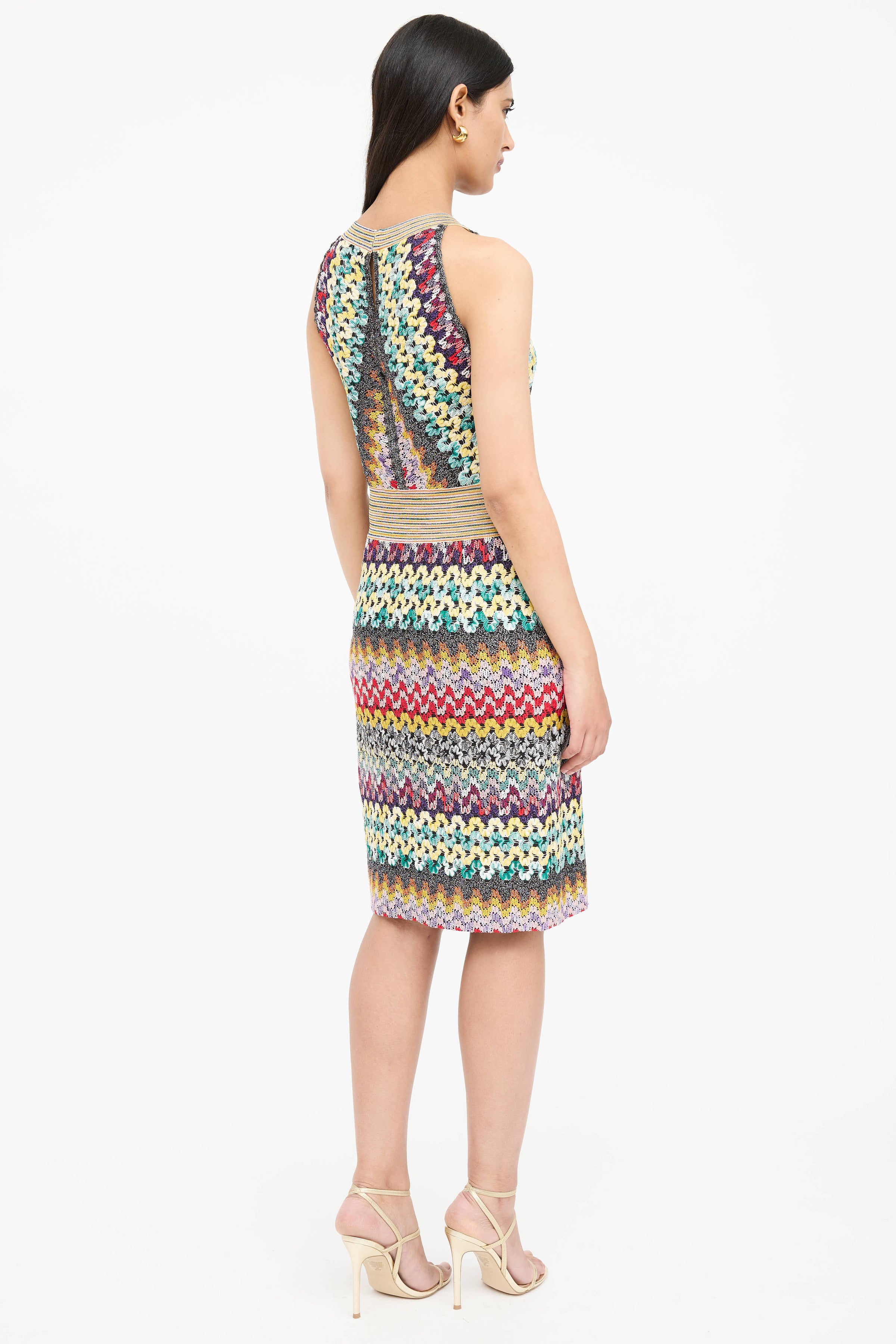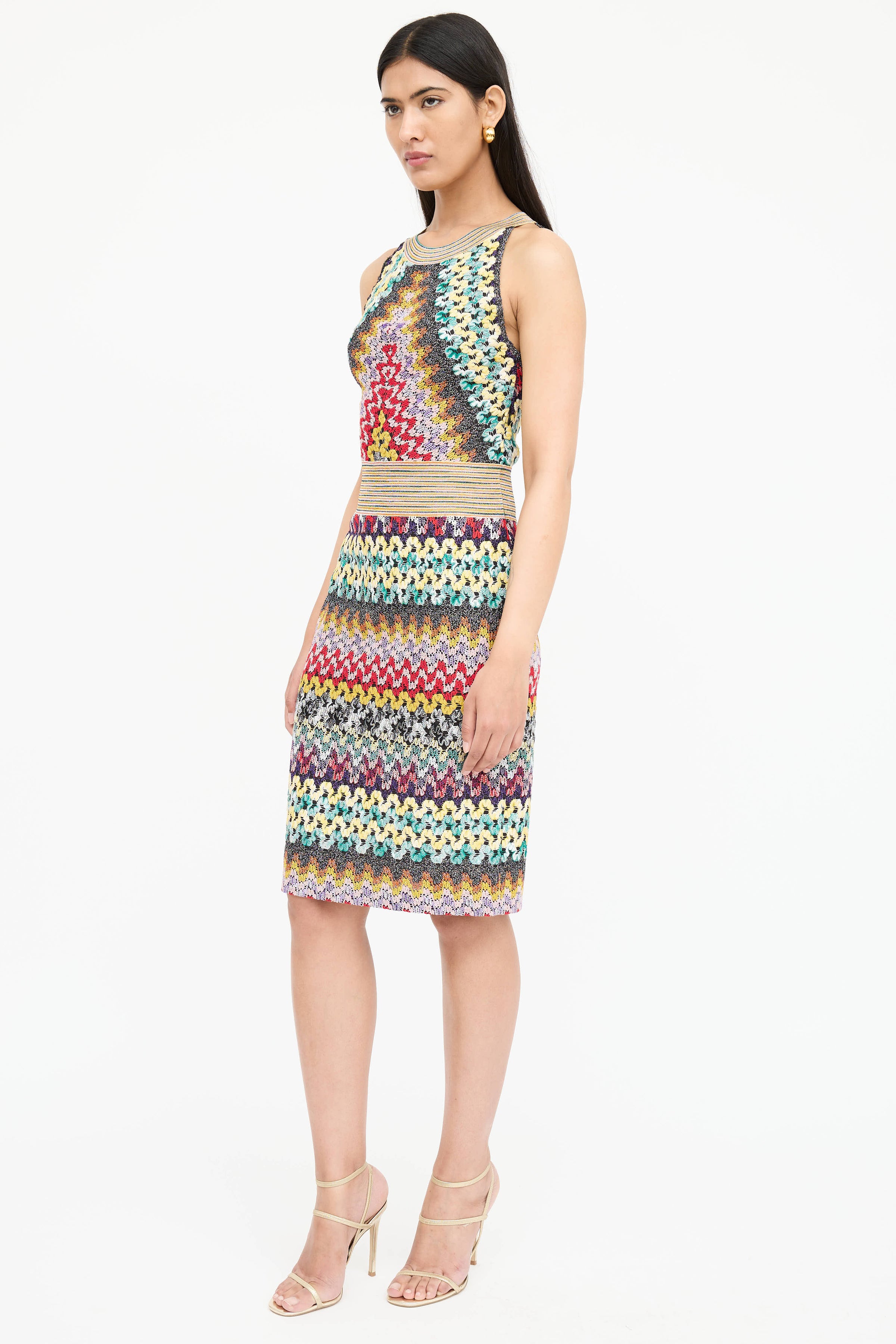 Pre-owned Missoni yellow knit dress featuring a multicolour weave throughout, round neckline, ribbed waist, and zip closure at side. Lined.