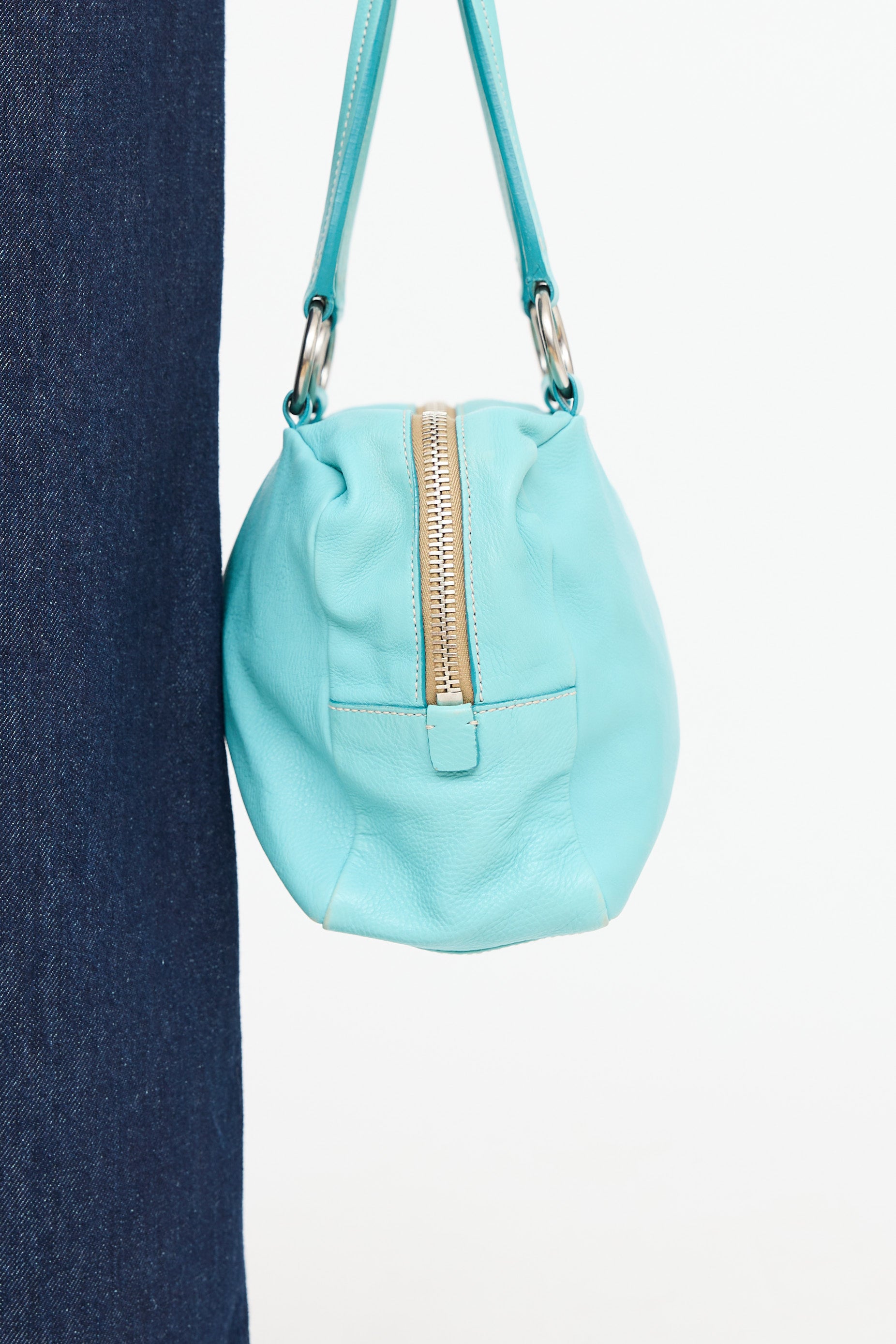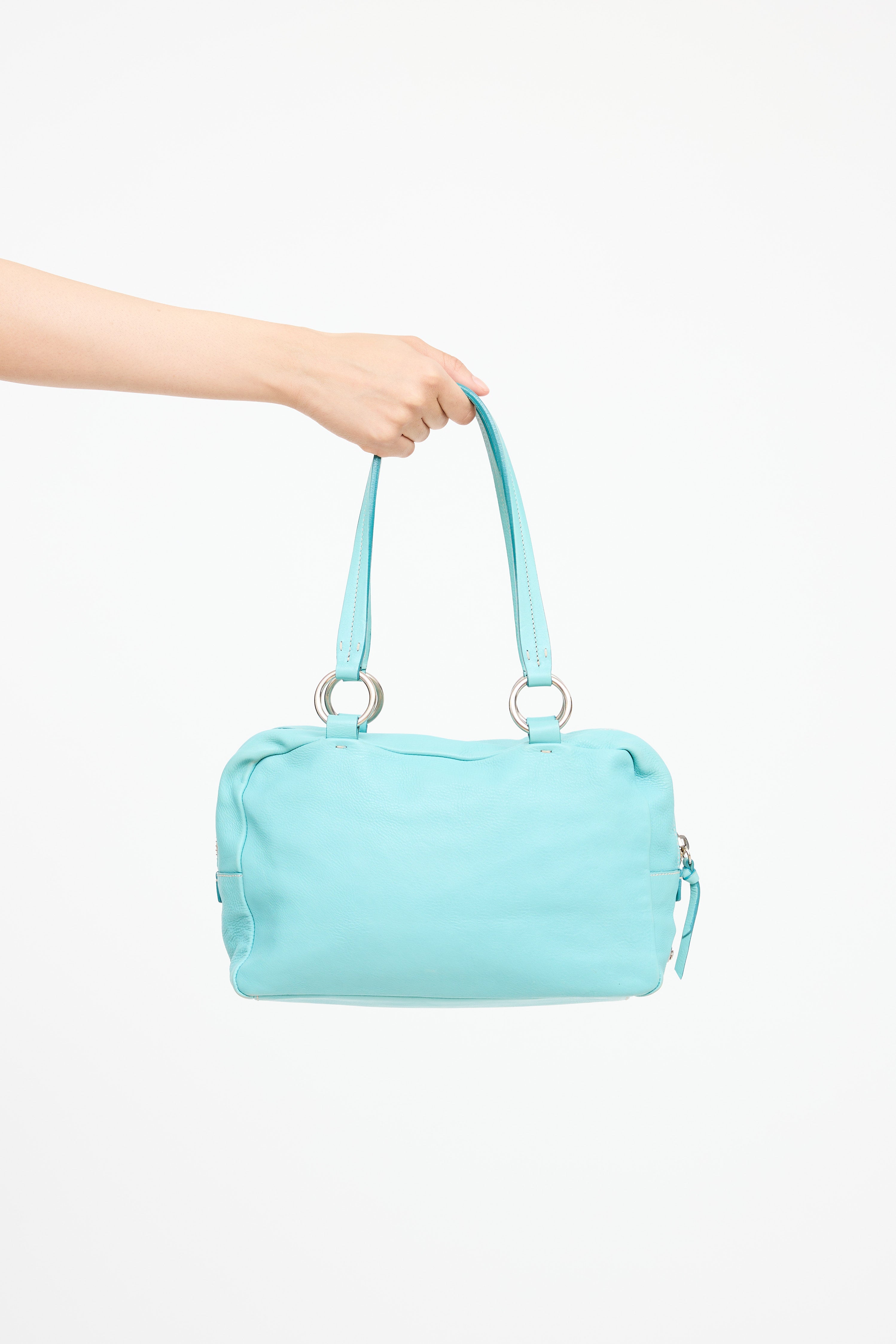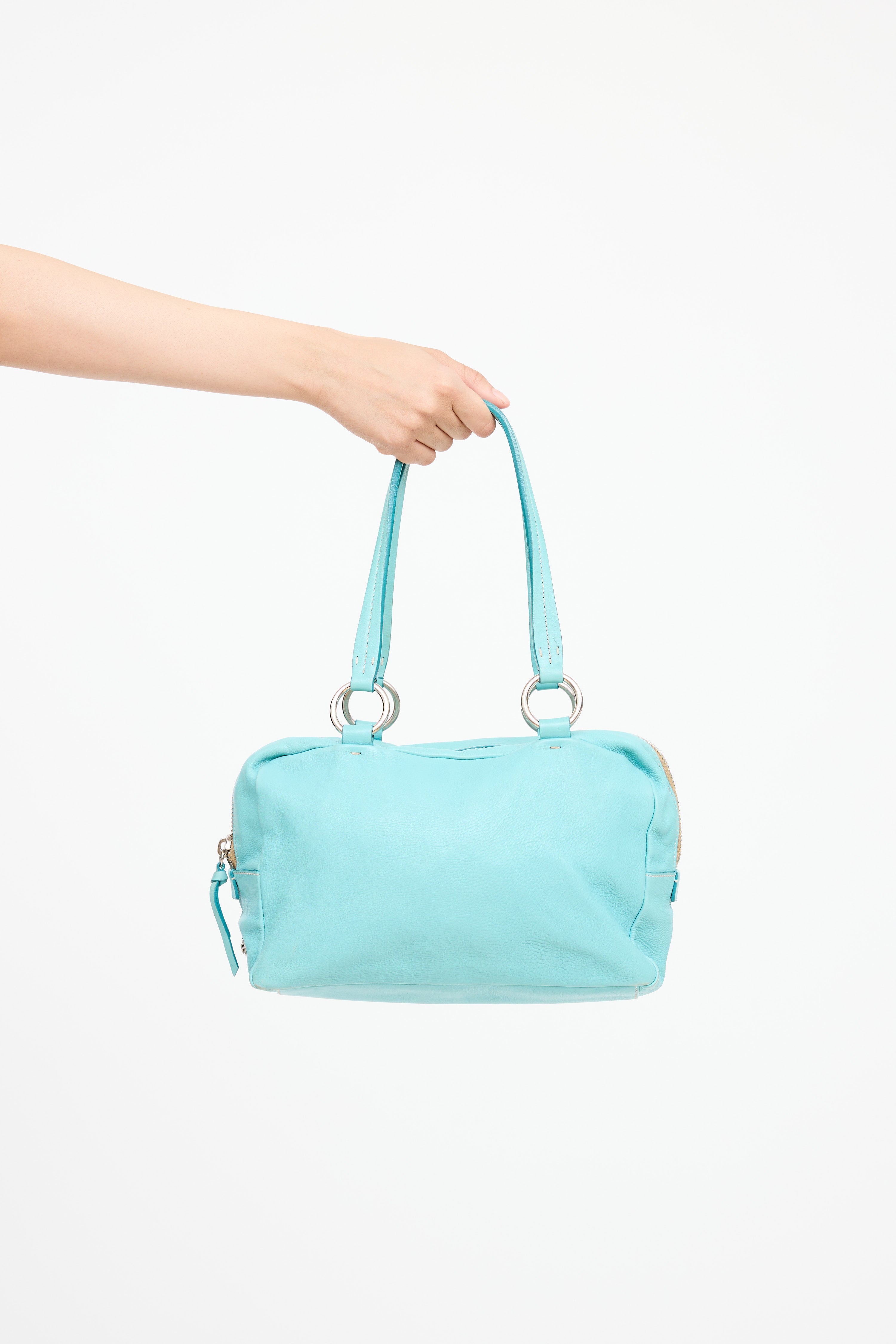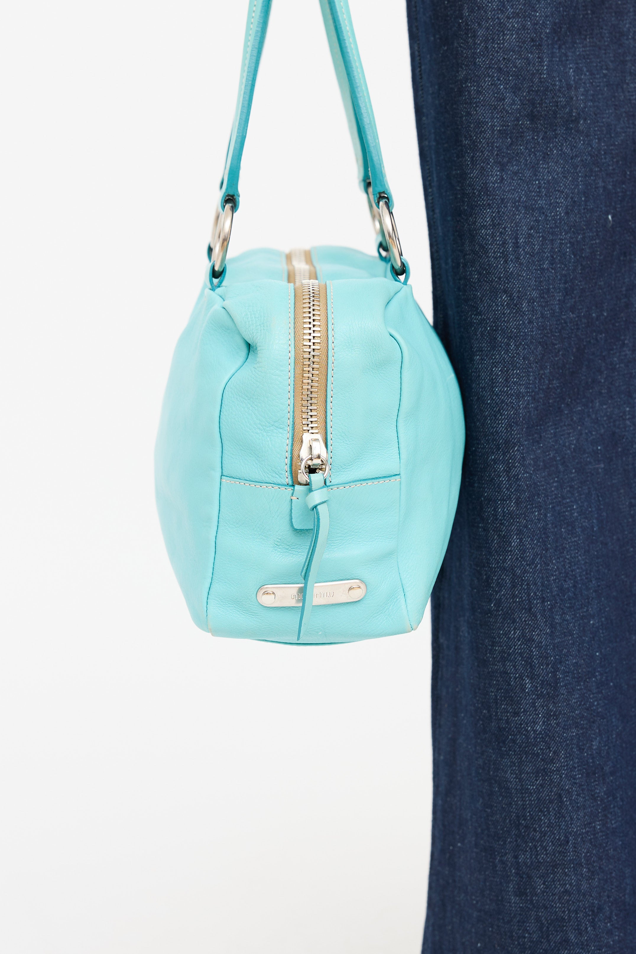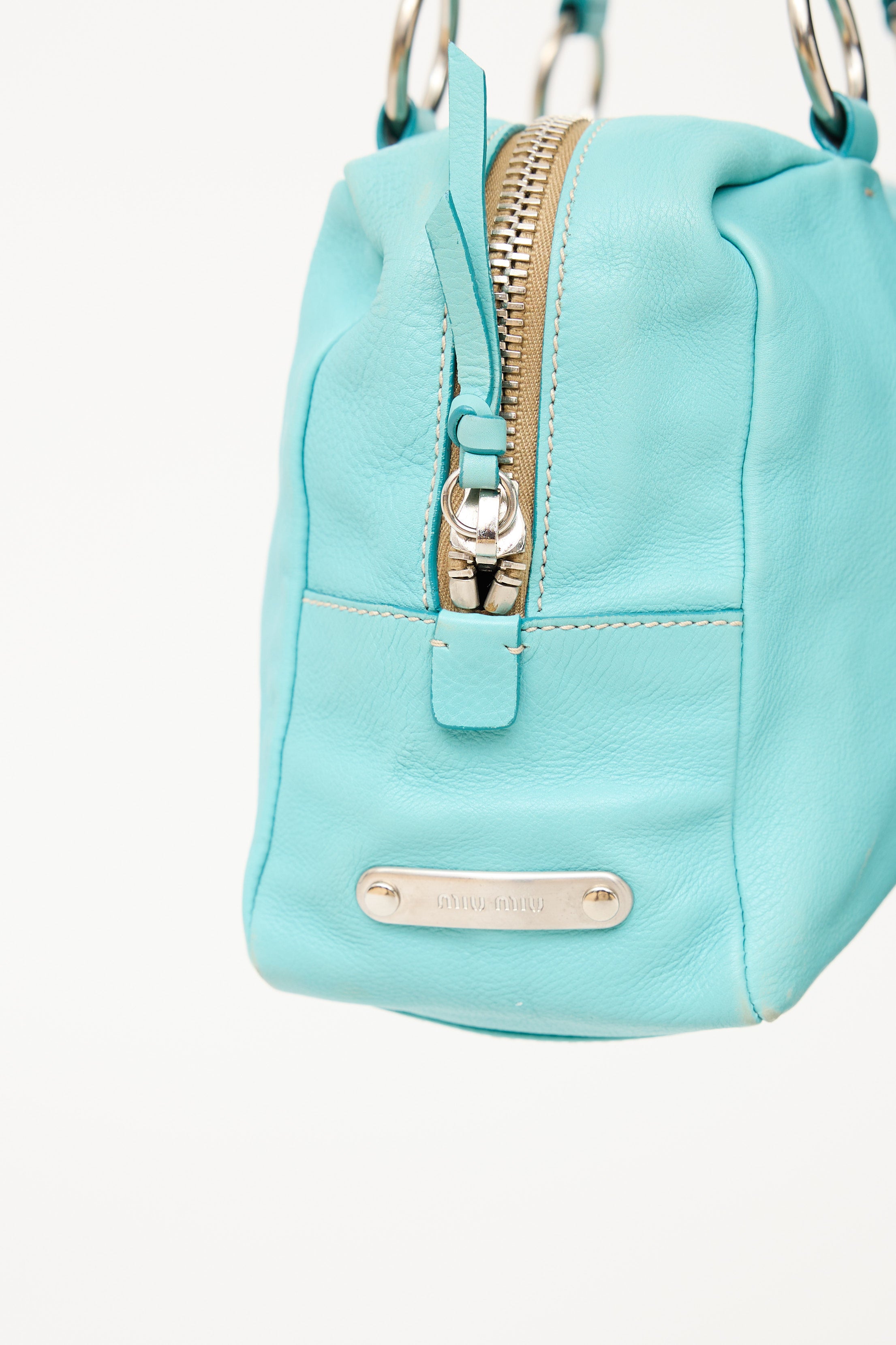Pre-owned Miu Miu turquoise blue leather bag featuring dual flat top handles, silver tone hardware and zip closure top. Canvas lined main compartment and single zip pocket.