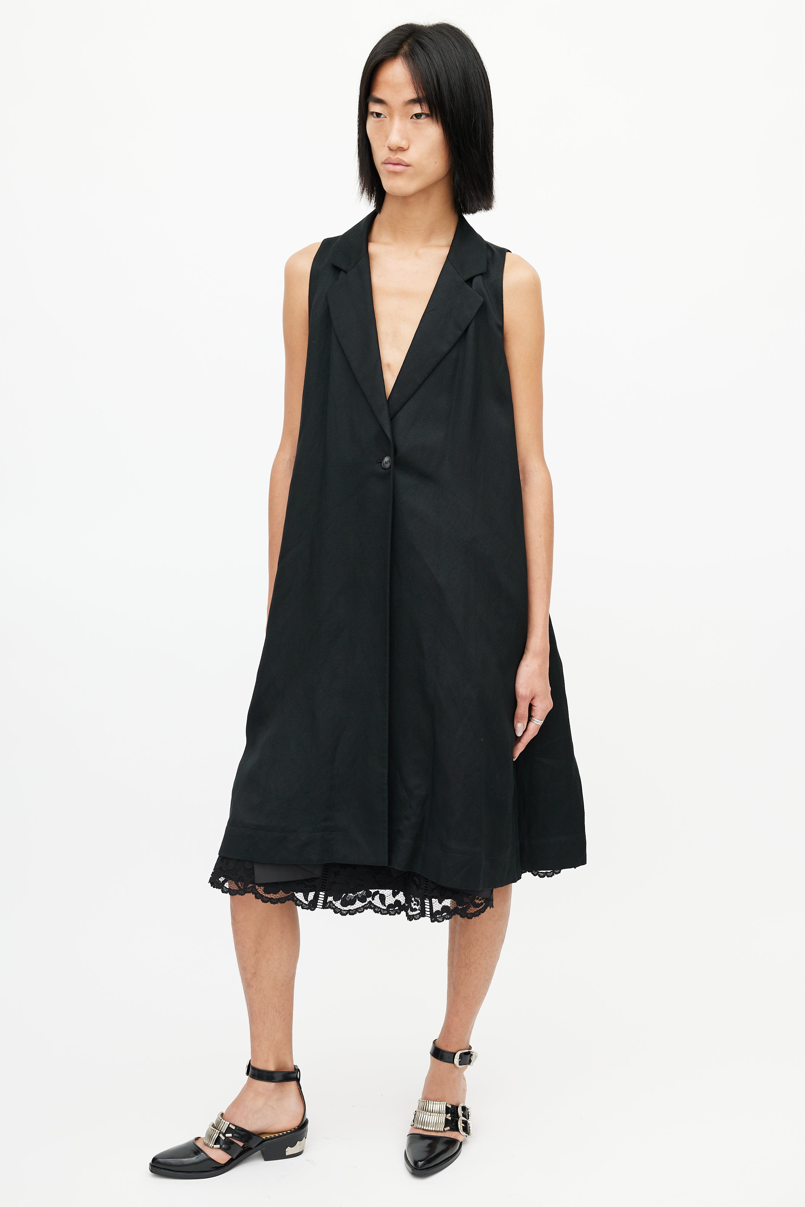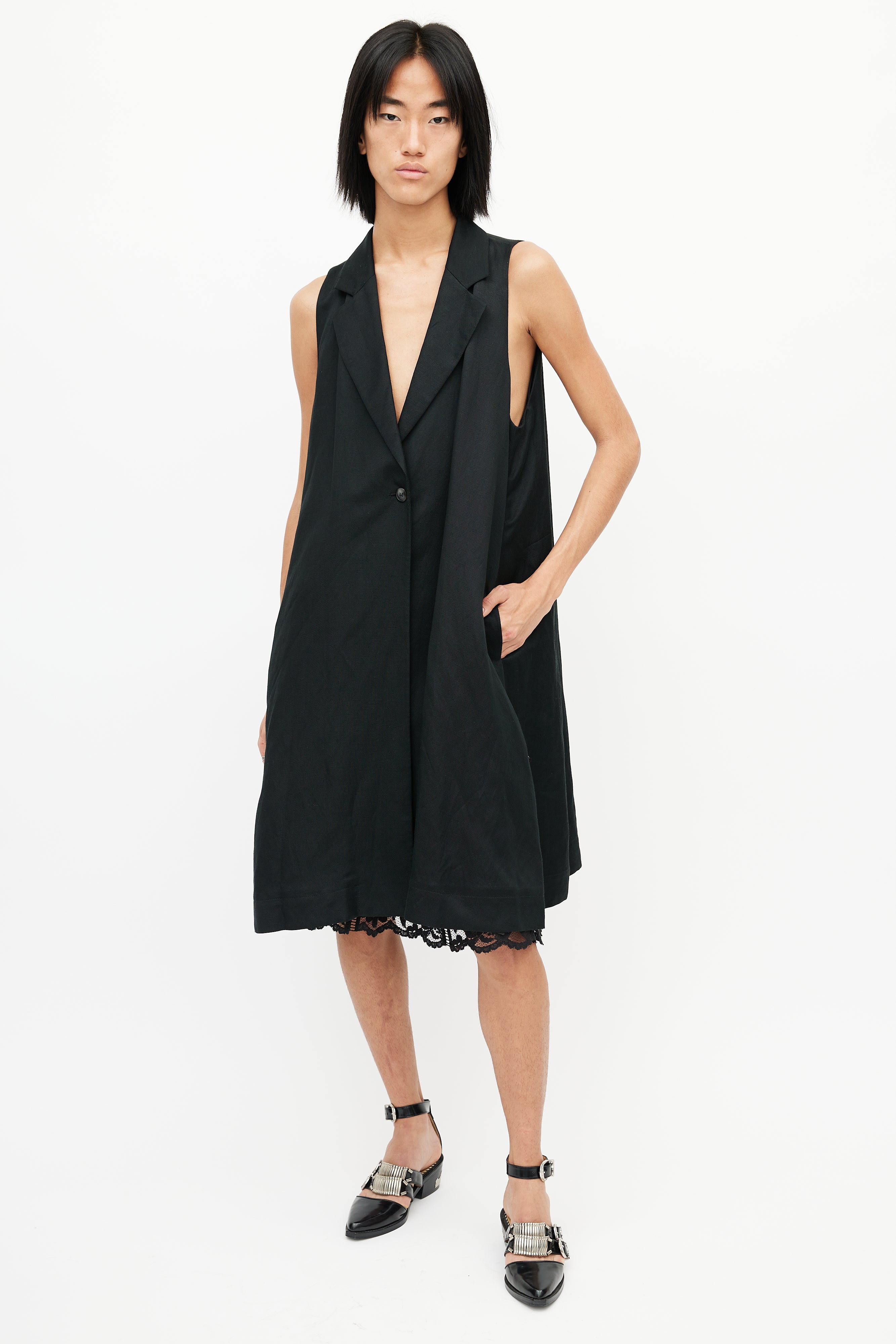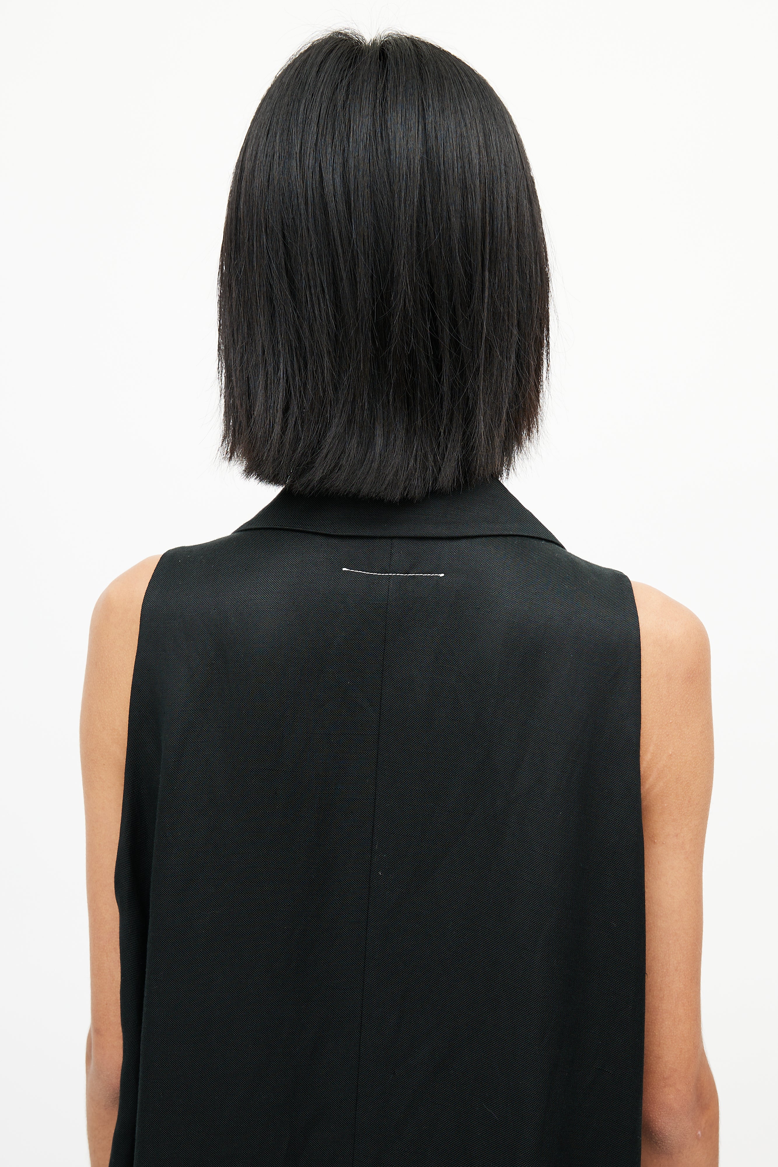 Pre-owned MM6 Maison Margiela black blazer dress featuring a notched lapel, two slash pockets at hip, sleeveless styling, and button up front. Lined.