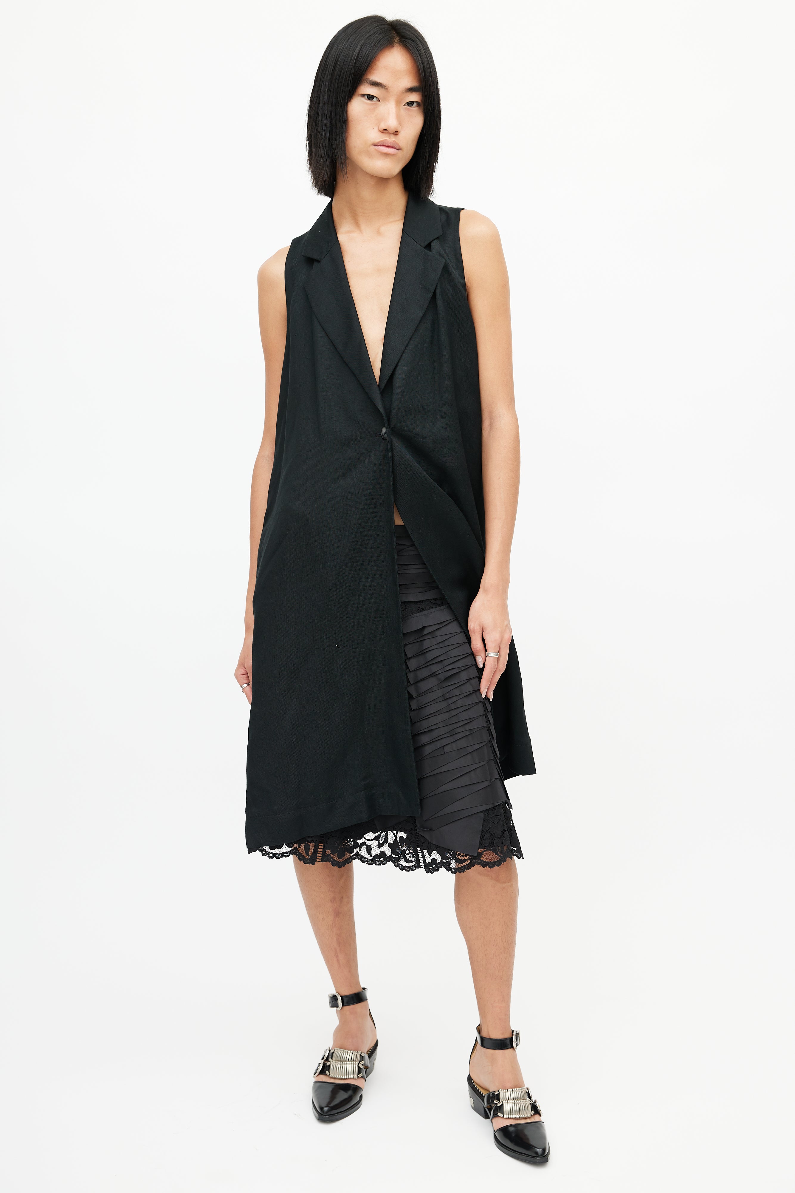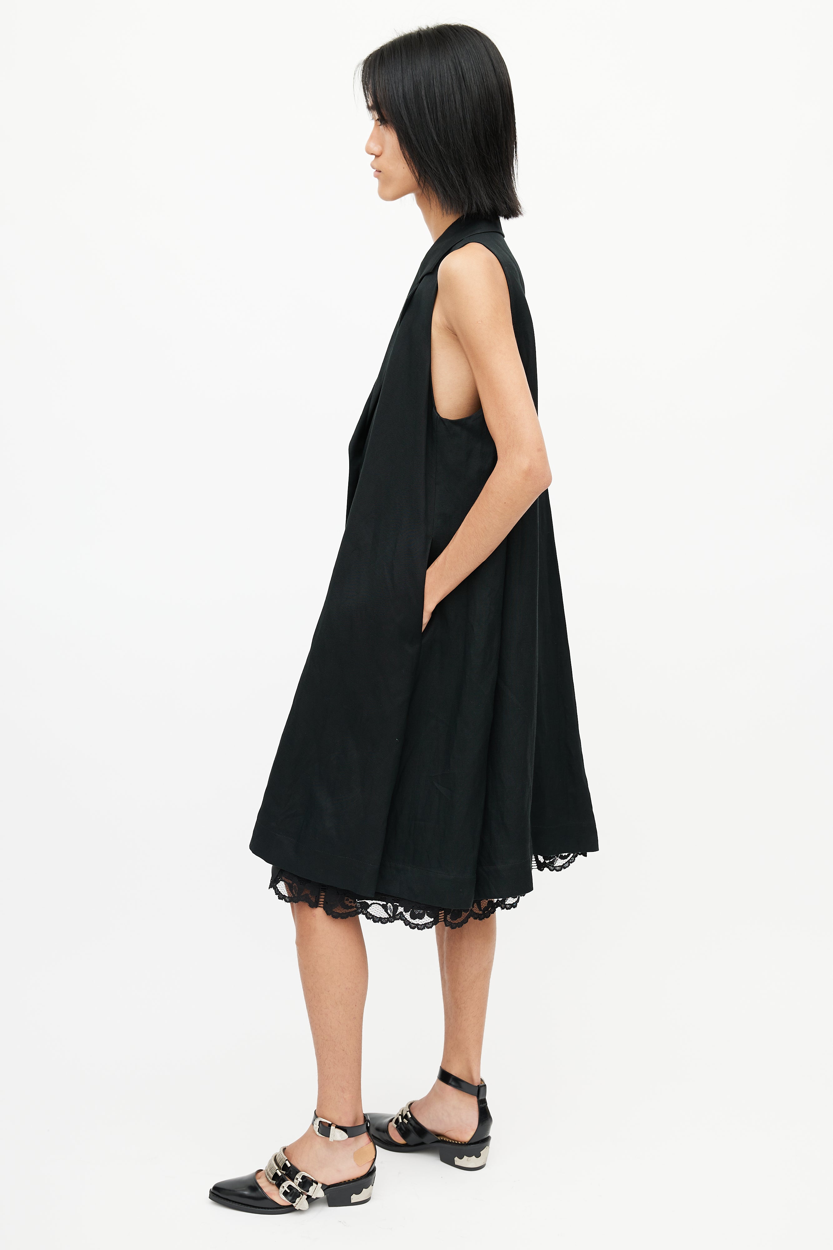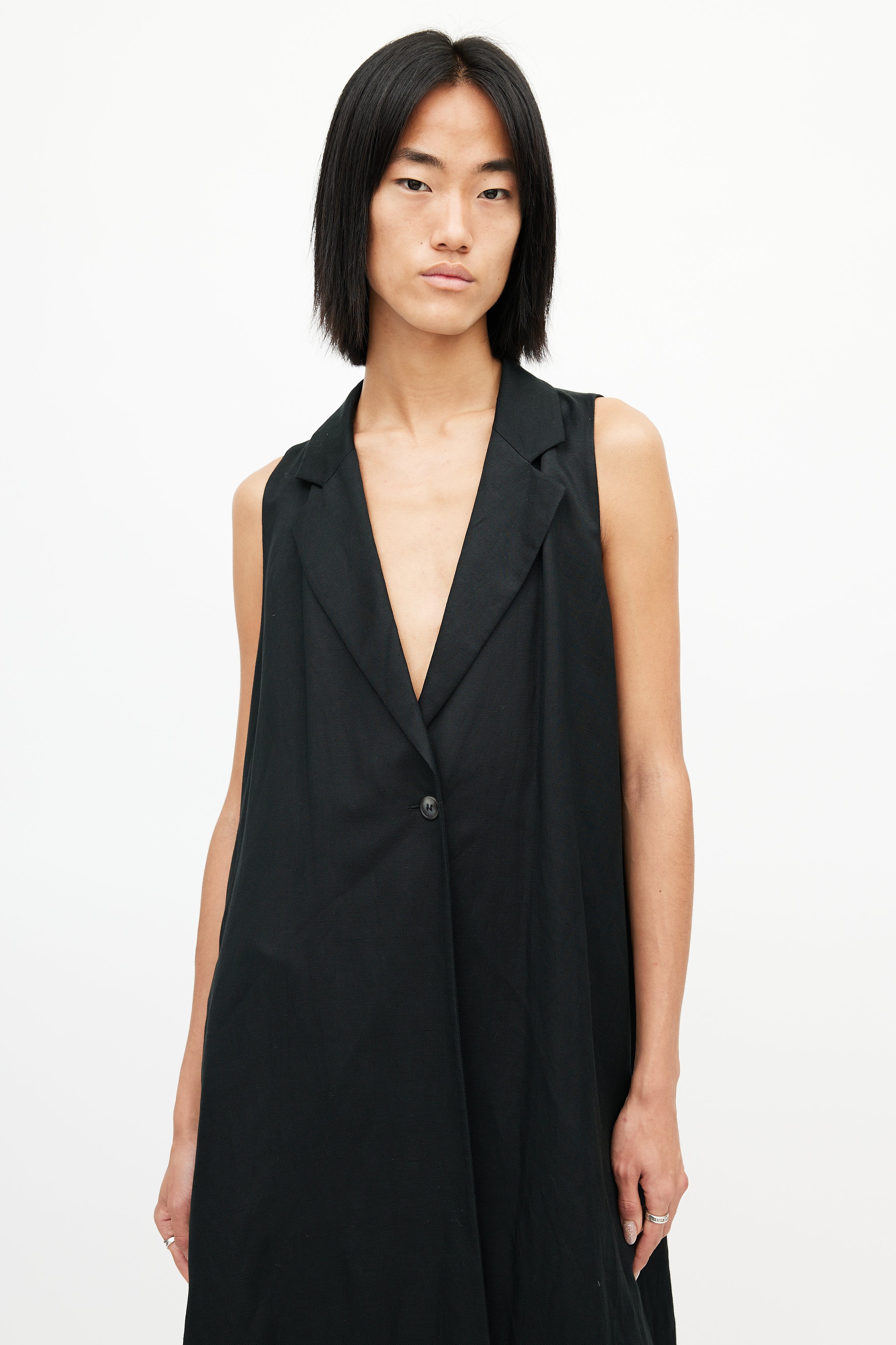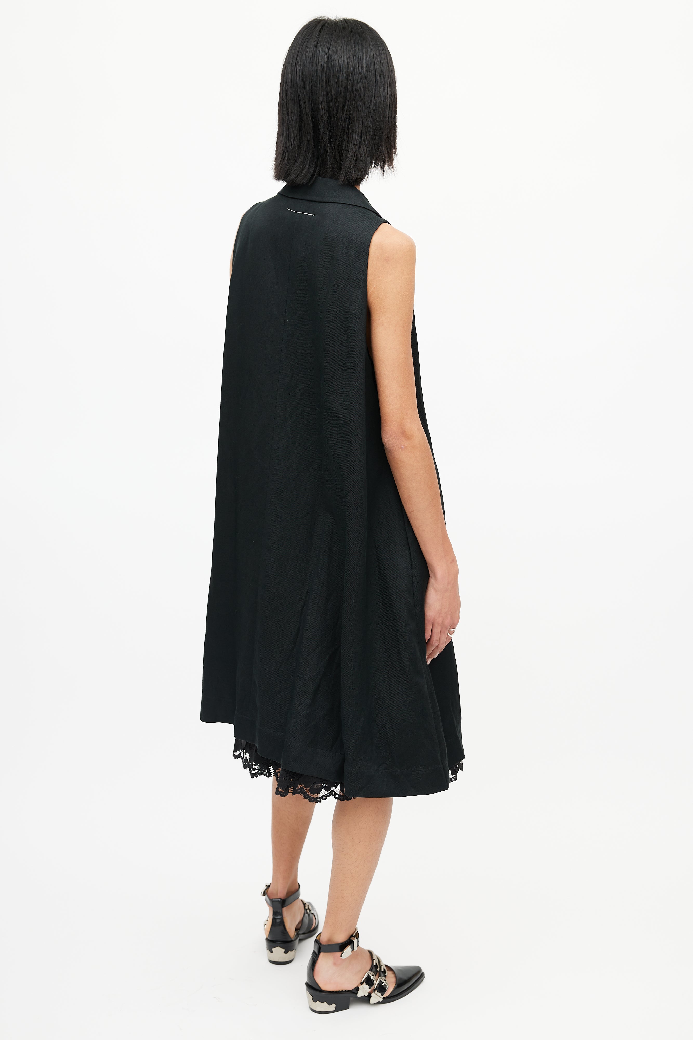 Pre-owned MM6 Maison Margiela black blazer dress featuring a notched lapel, two slash pockets at hip, sleeveless styling, and button up front. Lined.