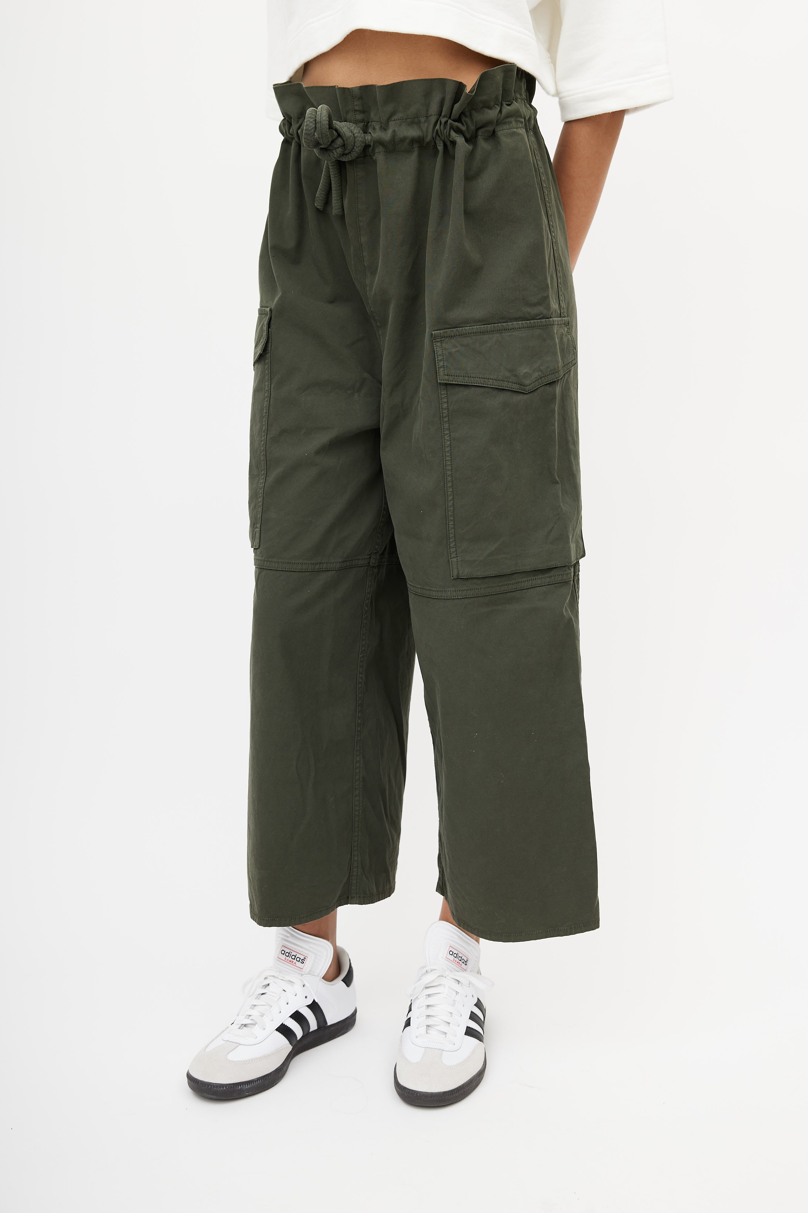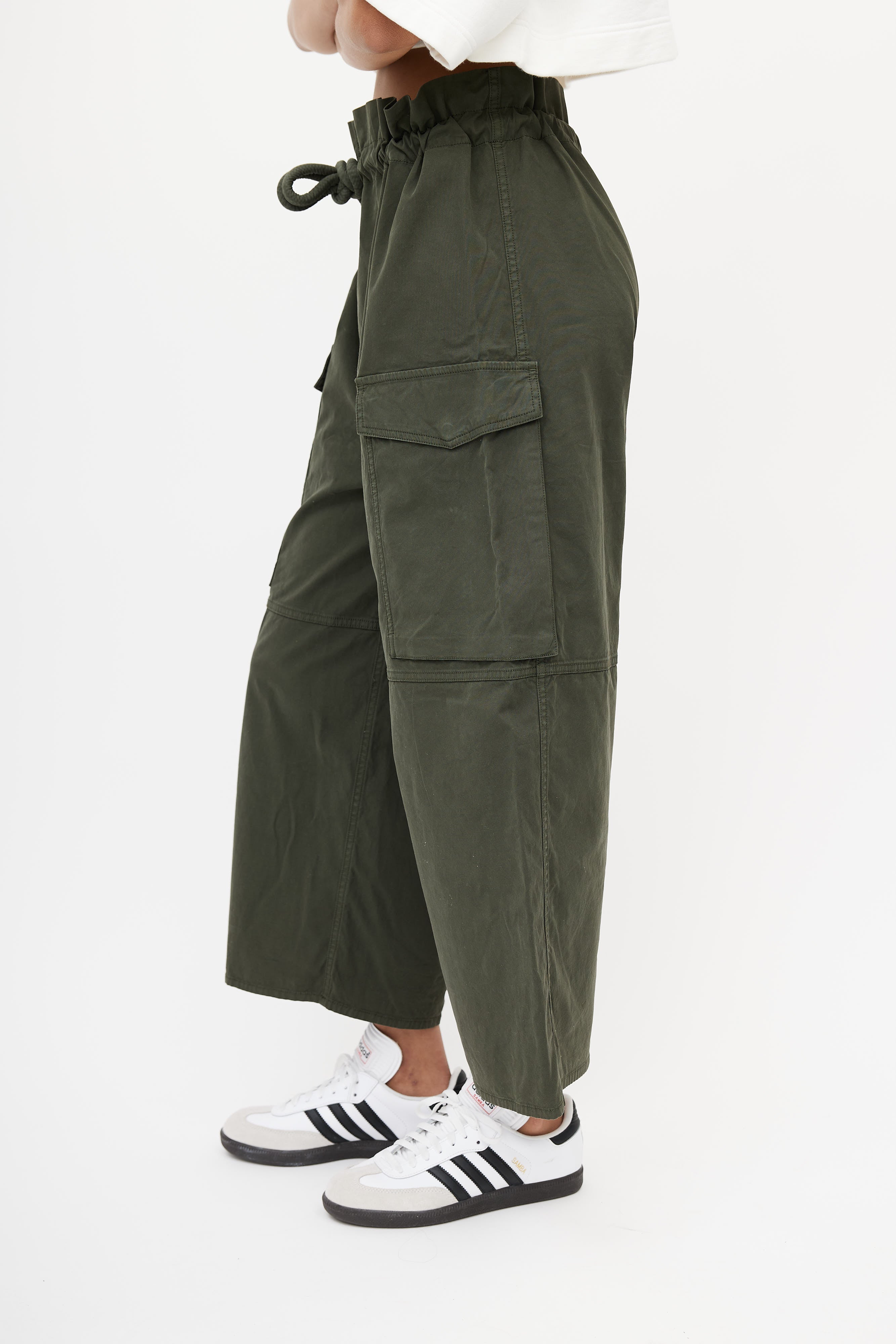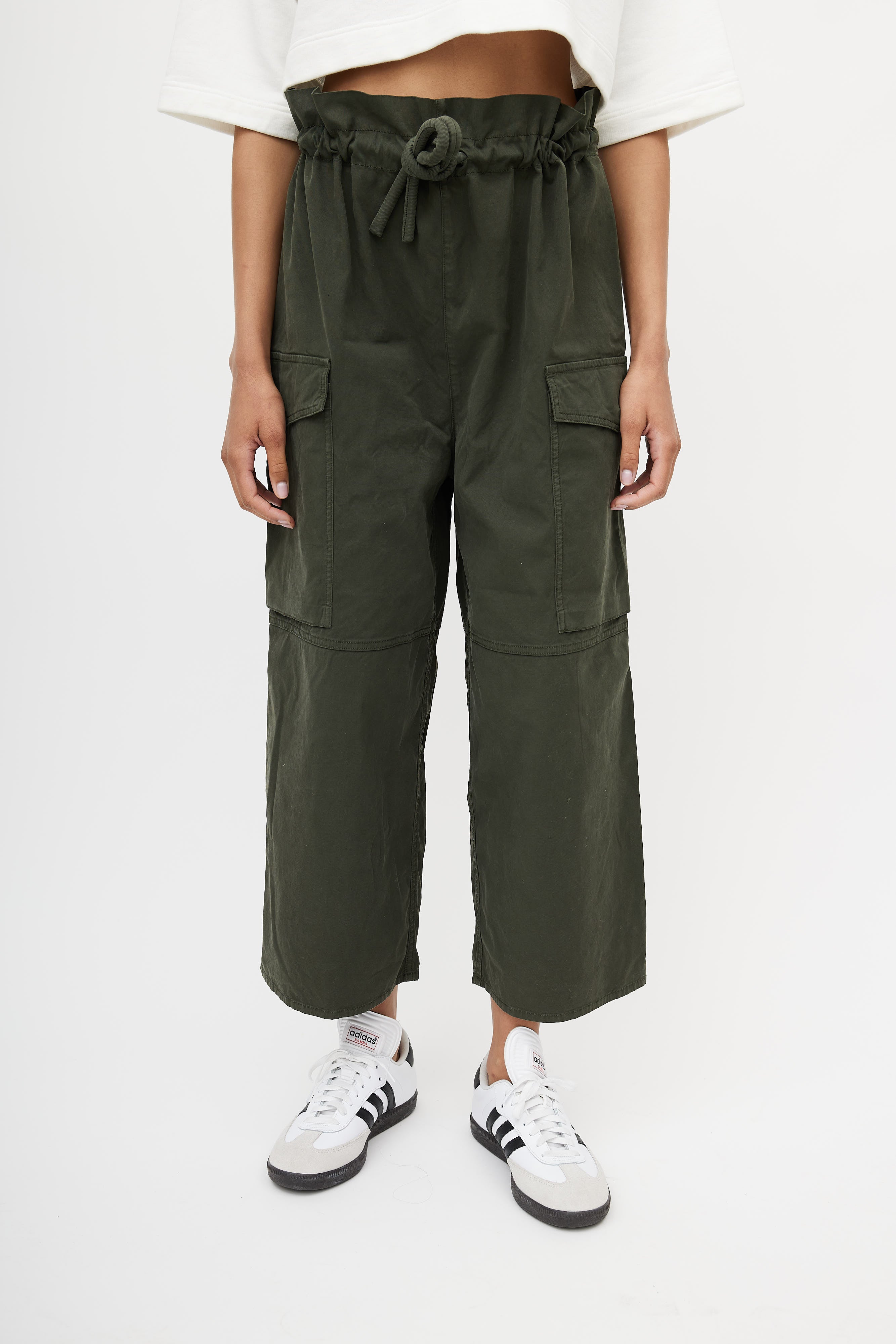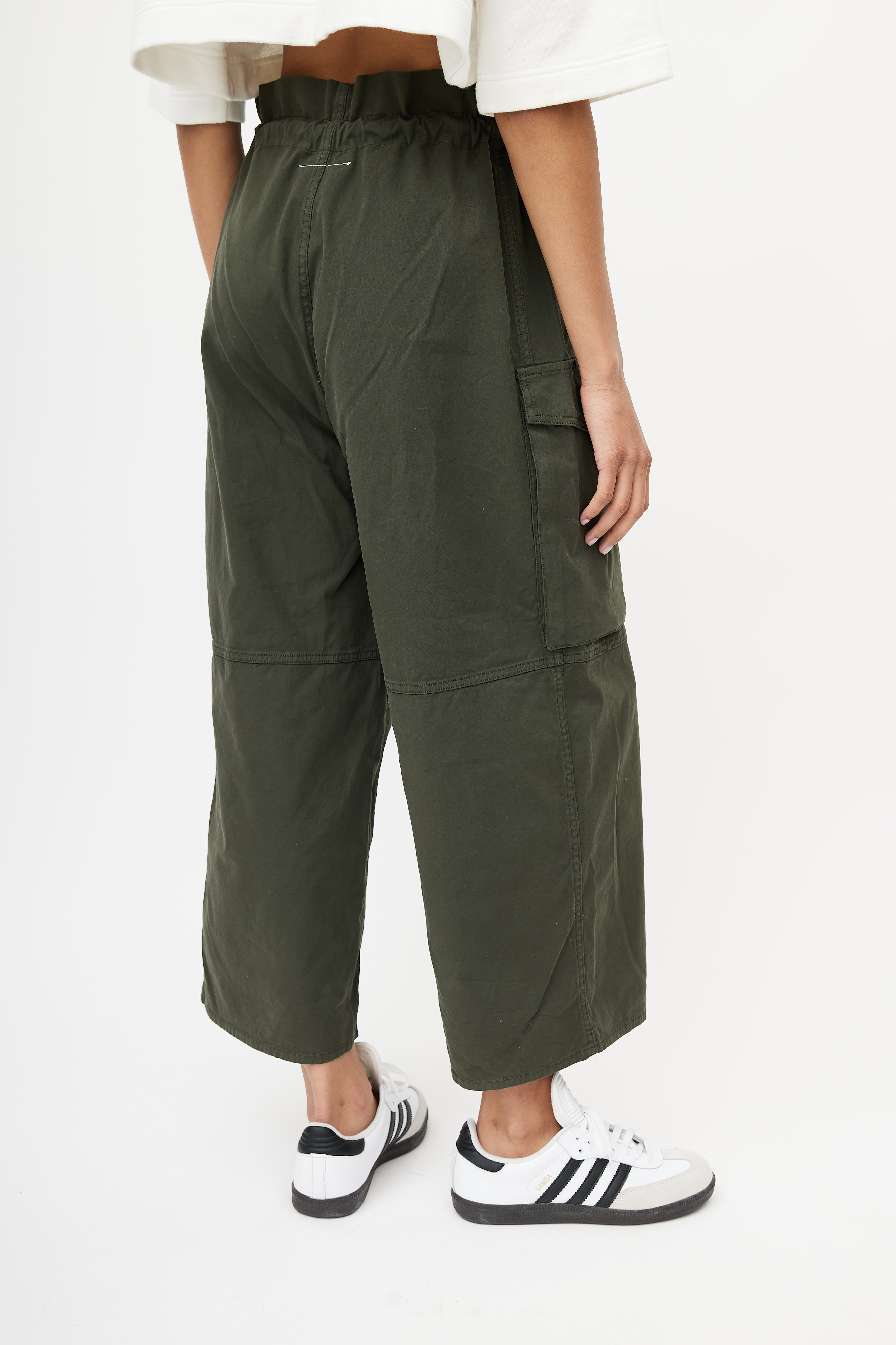 Pre-owned MM6 Maison Margiela green wide leg cargo pants featuring an adjustable drawstring waist, and two cargo pockets at front.