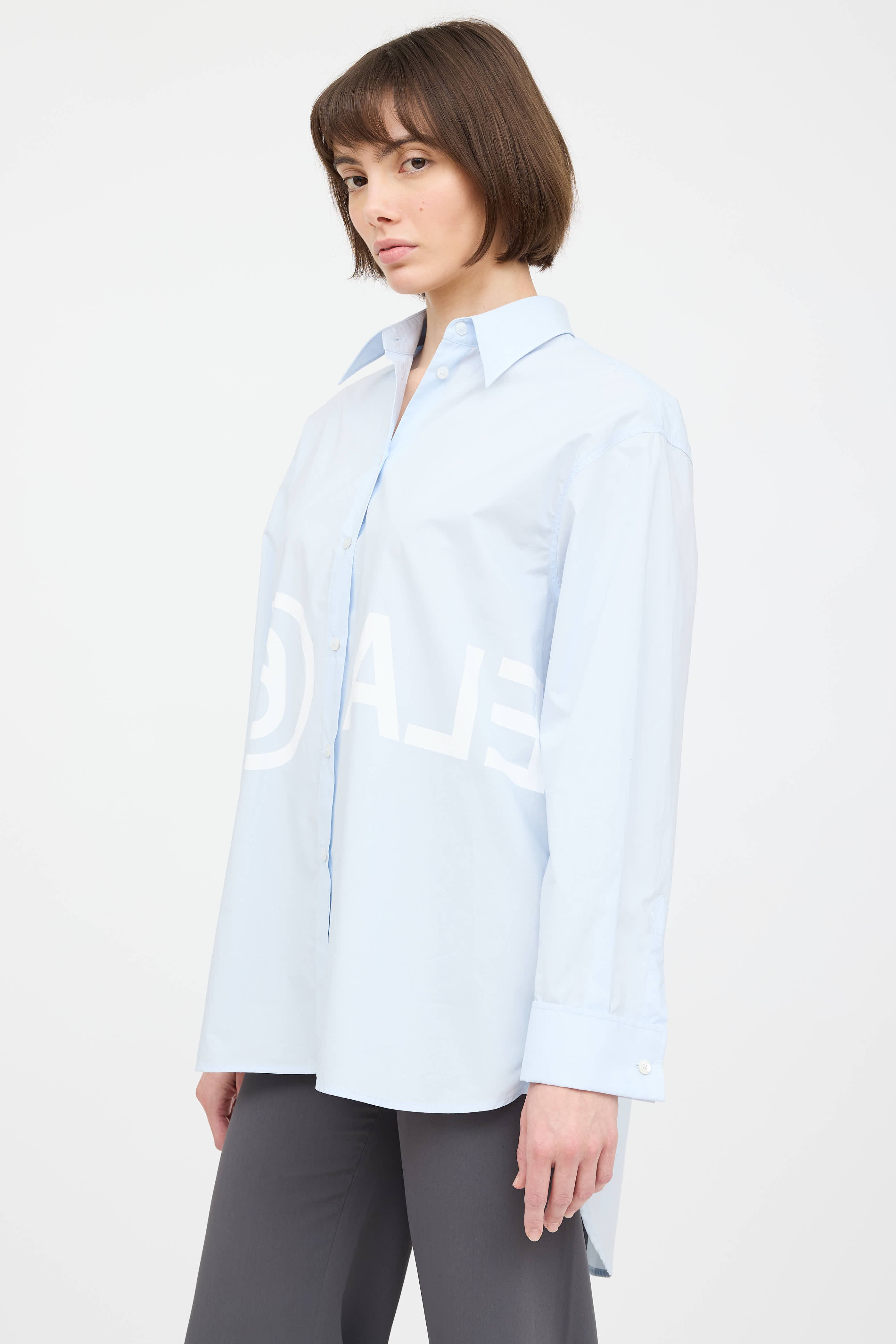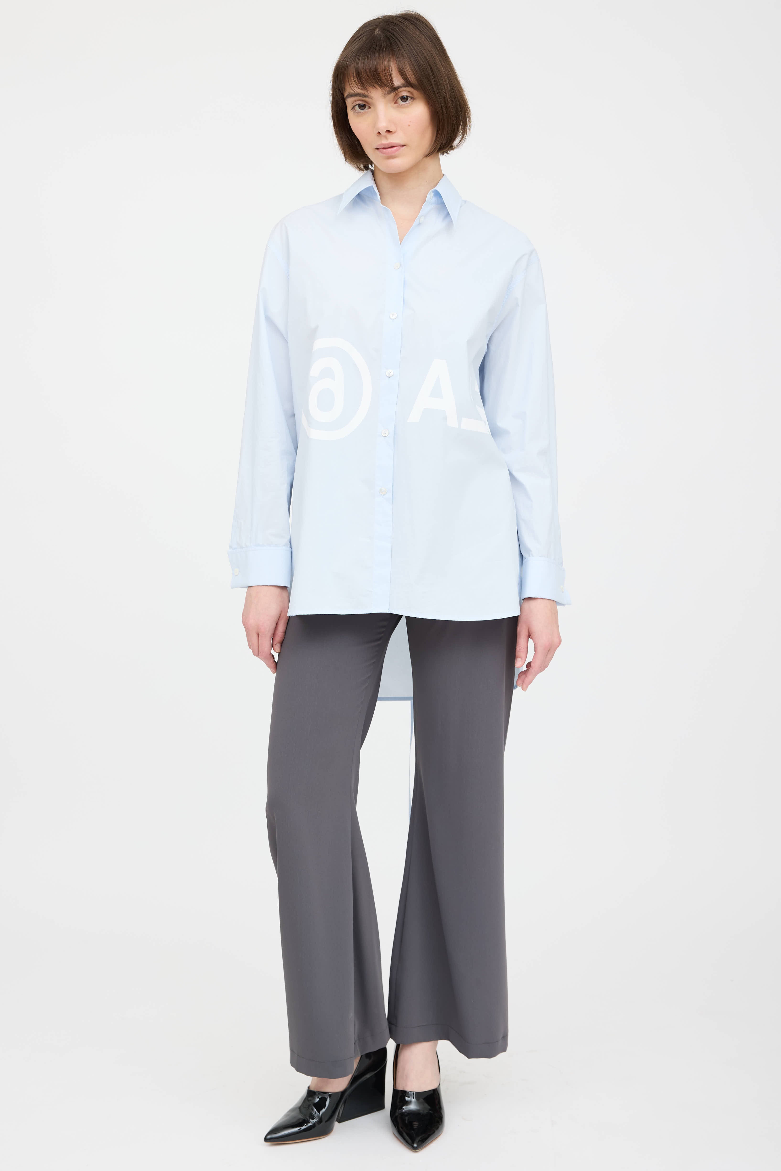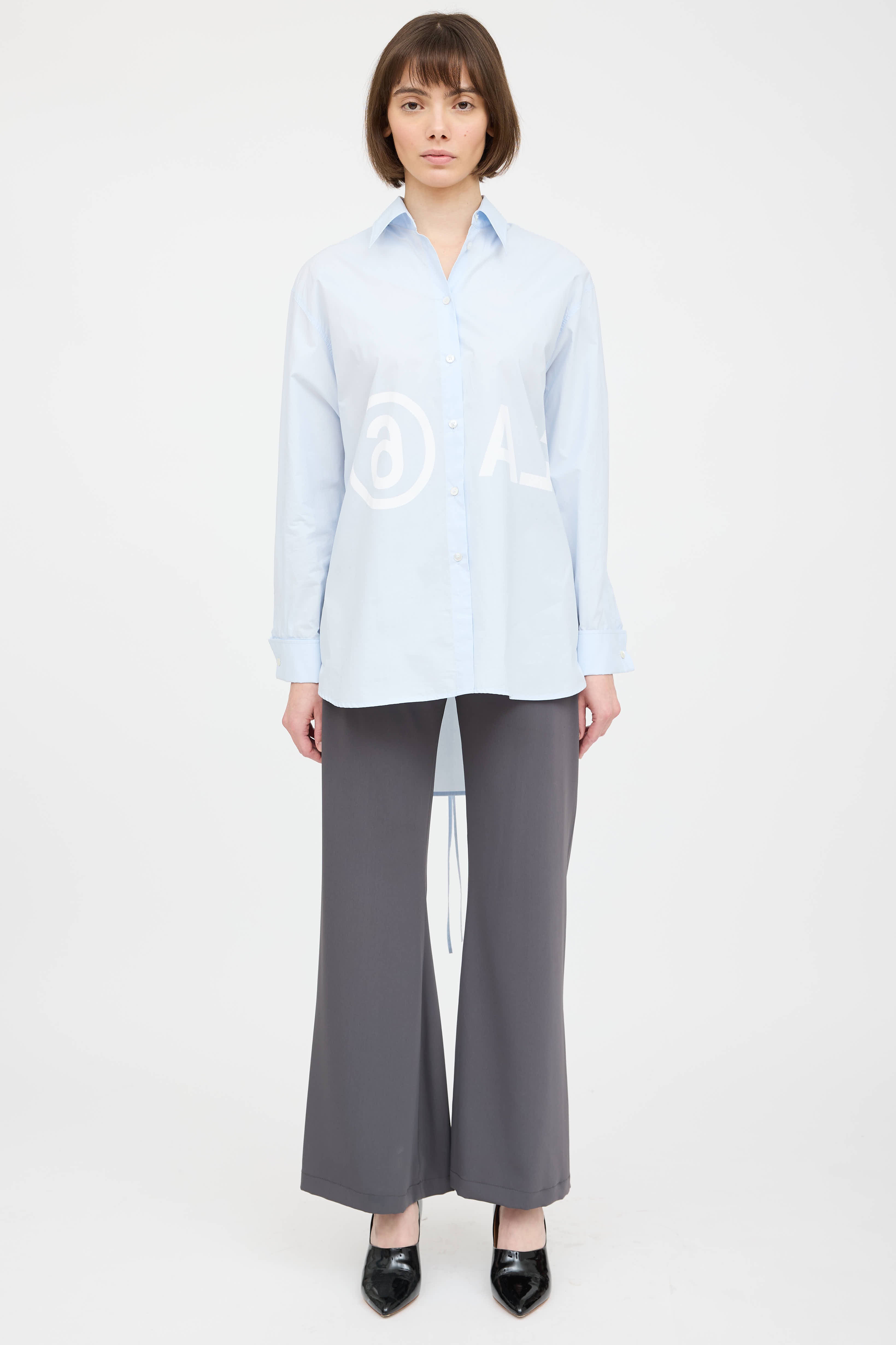 Pre-owne MM6 Maison Margiela blue poplin shirt featuring a white logo print at chest, pointed collar, long sleeves with buttoned french cuffs, drawstring tie detail at back, high low hem, and button up closure.