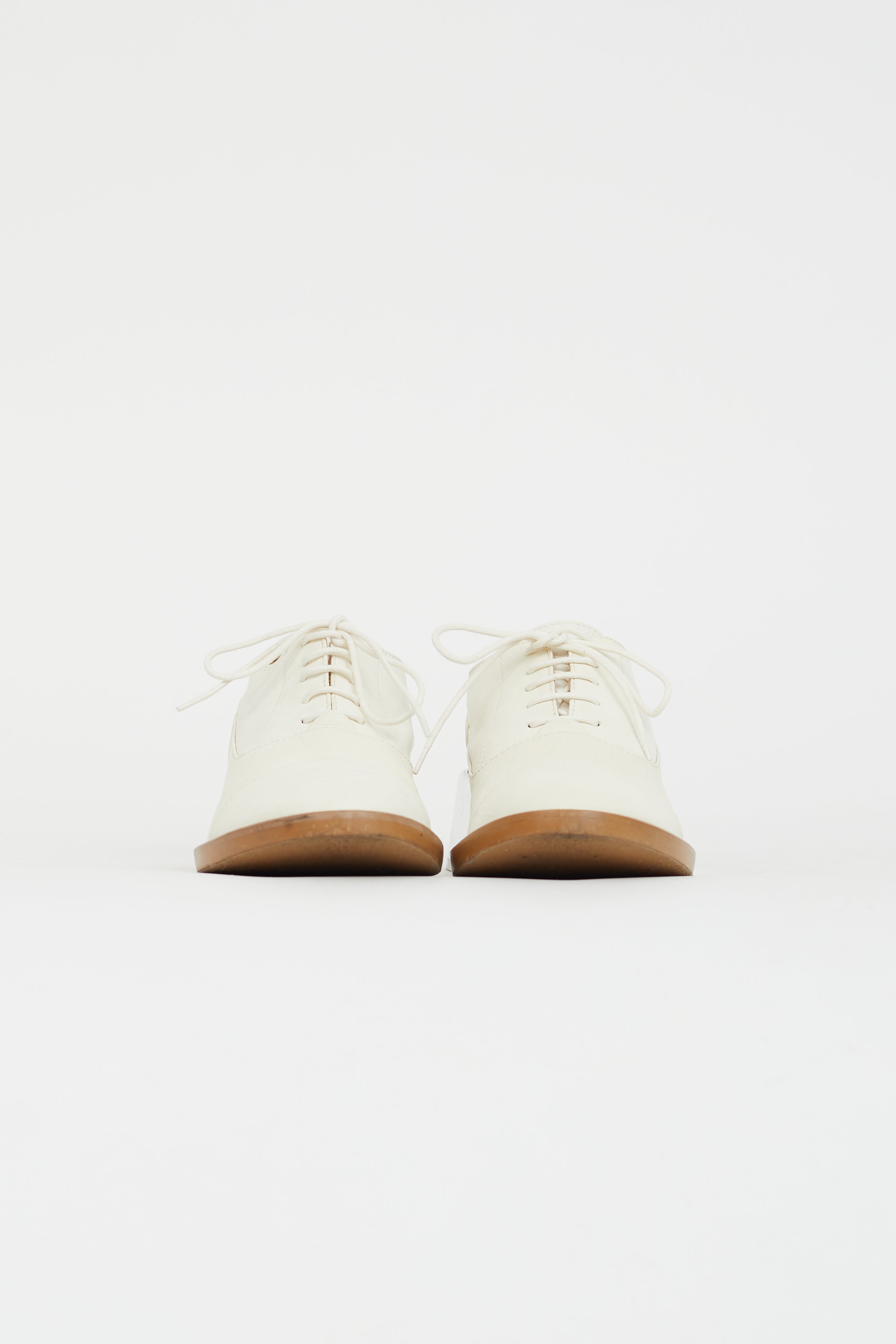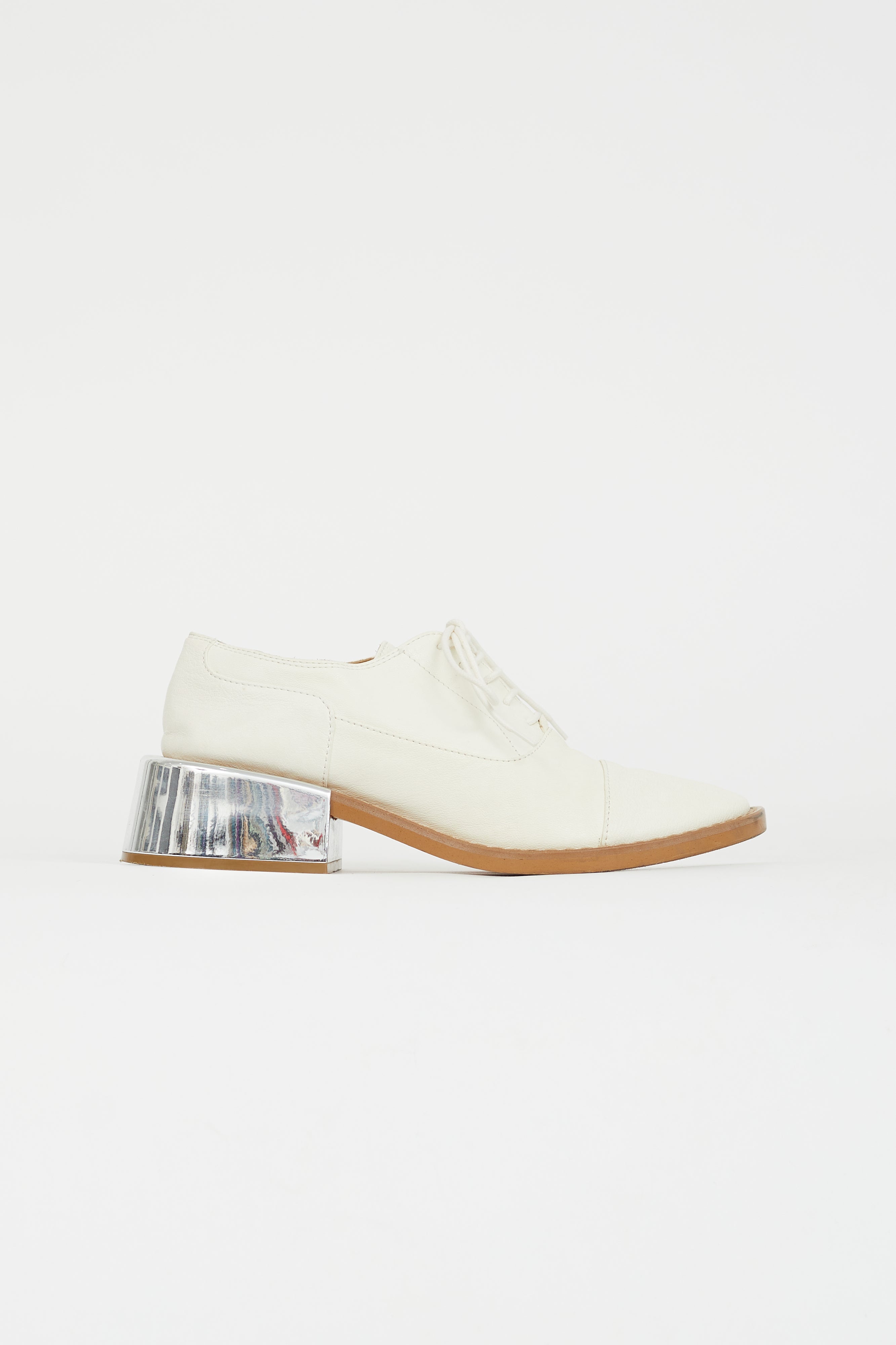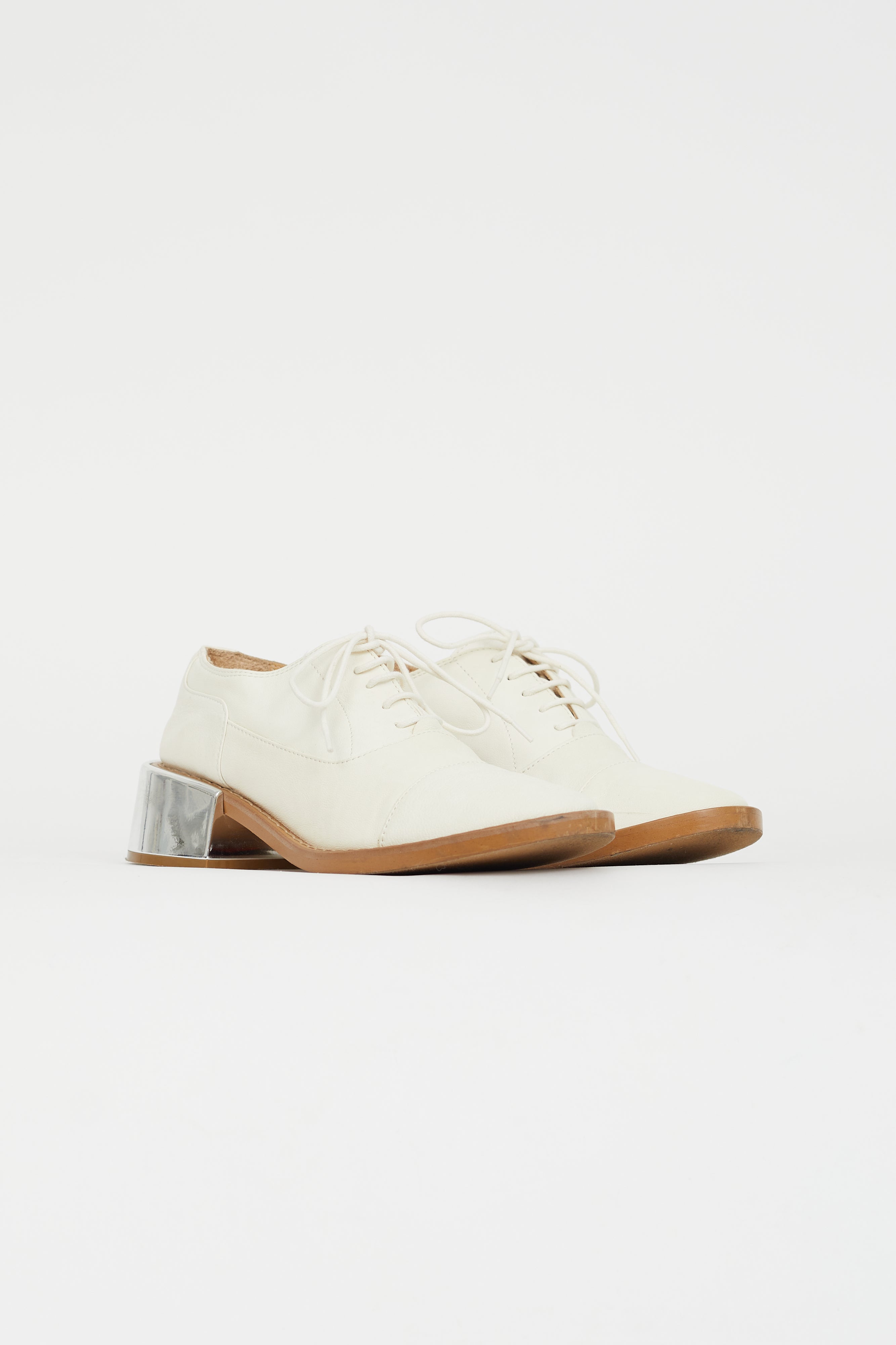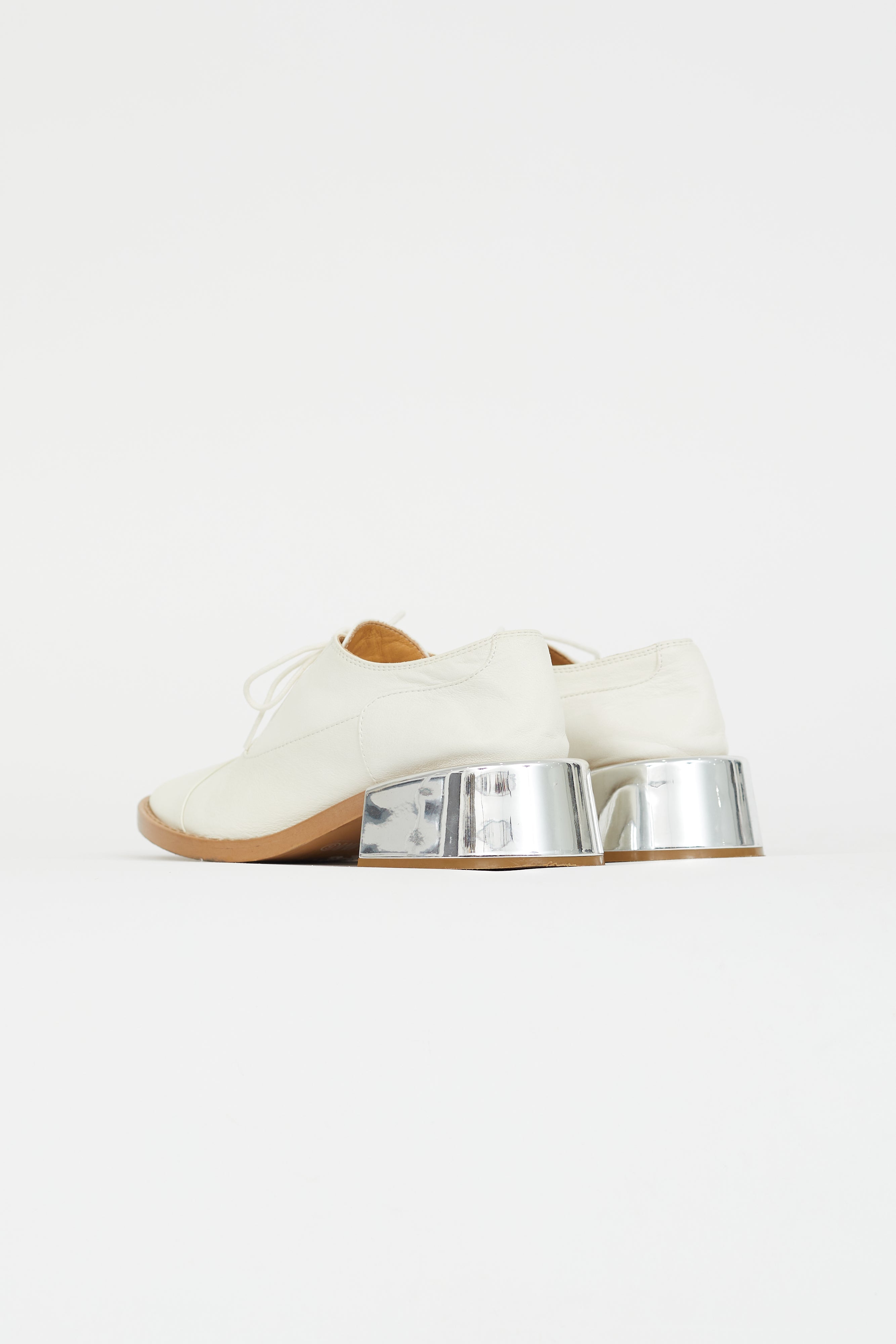 Pre-owned MM6 Maison Margiela oxford in white featuring lace-up closure, rounded toe, leather insole with logo stamp, tonal paneling detail throughout, brown wooden midsole with stitching detail, and silver mirrored block heel.