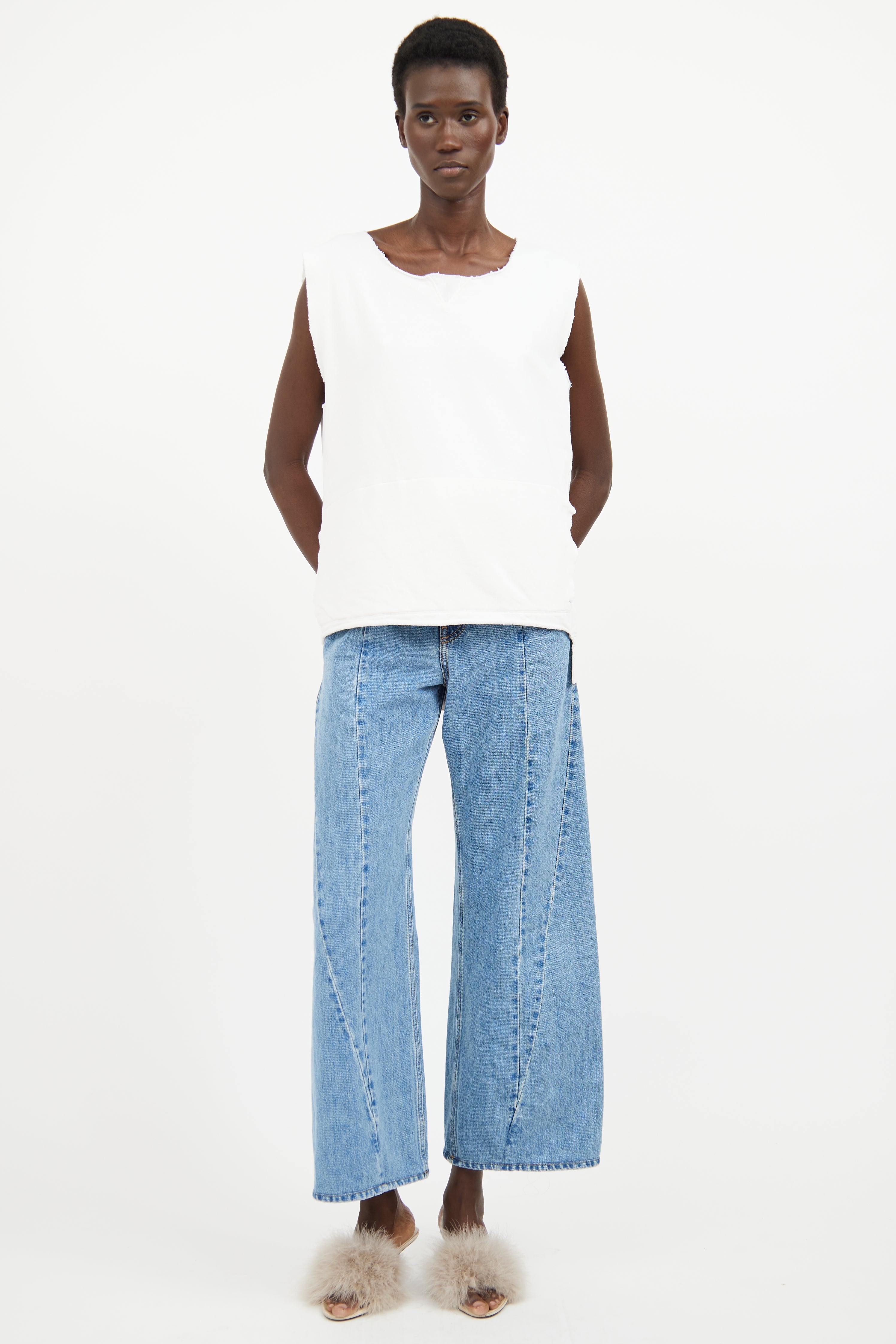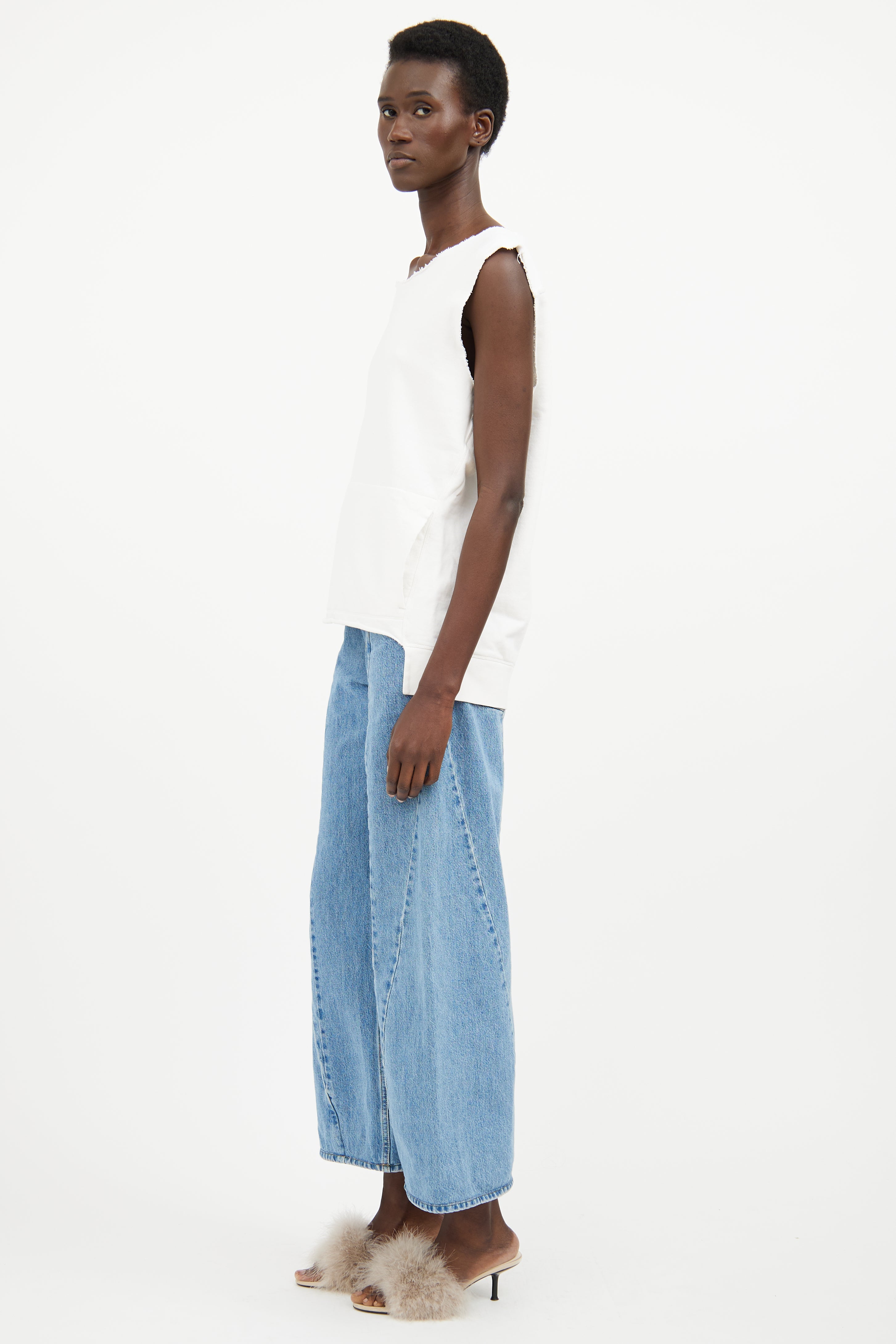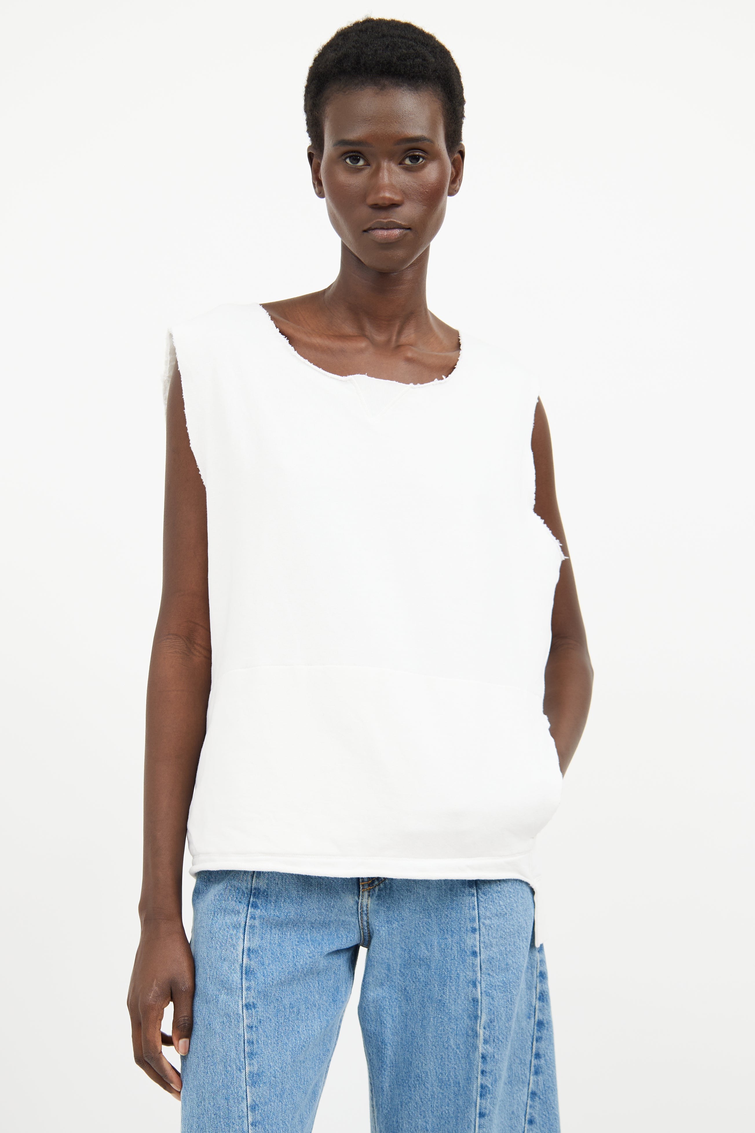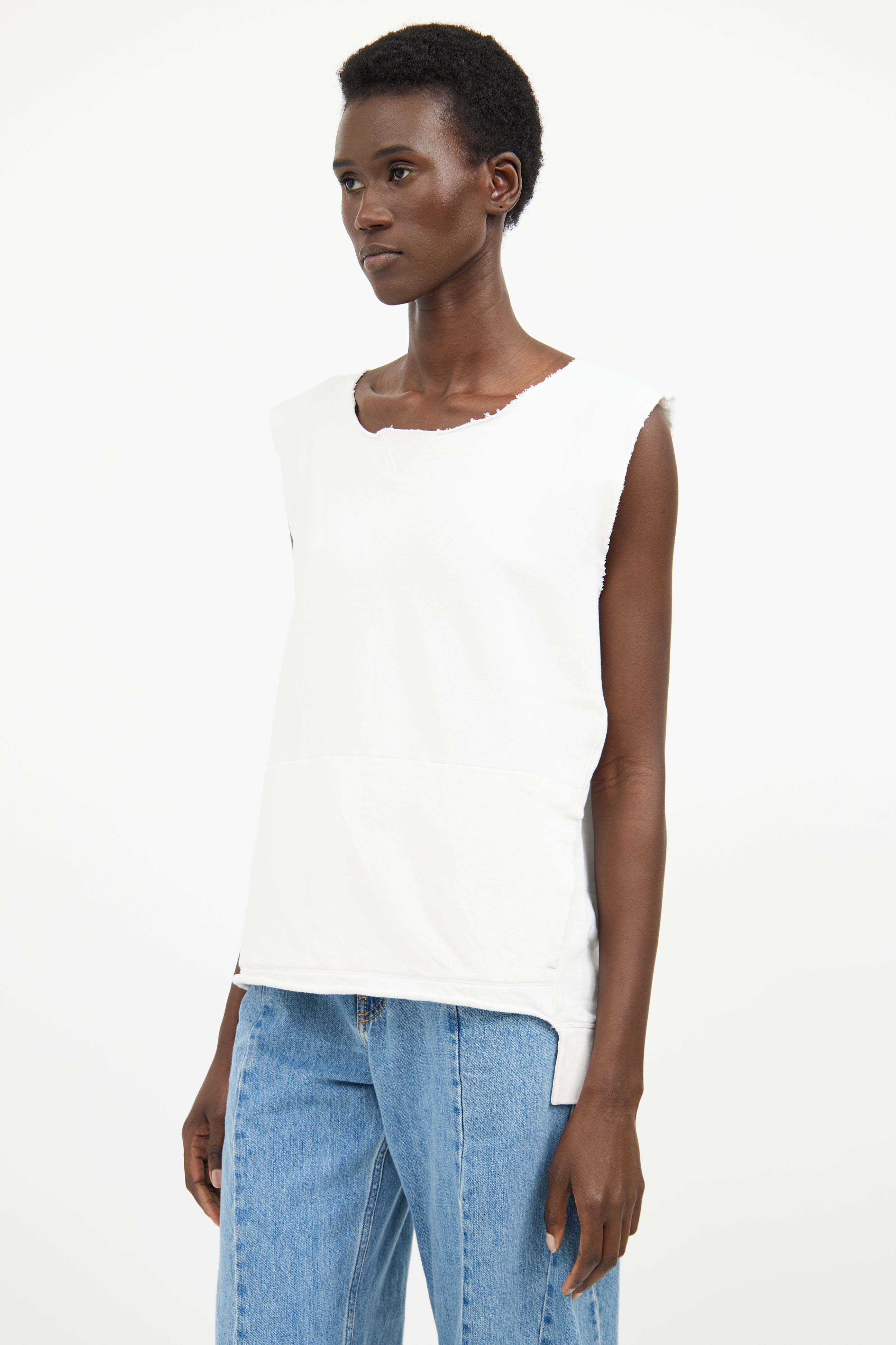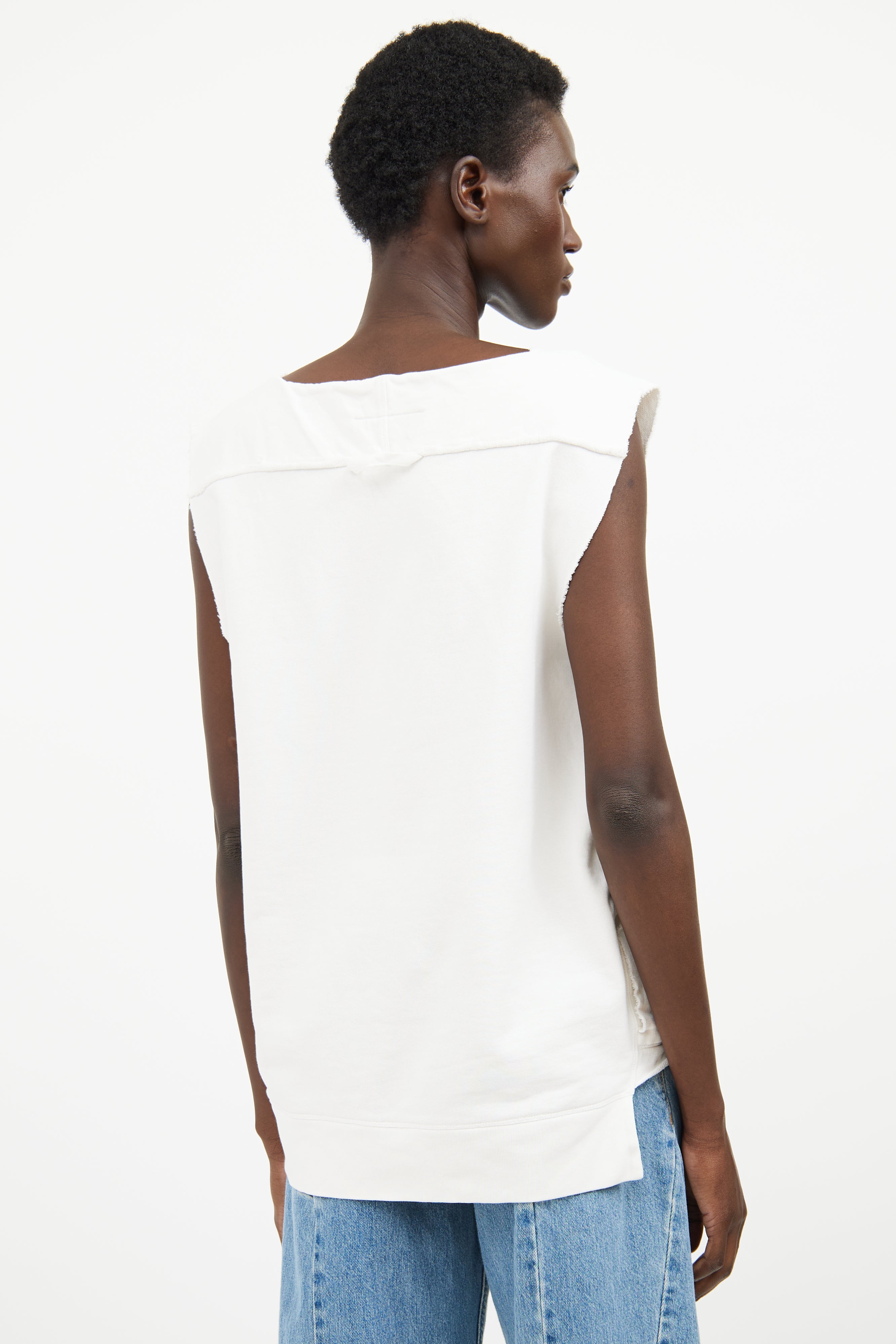 Pre-owned MM6 Maison Margiela white short sleeve top featuring round neck, raw edge hem, kangaroo pocket on front and high low hemline.