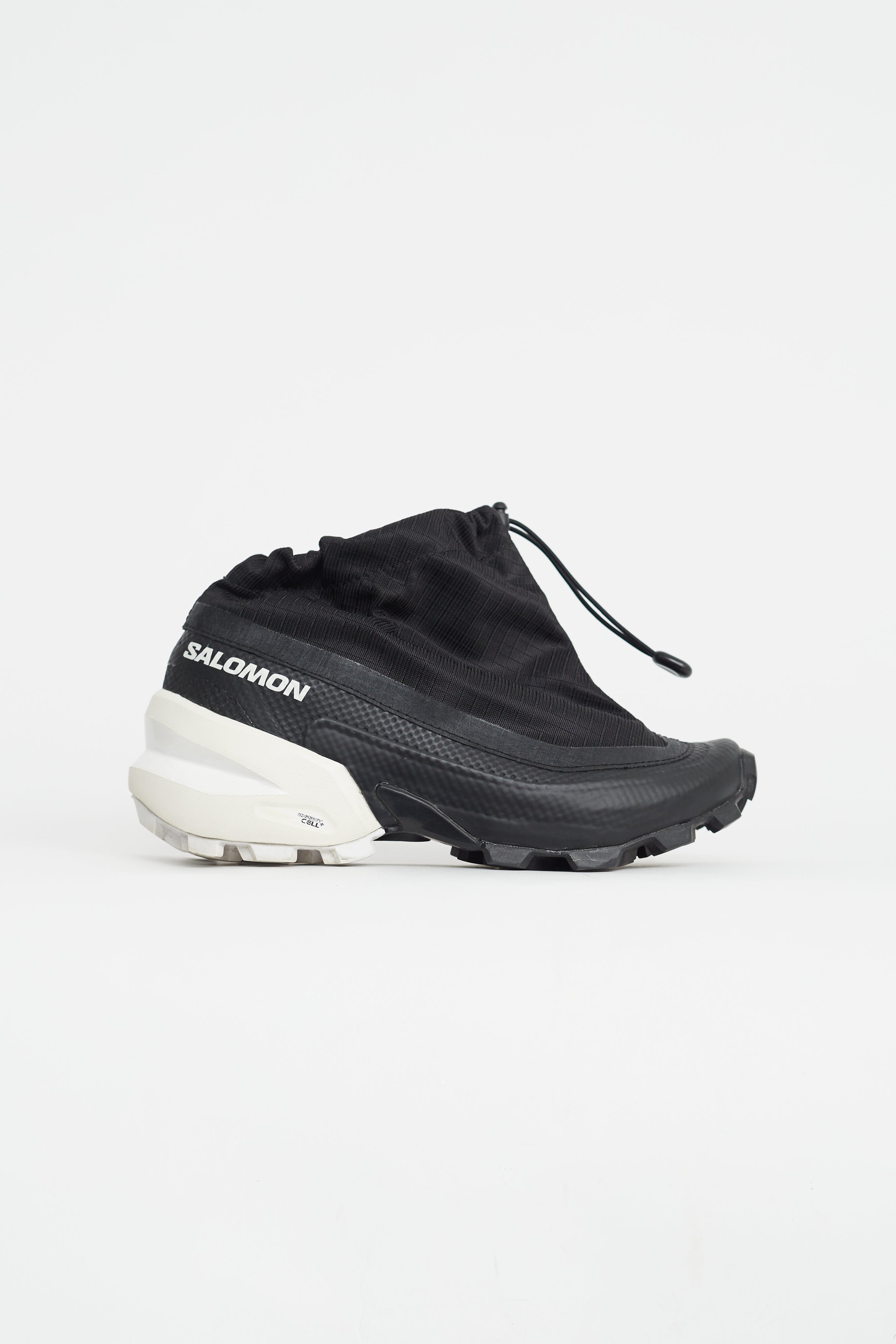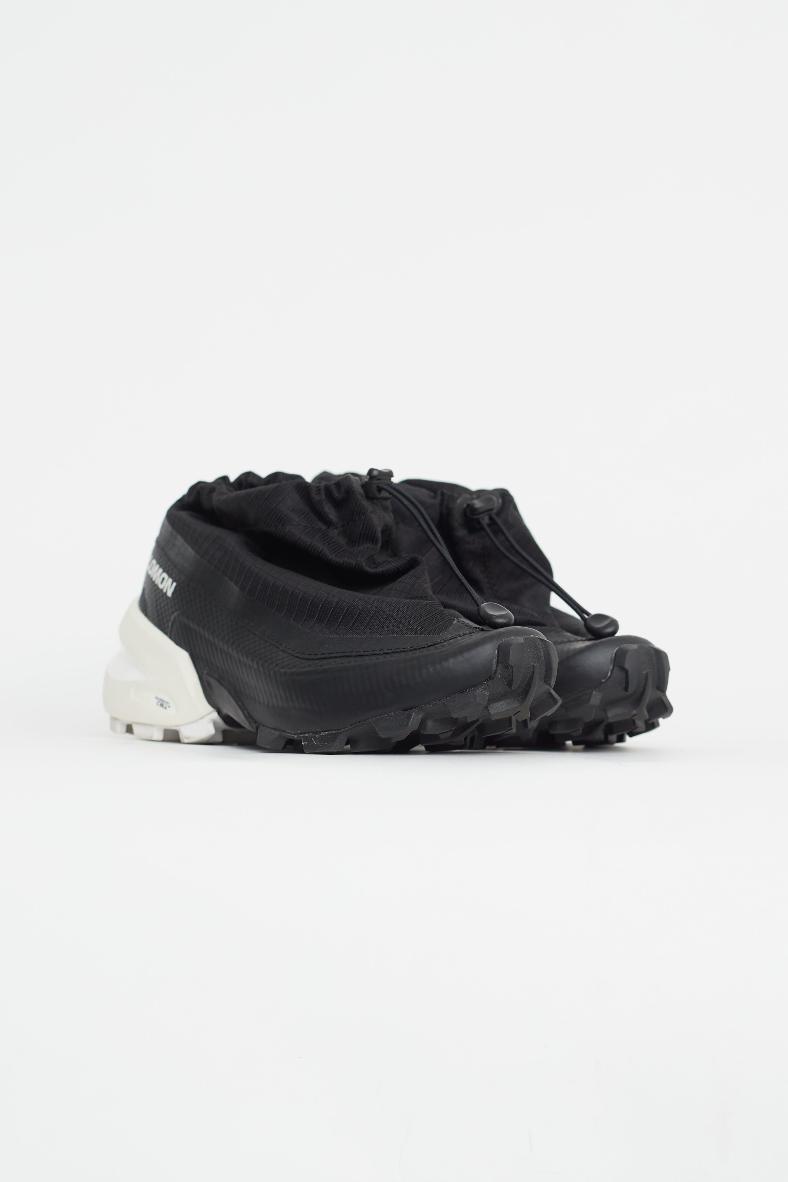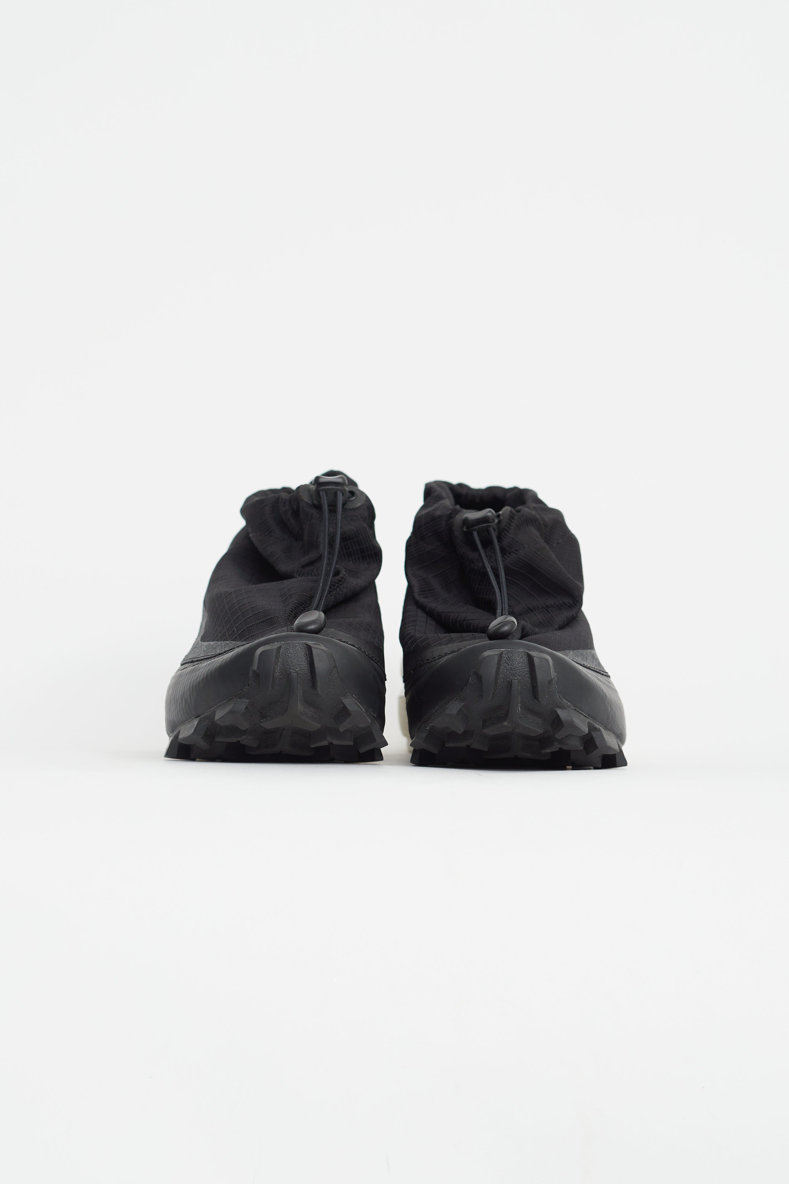 Pre-owned MM6 Maison Margiela X Salomon nylon sneaker featuring a narrow rounded toe, rubber upper sides and nylon top upper, bungee cord scrunch ankle opening and a platform sole with a white heel.