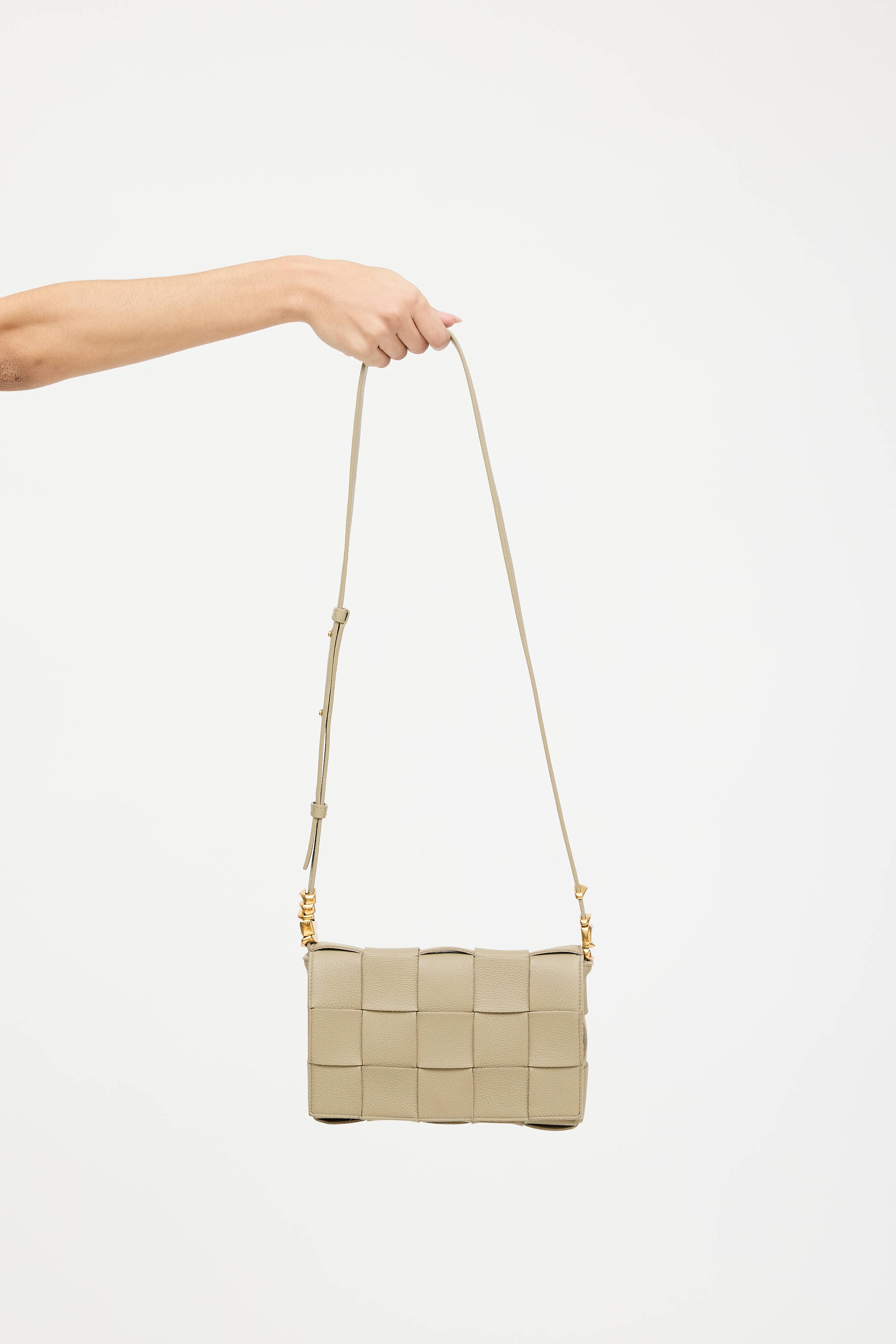 Pre-owned Bottega Veneta green leather crossbody bag featuring an Intrecciato weave, top flap, one main compartment with one zip pocket, adjustable shoulder strap with gold tone abstract hardware, and front magnetic snap closure.