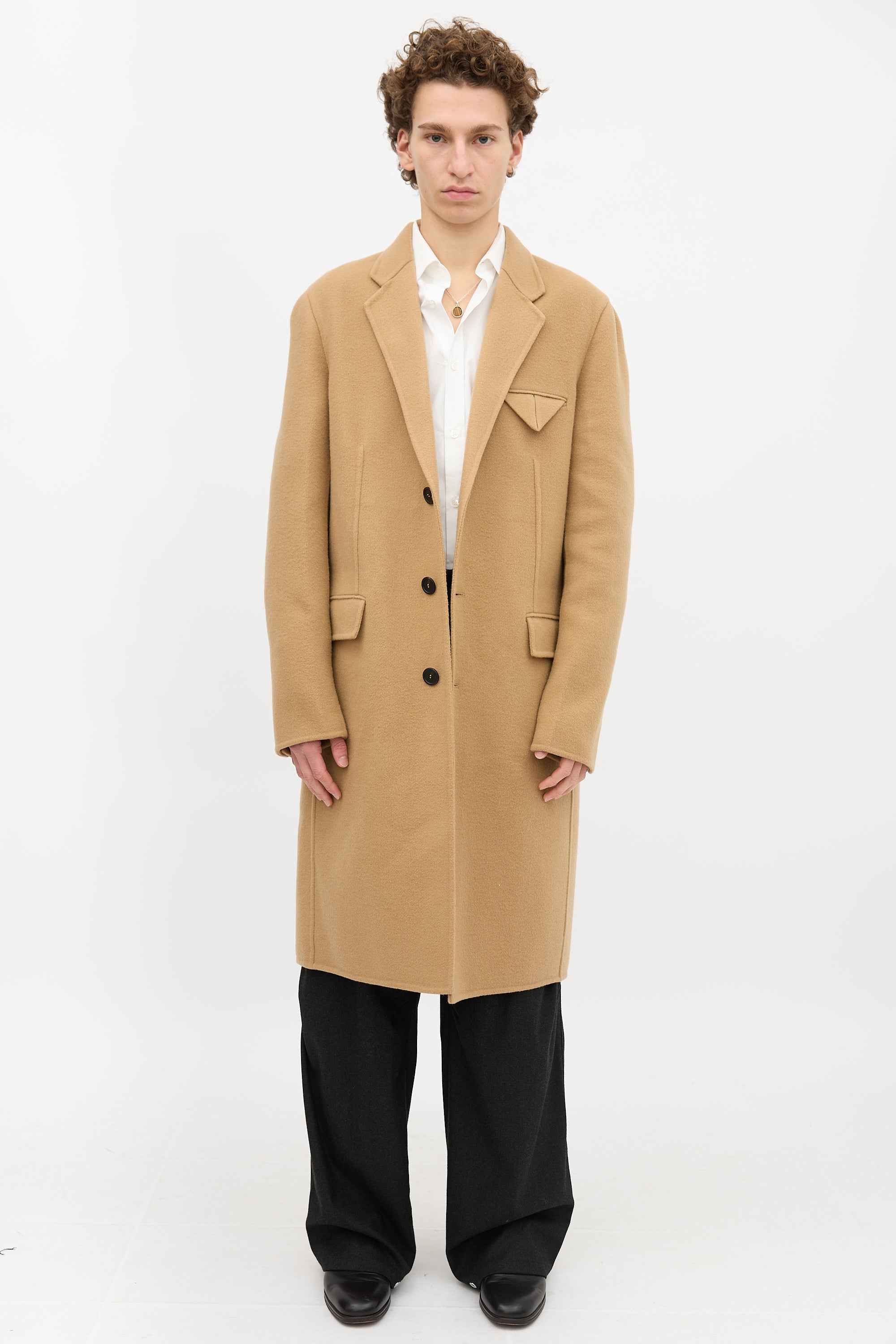 Pre-owned Bottega Veneta Pre-Fall 2019 beige cashmere coat featuring a notched lapel, three button front, three flap pockets at front, vented cuffs, and vented back. Partially lined.
