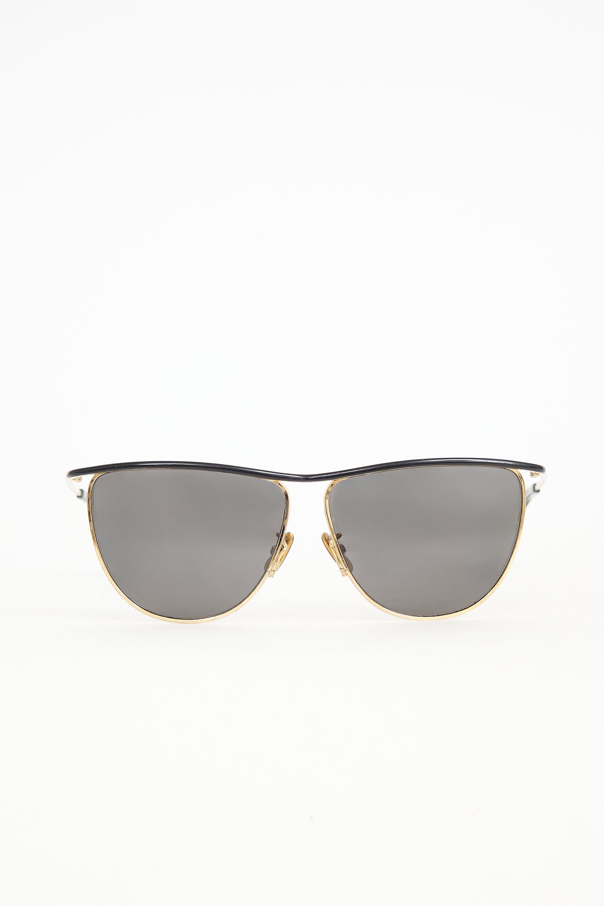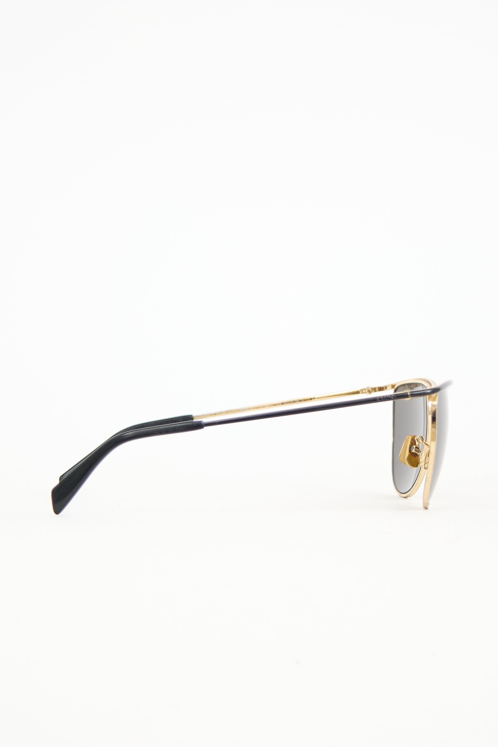 Pre-owned Celine CL40098U sunglasses featuring grey tinted lenses, gold tone metal cateye frame, black accent along topline and arms, and etched logo at temples. Comes with original case and wipe cloth.