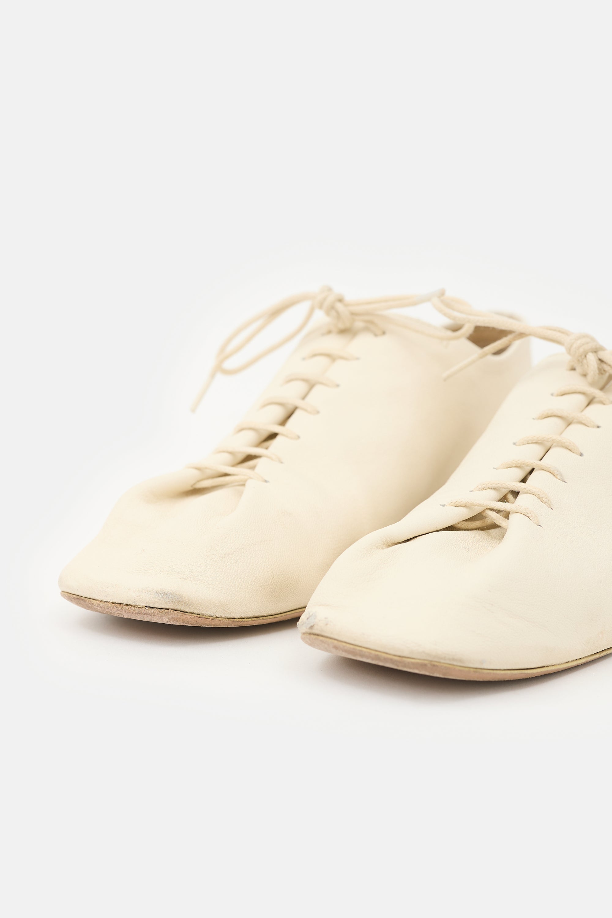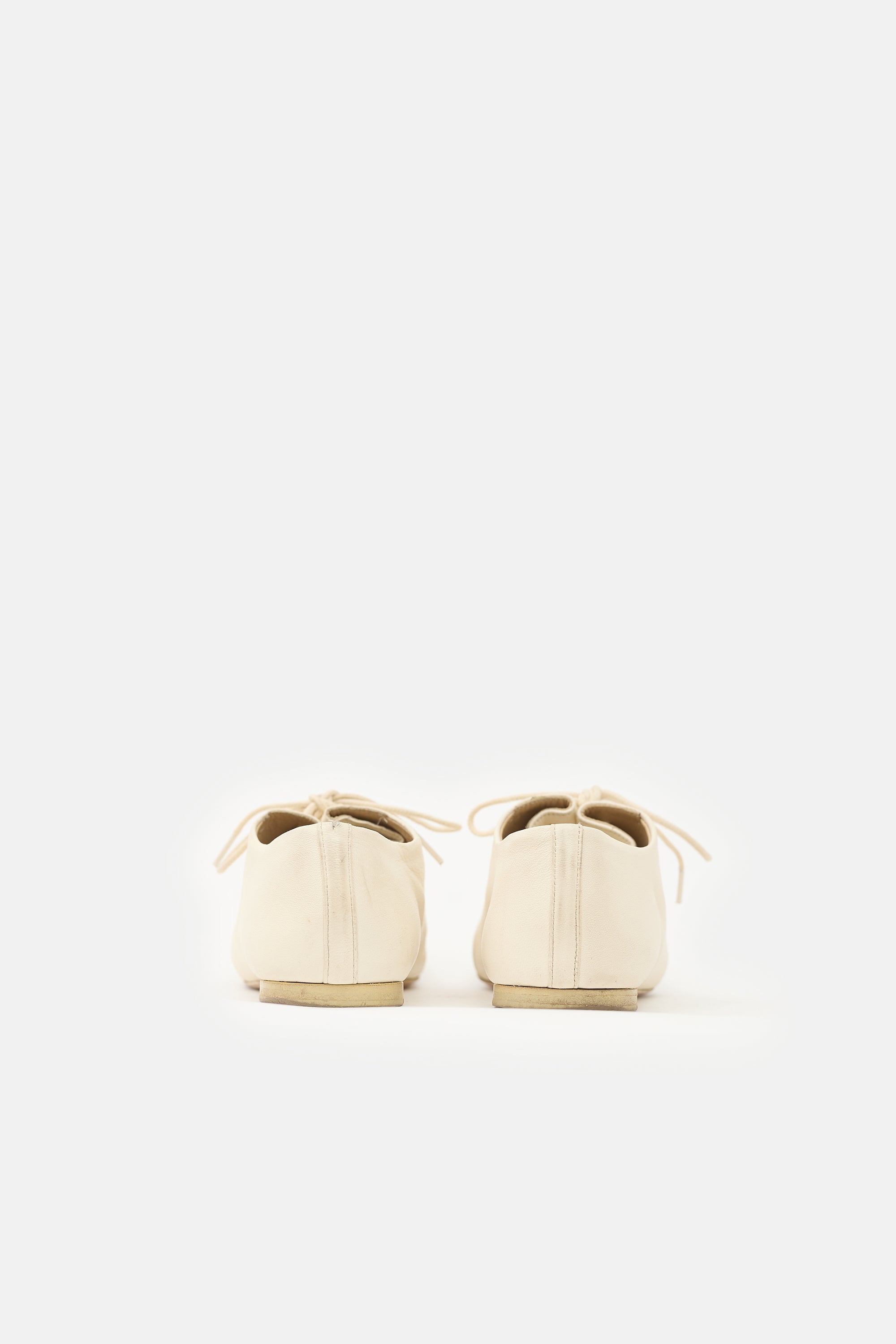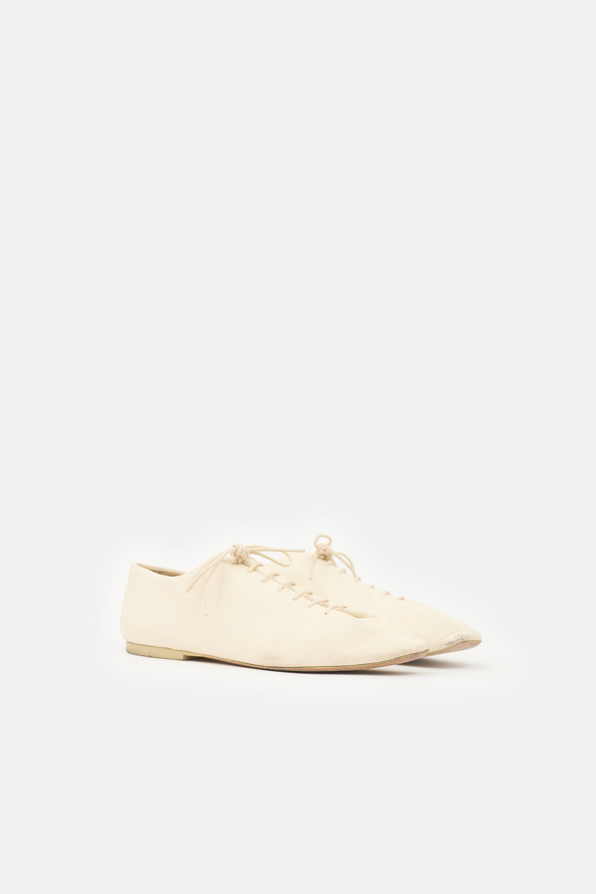 Pre-owned Lemaire white leather Souris derbys featuring a squared toe and pleated lace up front.
