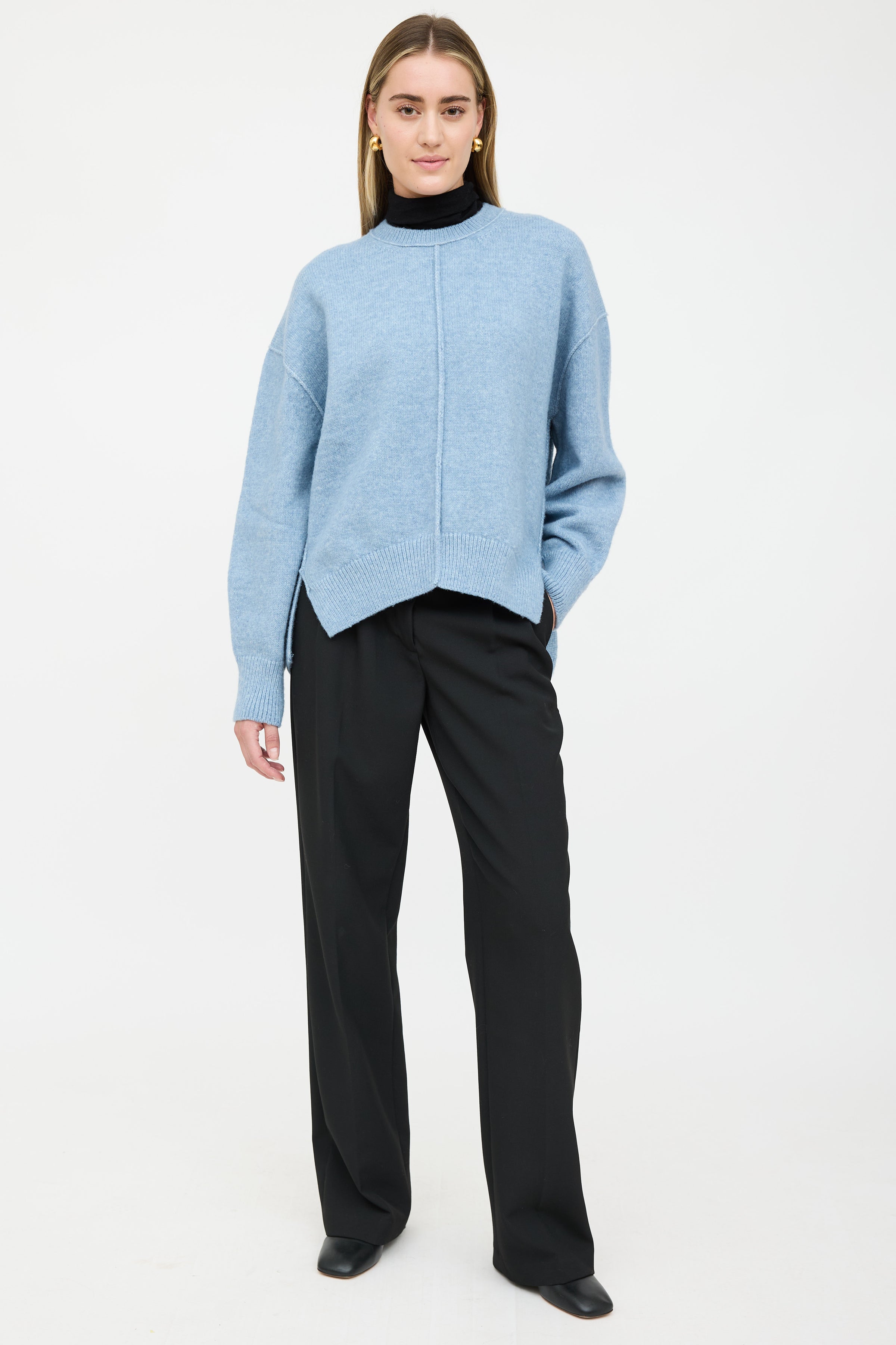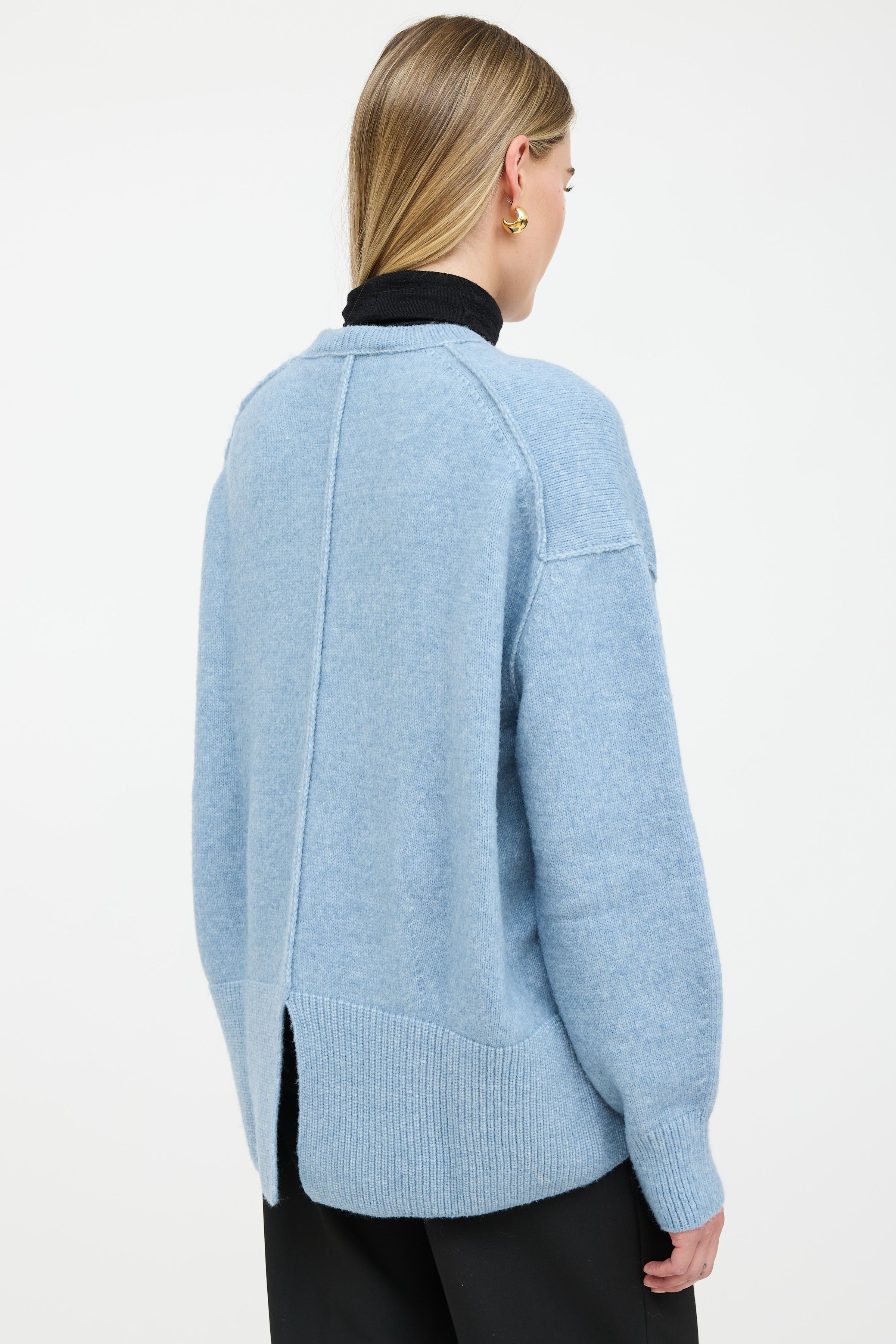 Pre-owned Prozena Schouler White Label long sleeve sweater featuring crew neckline, centre seam at front and back, dropped shoulders, and slit at hem with high low hem.