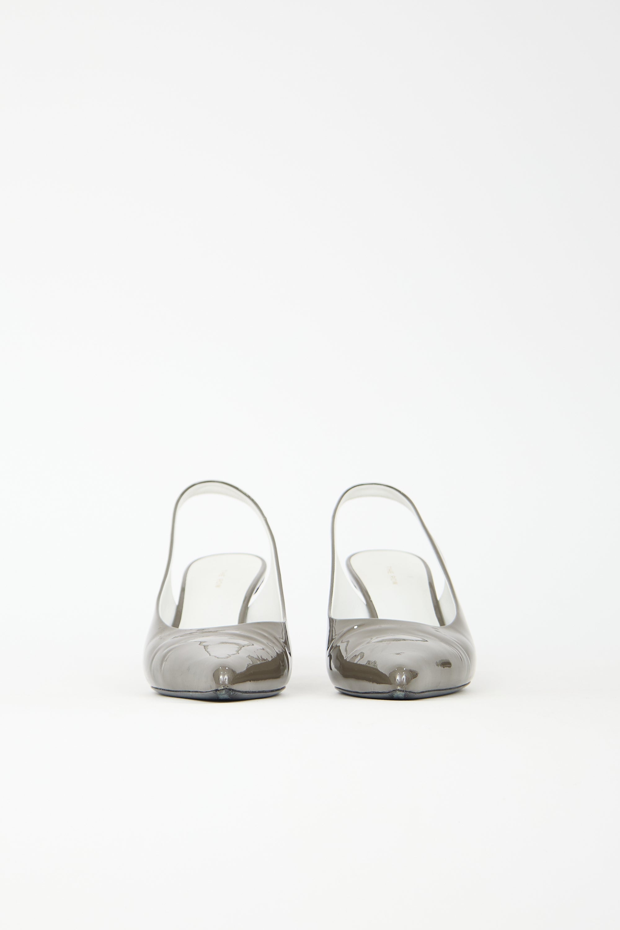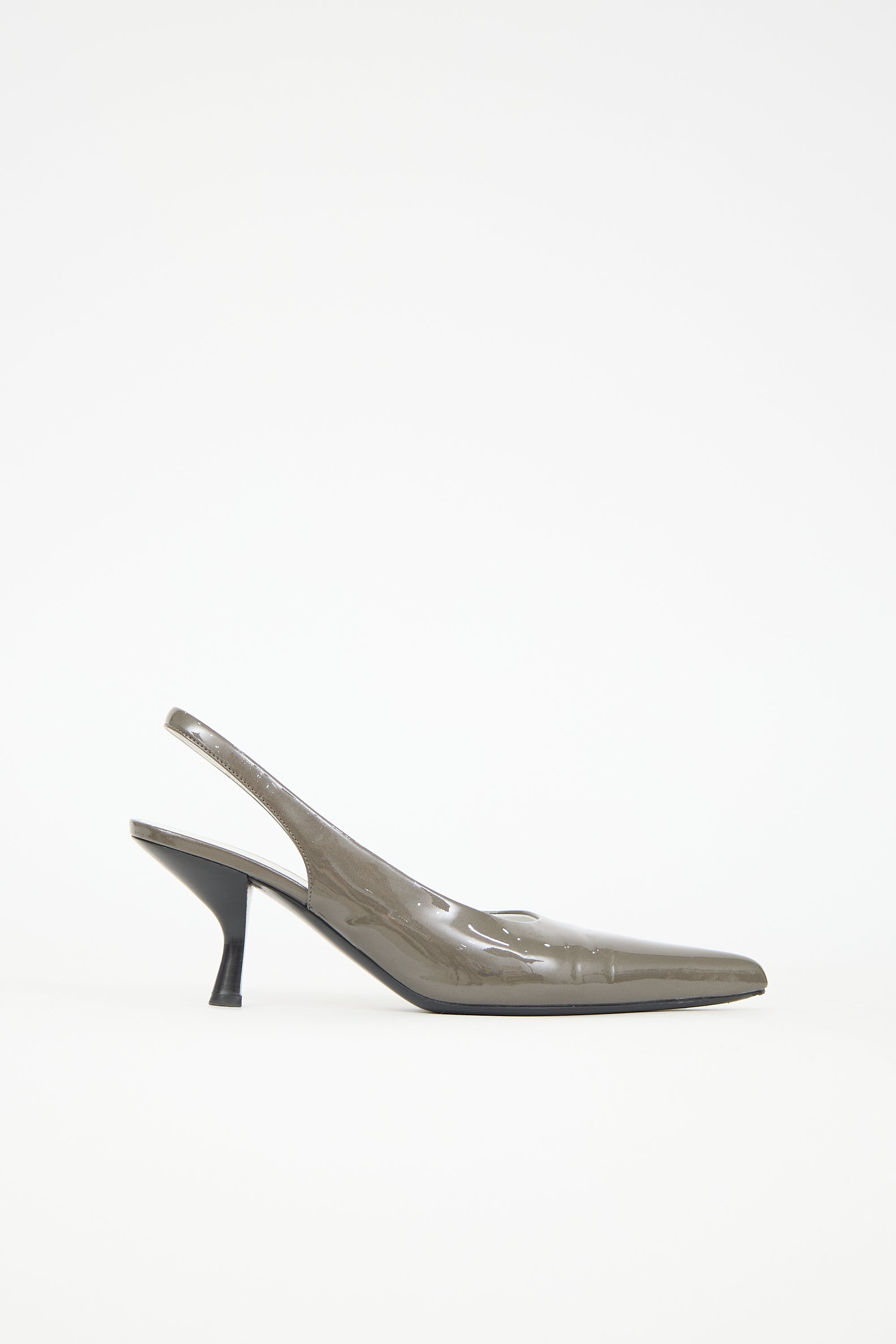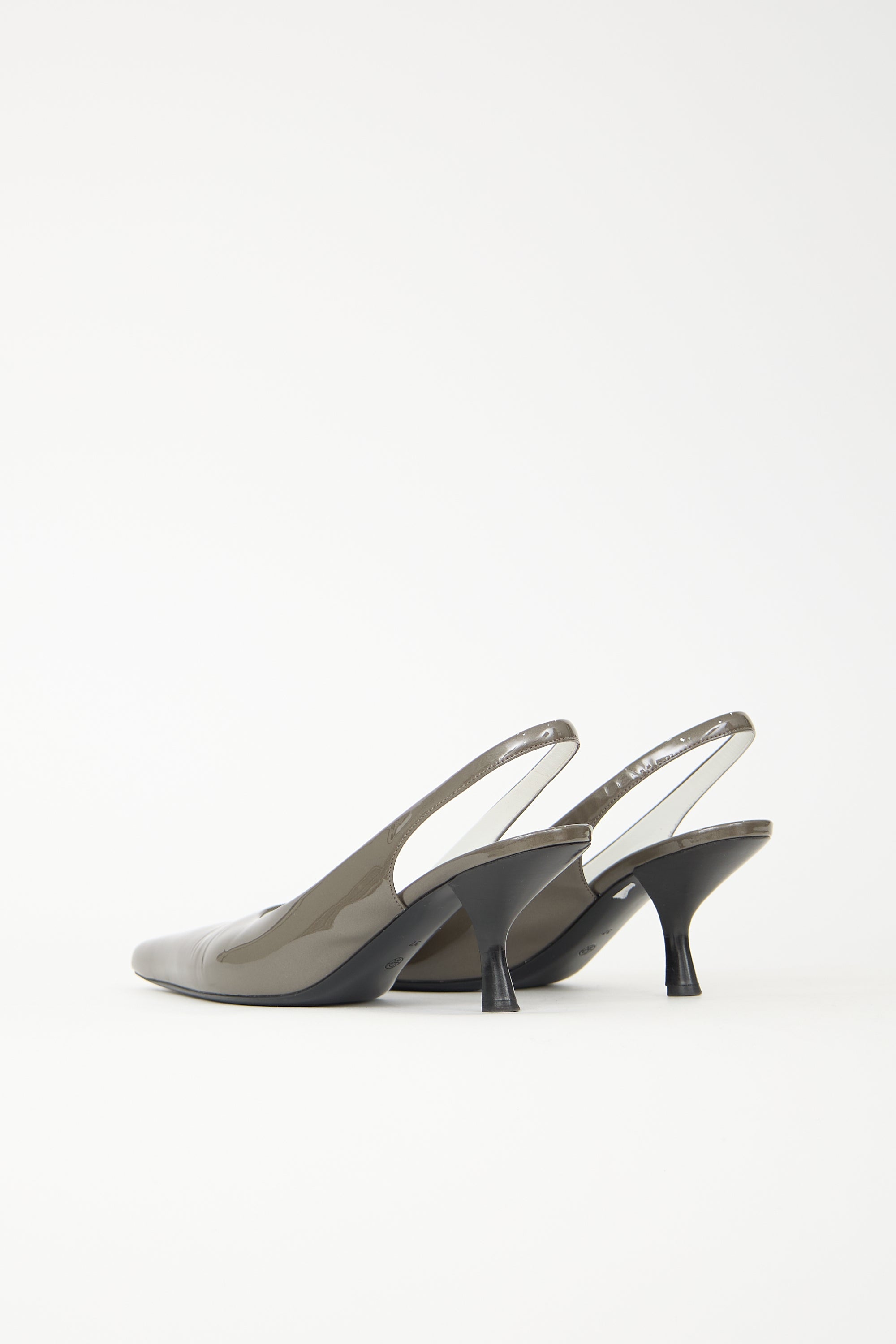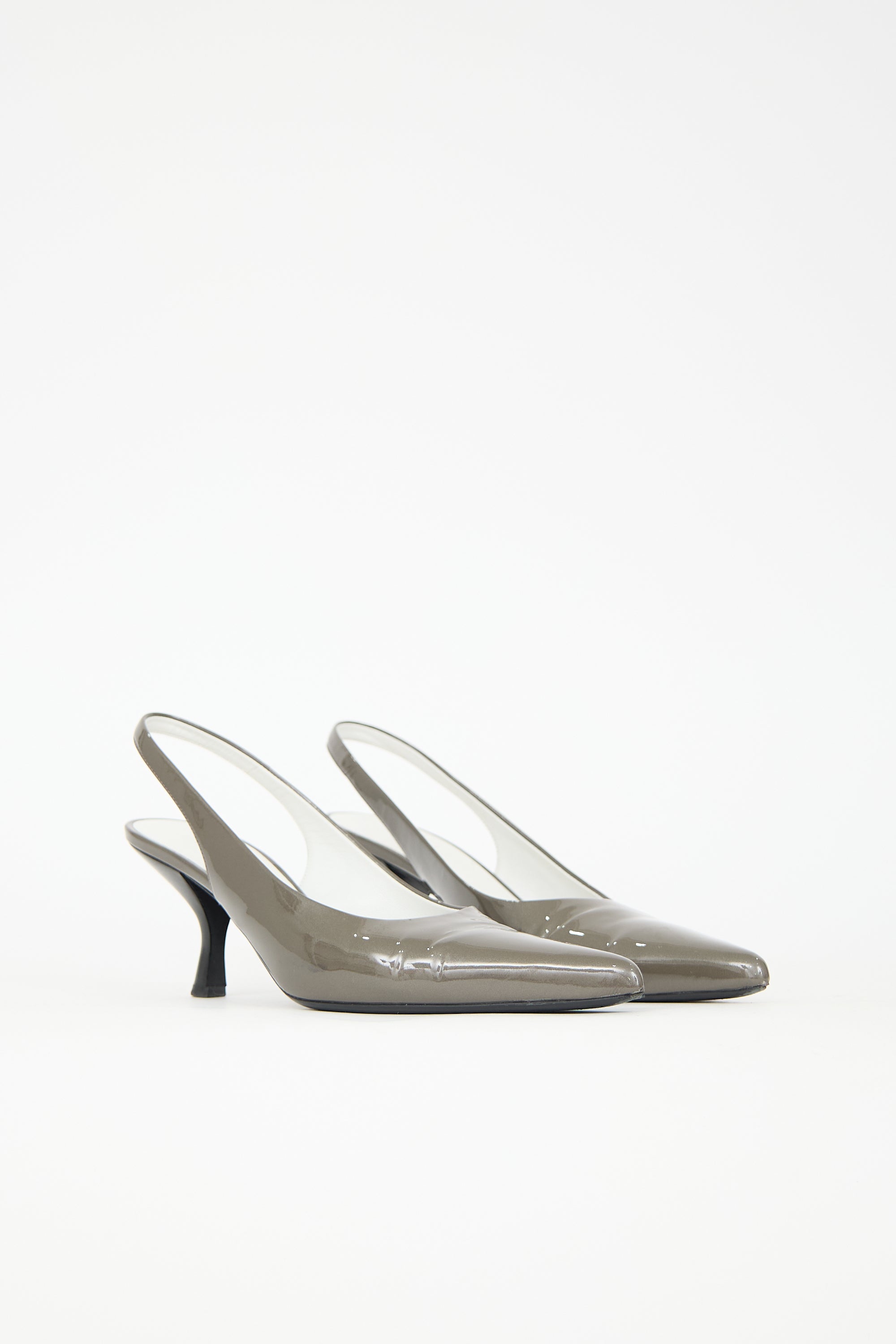 Pre-owned The Row grey Bourgeoisie pumps featuring pointed toe, glitter patent upper, slingback strap, and wooden comma heel.