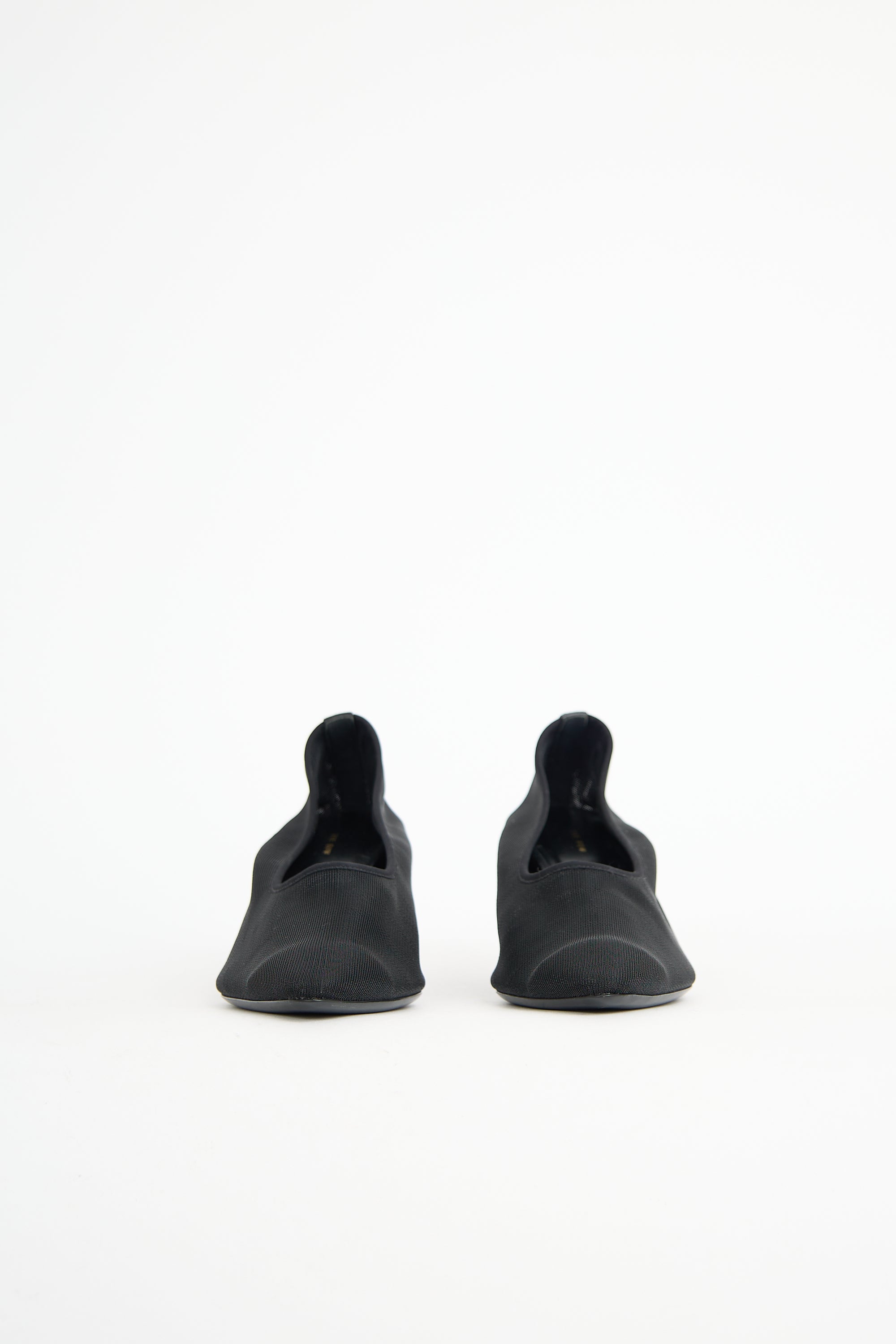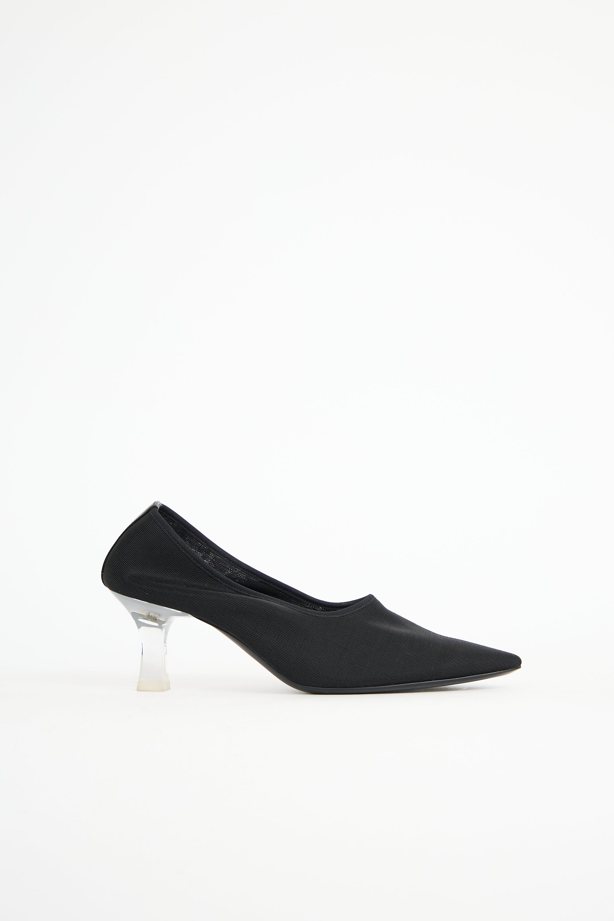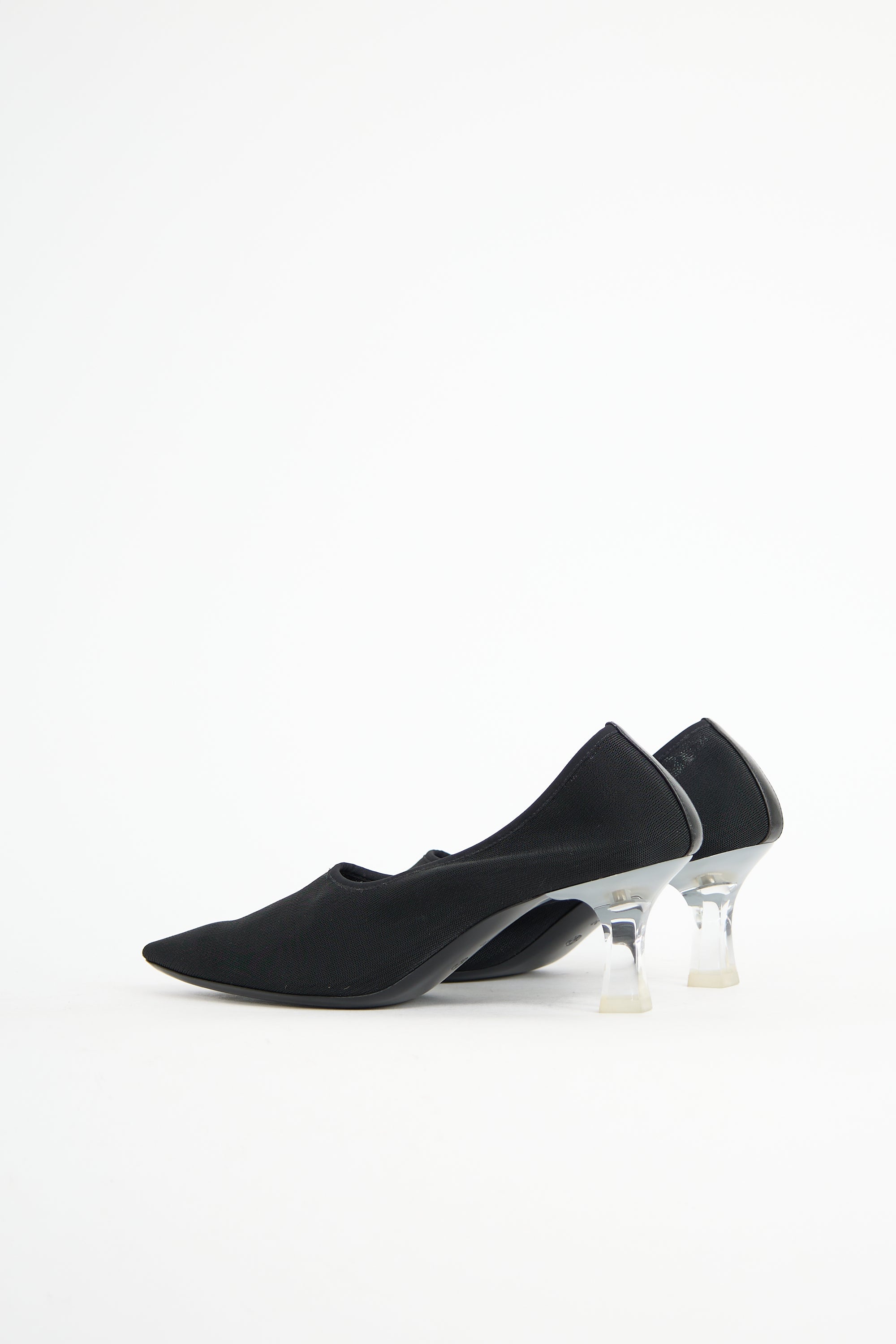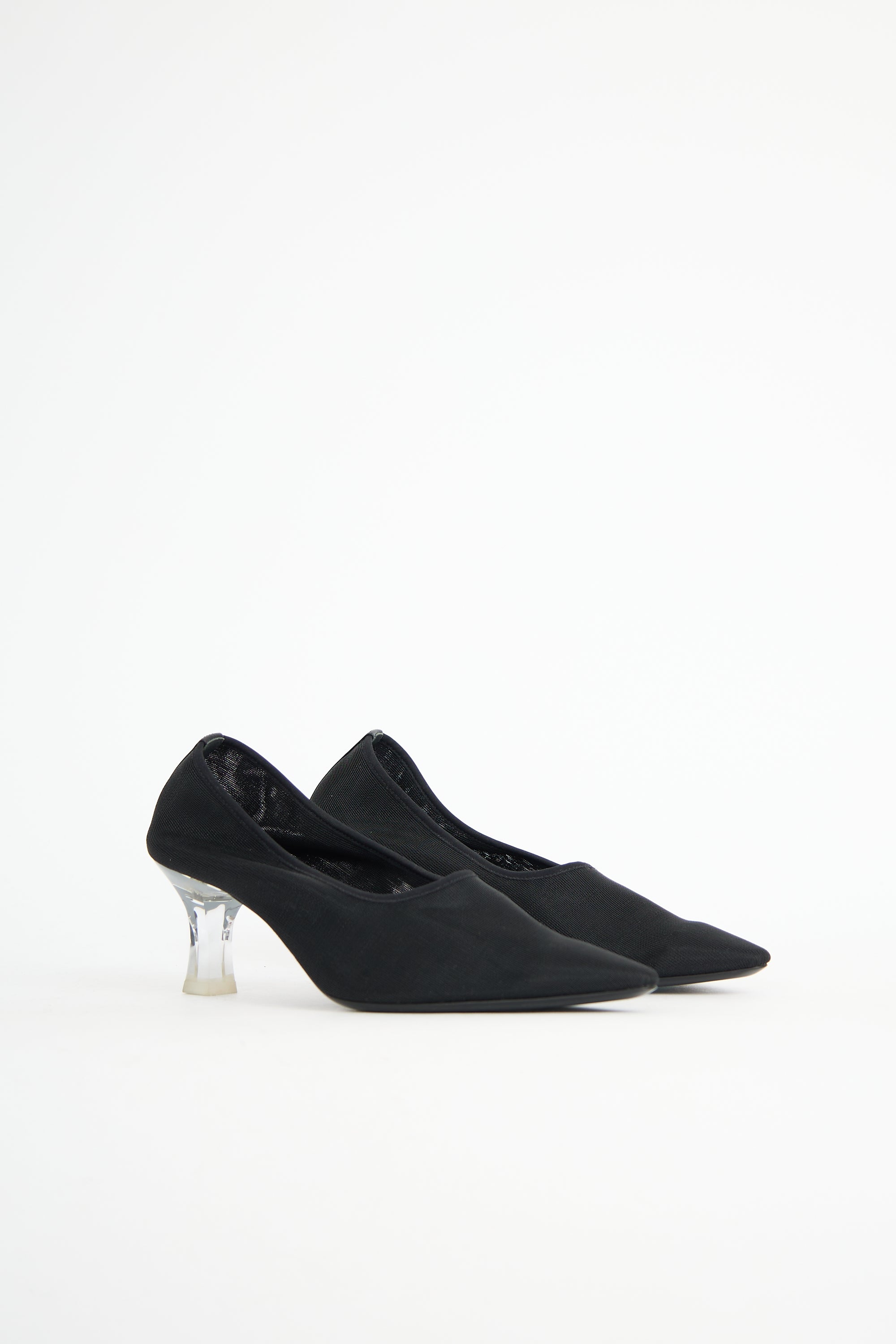 Pre-owned The Row black mesh Sock pumps featuring pointed toe, stretch upper, and translucent lucite heel.