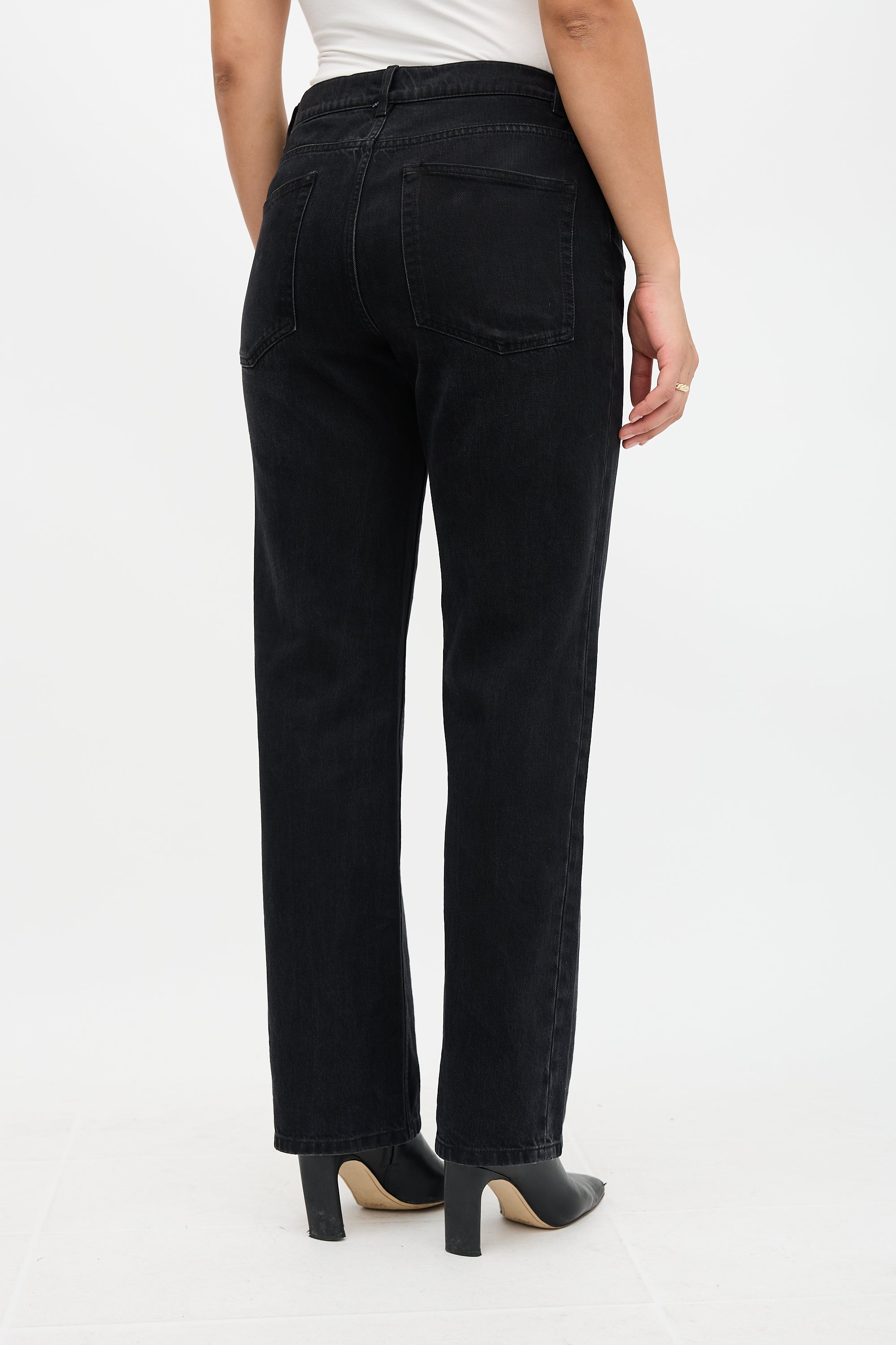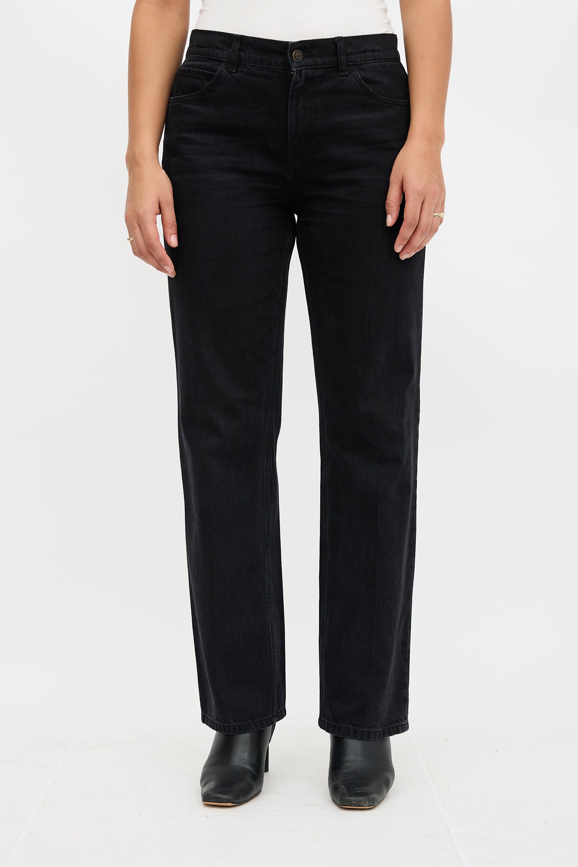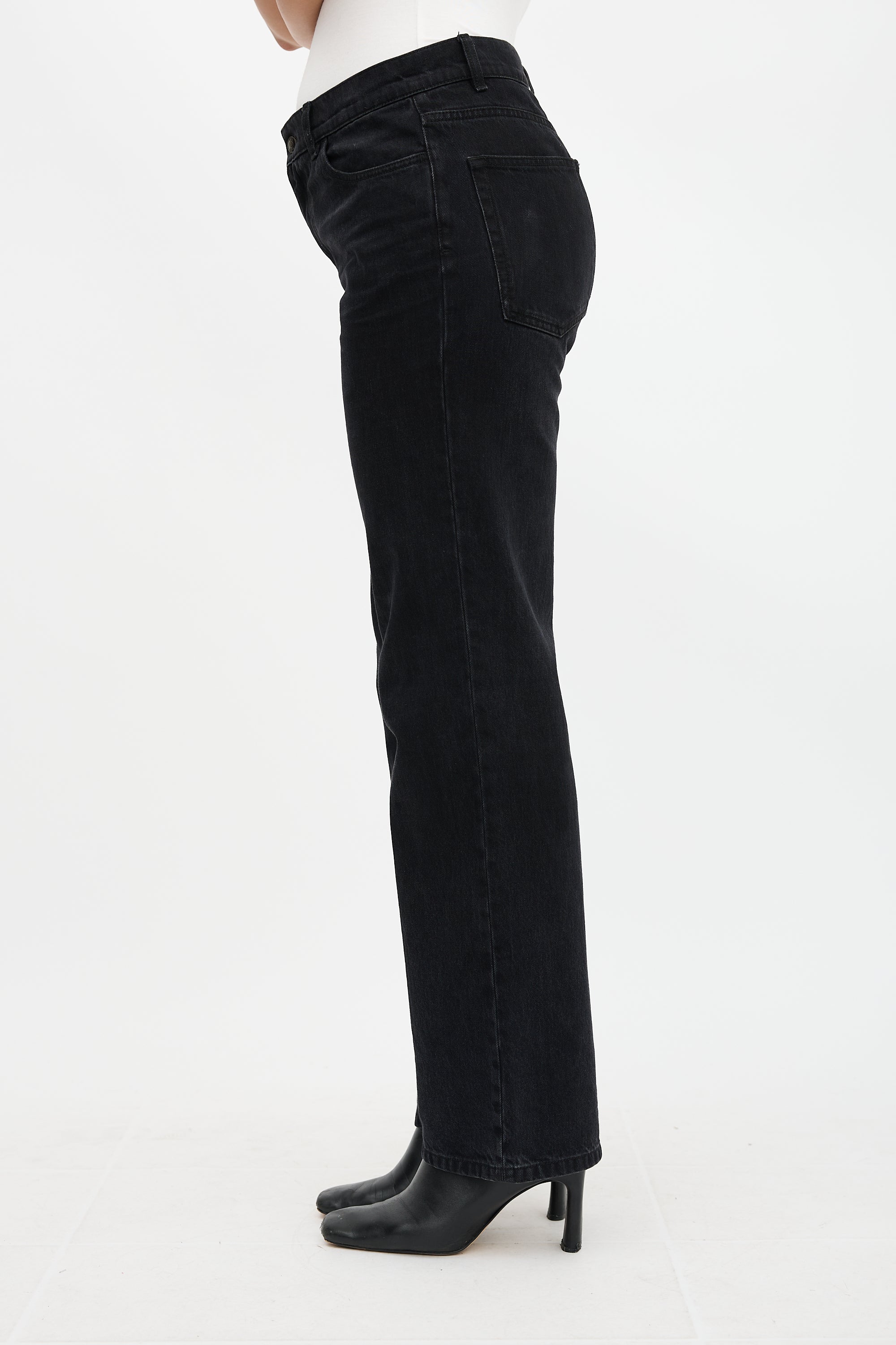Pre-owned The Row washed black jeans featuring a mid rise, zip fly with button fastening, five pocket styling, and straight leg. Clipped to fit model.