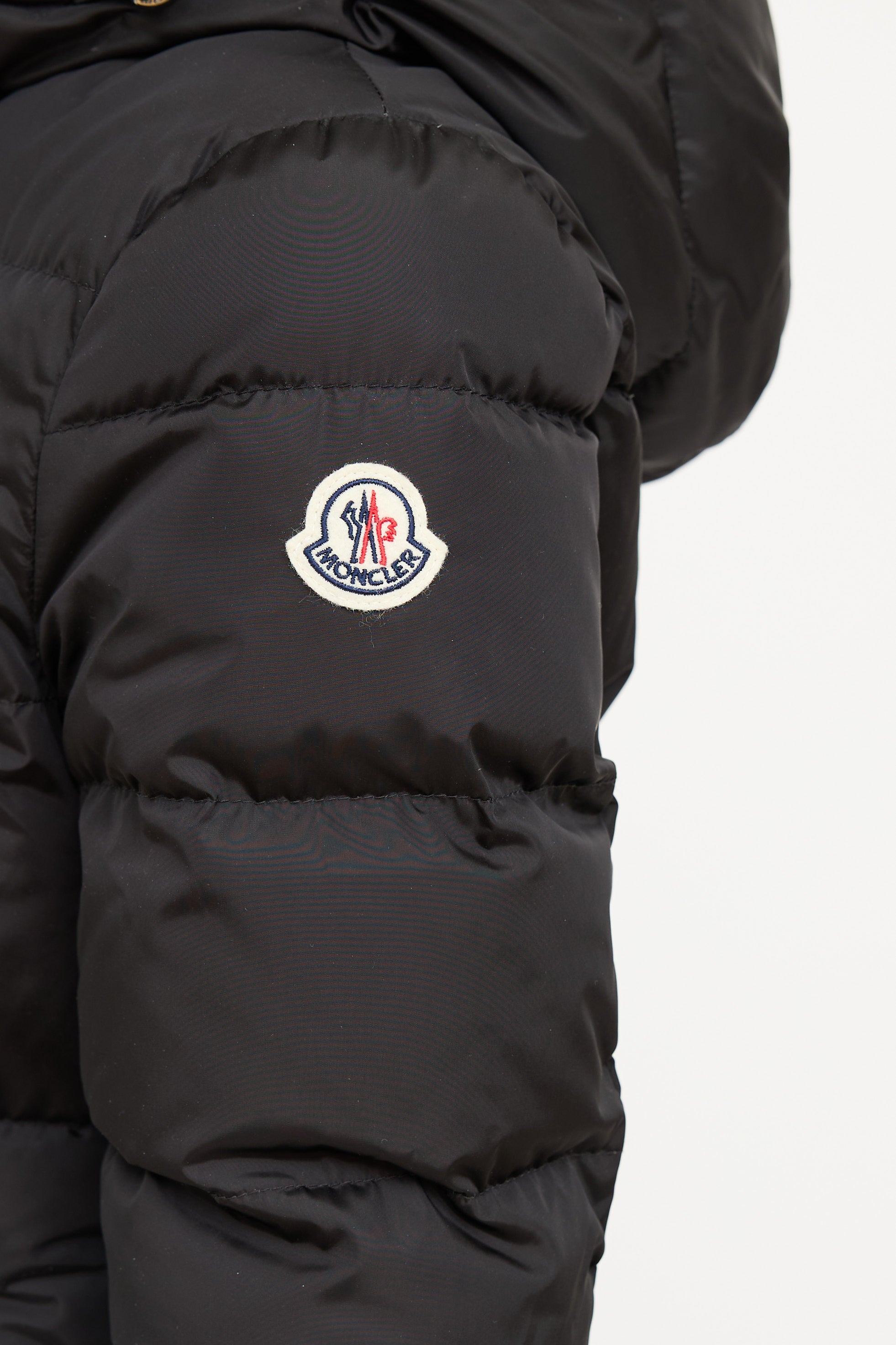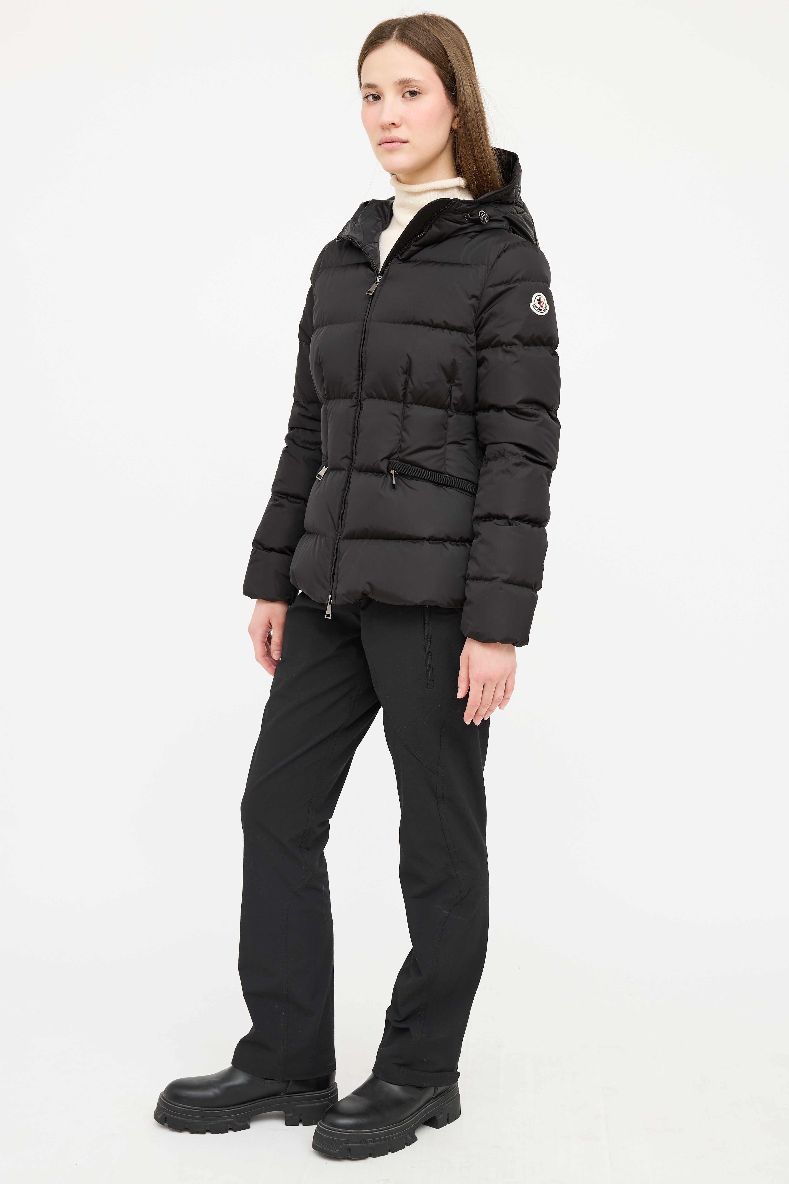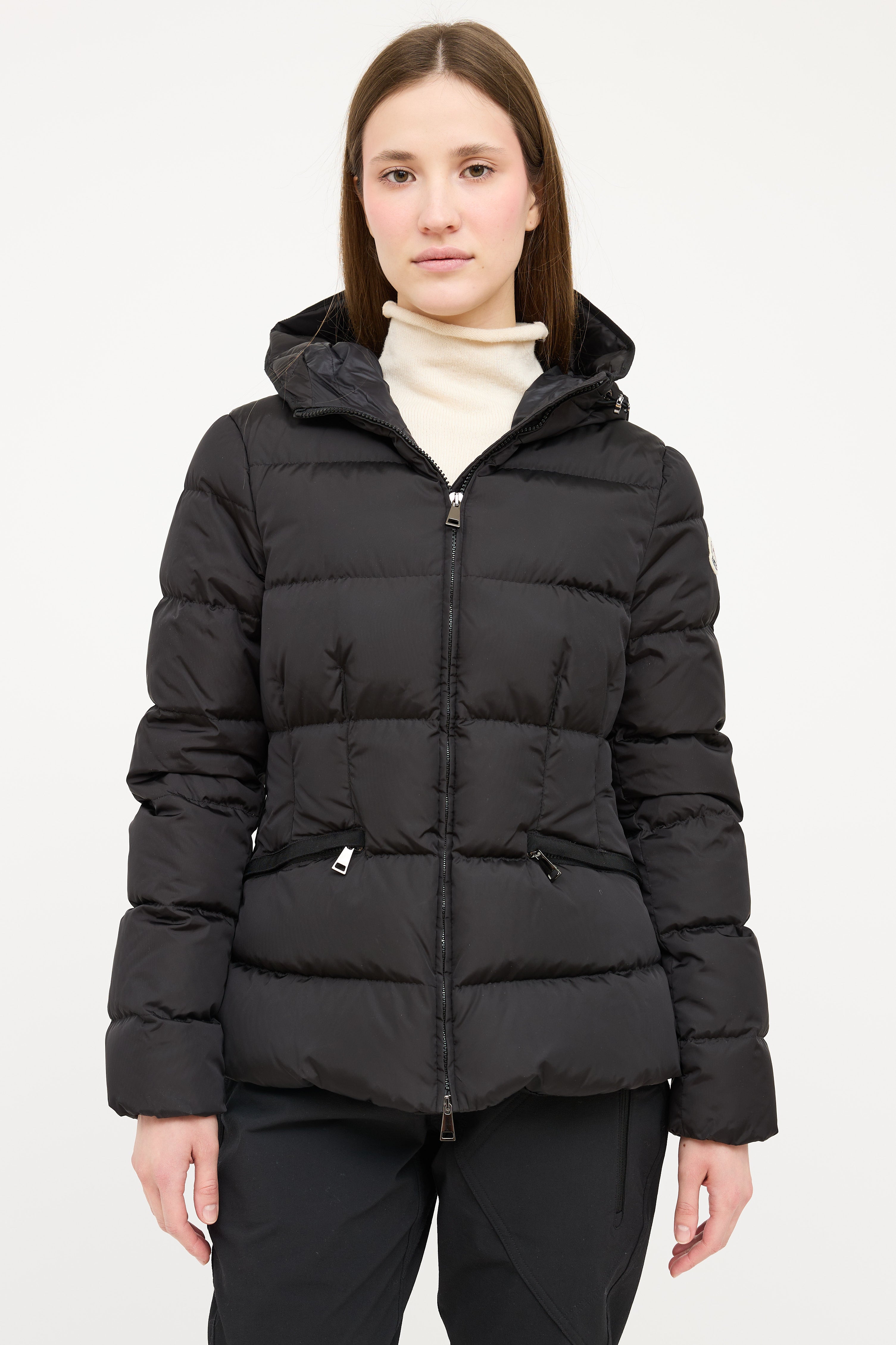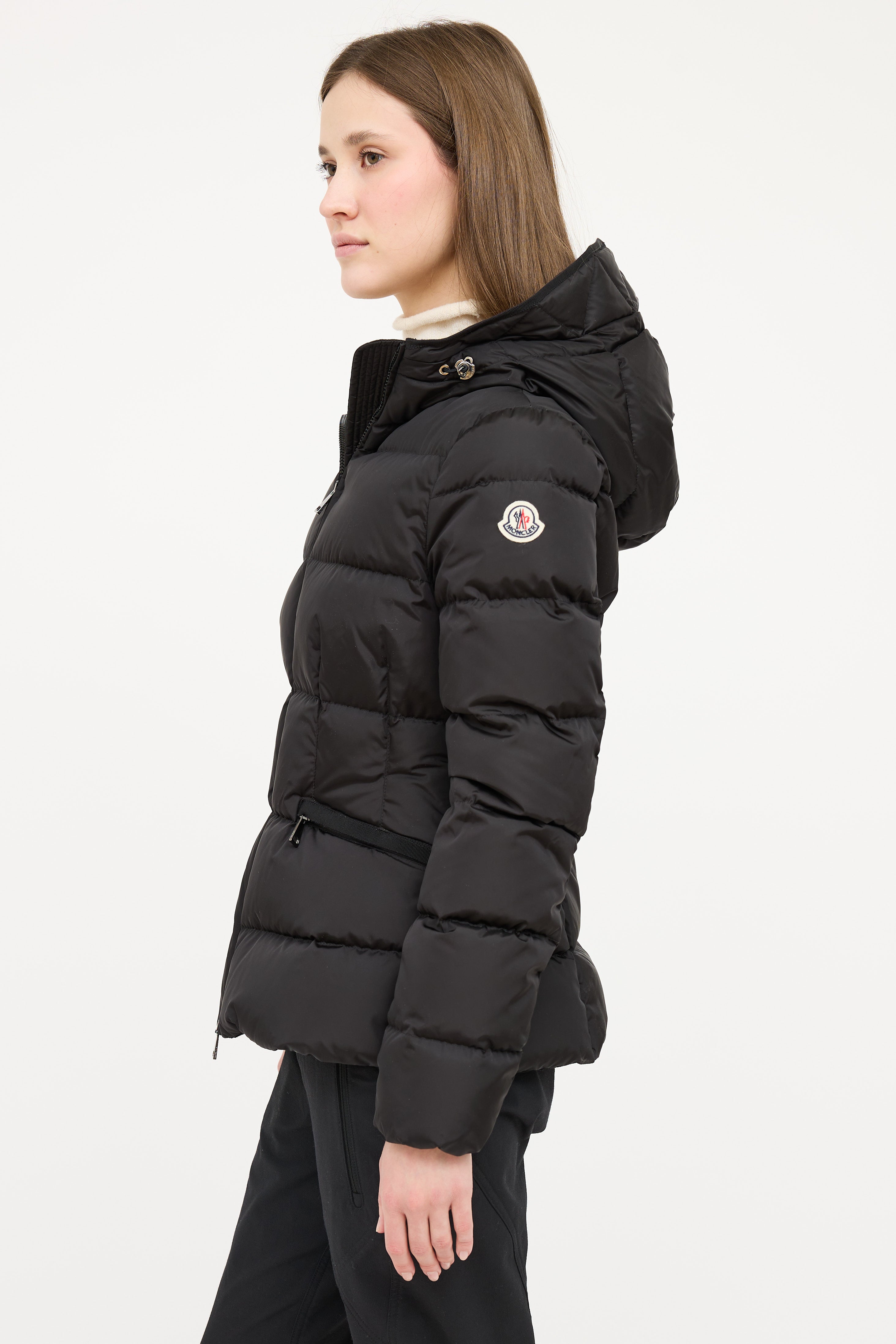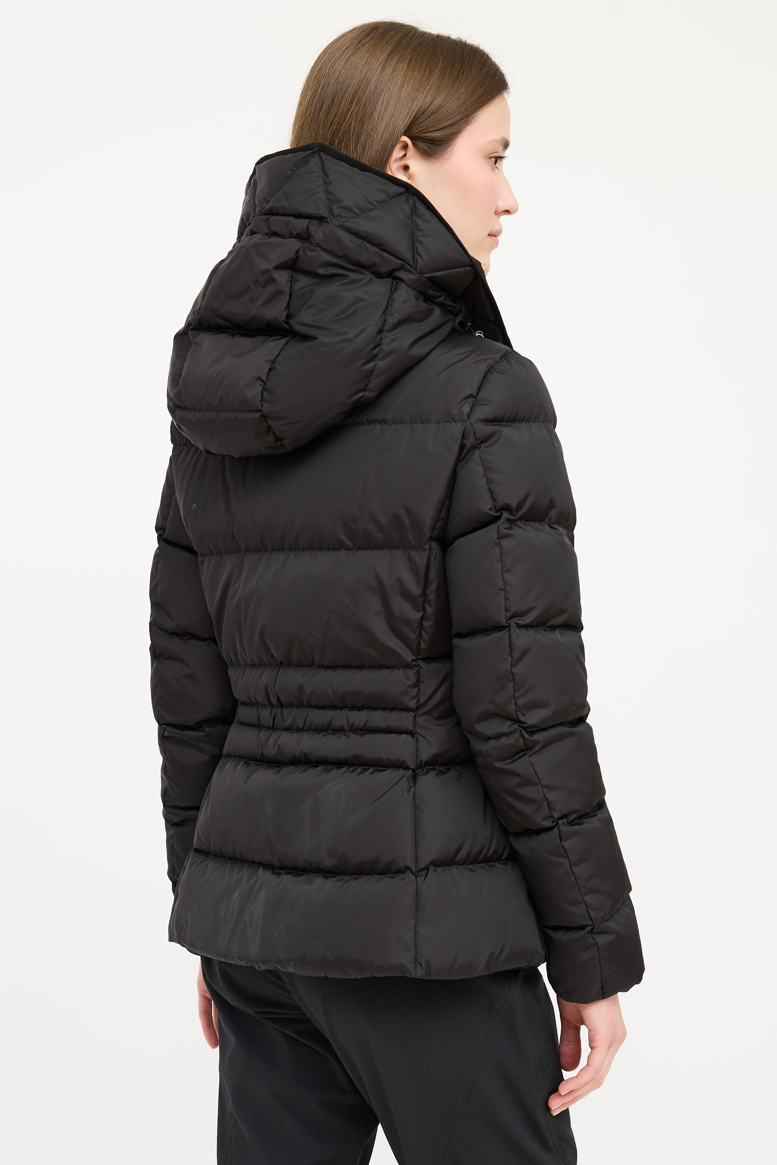 Pre-owned Moncler black Avoce down jacket featuring a drawstring hood, long sleeves with elastic cuffs, logo patch at shoulder, two zip pockets at hip, and zip closure. Lined.