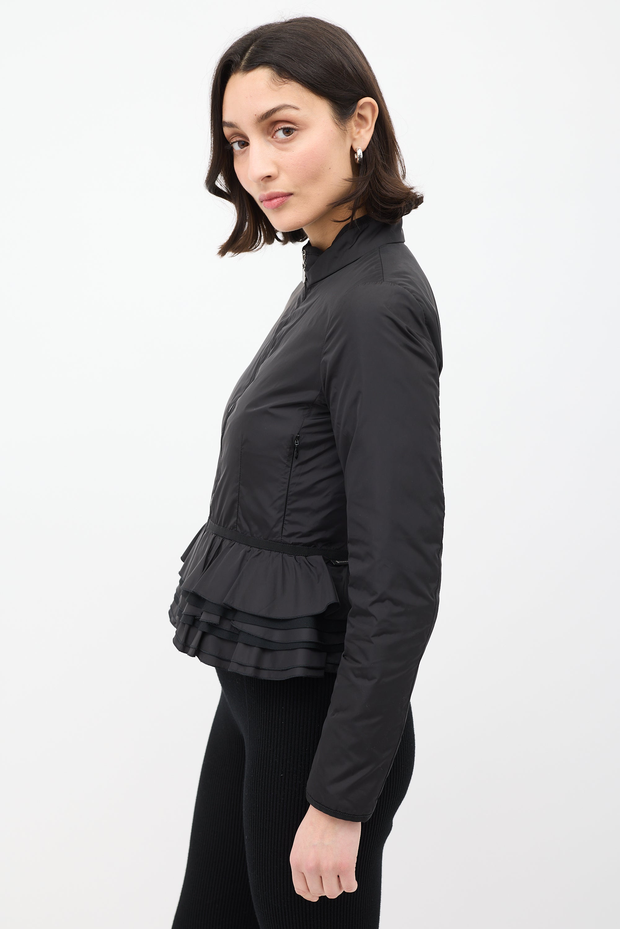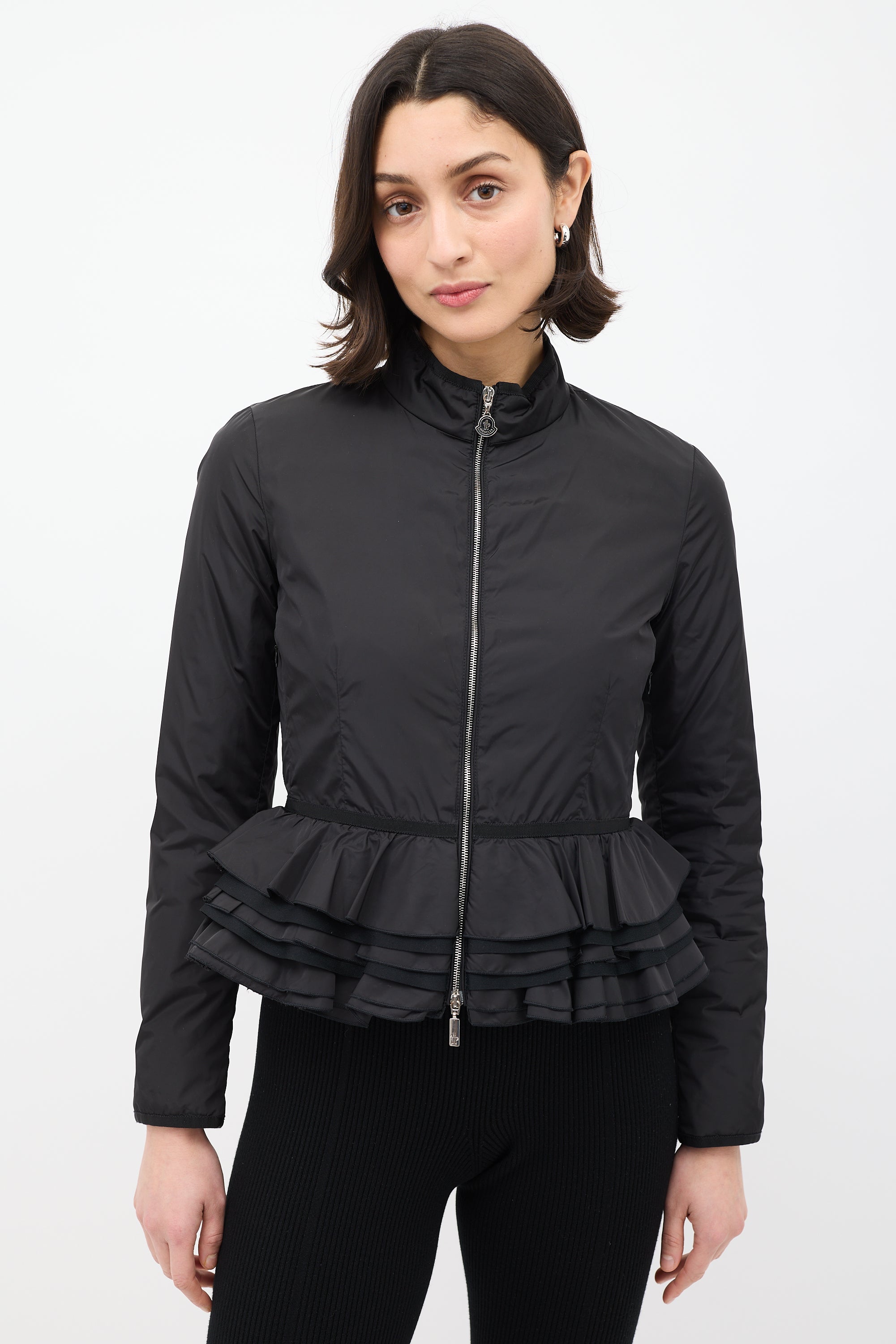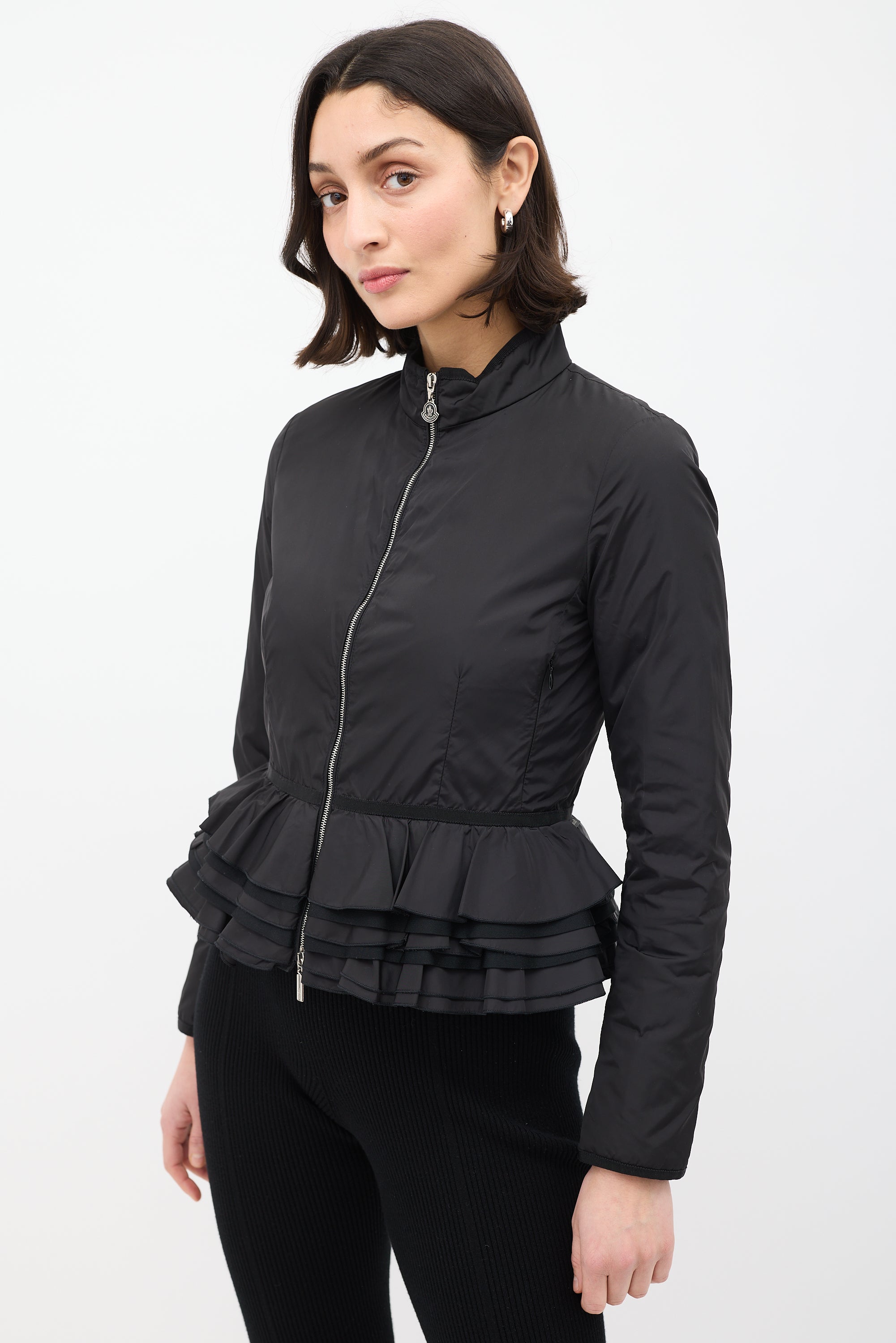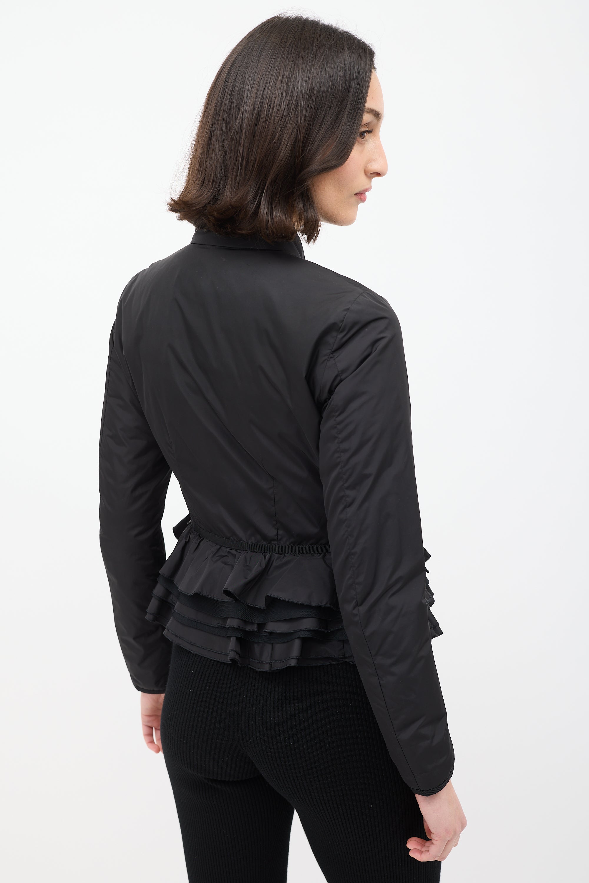 Pre-owned Moncler black down and nylon jacket featuring a stand collar, front double zip closure, zipped in seam pockets, and layered ruffle hem. Padded and lined.