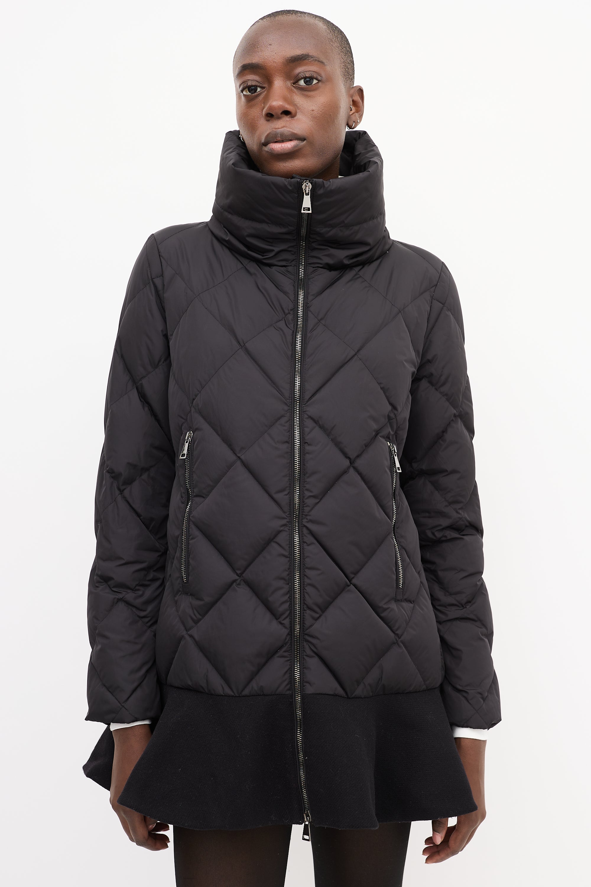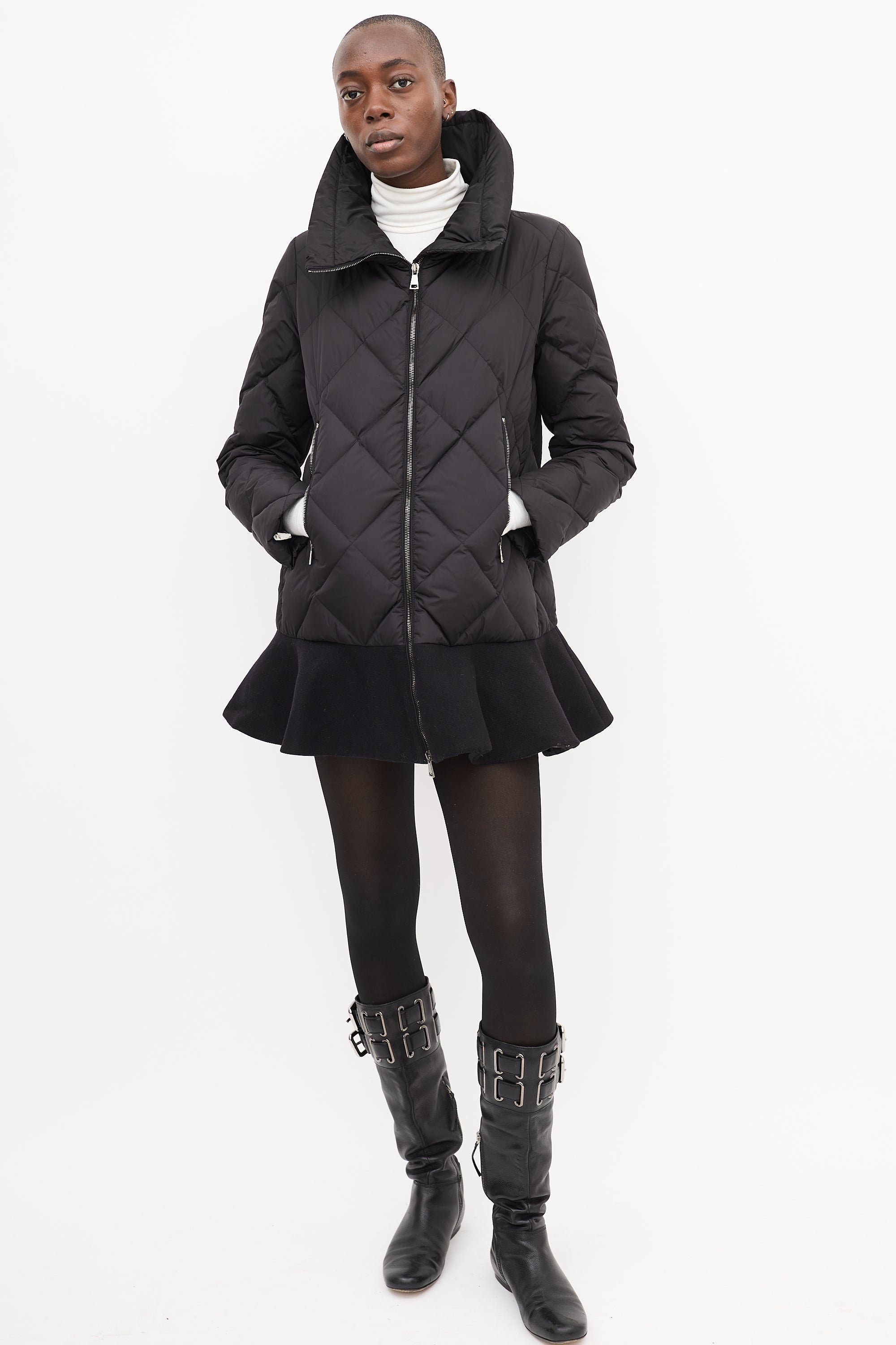 Pre-owned Moncler black down Vouglan jacket featuring funnel collar, quilted stitching, zip up front, two zip pockets, and wool peplum hem.