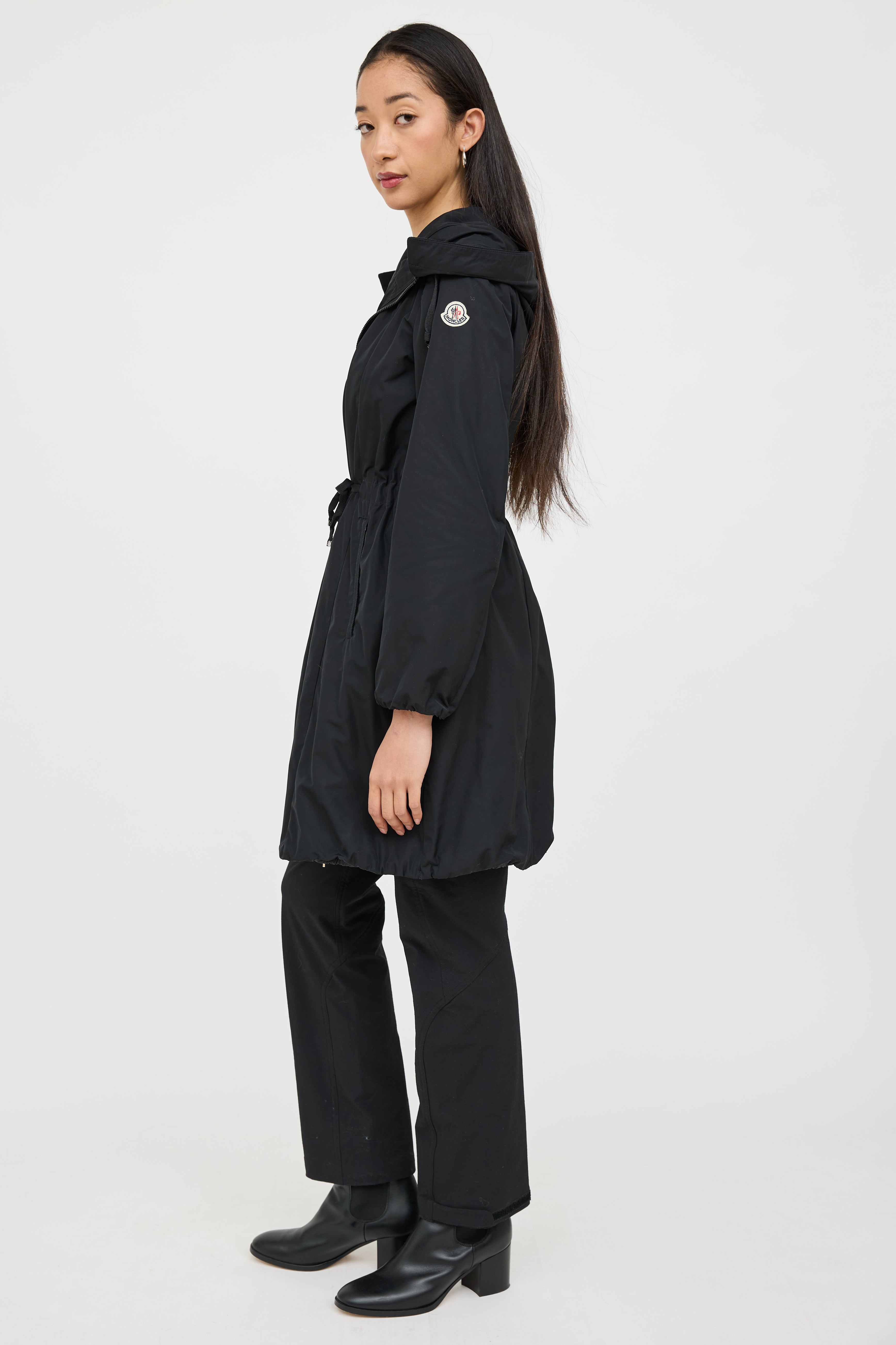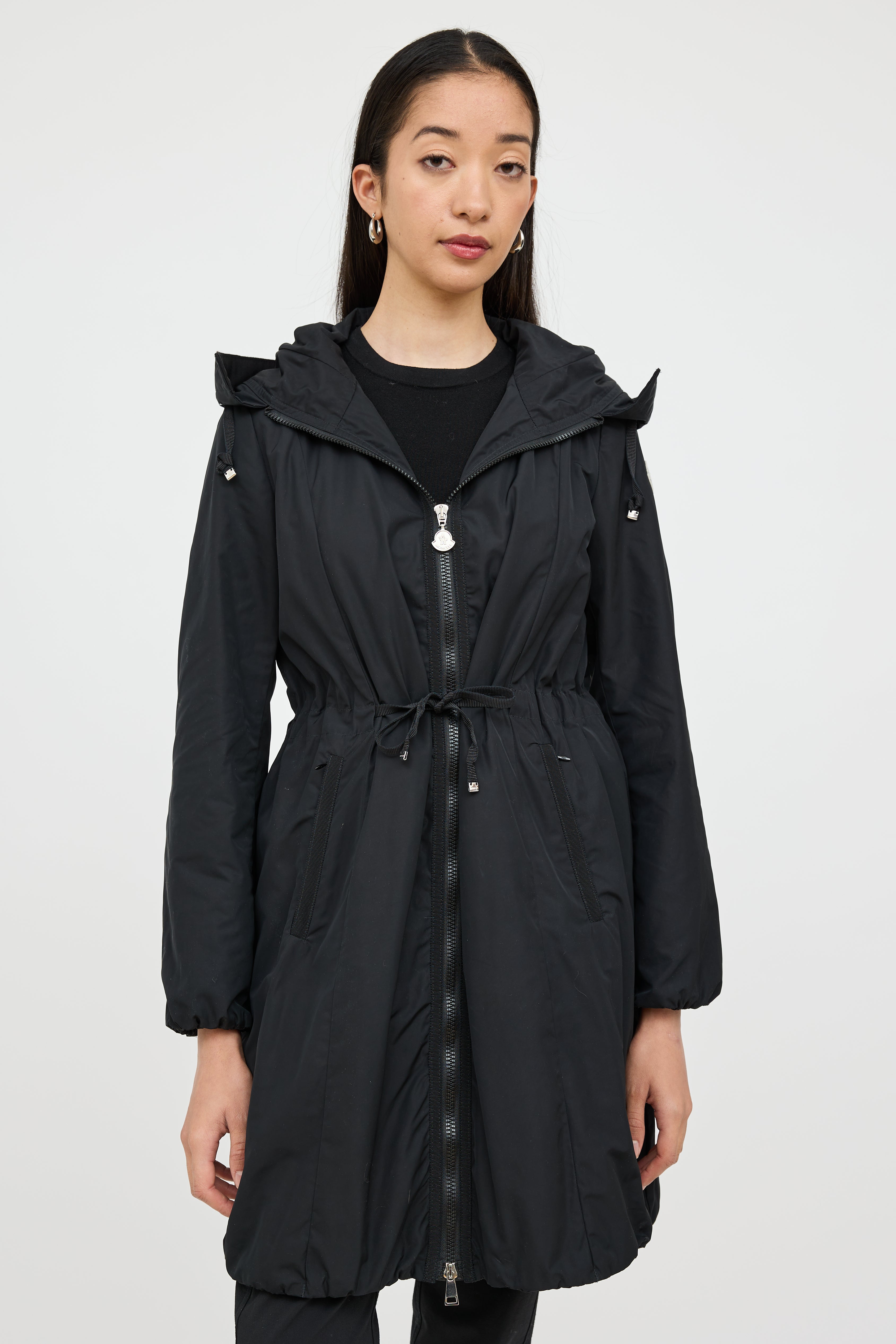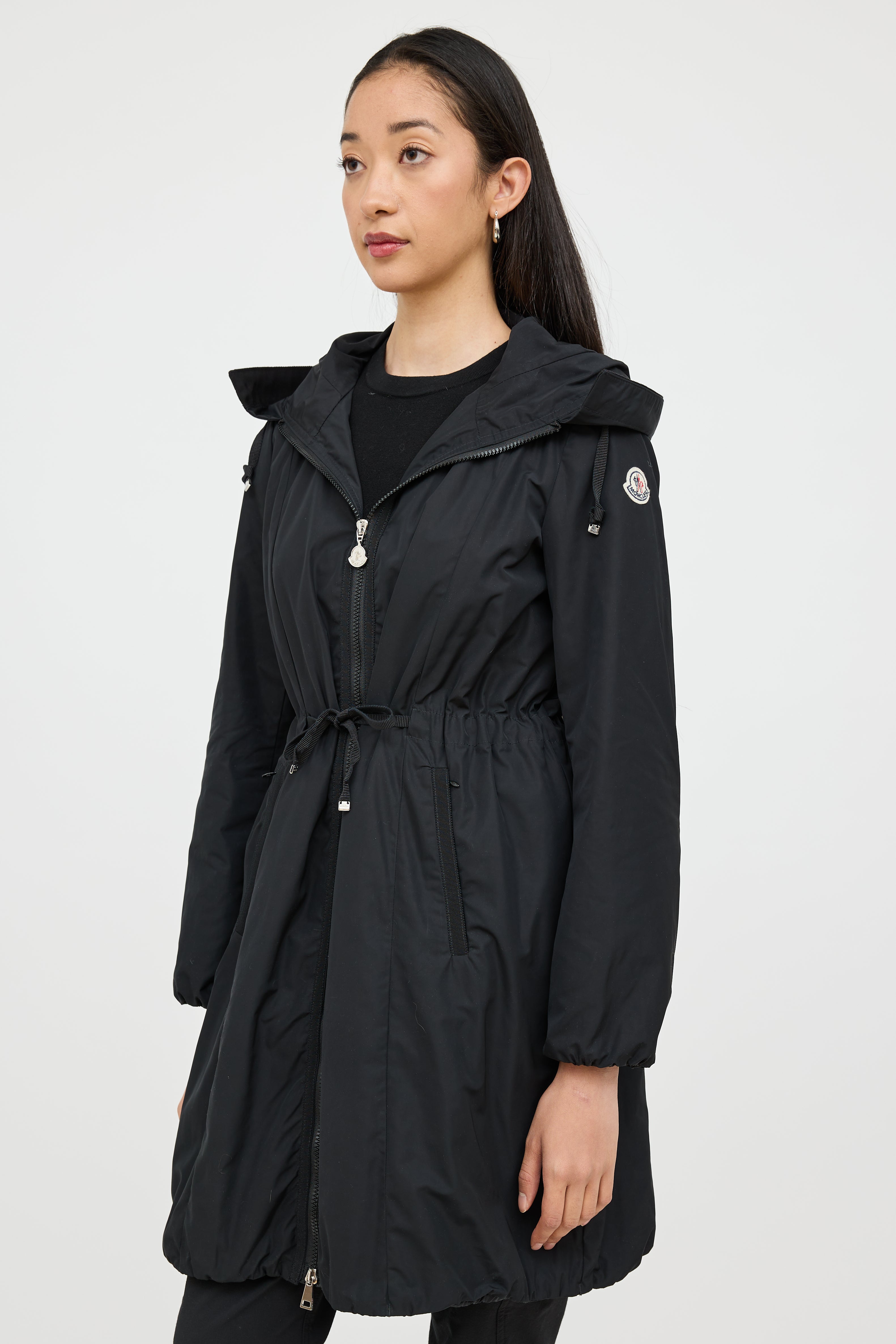 Pre-owned Moncler black Neombre nylon coat featuring a drawstring hood, long sleeves, logo patch at shoulder, two zip pockets at hip, drawstring waist, elastic hem, and zip closure. Lined.