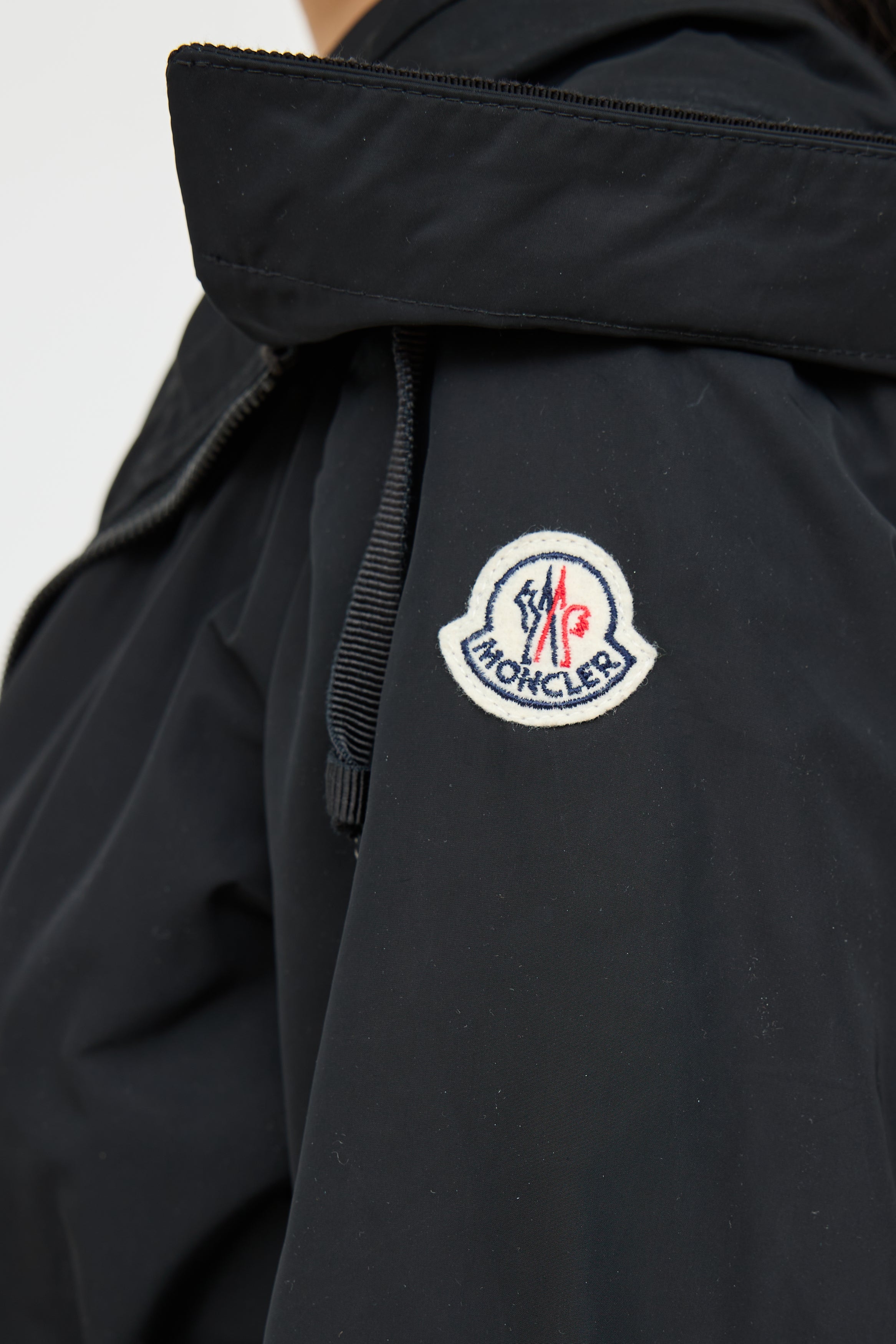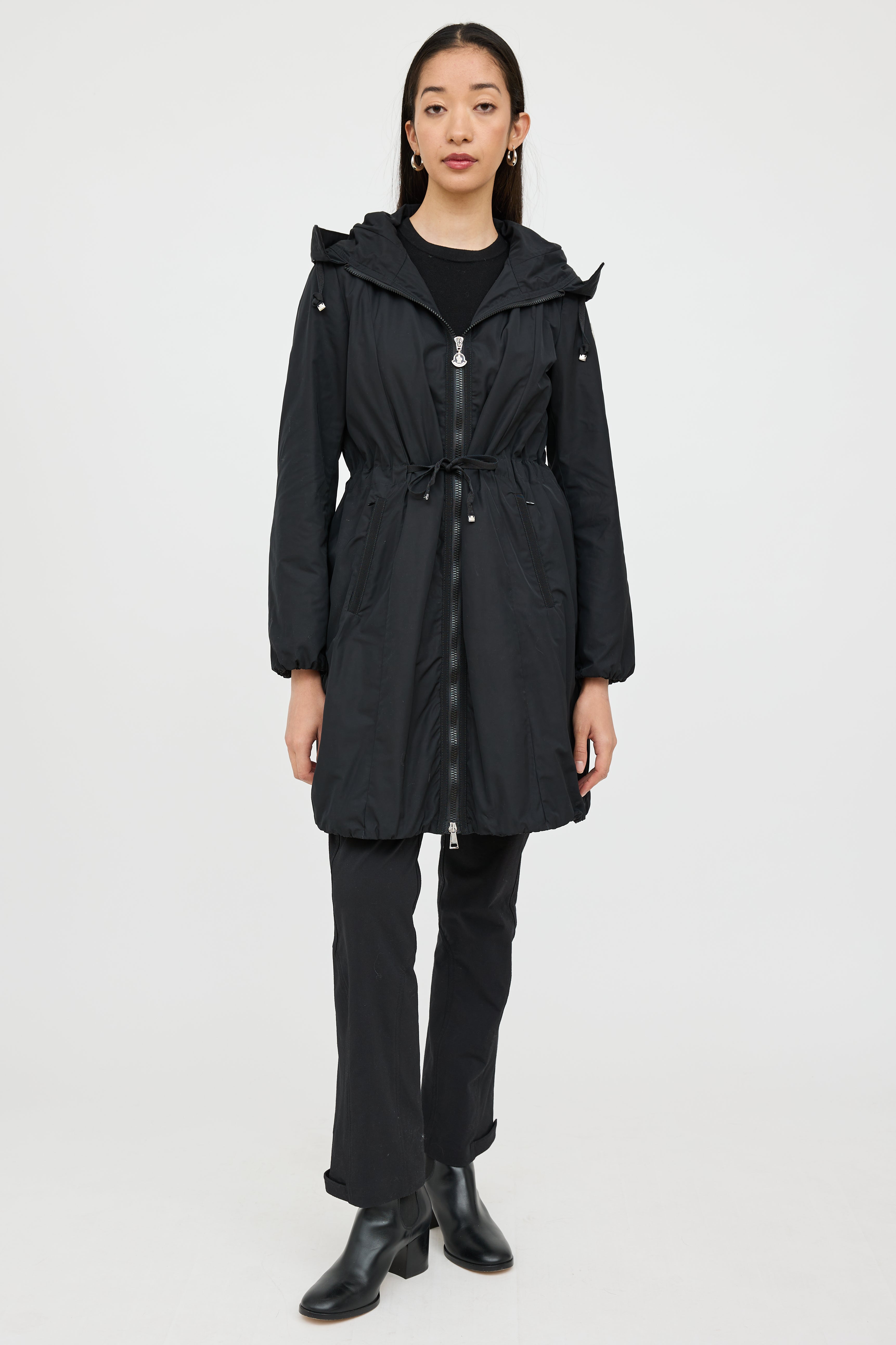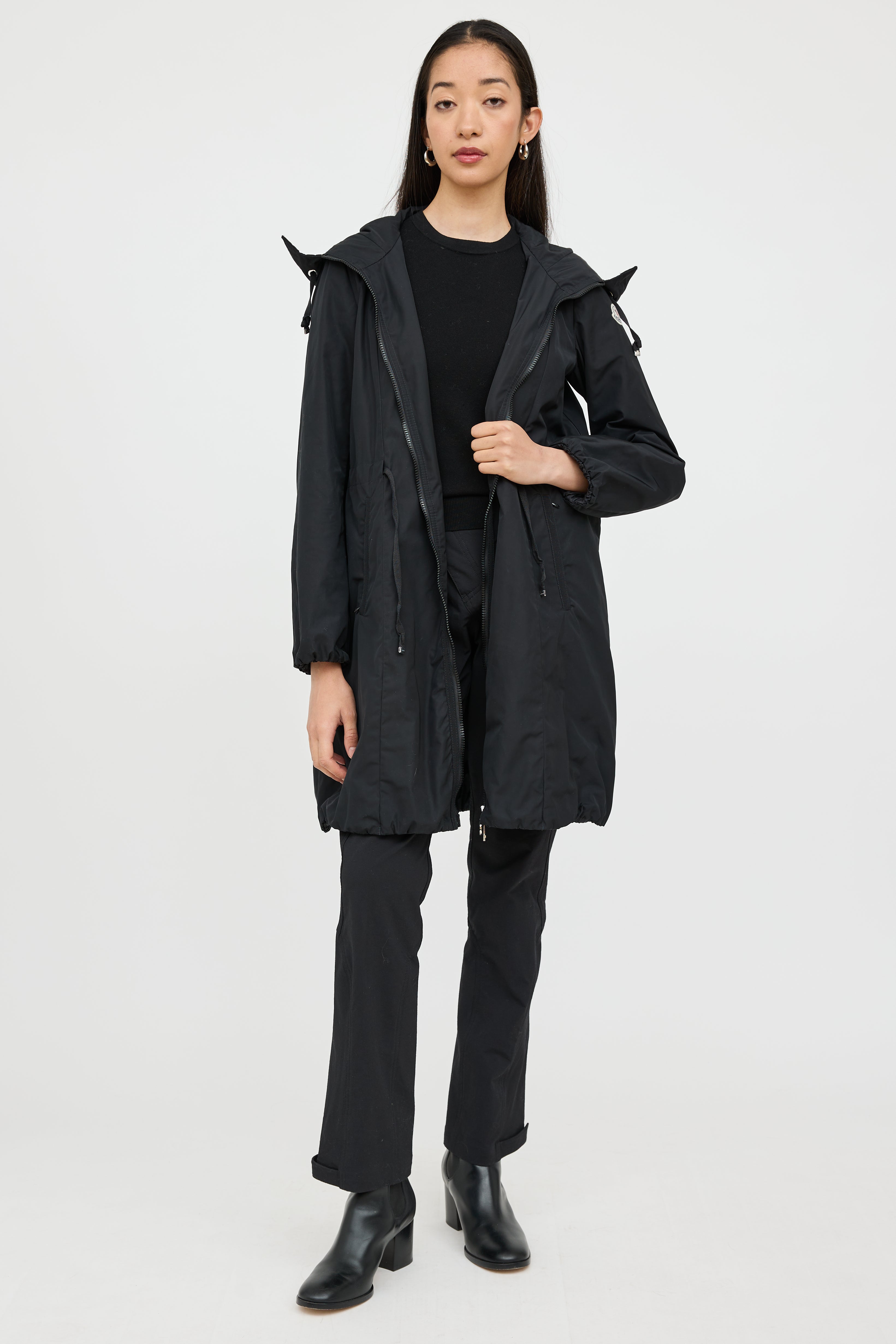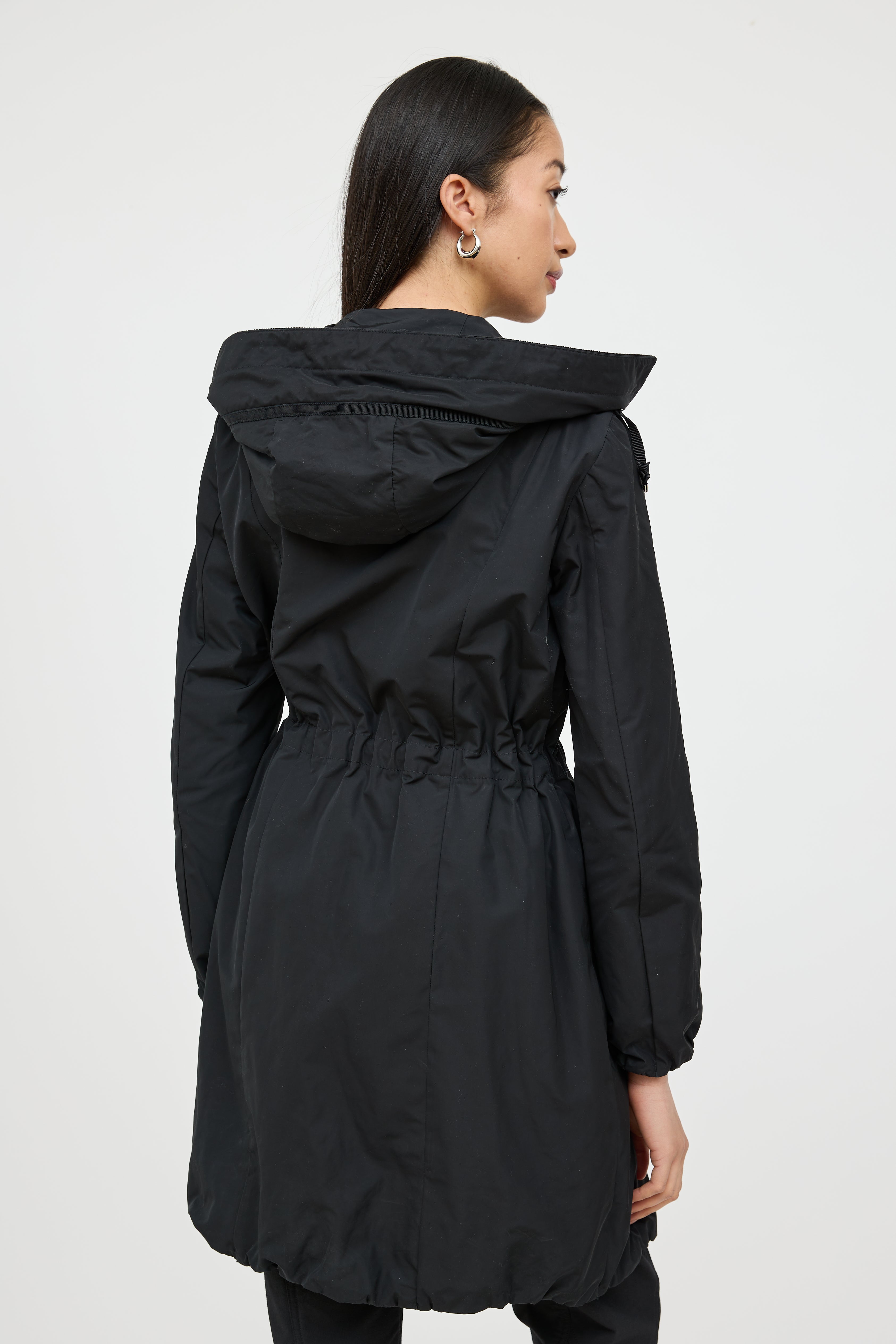 Pre-owned Moncler black Neombre nylon coat featuring a drawstring hood, long sleeves, logo patch at shoulder, two zip pockets at hip, drawstring waist, elastic hem, and zip closure. Lined.