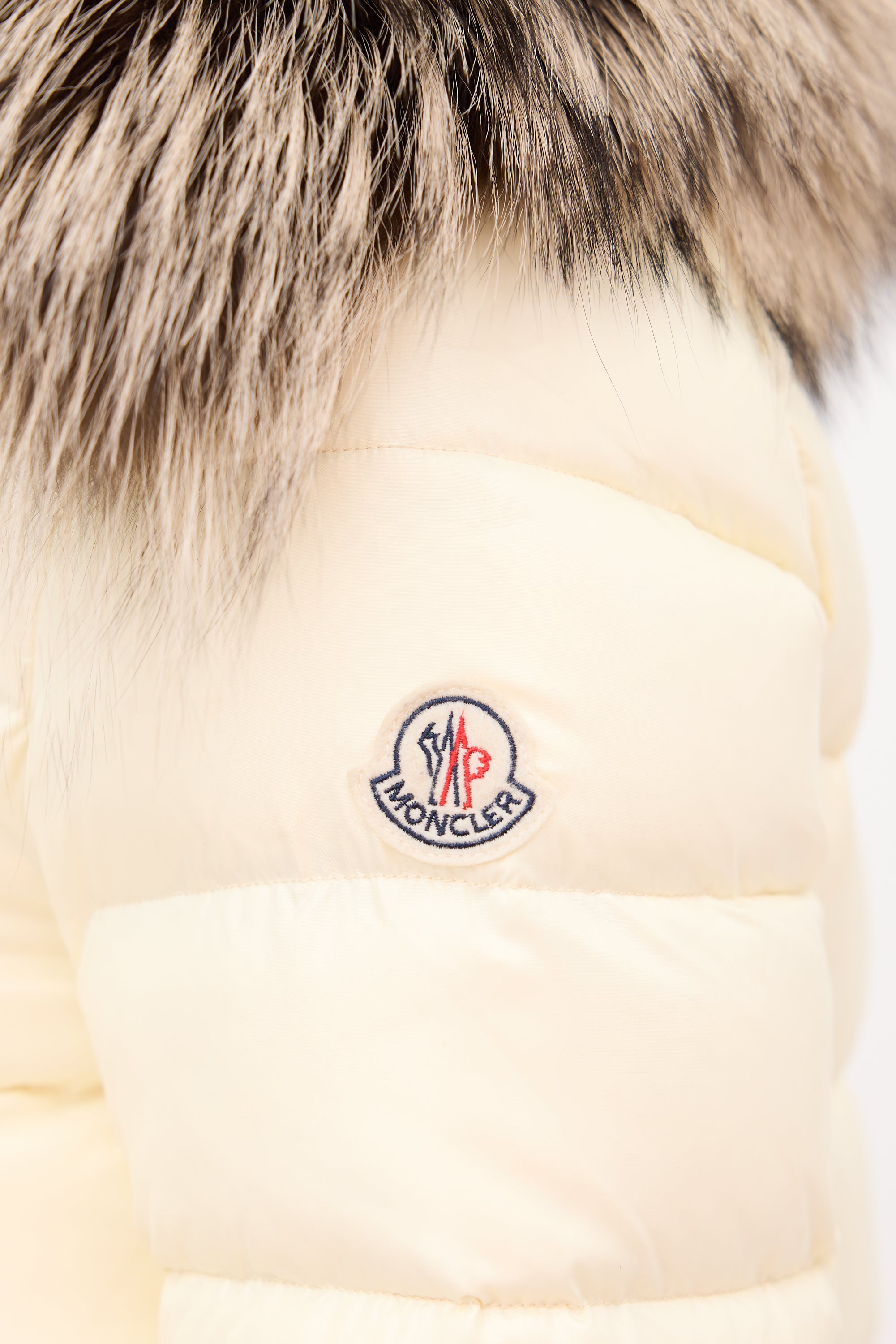 Pre-owned Moncler cream down Gelinotte puffer jacket featuring a nylon shell, funnel collar with removable fur trim, front zip closure, two front pockets, and elasticized cuffs. Padded and lined.