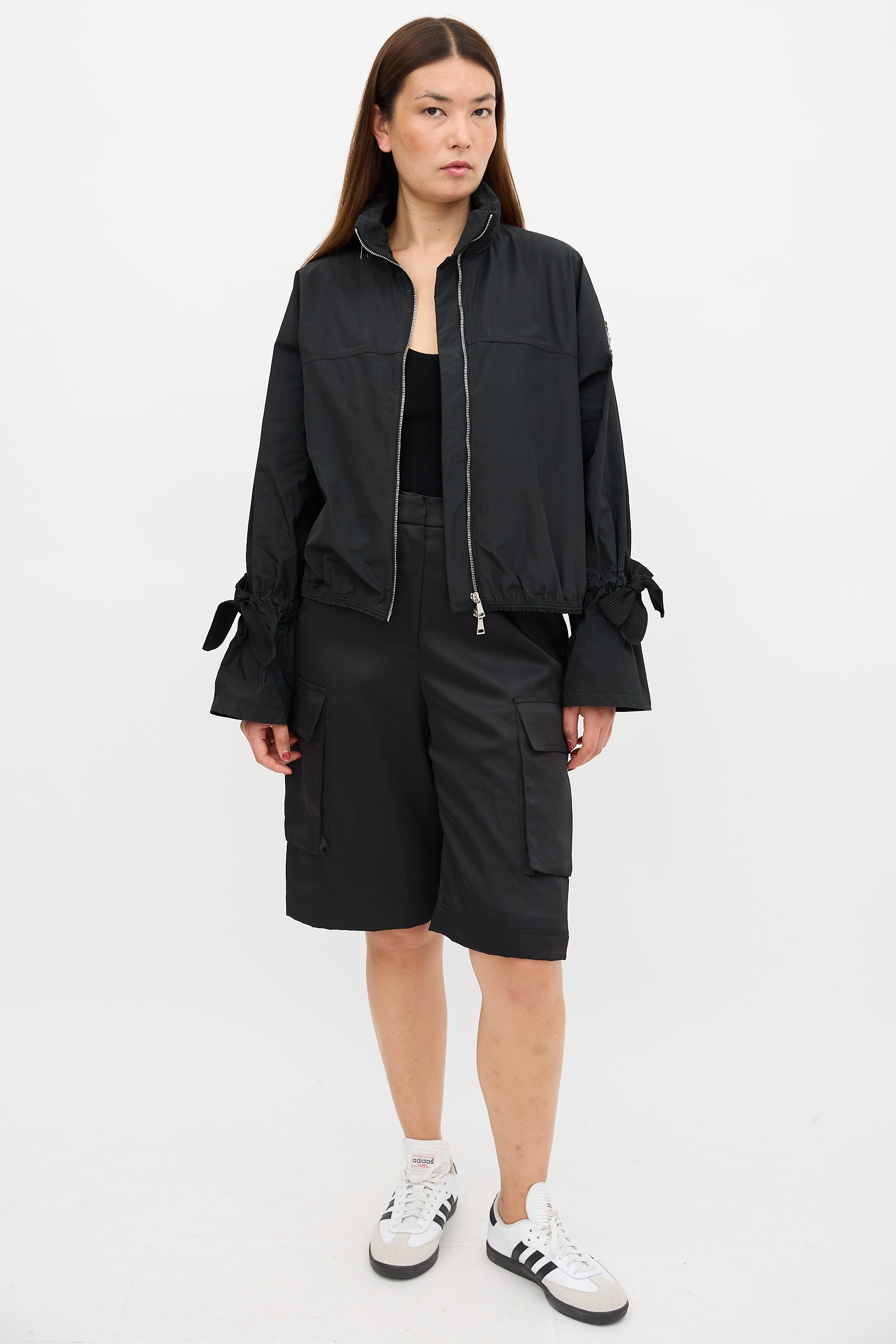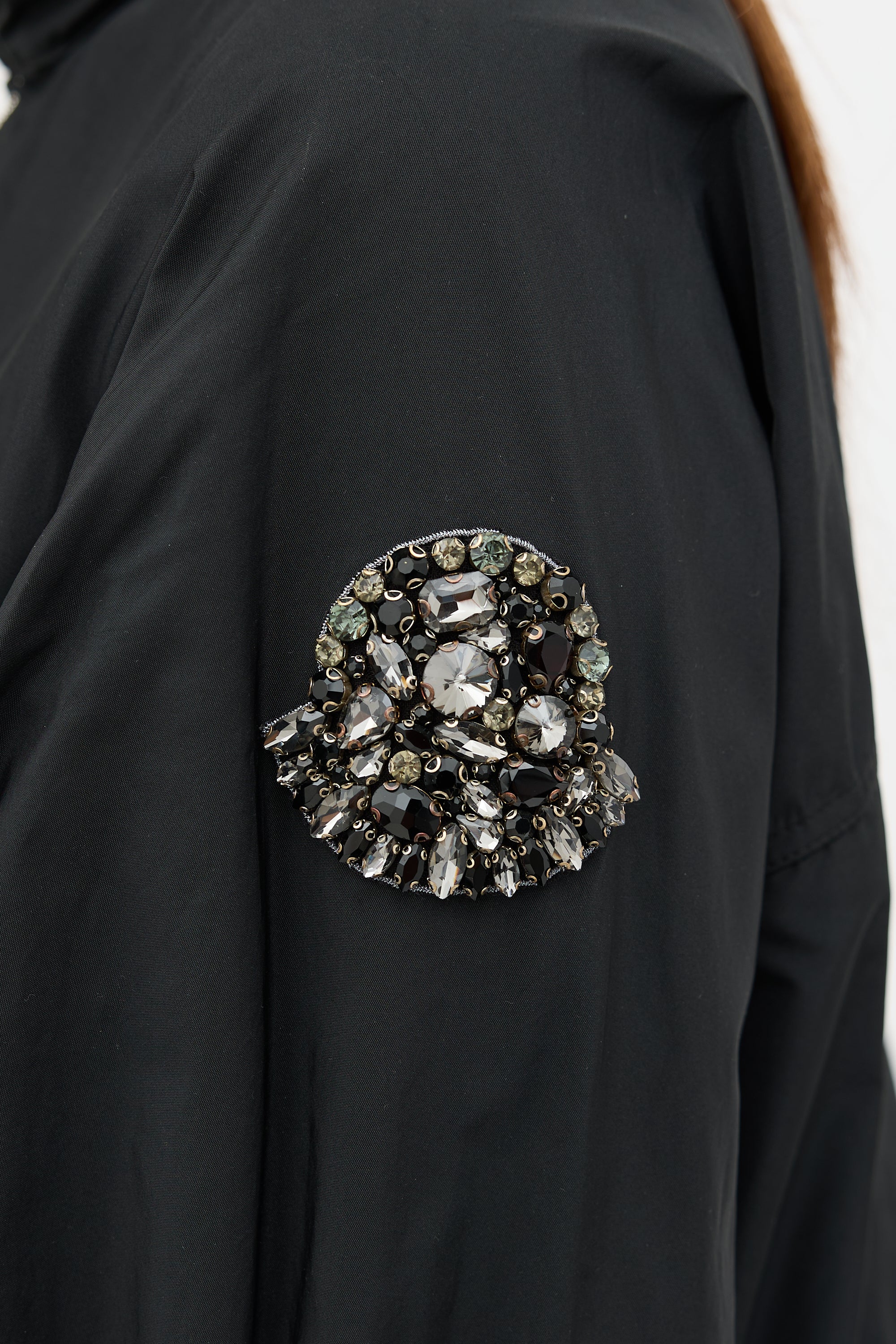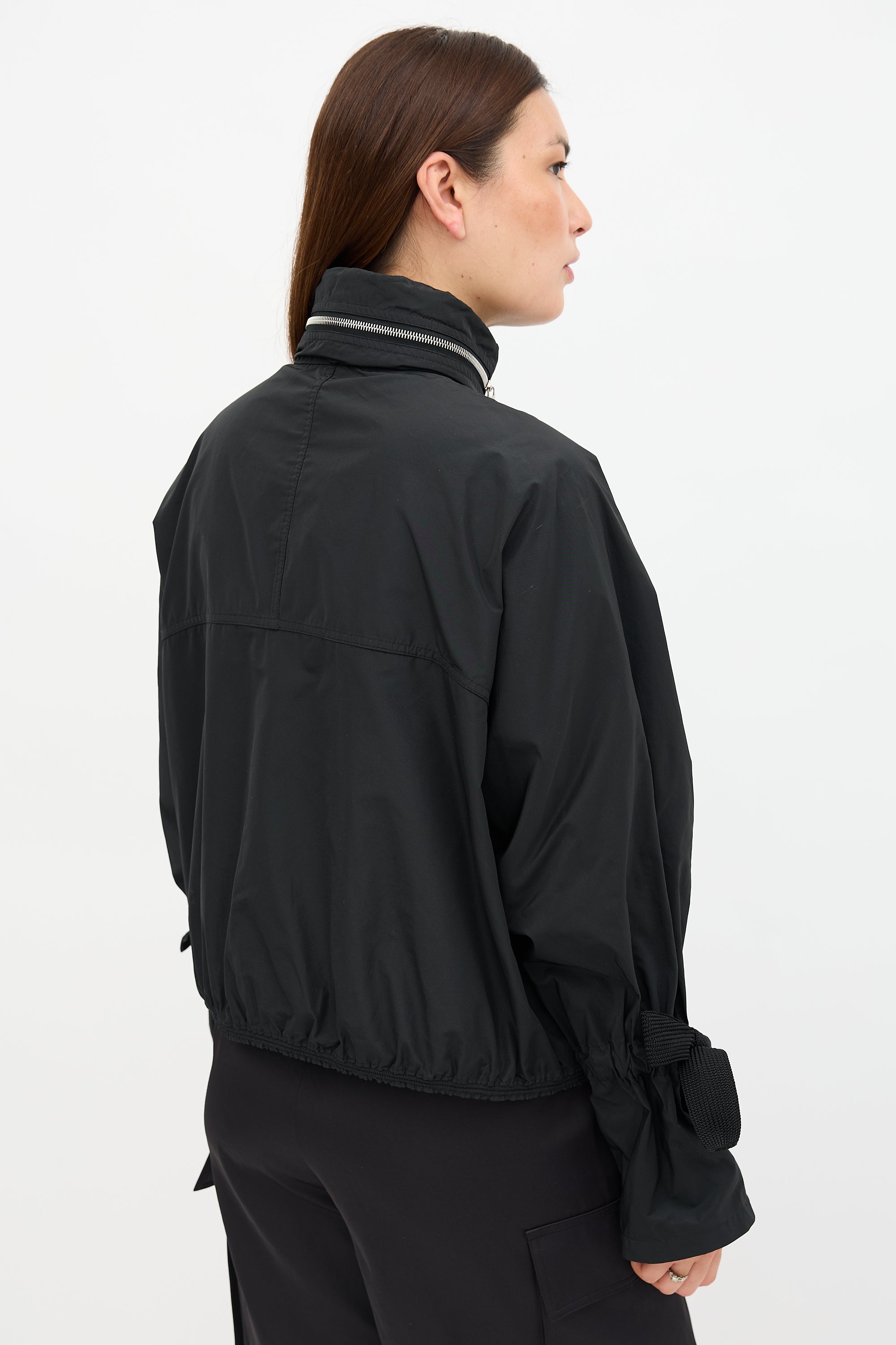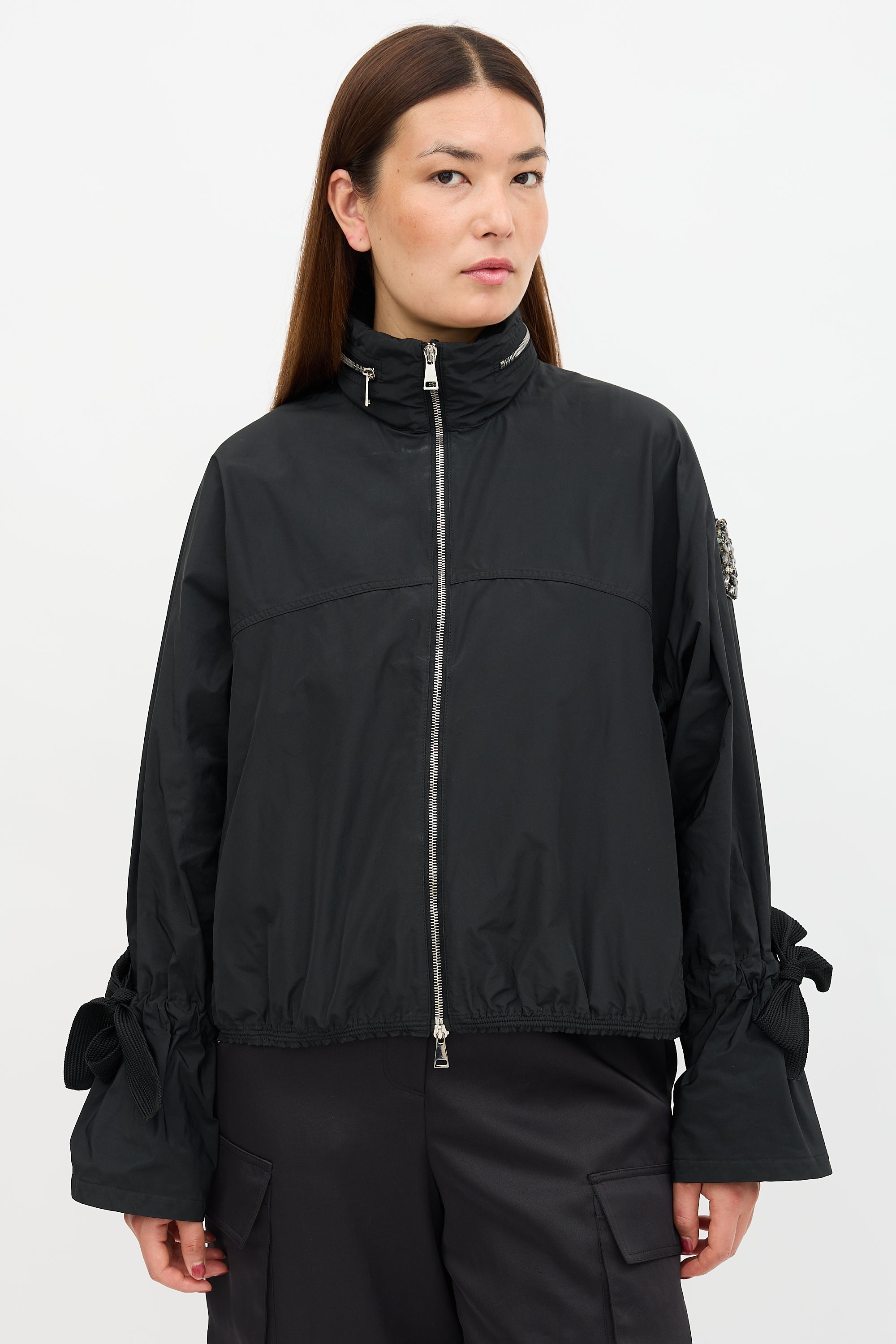 Pre-owned Moncler black Damas jacket featuring funnel collar, zip up front, two in seam pockets, crystal logo patch at left arm, and adjustable tie cuffs.