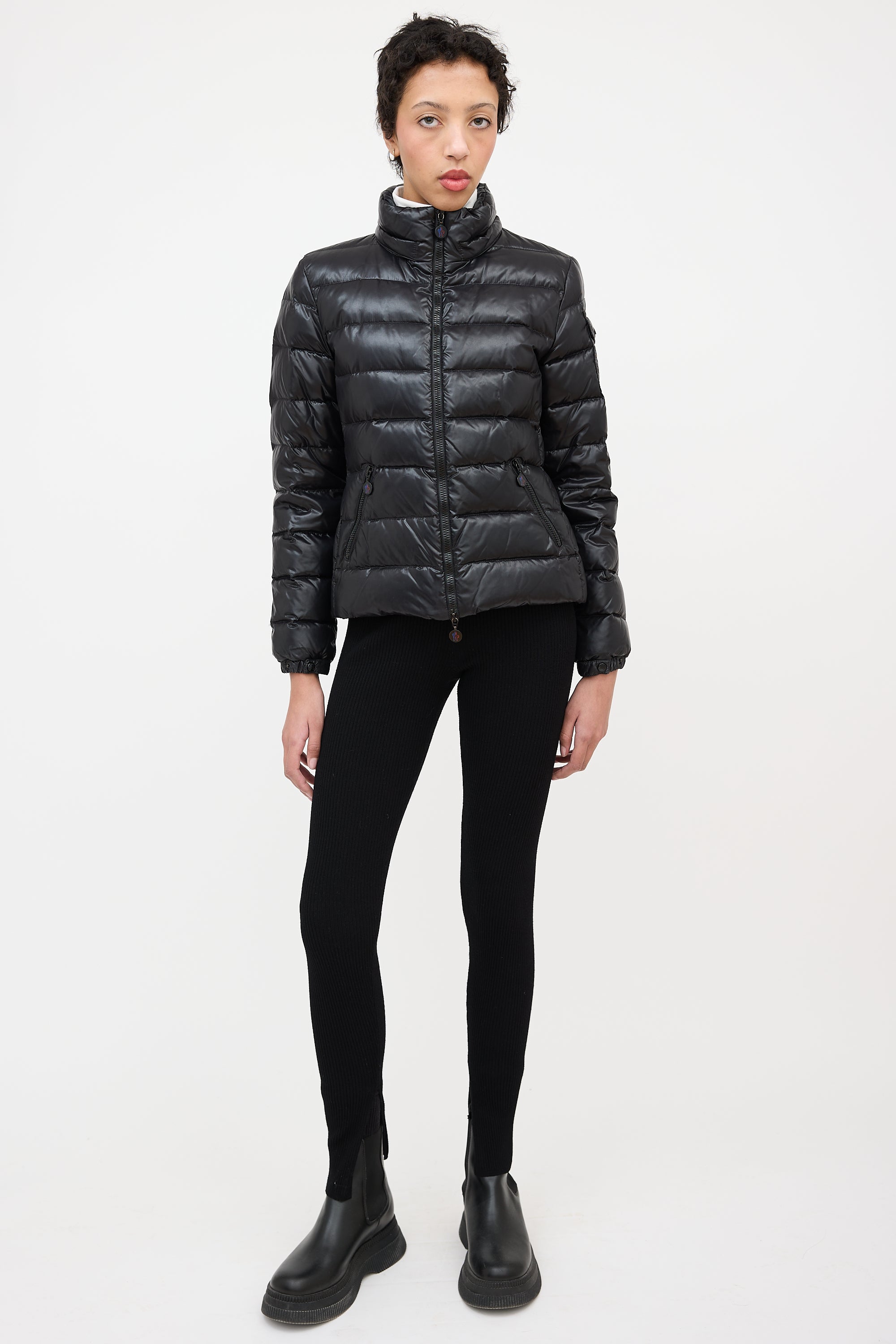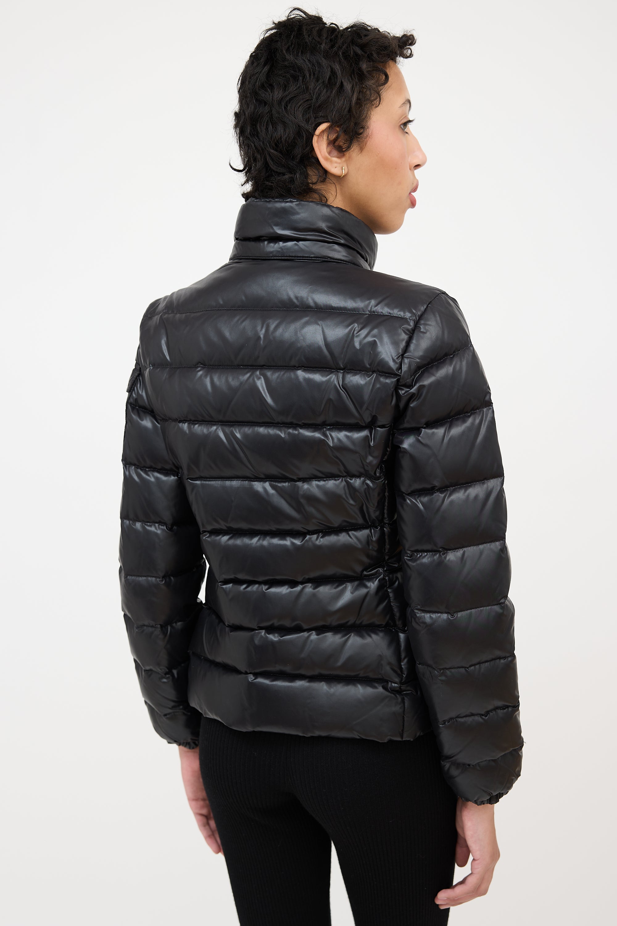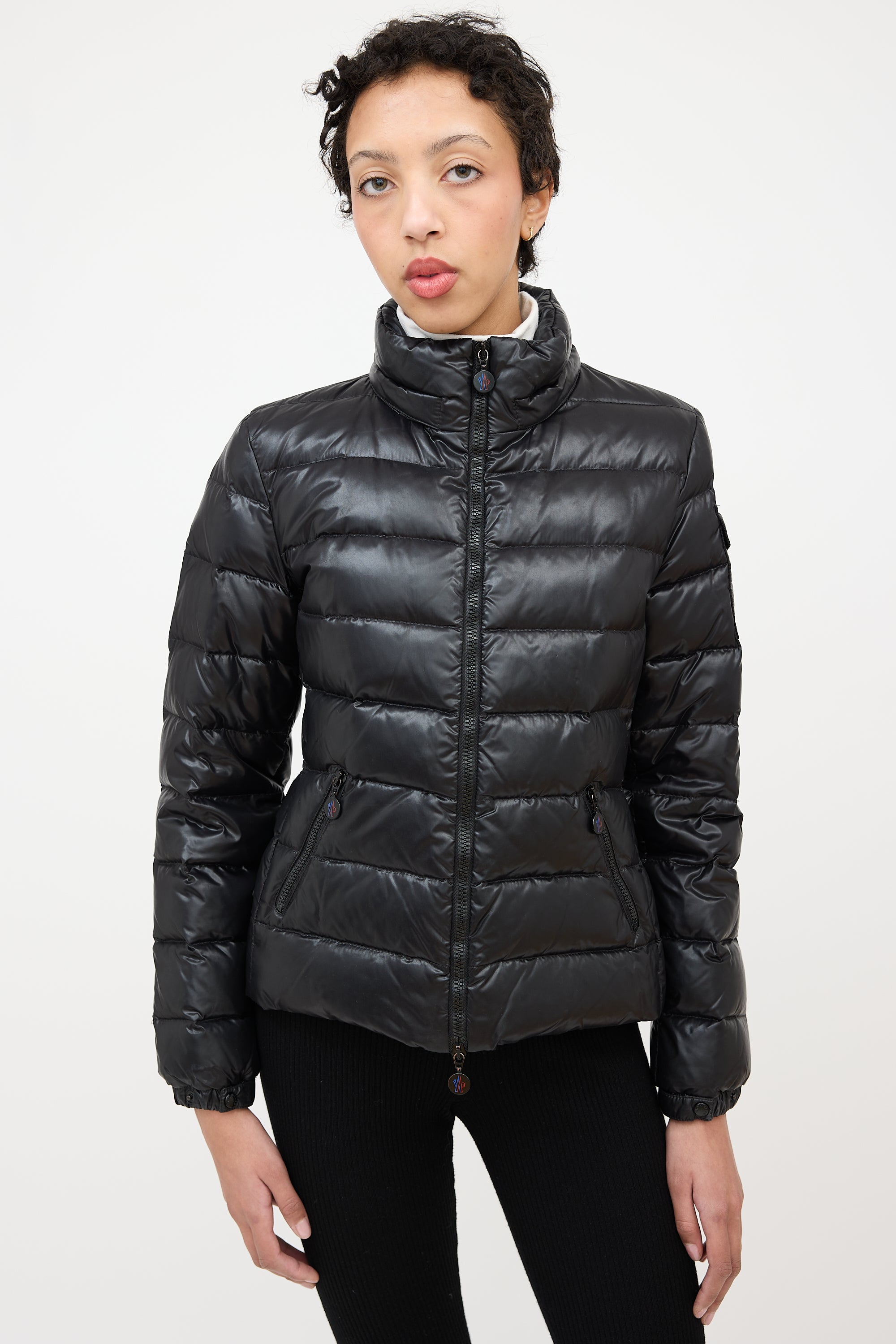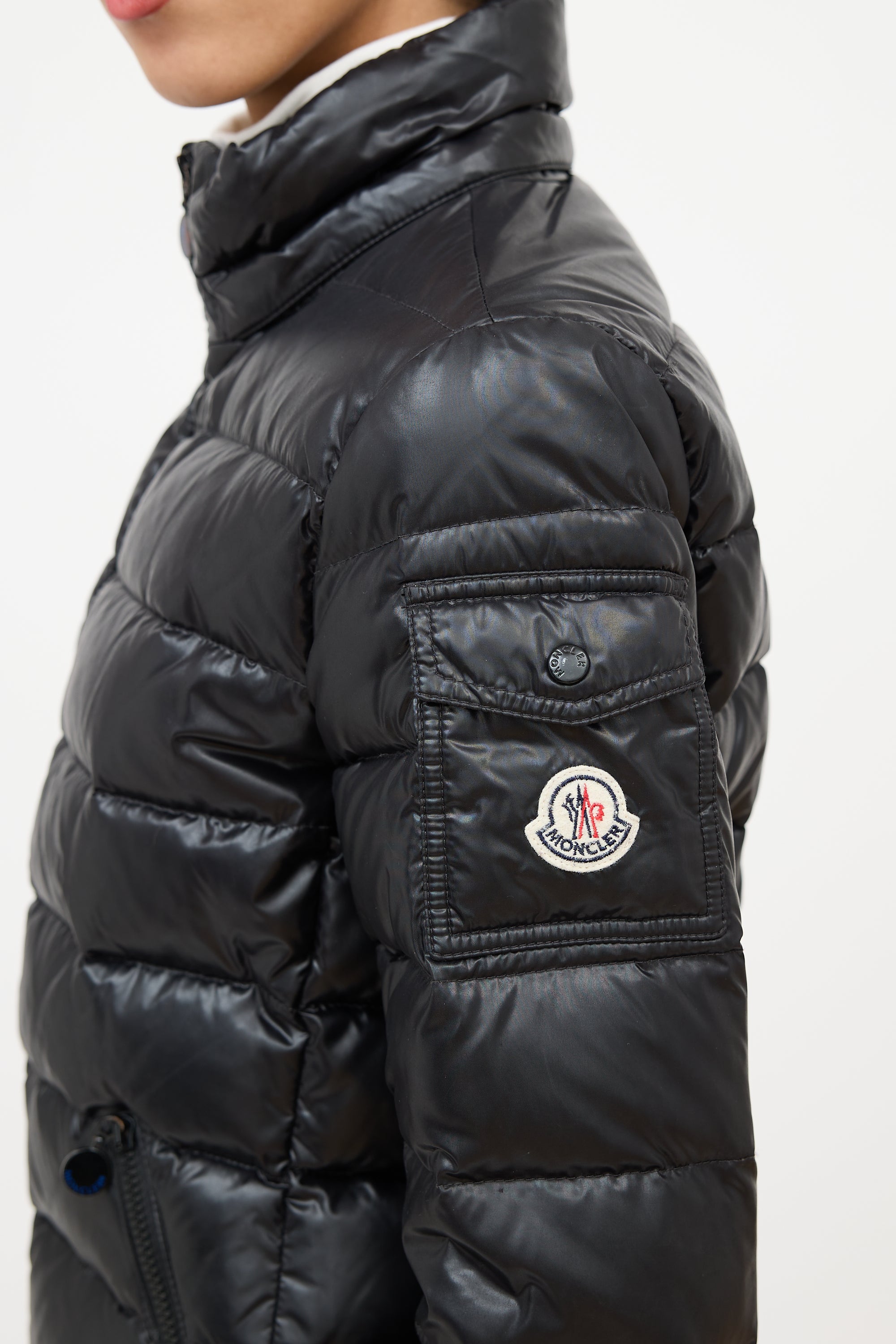 Pre-owned Moncler black down Bady puffer jacket featuring nylon shell, funnel collar with snap fastenings, double zip front, two front zip pockets, flap pocket with logo patch at left arm, and elasticized cuffs. Padded and lined.