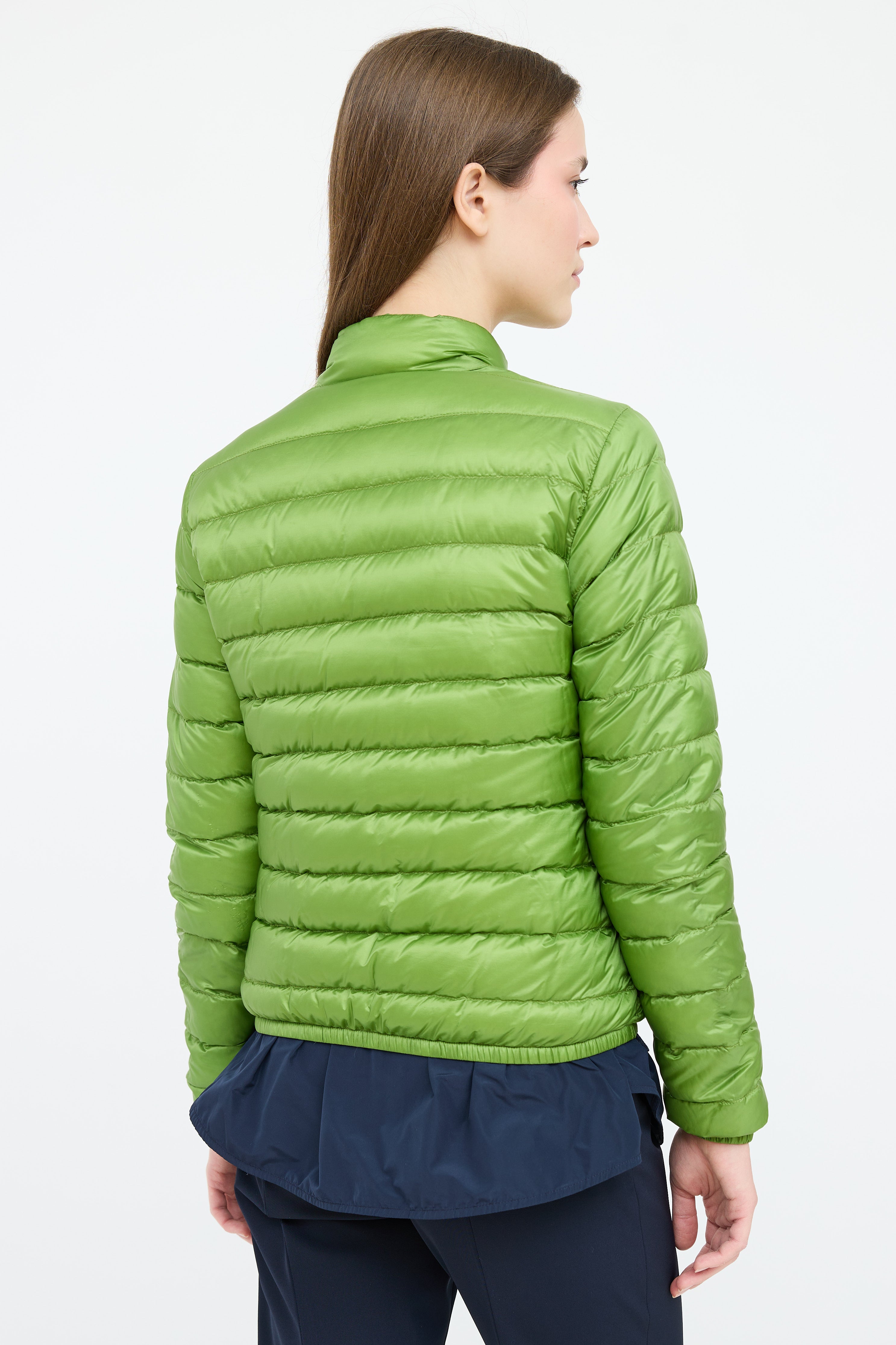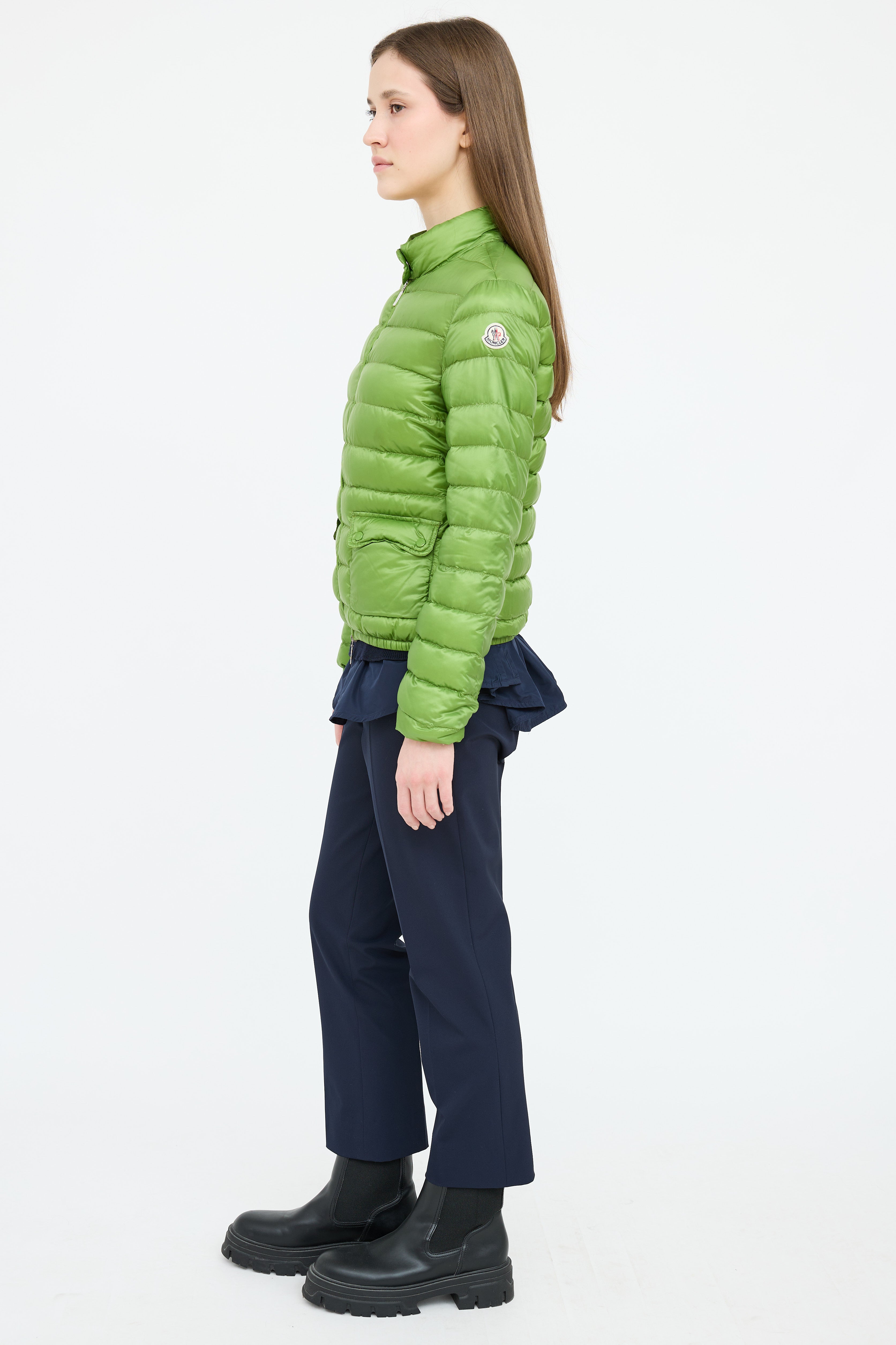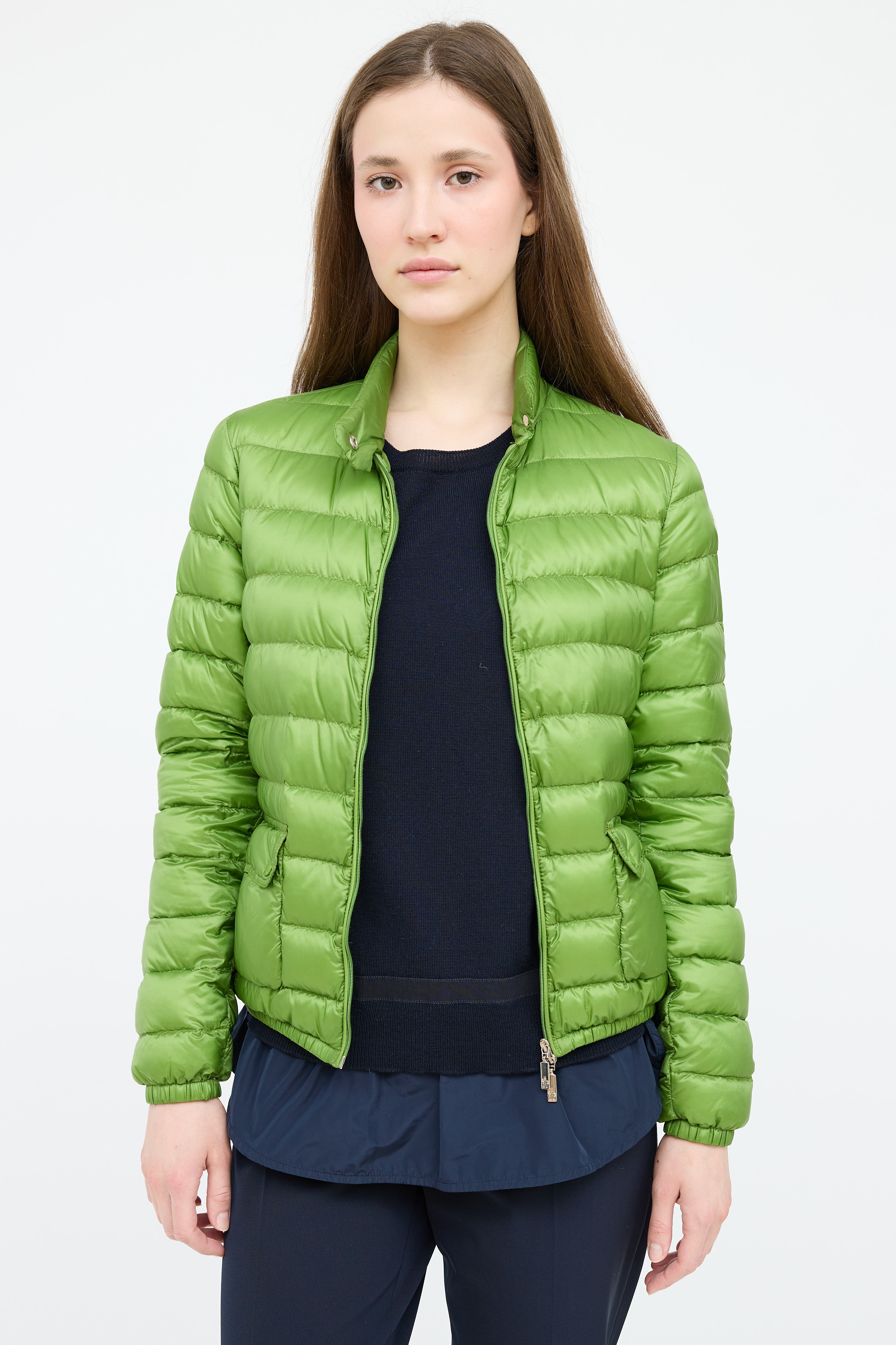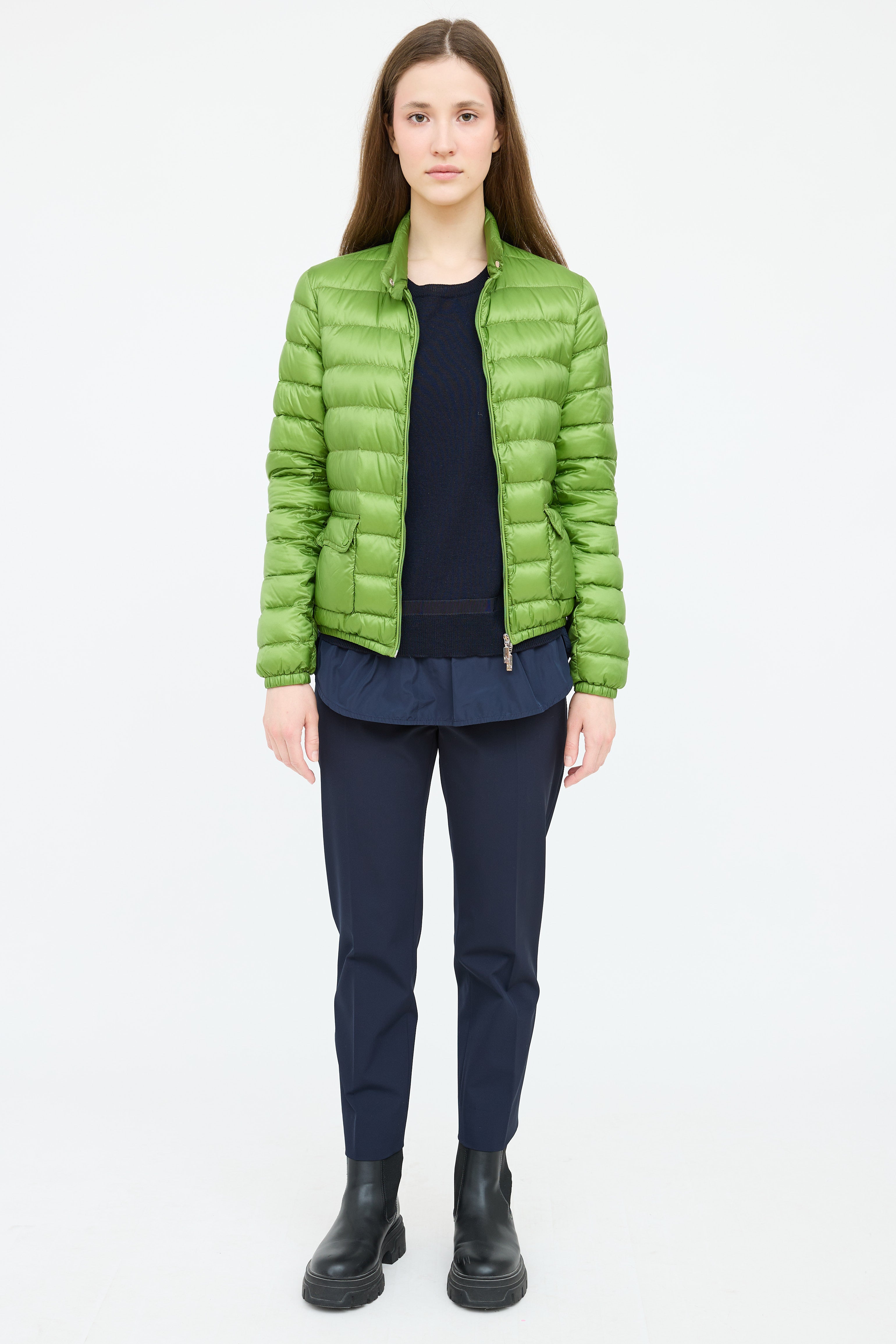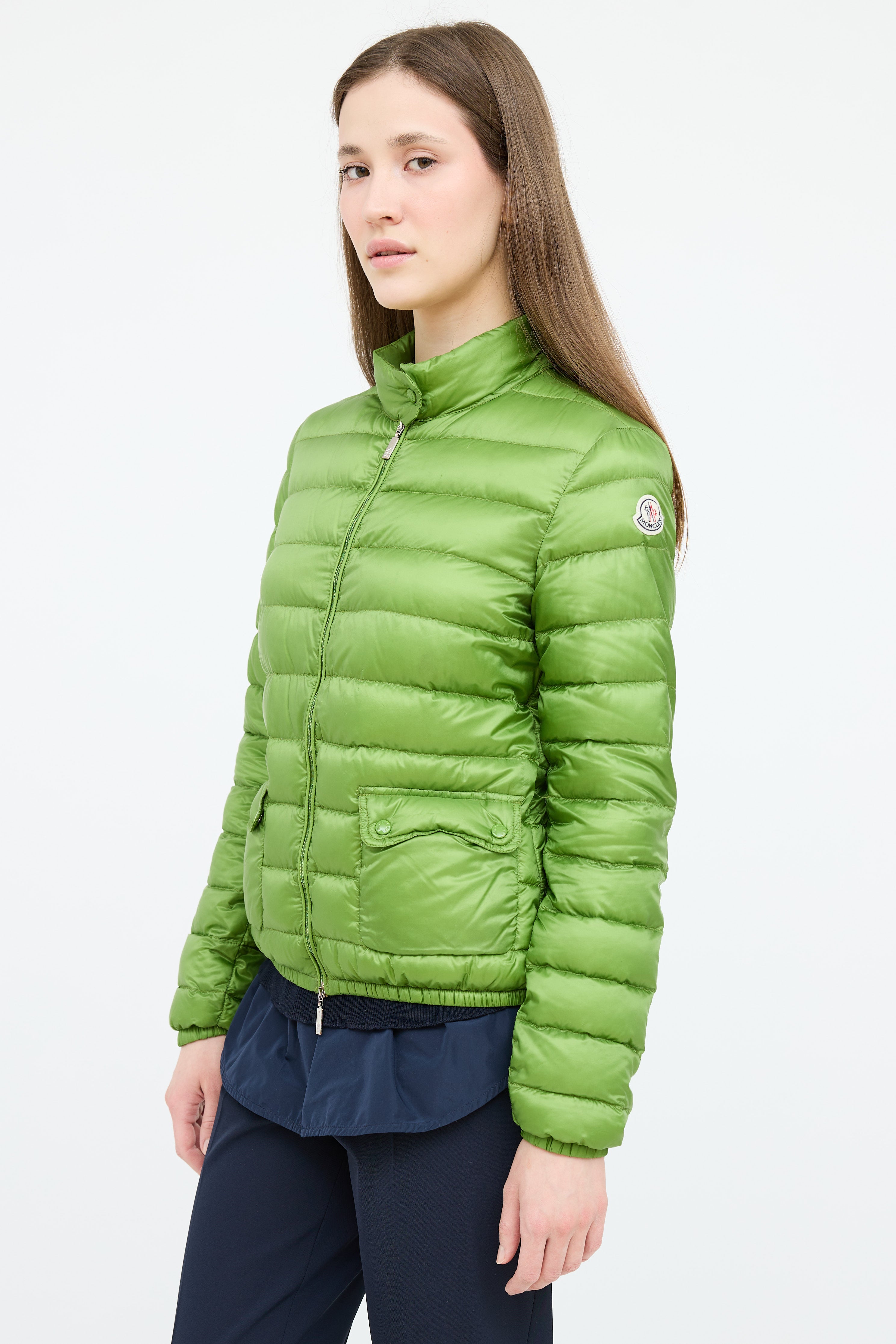 Pre-owned Moncler green Lans down puffer jacket featuring a funnel neck collar, long sleeves, two flap pockets at hip, logo patch at shoulder, elastic hem, and zip closure.