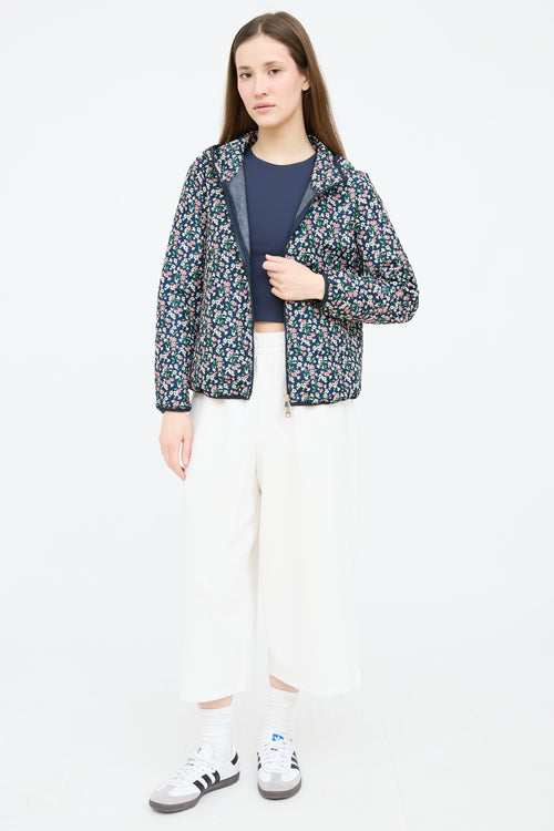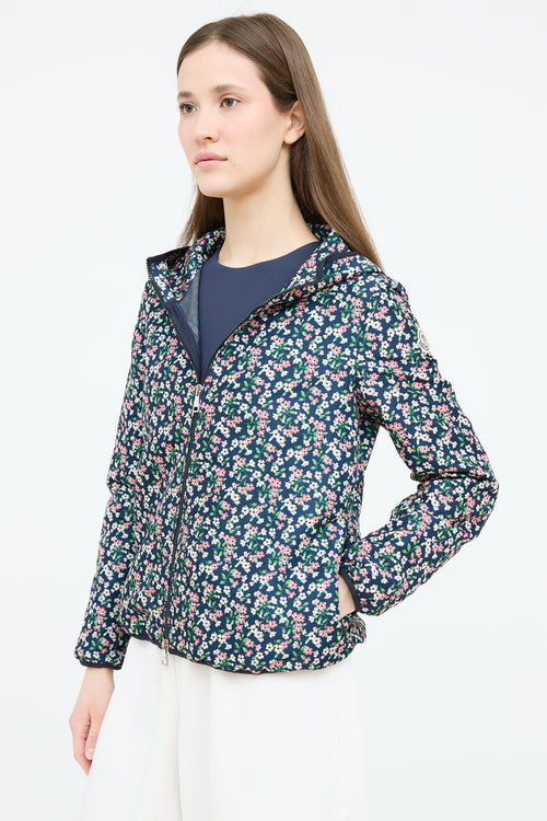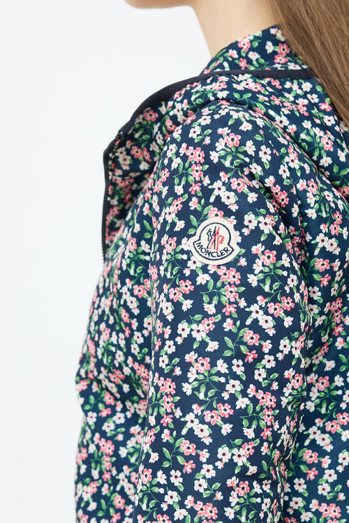 Pre-owned Moncler navy Vive windbreaker featuring a multicolour floral pattern throughout, hood with ribbed trim, long sleeves, logo patch at shoulder, two zip pockets at hip, ribbed hem, and zip closure. Lined.