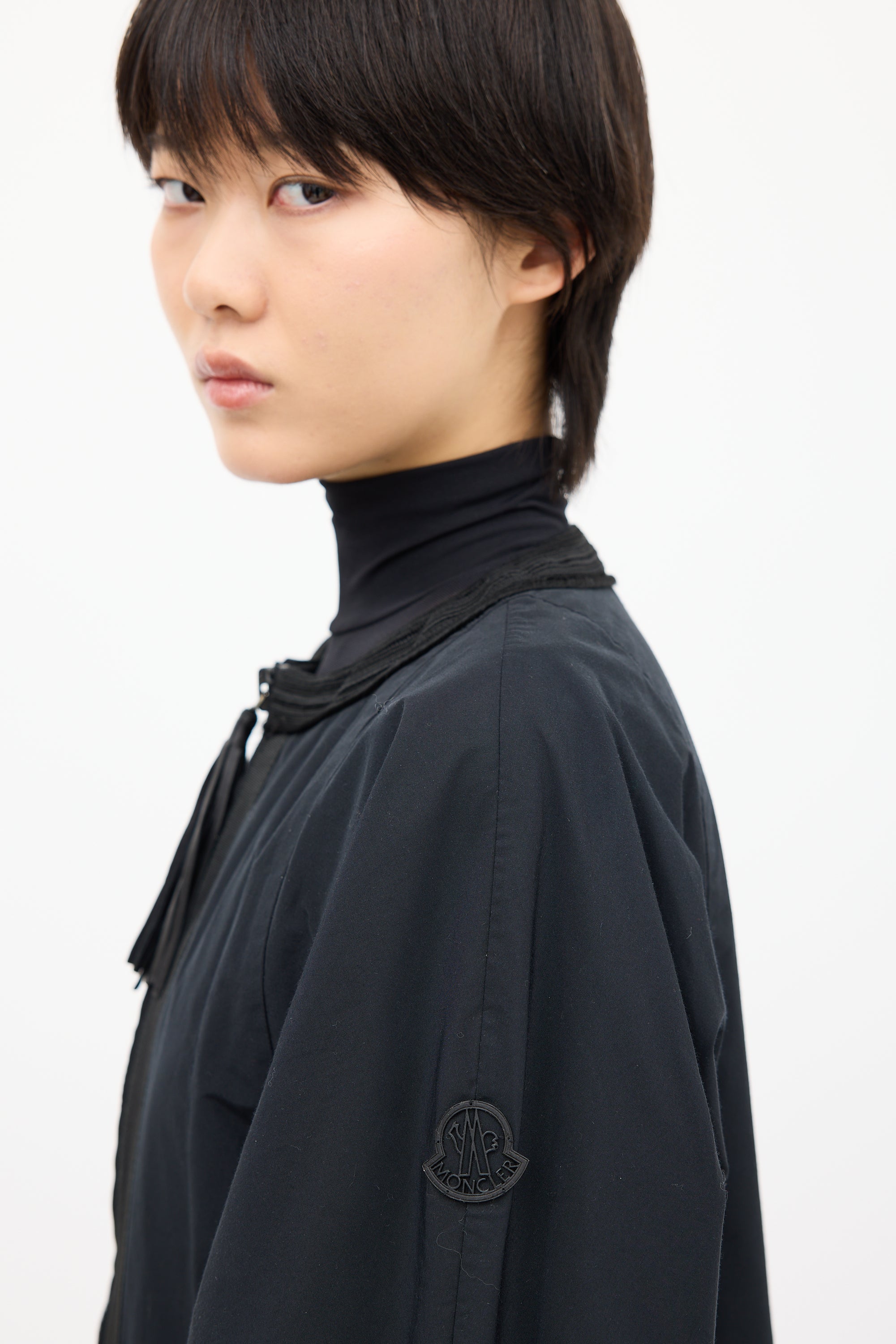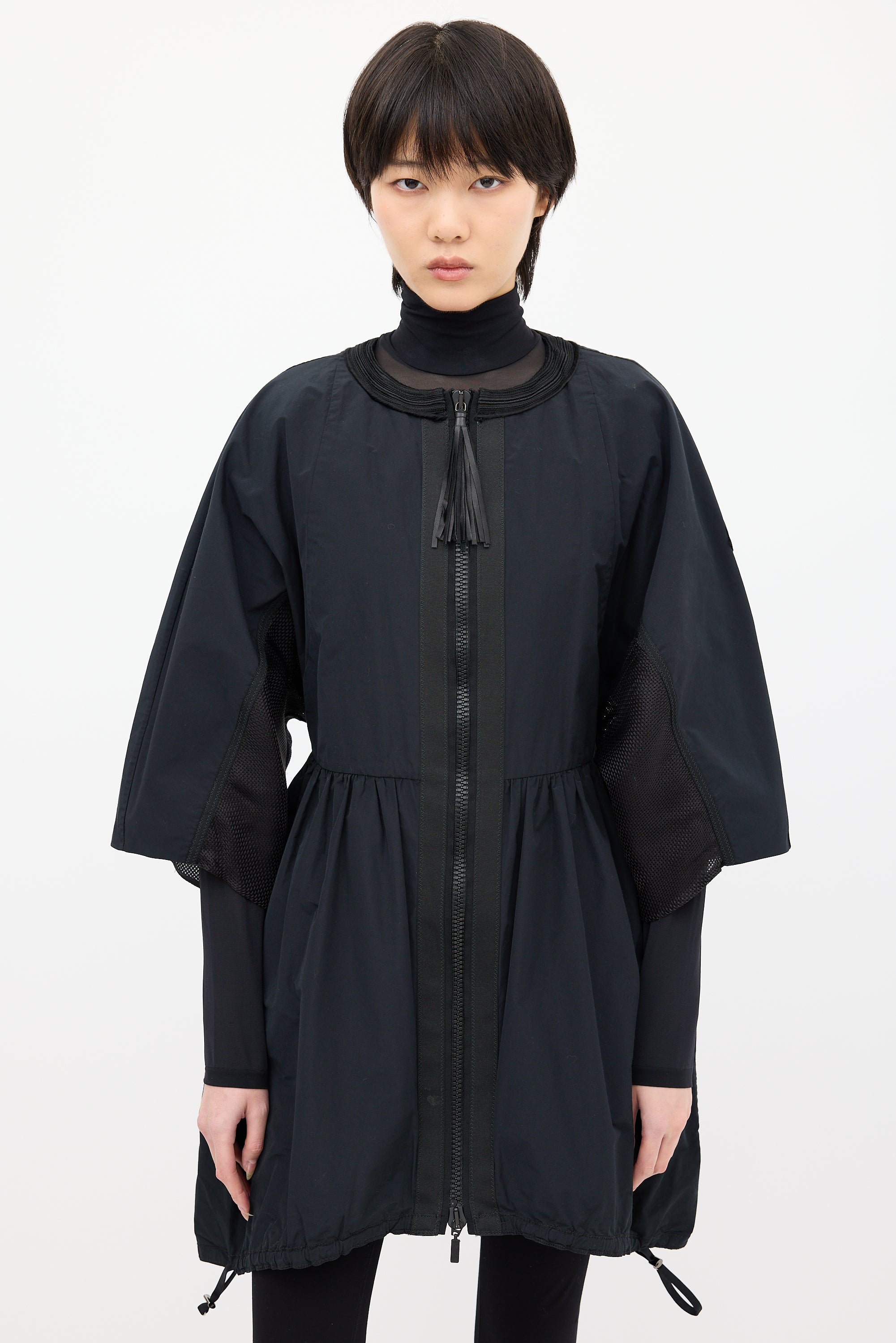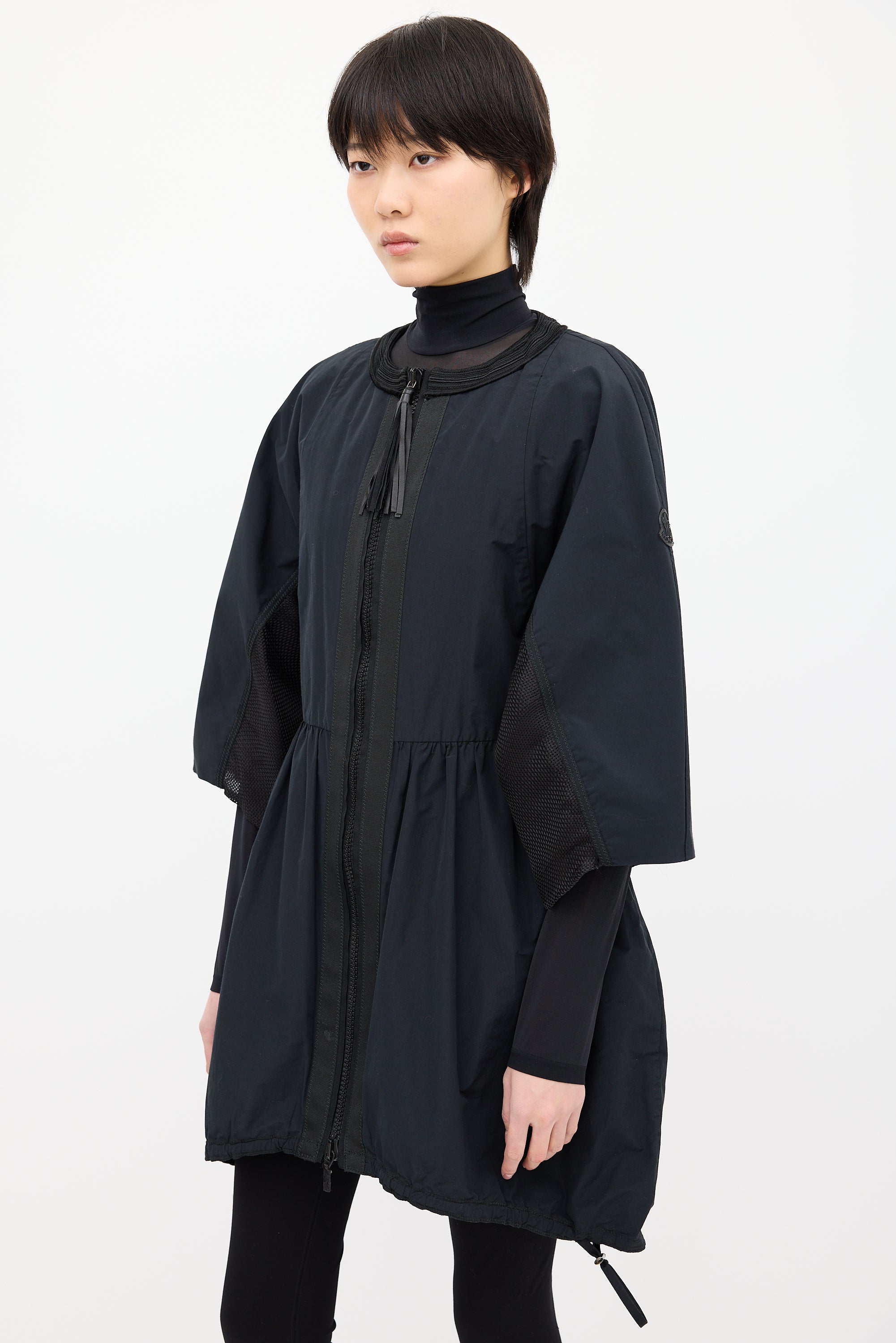 Pre-owned Moncler Gamme Rouge black light jacket featuring embroidered round neckline, two way zip up front with tassel charm, logo patch at left sleeve, wide three quarter length sleeves, mesh underarm, pleated waist, two inseam pockets, and drawstring hem.