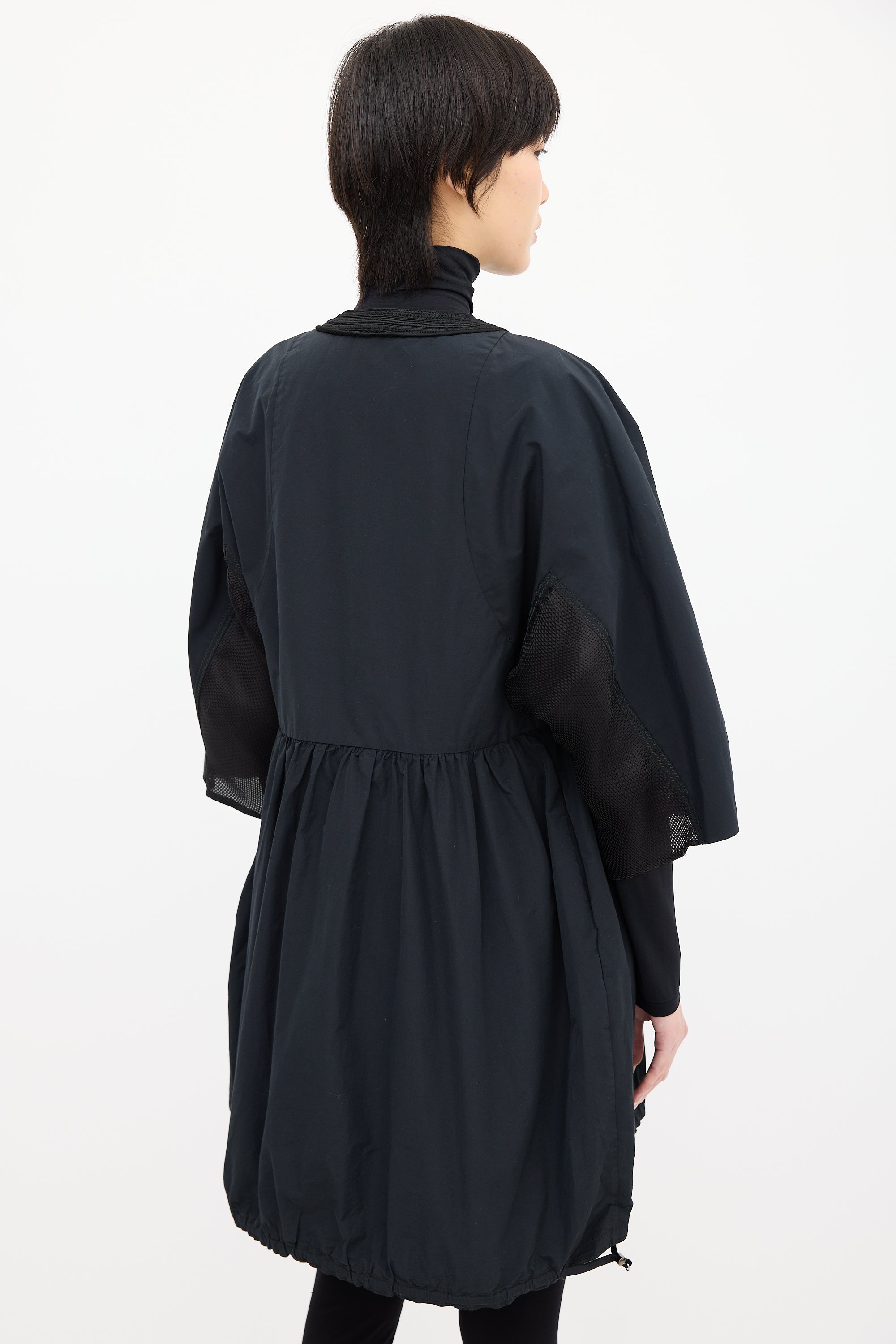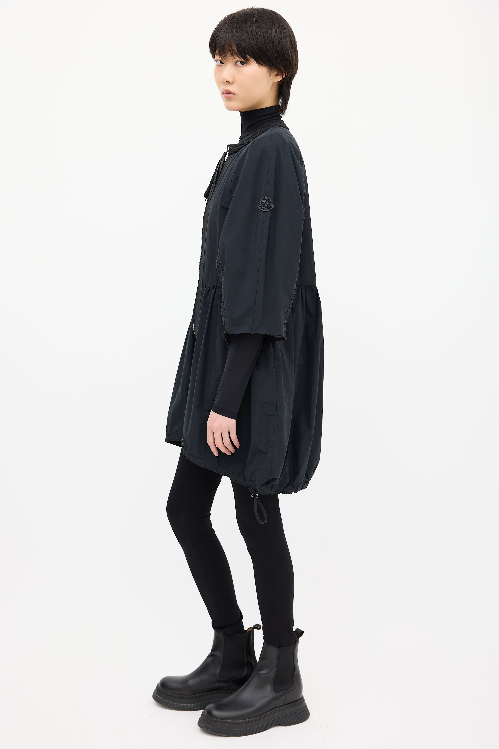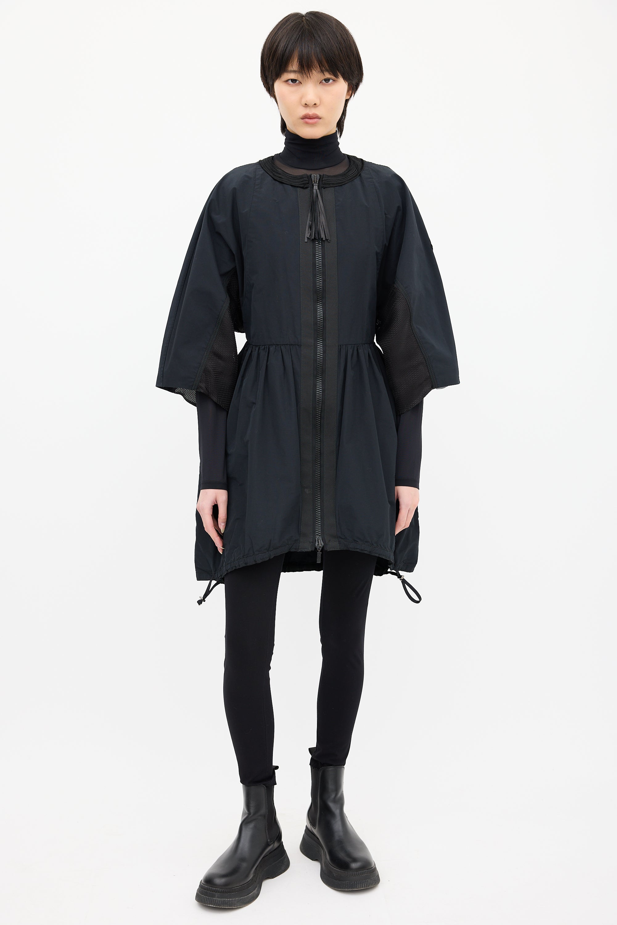 Pre-owned Moncler Gamme Rouge black light jacket featuring embroidered round neckline, two way zip up front with tassel charm, logo patch at left sleeve, wide three quarter length sleeves, mesh underarm, pleated waist, two inseam pockets, and drawstring hem.