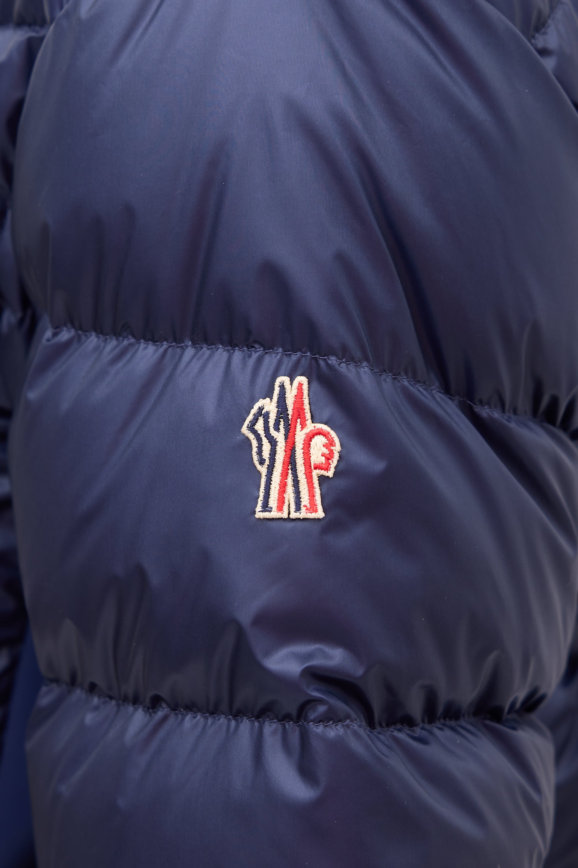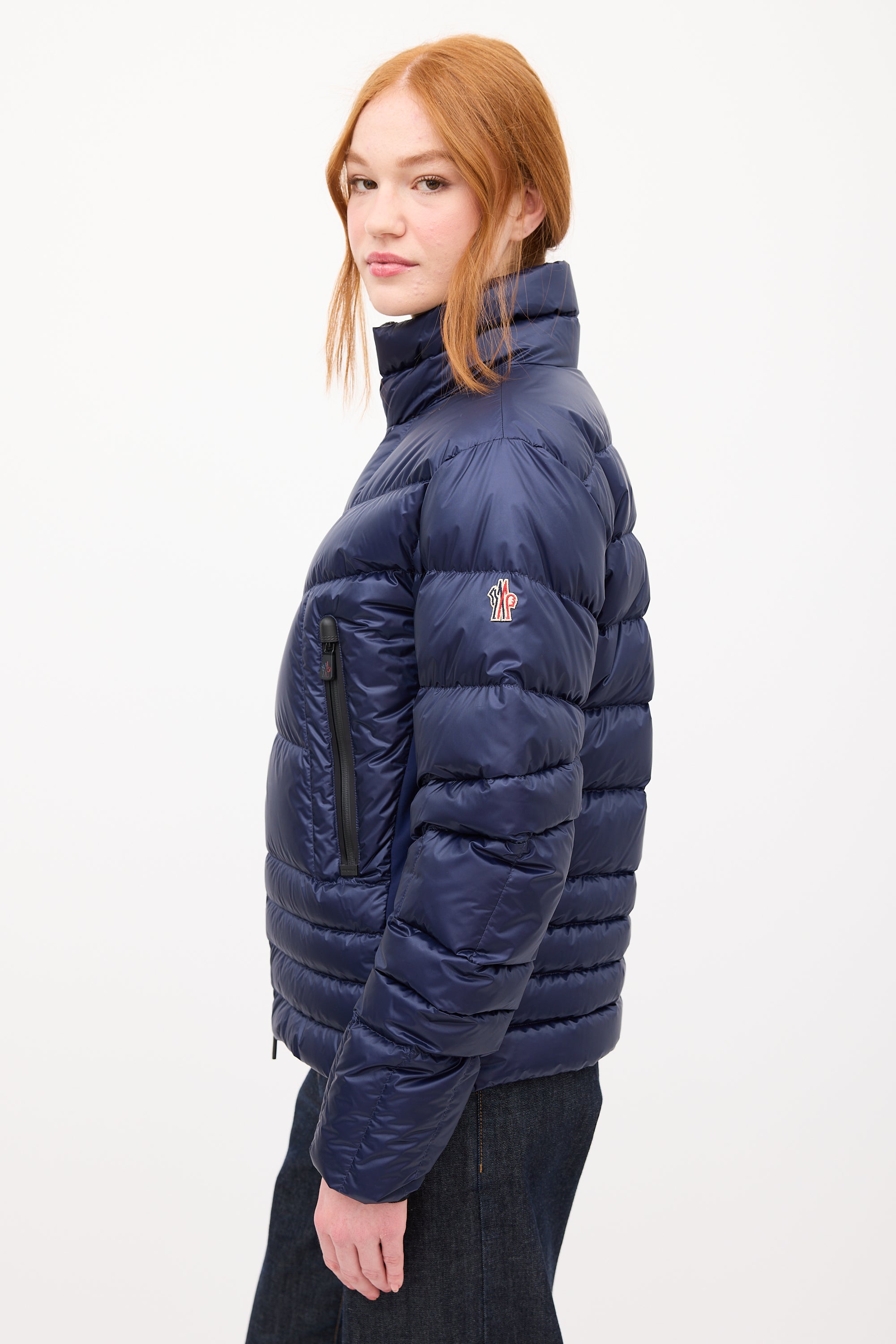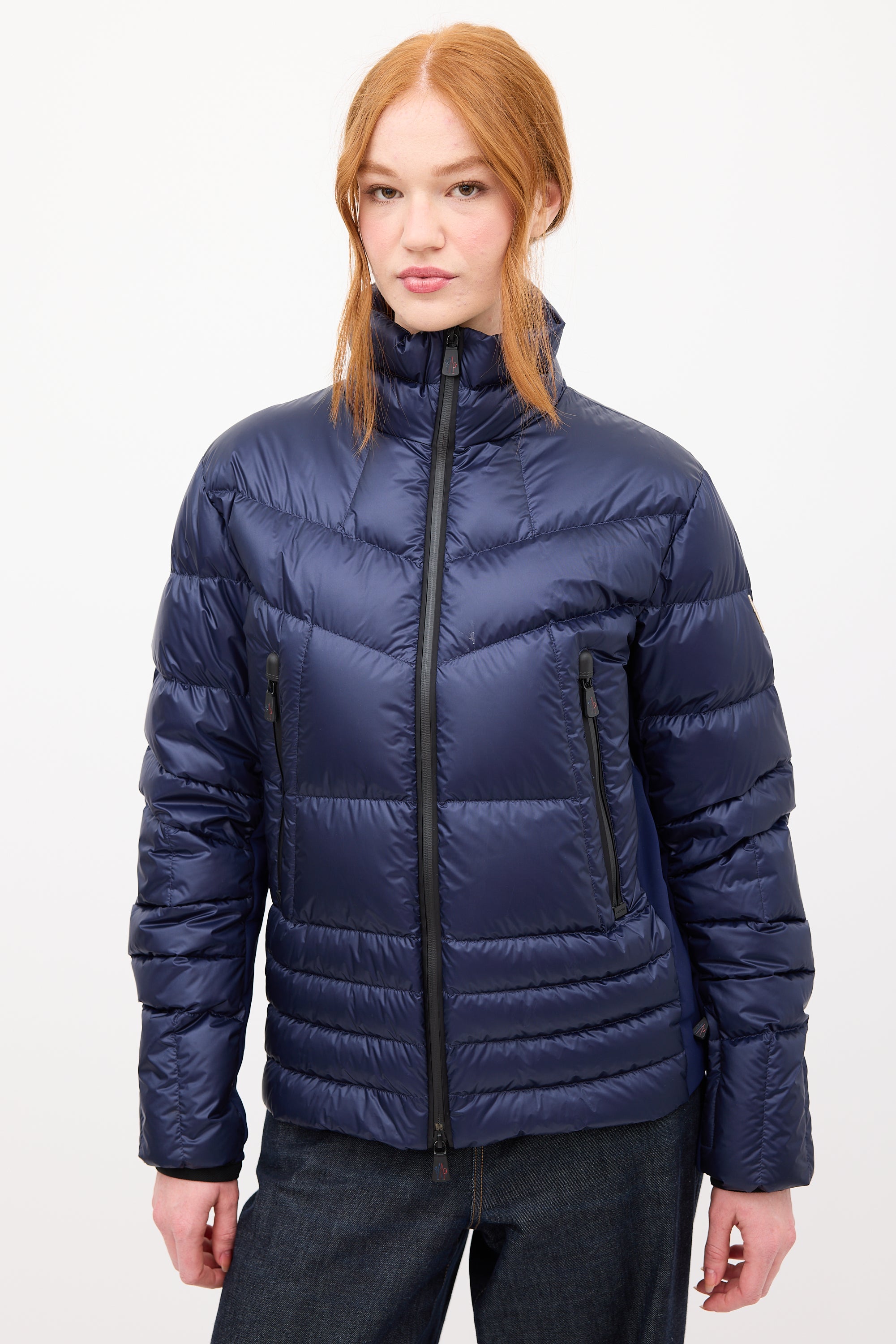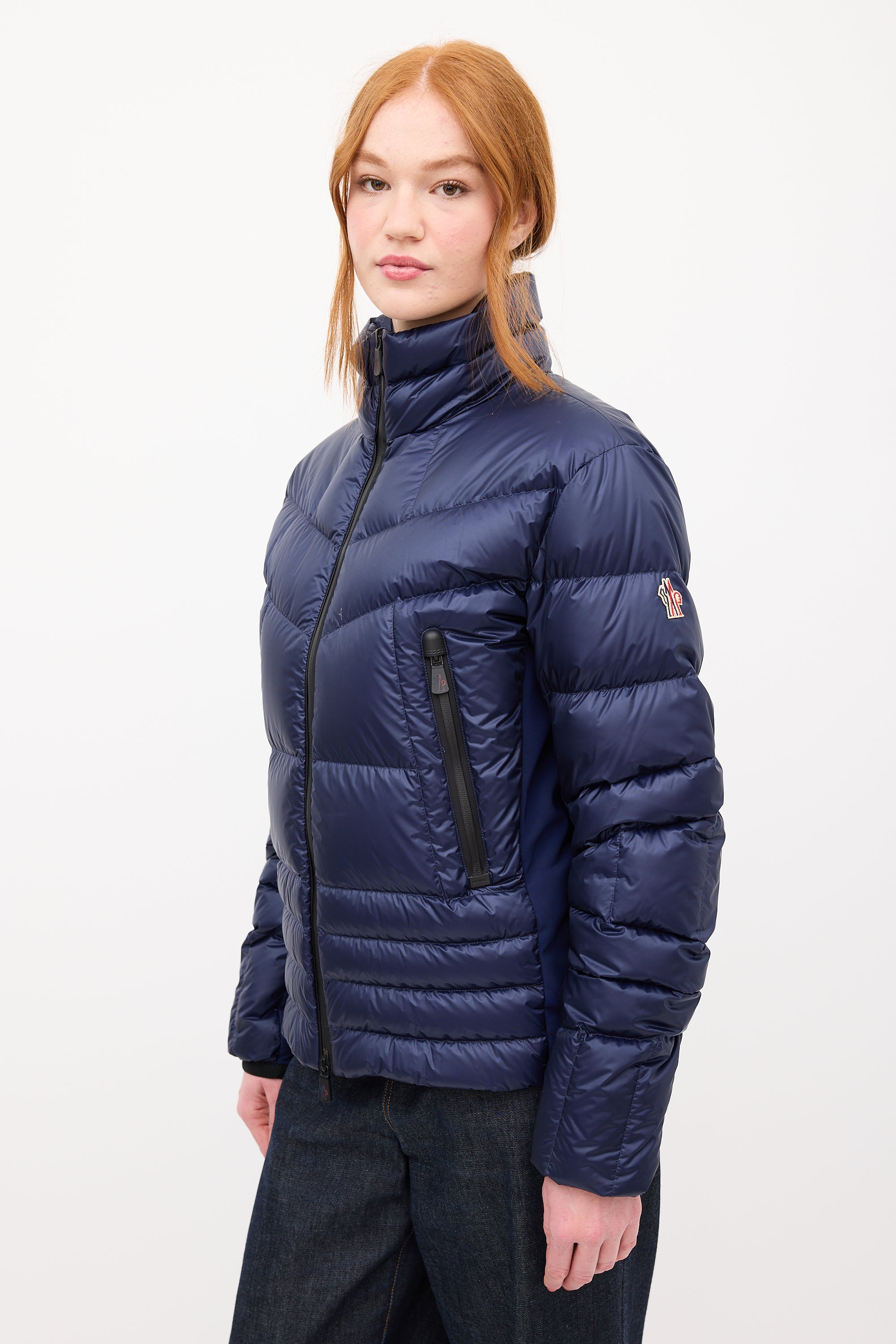 Pre-owned Moncler Grenoble navy down Canmore puffer jacket featuring a funnel collar, front double zip closure, neoprene sides, two front zip pockets, and one interior pocket with cable output slot. Padded and lined.
