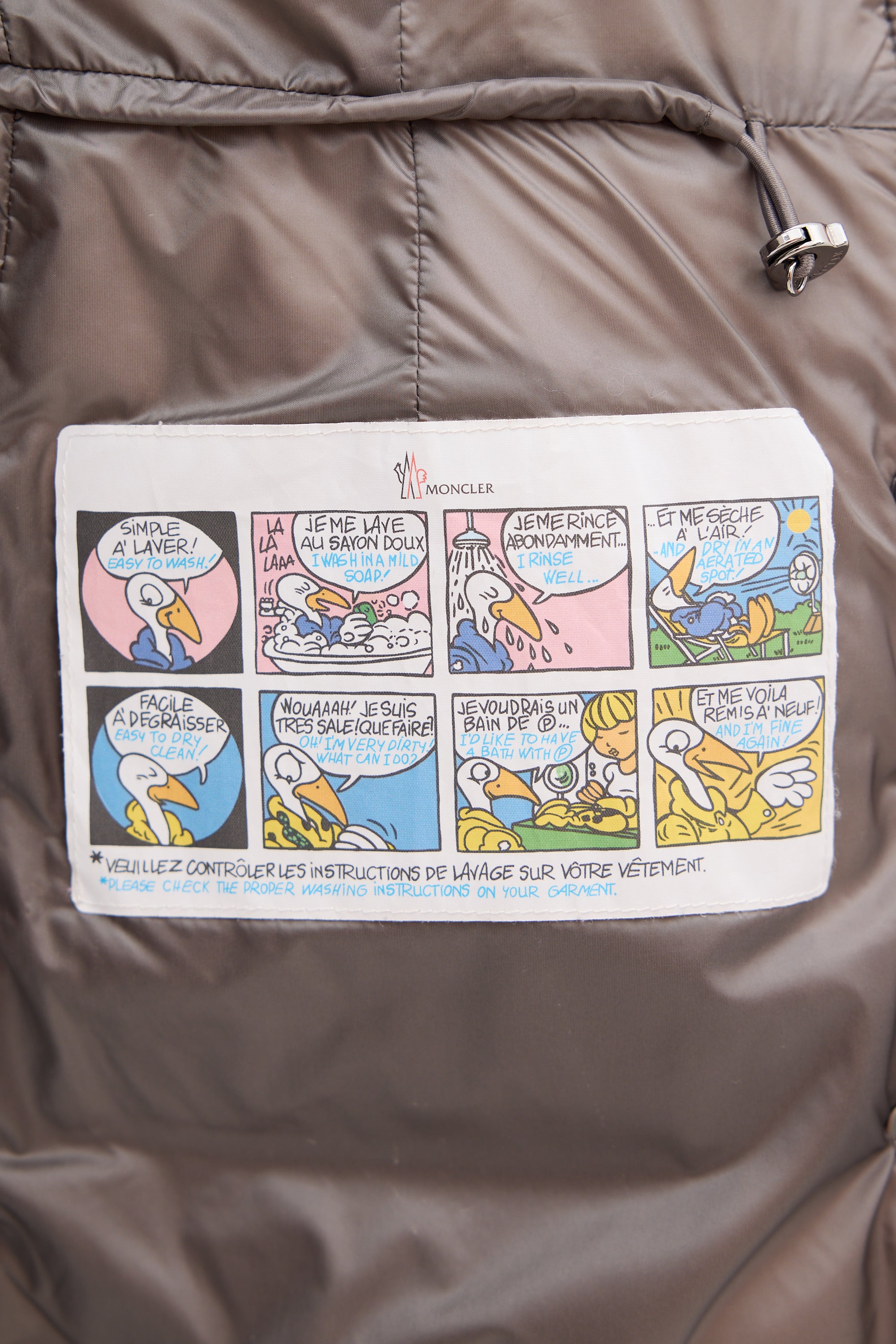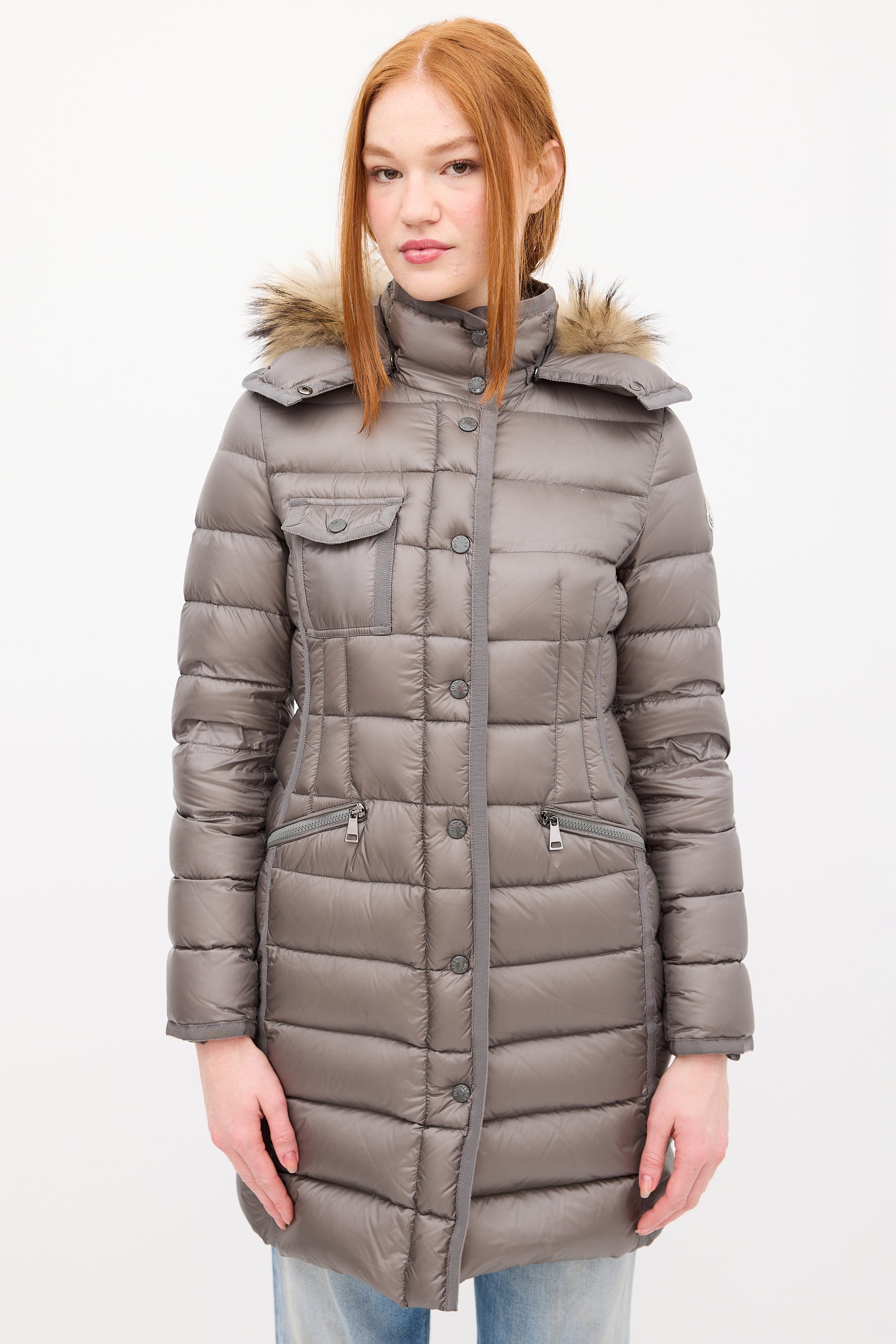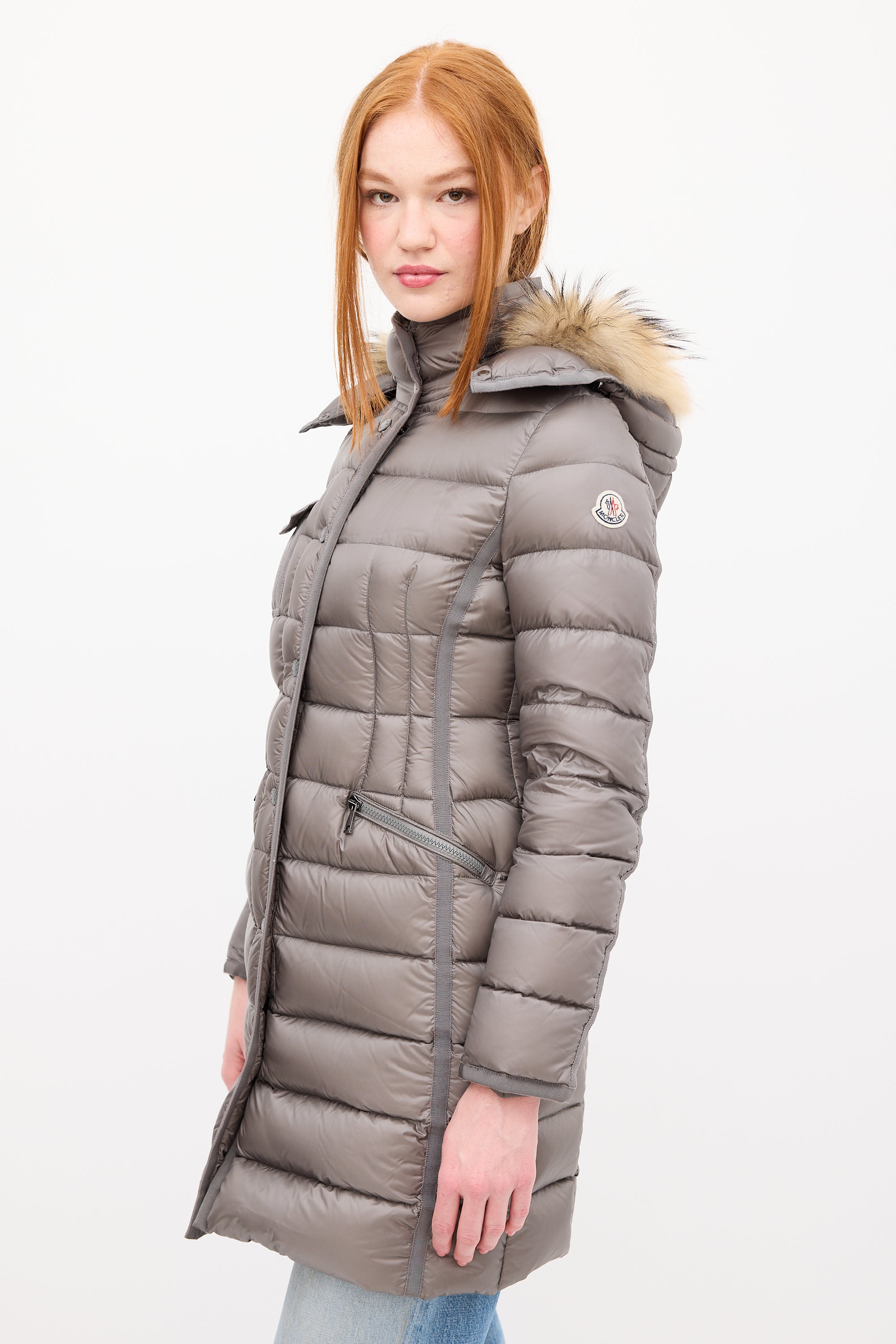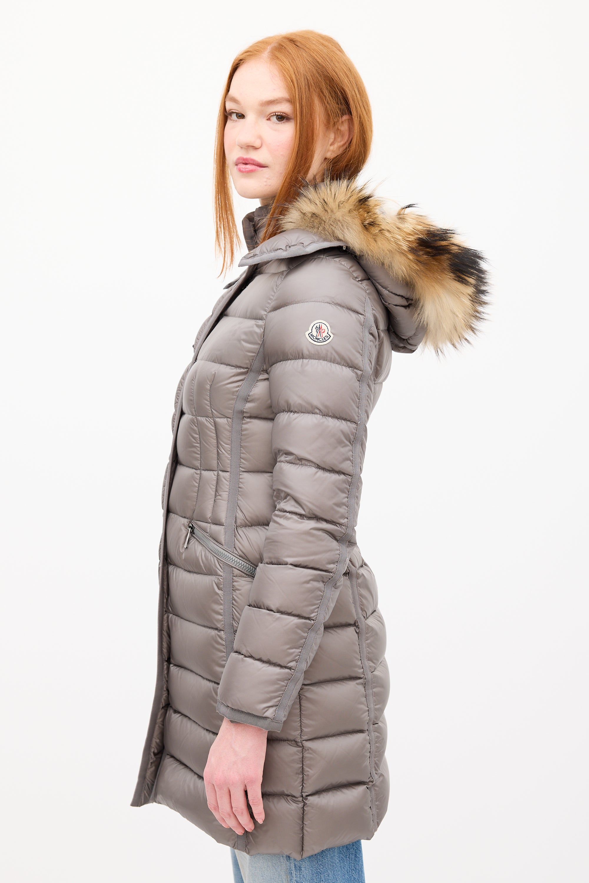 Pre-owned Moncler grey down Hemifur puffer coat featuring a nylon shell, funnel collar, removable hood with fur trim, front double zip closure, three front pockets, and grosgrain trim throughout. Padded and lined.