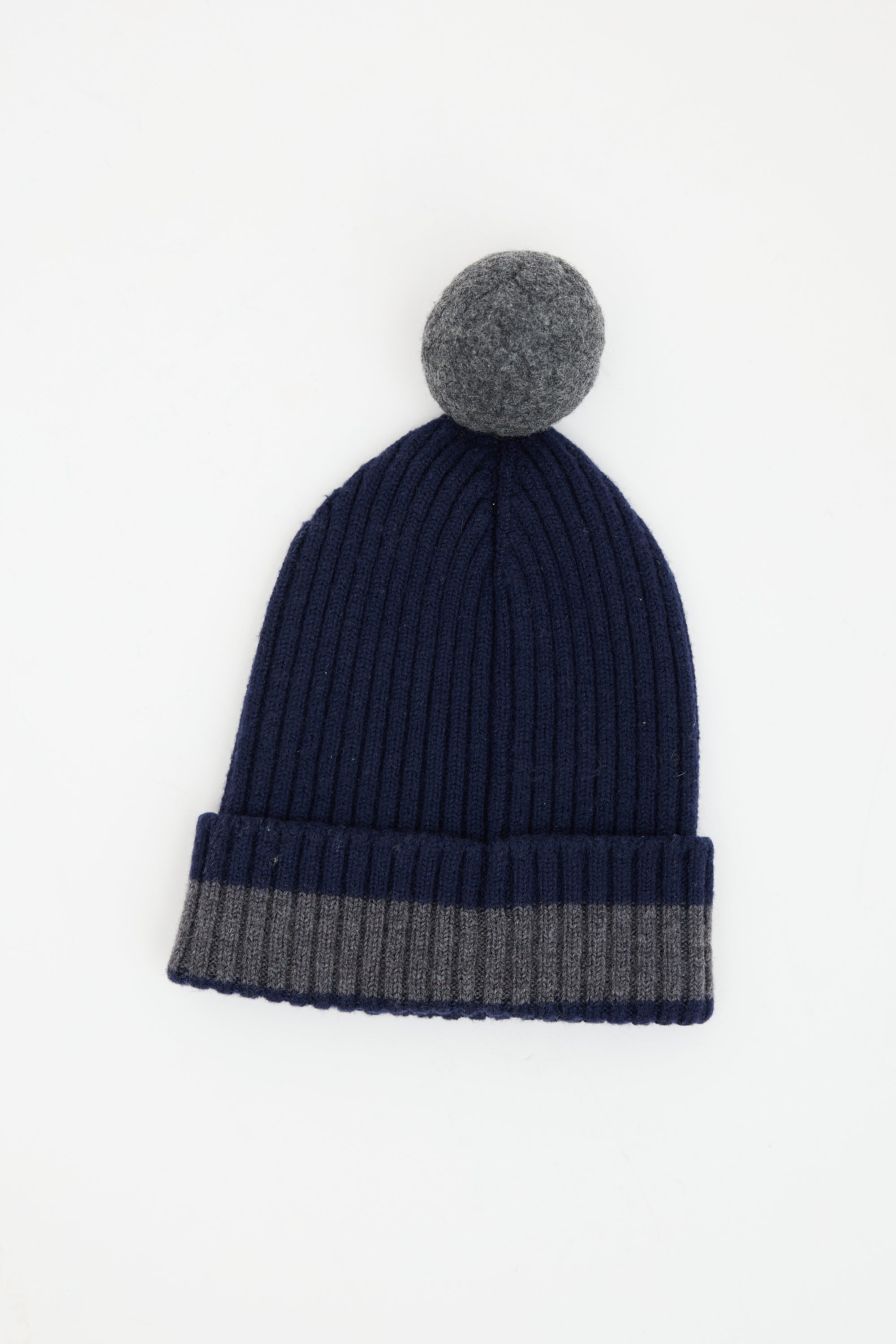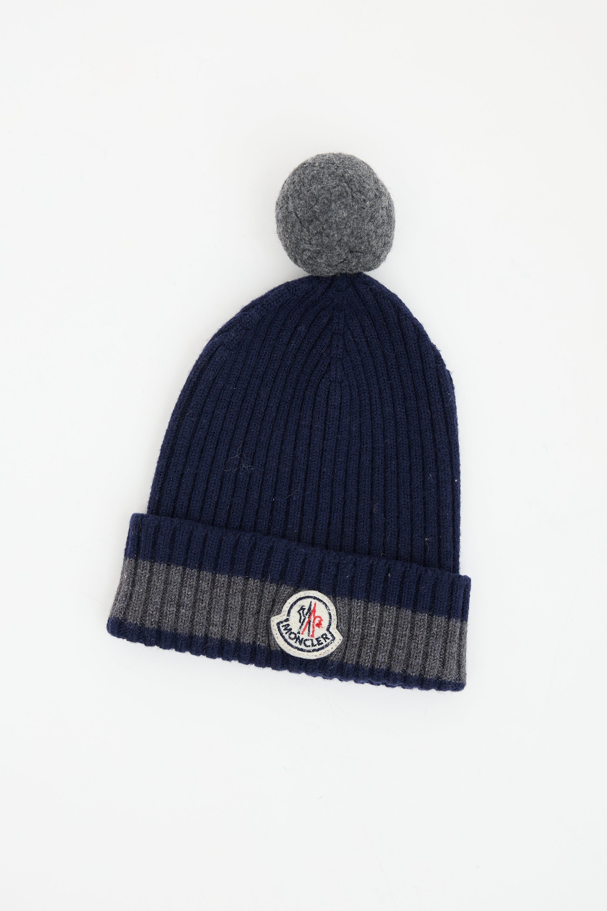 Pre-owned Moncler Kids navy wool beanie featuring fold over design with grey stripe, felt logo patch at front, and a felted grey wool pom pom at top.