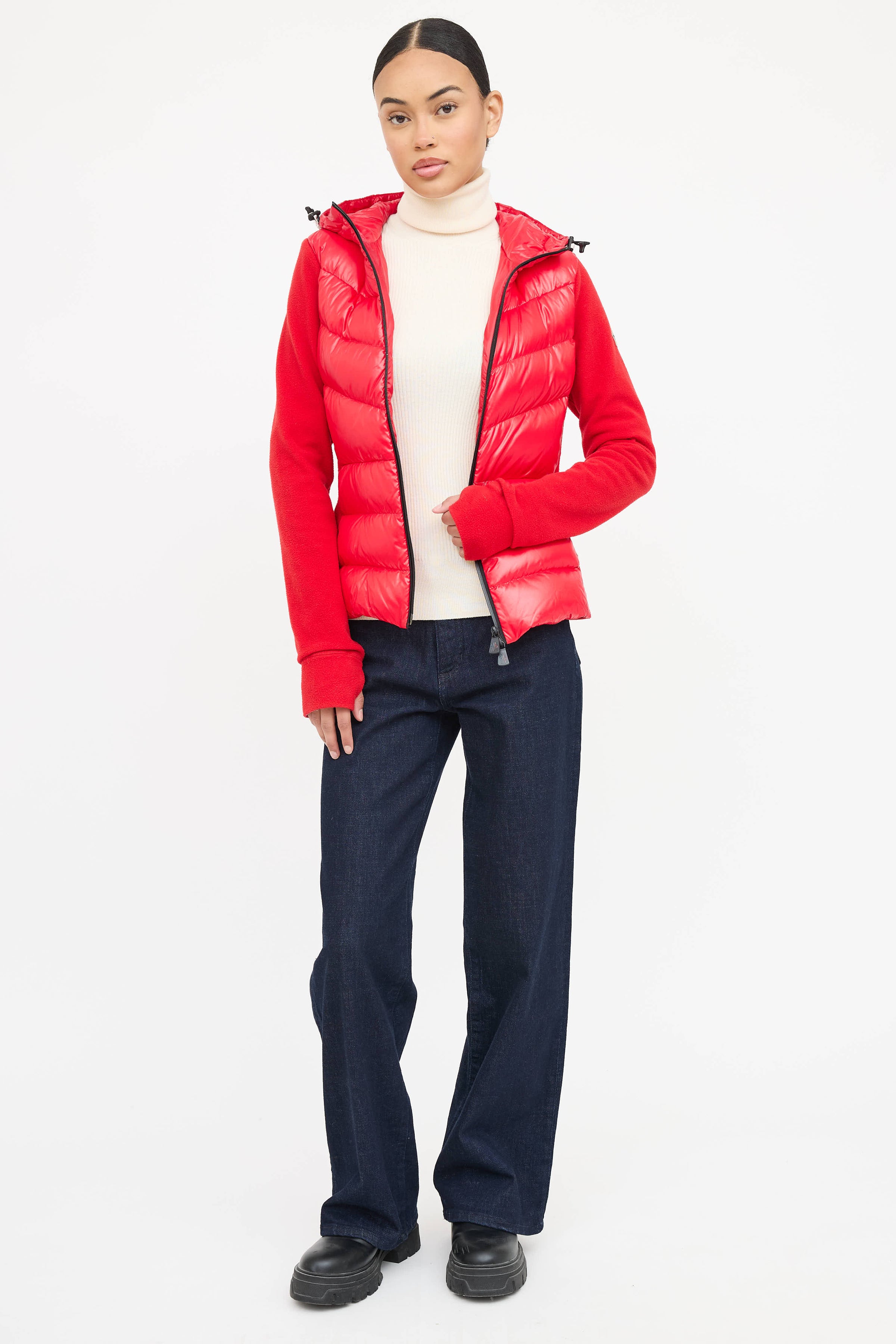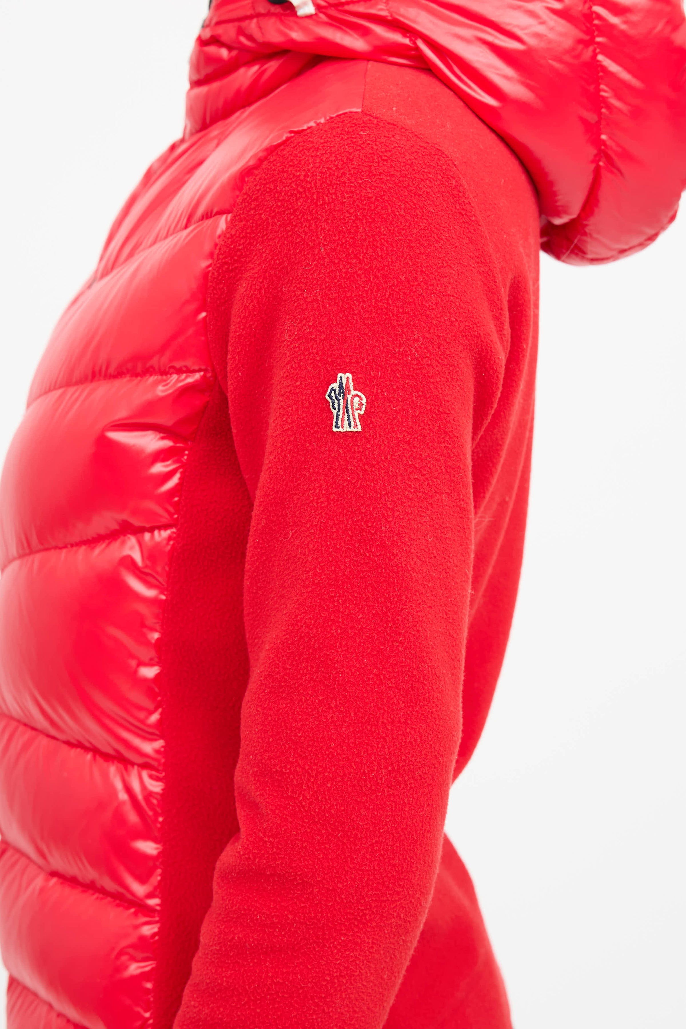 Pre-owned Moncler red Maglia long sleeve hooded cardigan featuring quilted front, attached hood with drawstring toggle, double zip front, embroidered logo patch at left sleeve, and fleece sleeves with thumb holes. Lined.