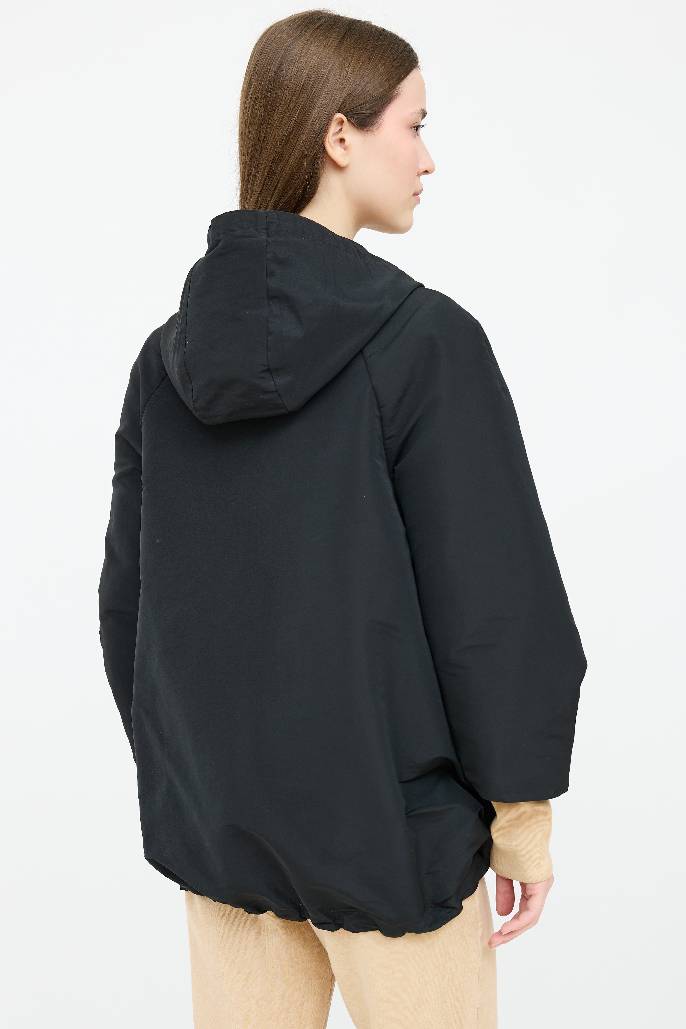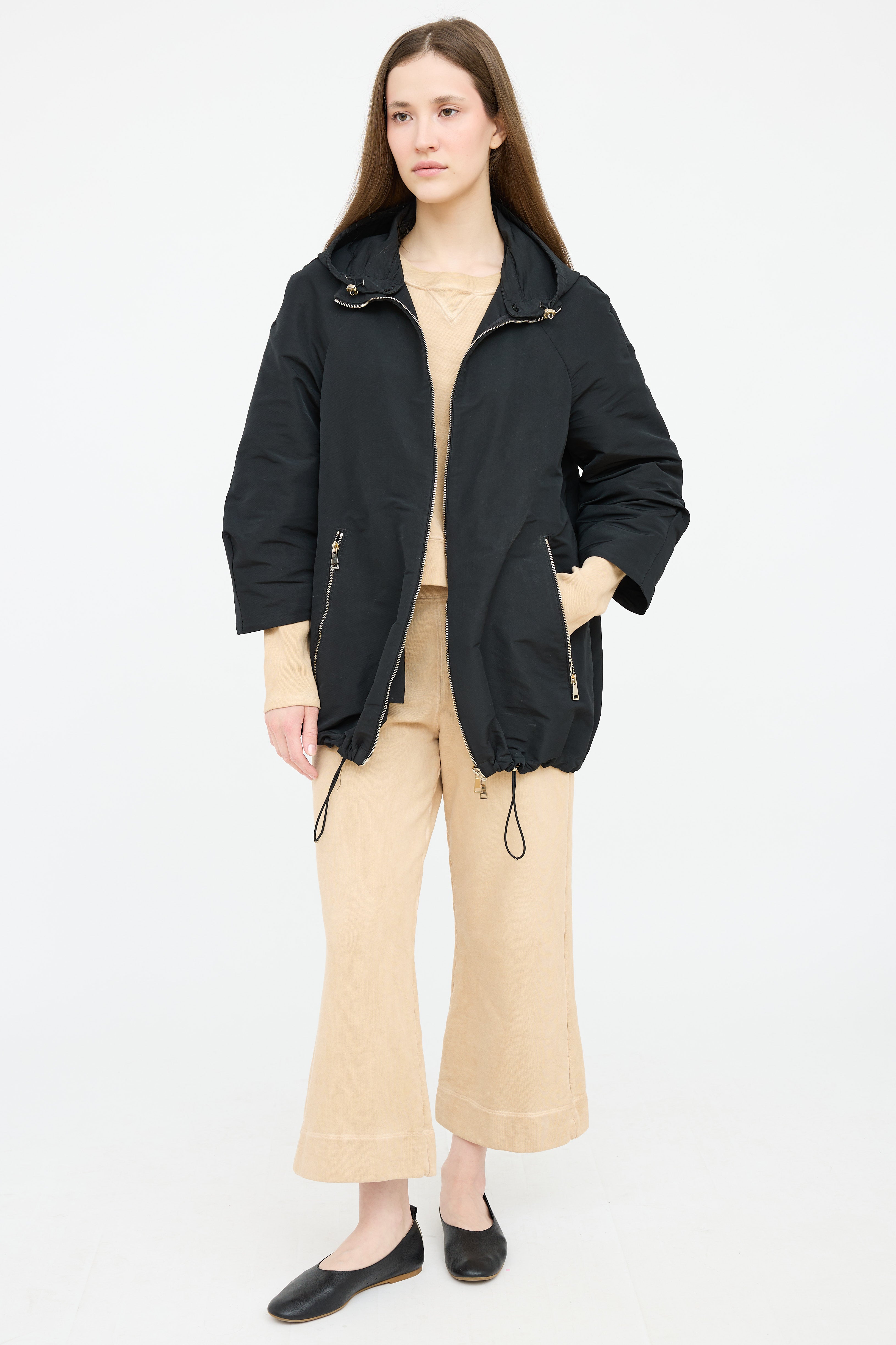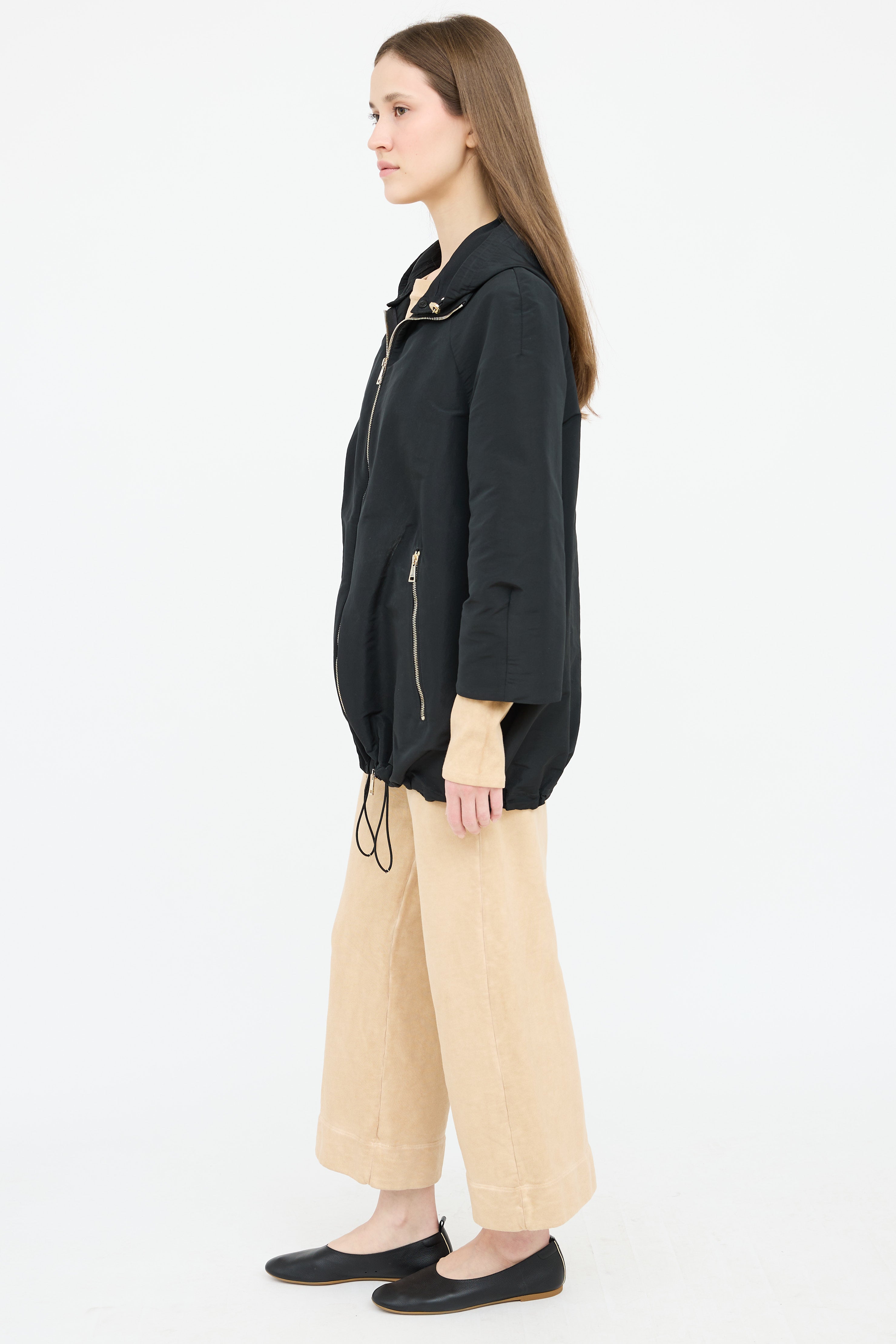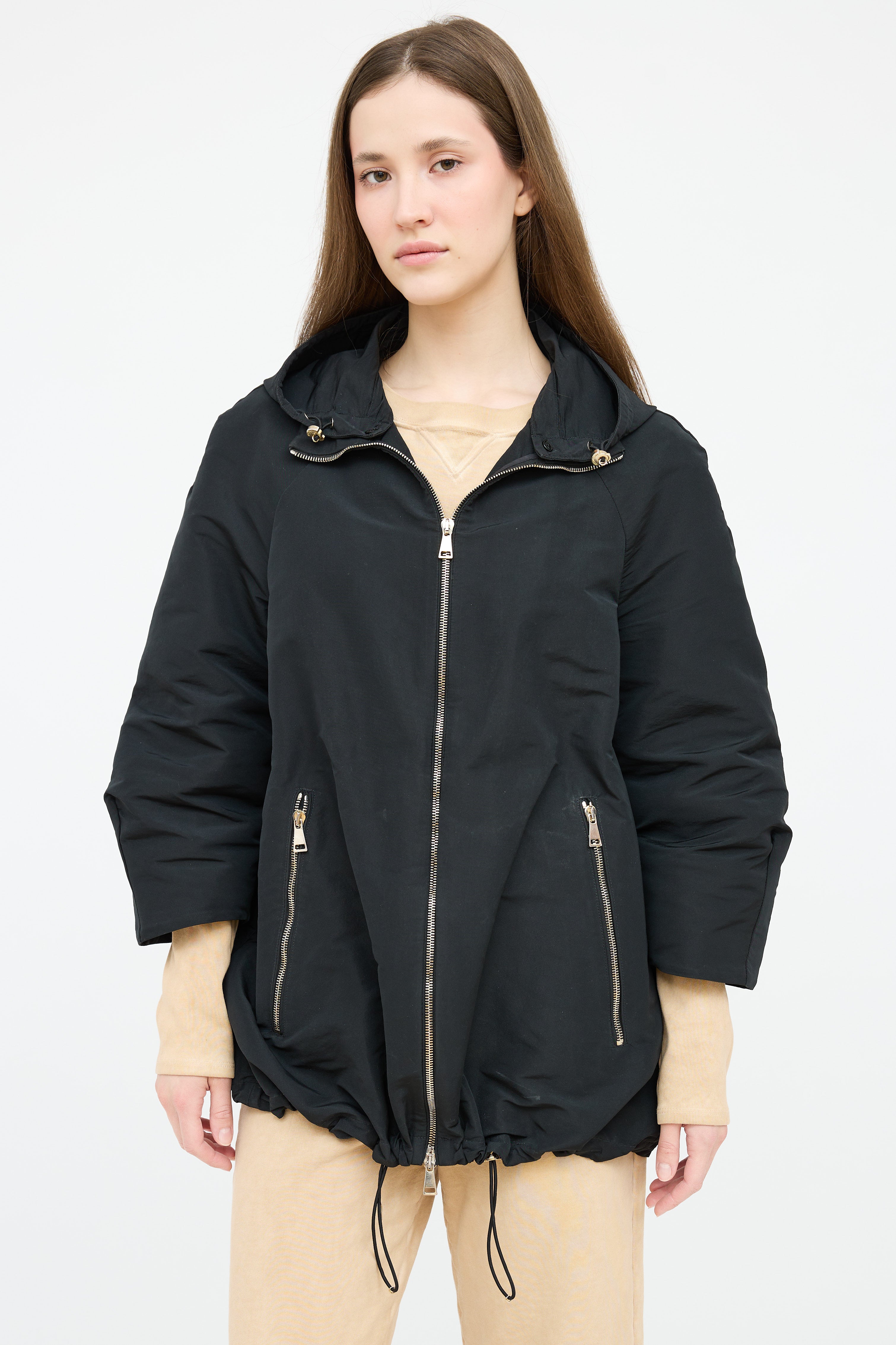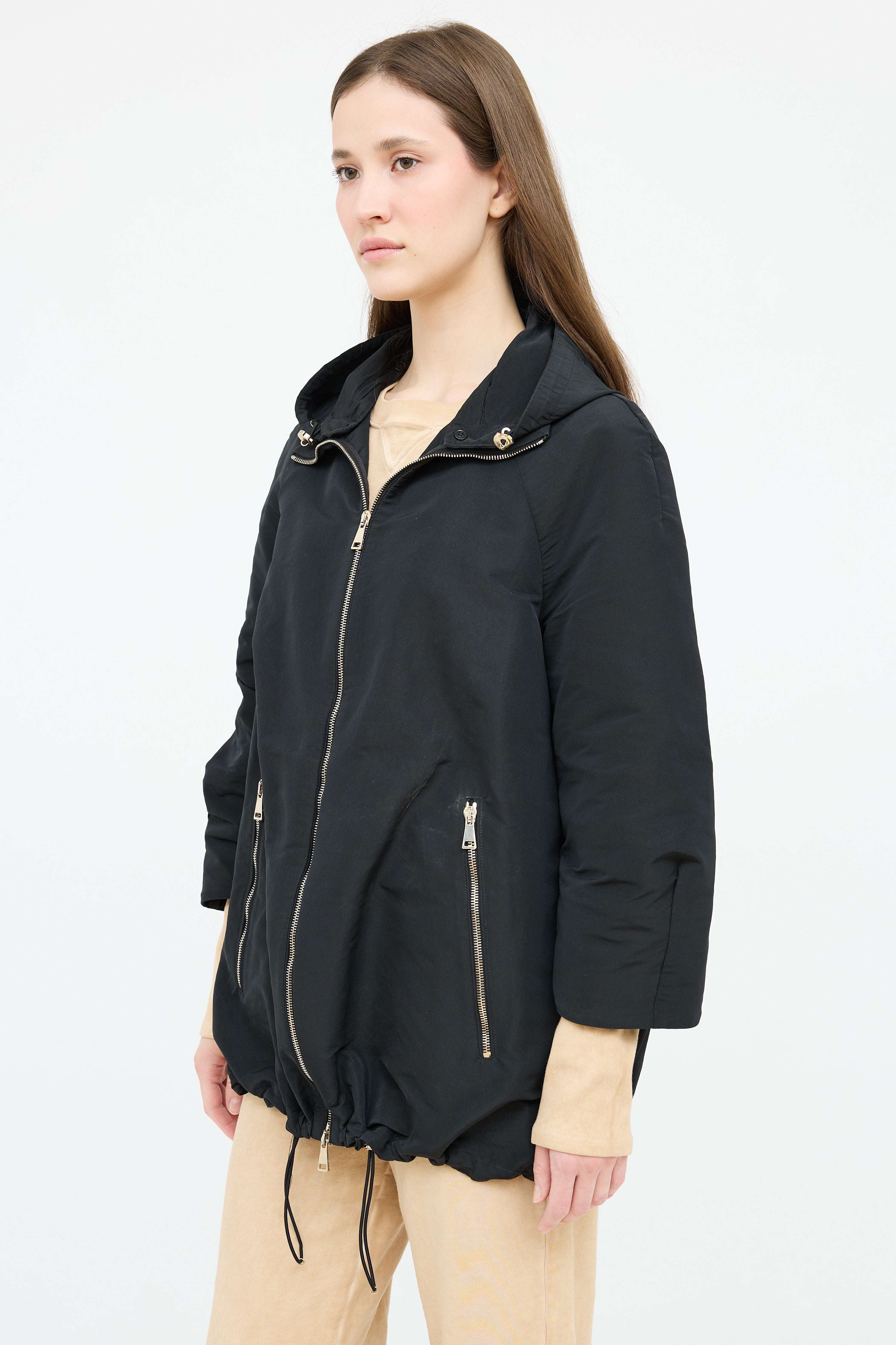 Pre-owned Moncler black Maquereau jacket featuring a removable drawstring hood, long raglan sleeves, two zip pockets at hip, drawstring hem, logo patch at hip, and zip closure.
