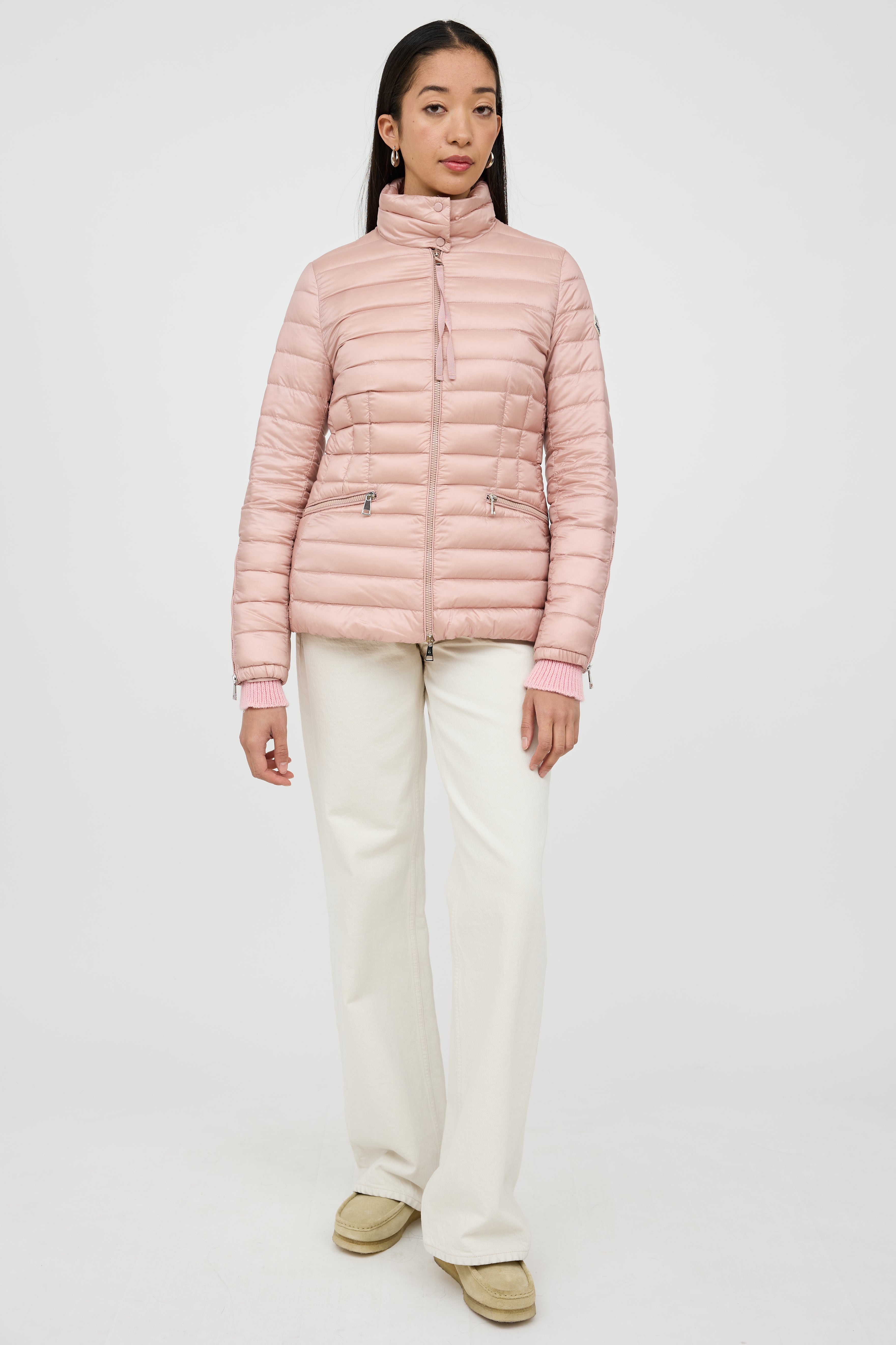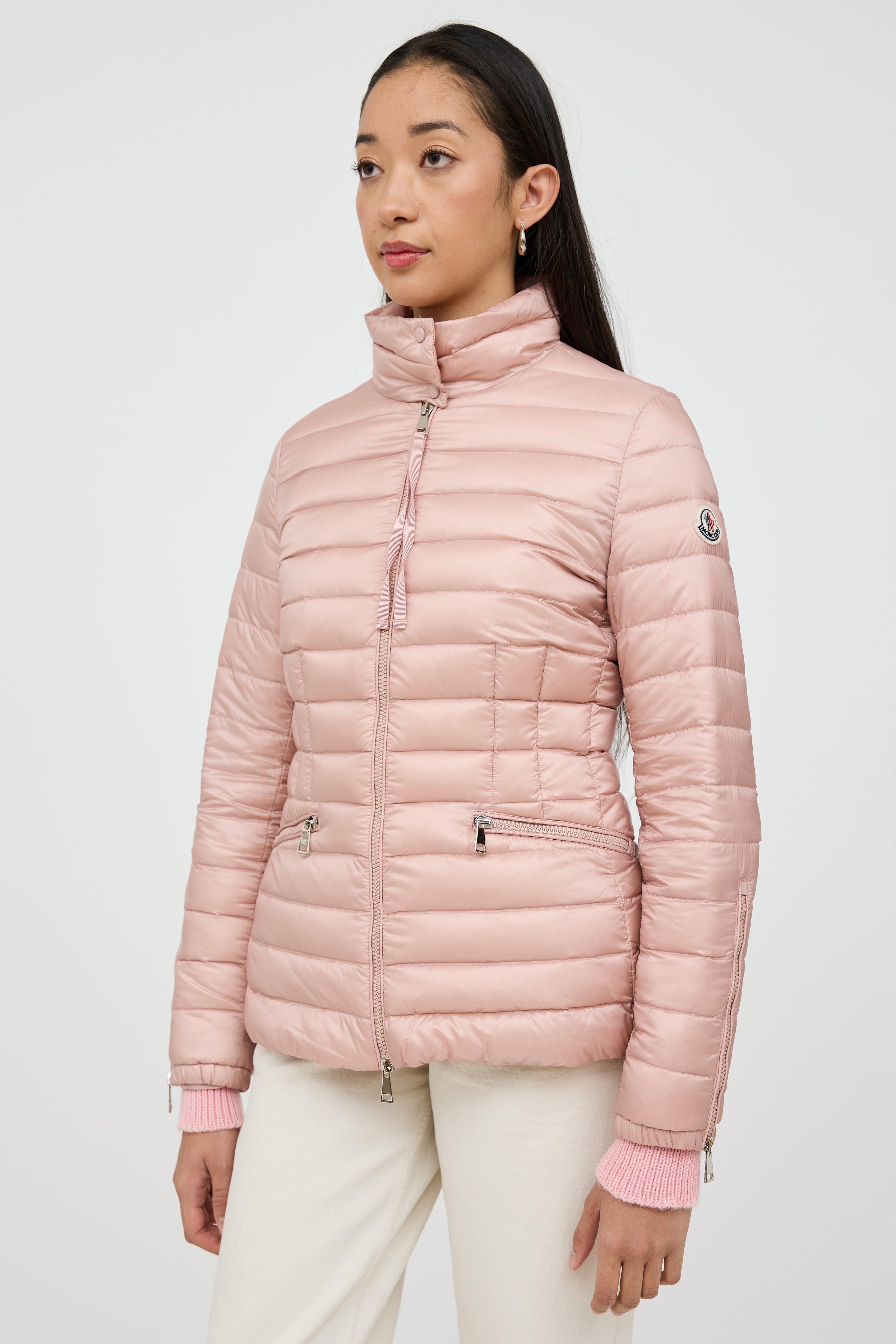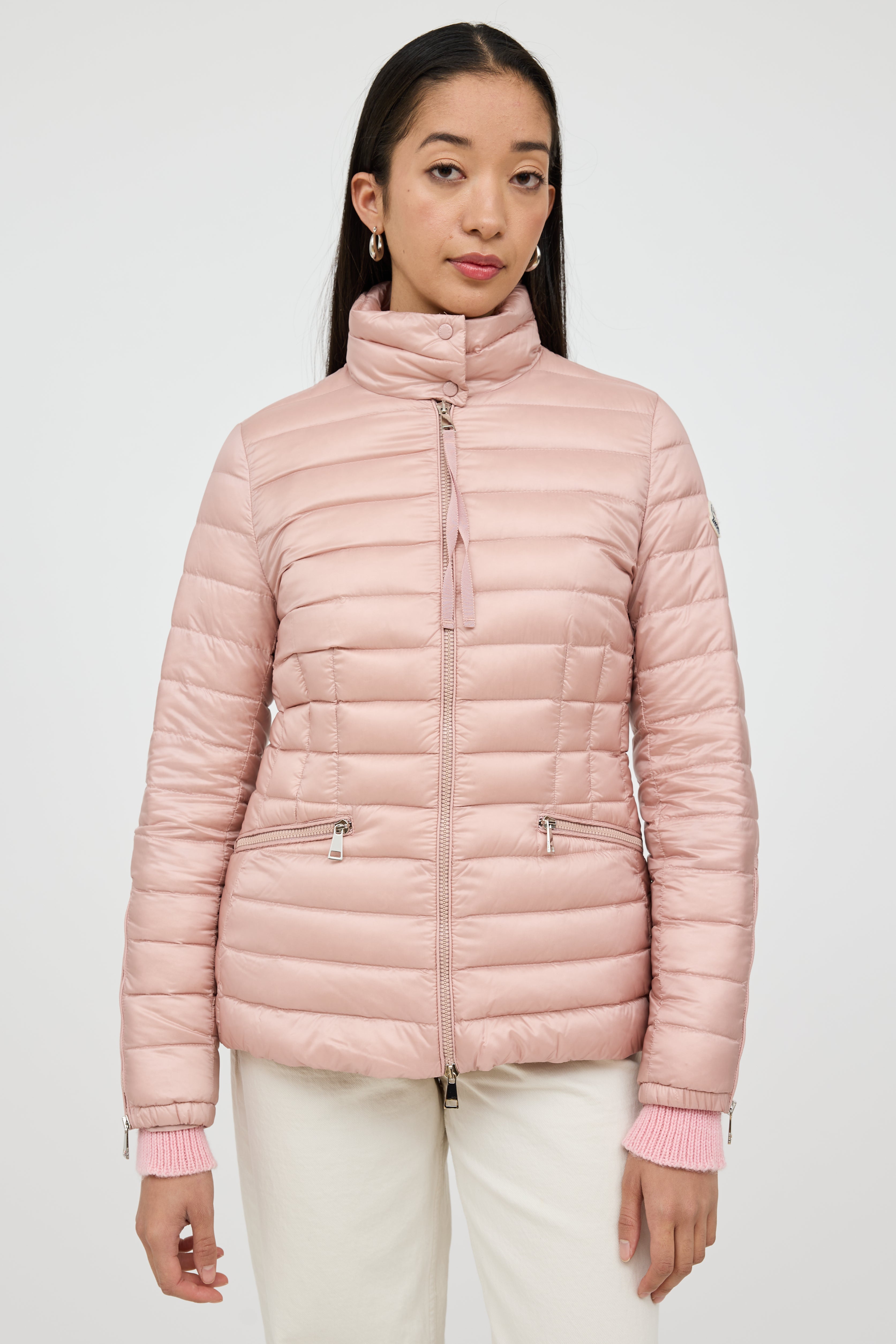 Pre-owned Moncler pink Safre down quilted jacket featuring a high neck collar, long sleeves with zipped cuffs, logo patch at shoulder, two zip pockets at hip, and zip closure. Lined.