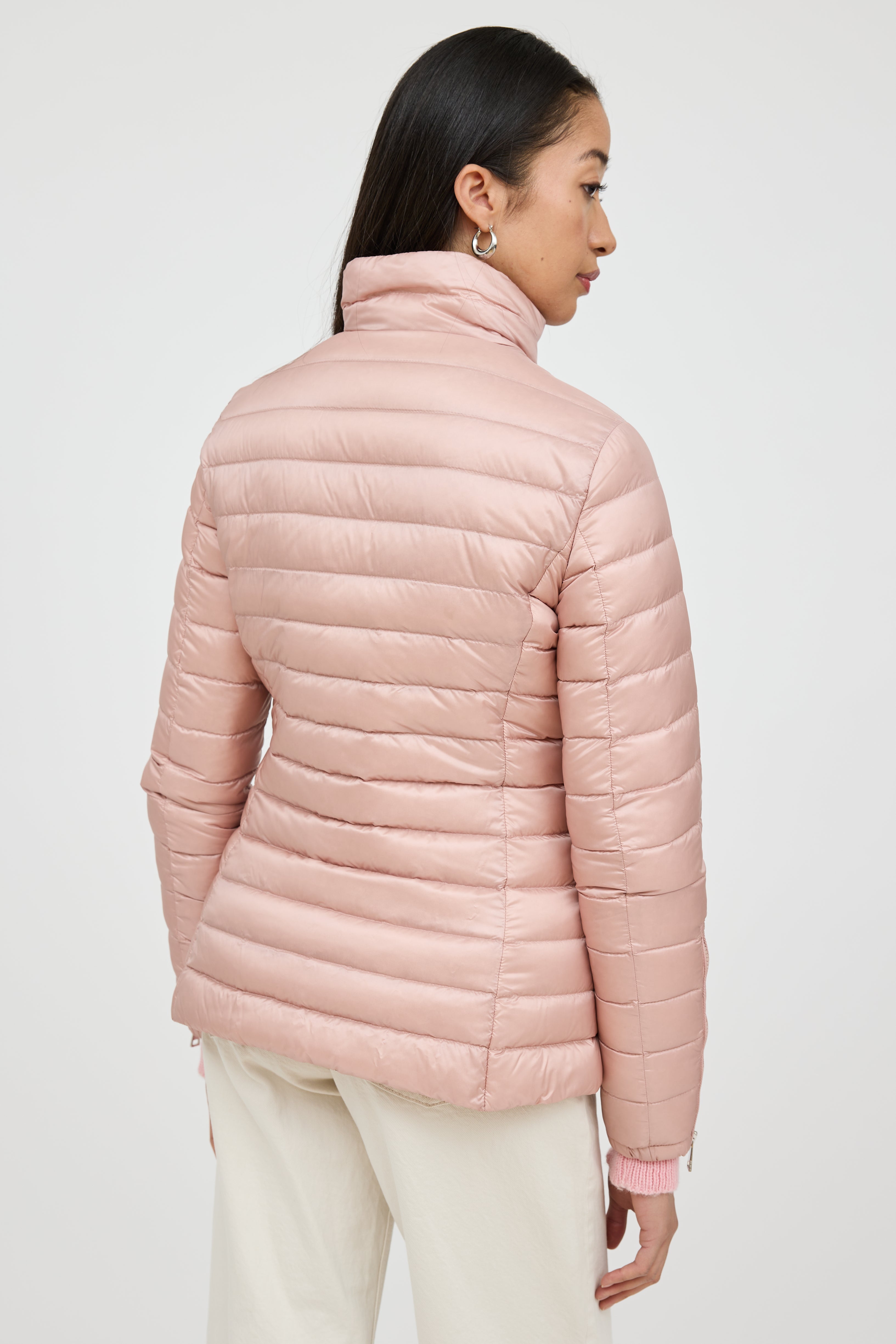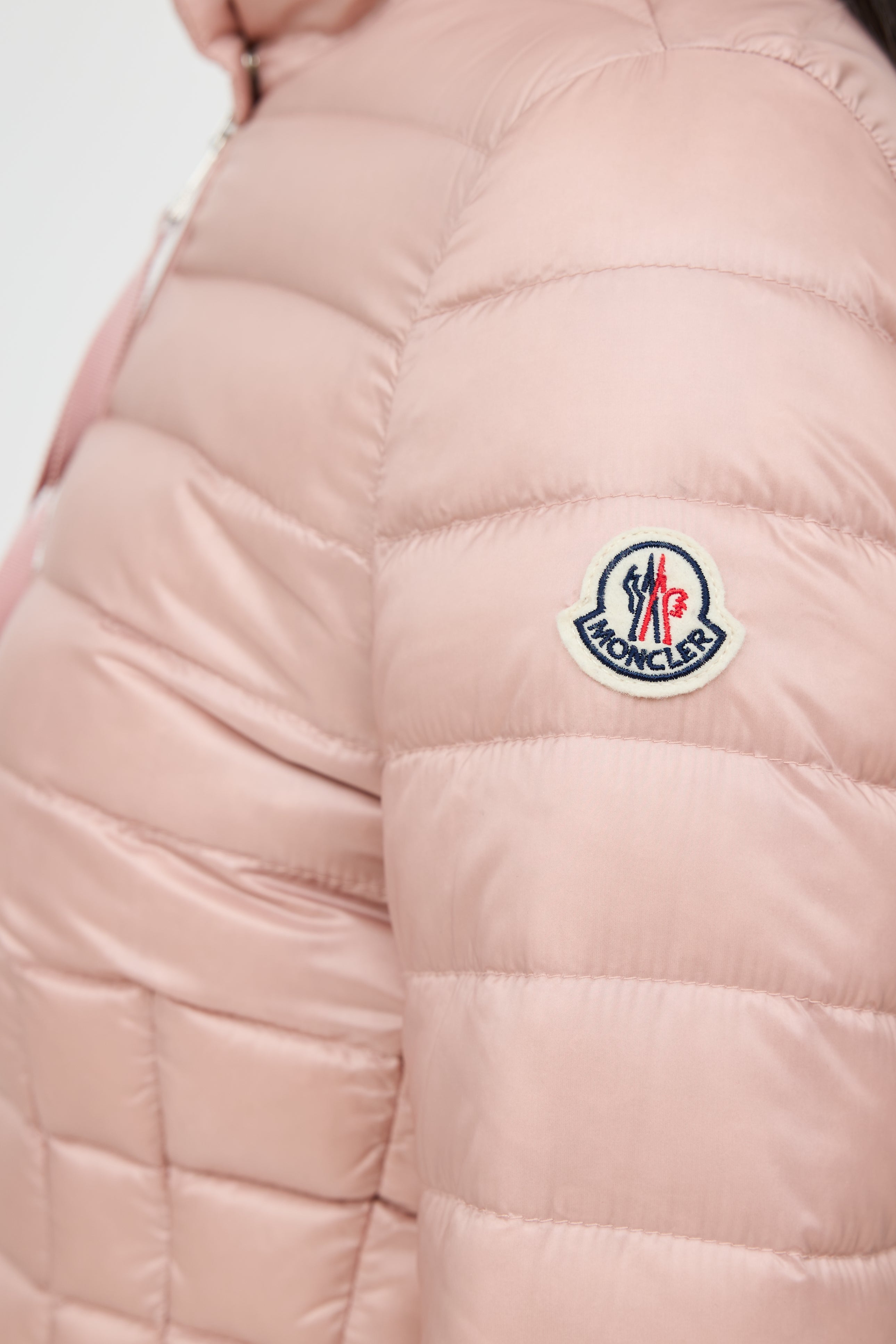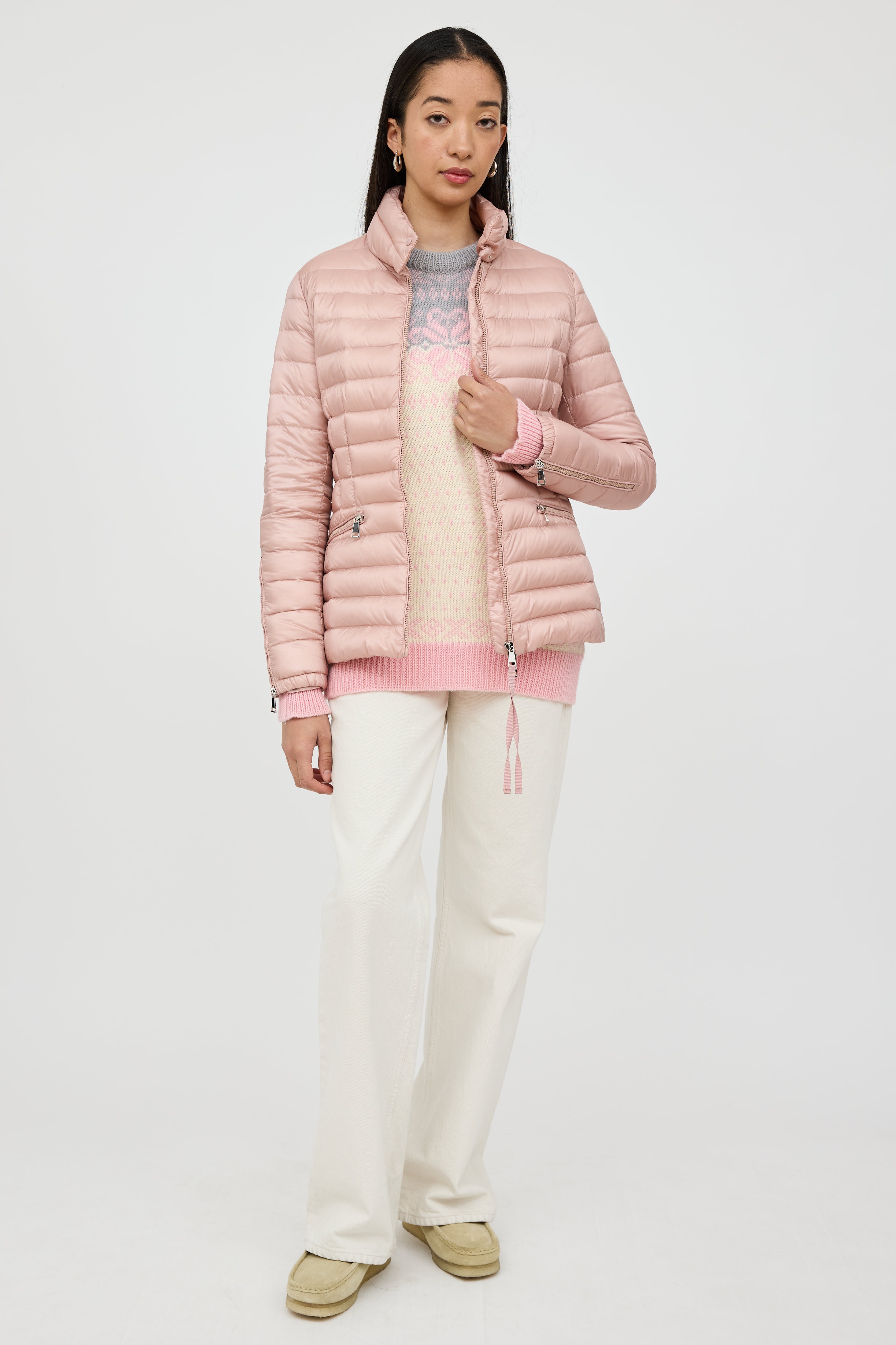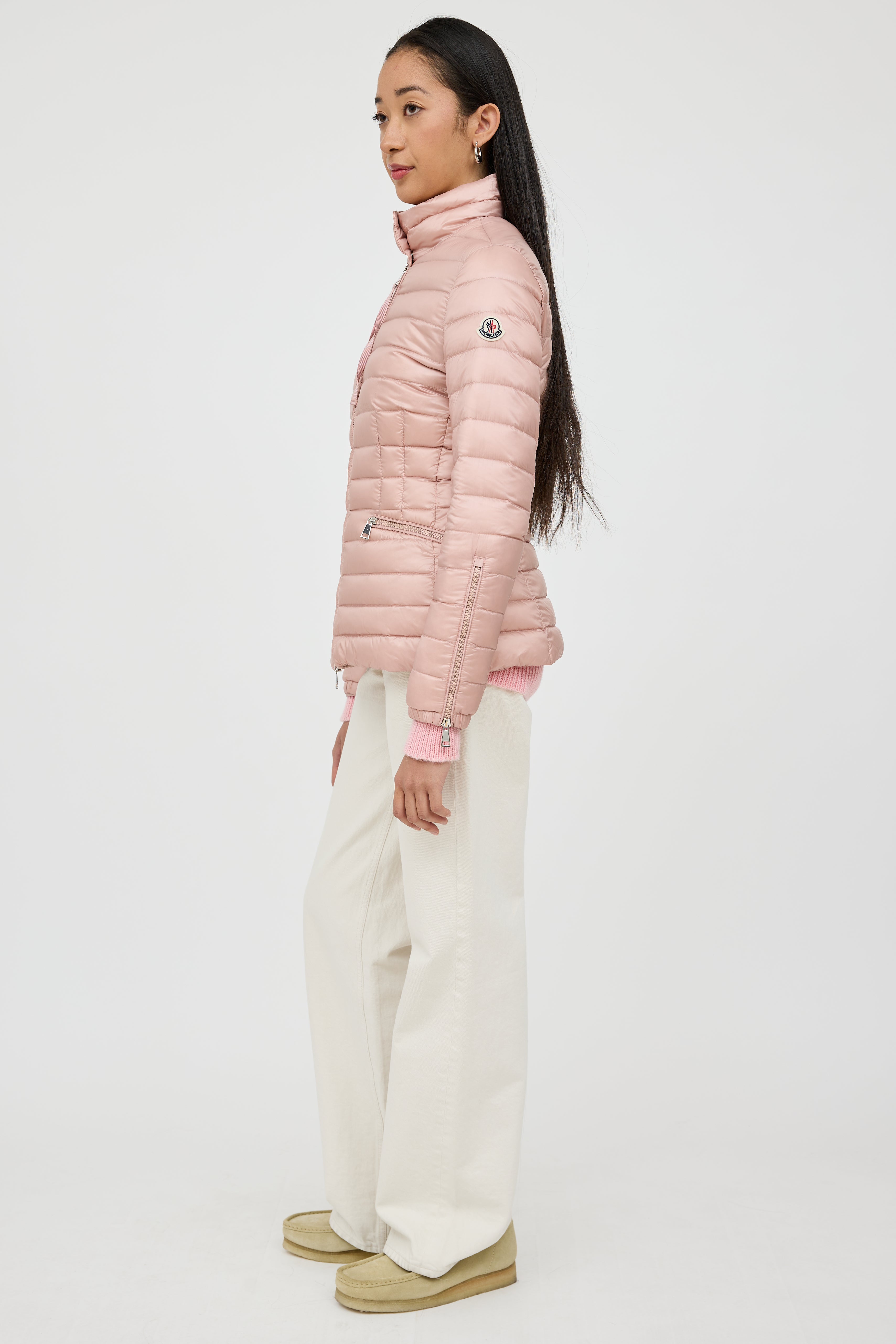 Pre-owned Moncler pink Safre down quilted jacket featuring a high neck collar, long sleeves with zipped cuffs, logo patch at shoulder, two zip pockets at hip, and zip closure. Lined.