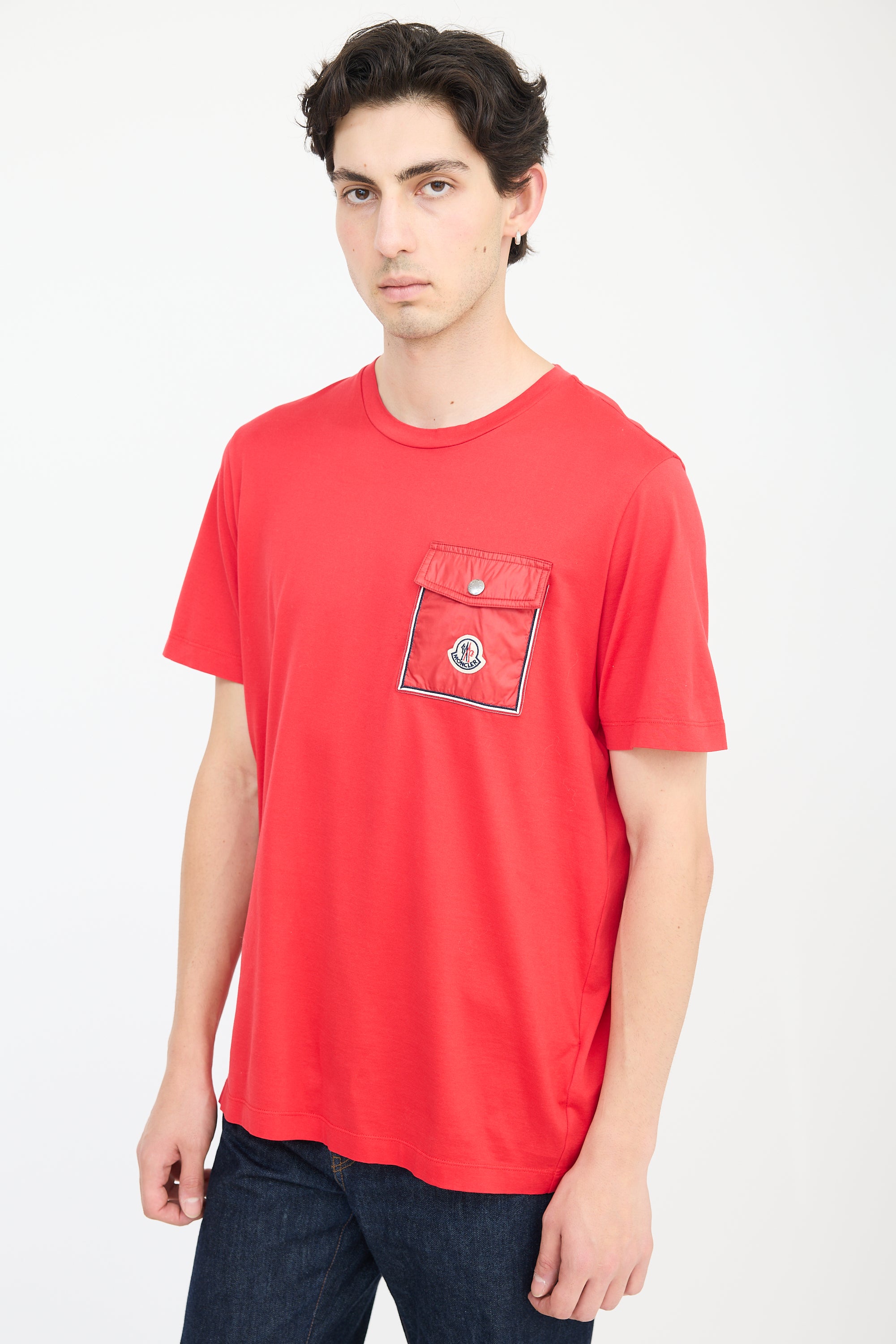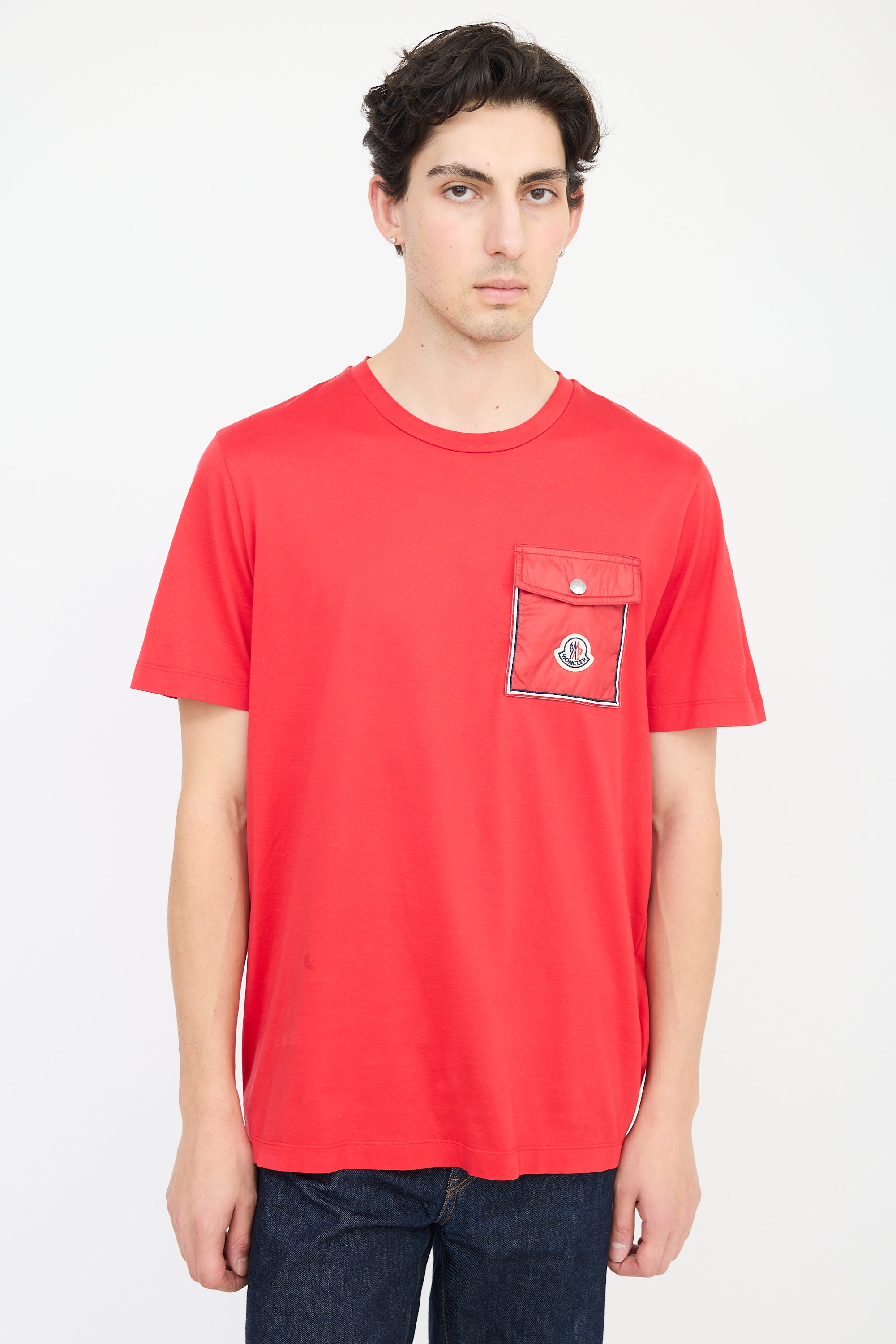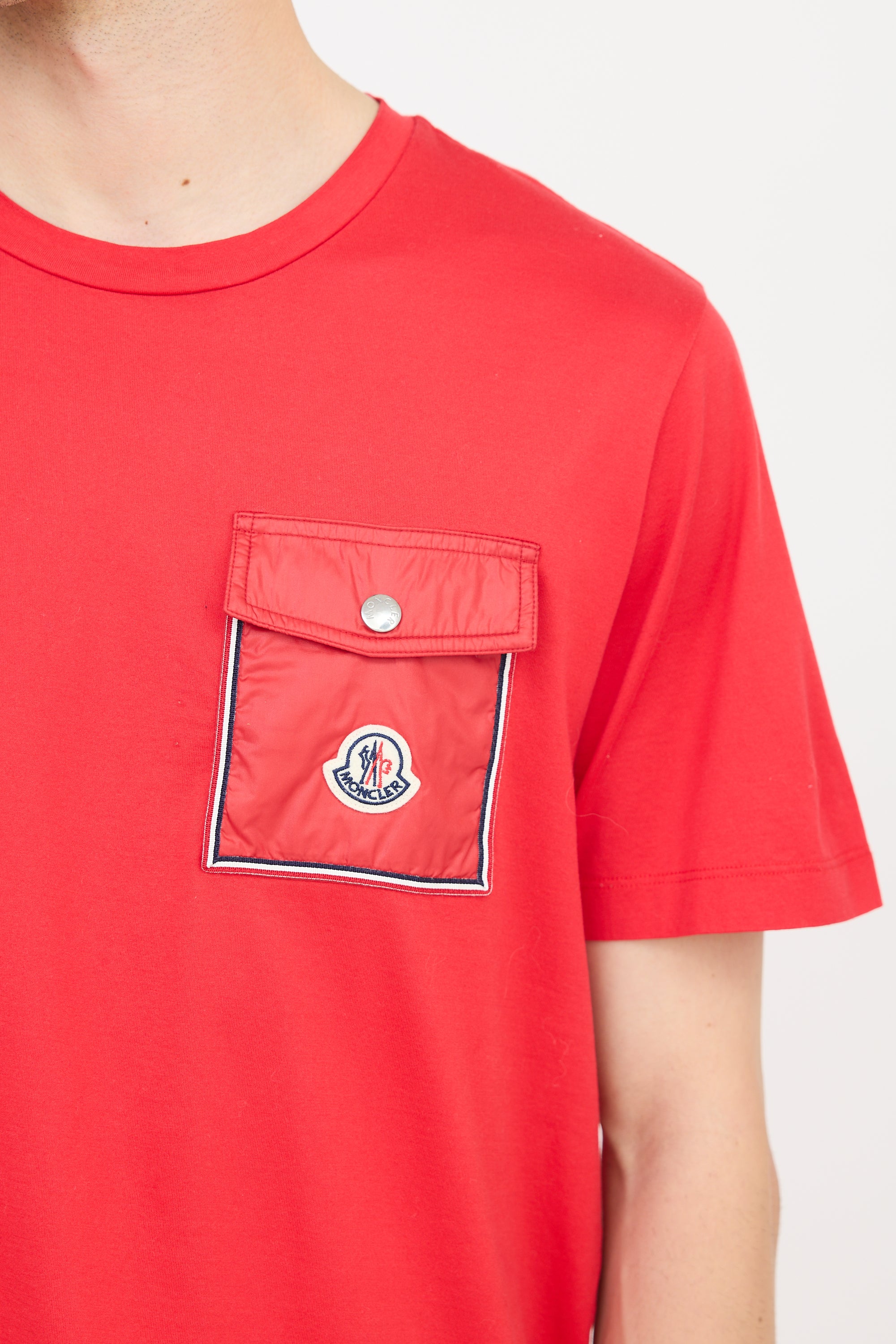 Pre-owned Moncler red T-shirt featuring a crew neckline, short sleeves, and nylon flap pocket at chest with logo patch.