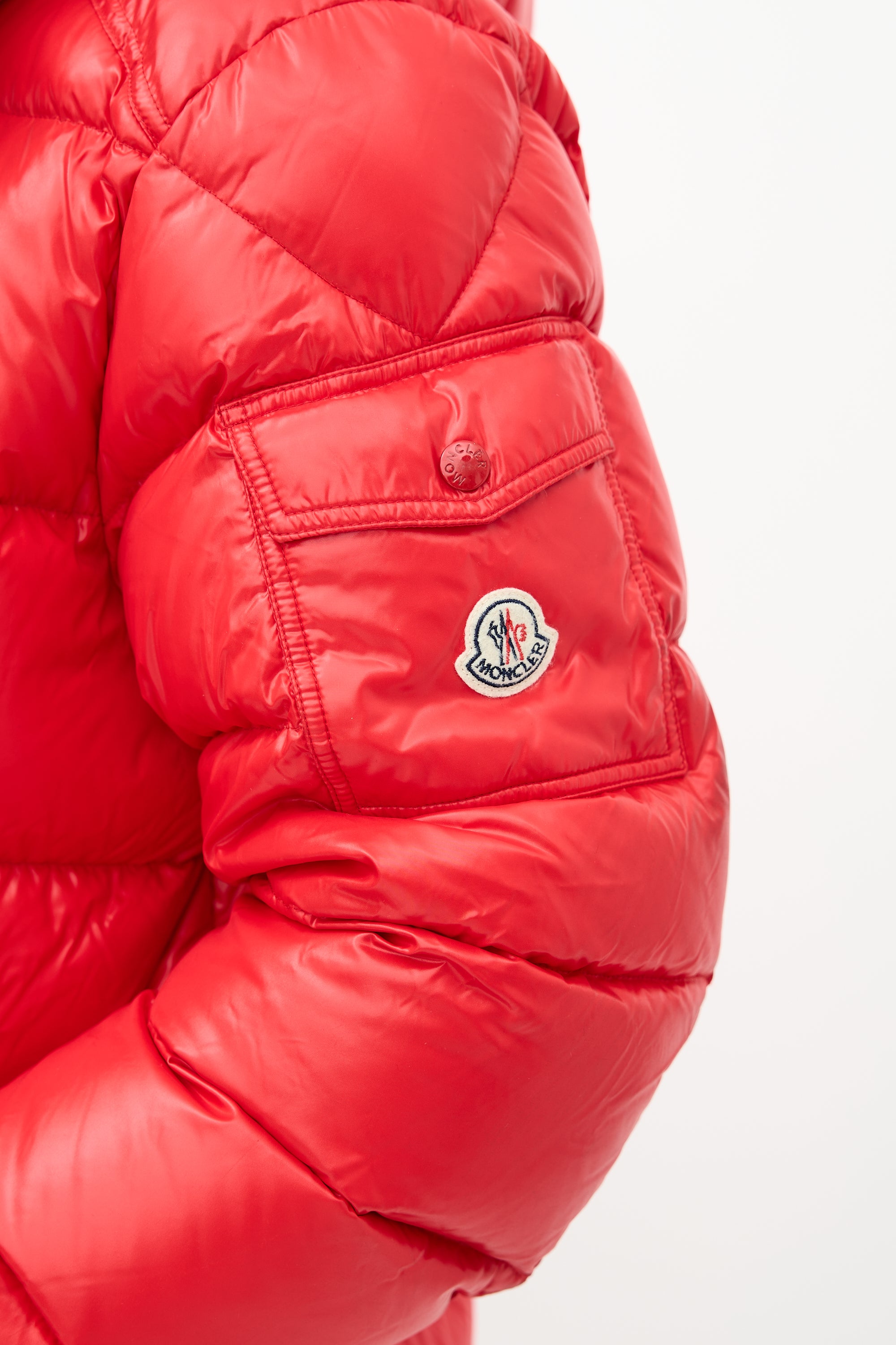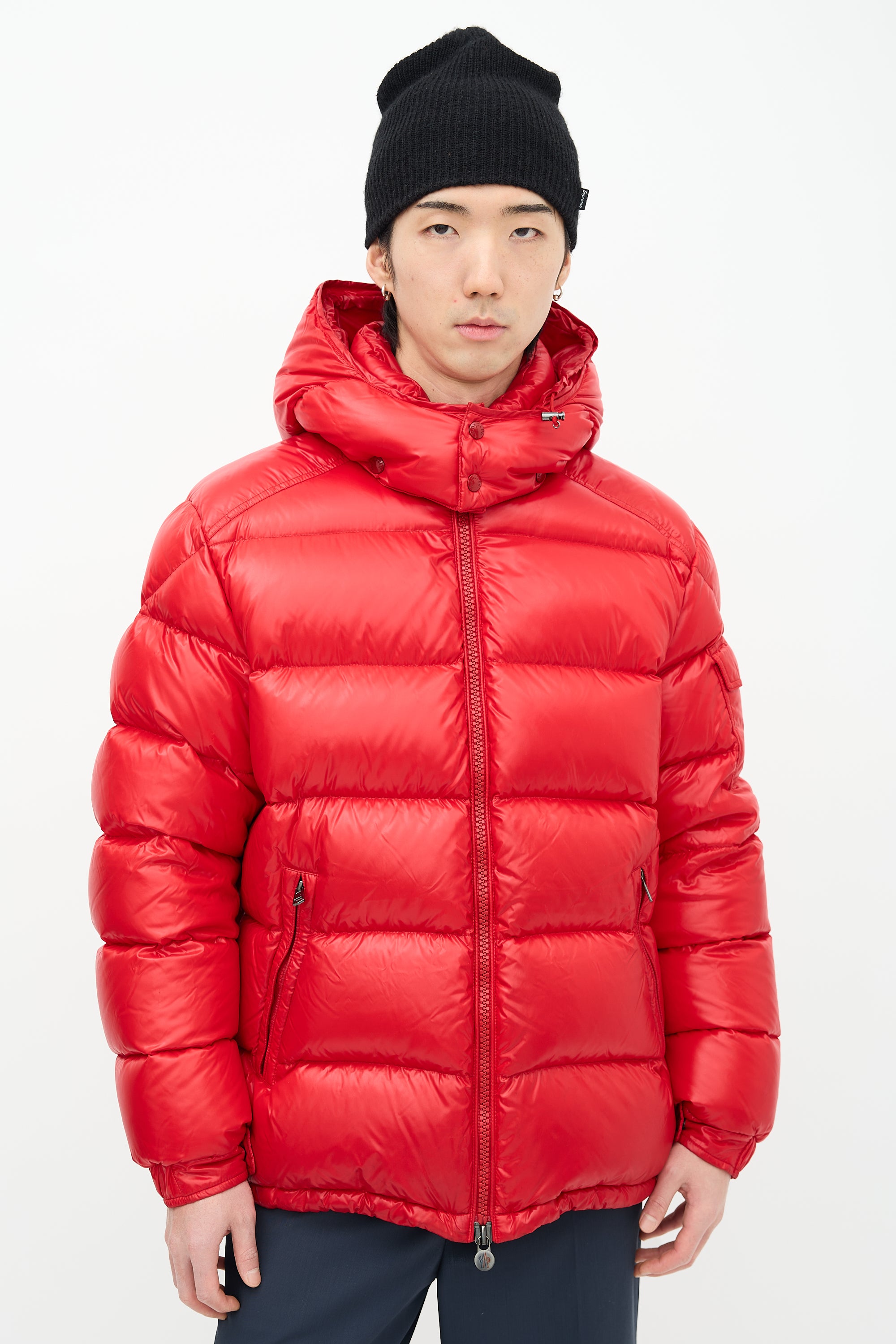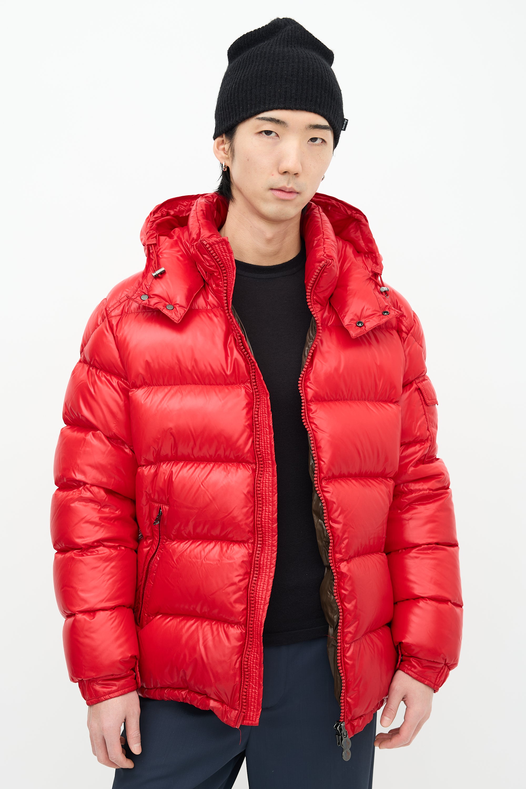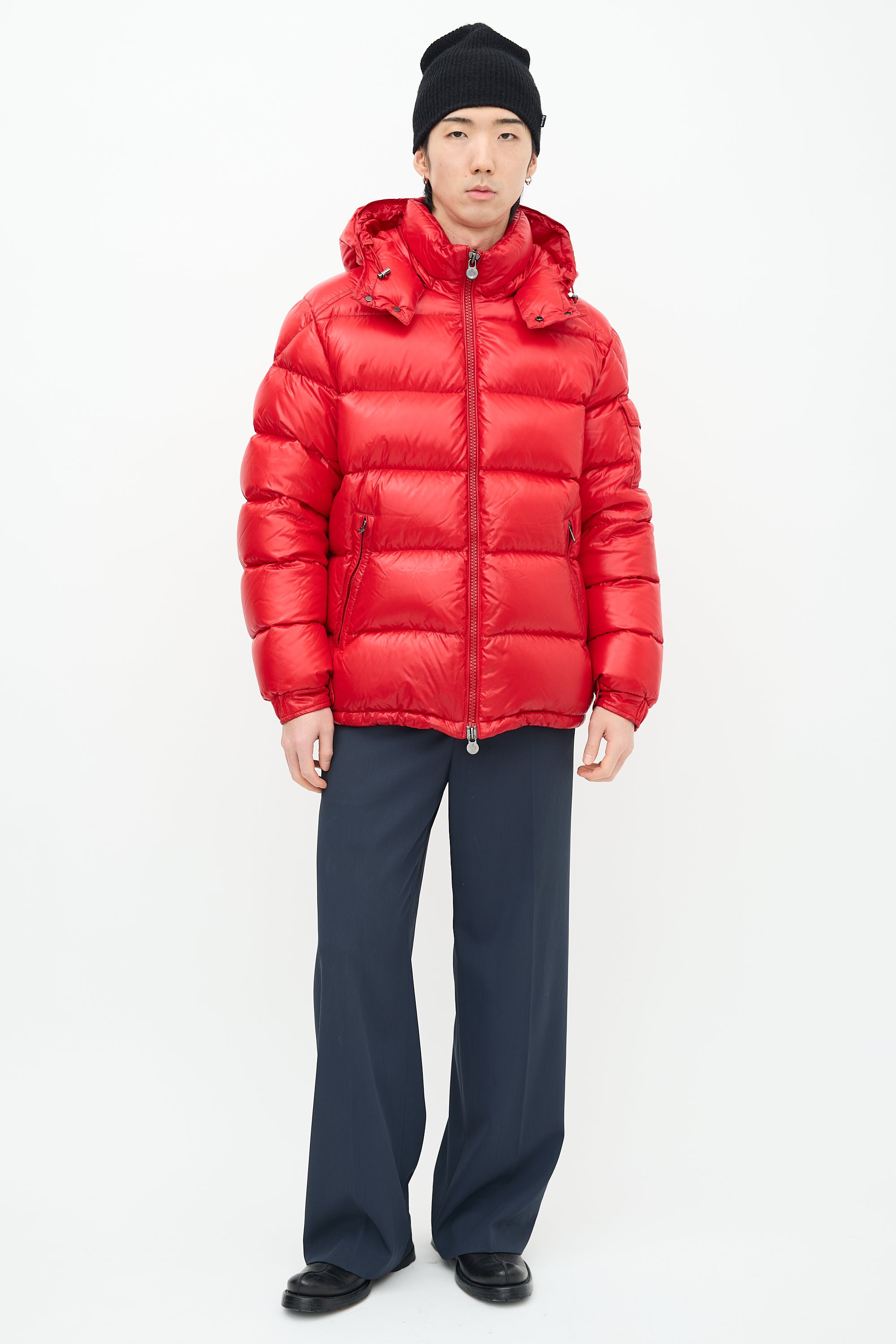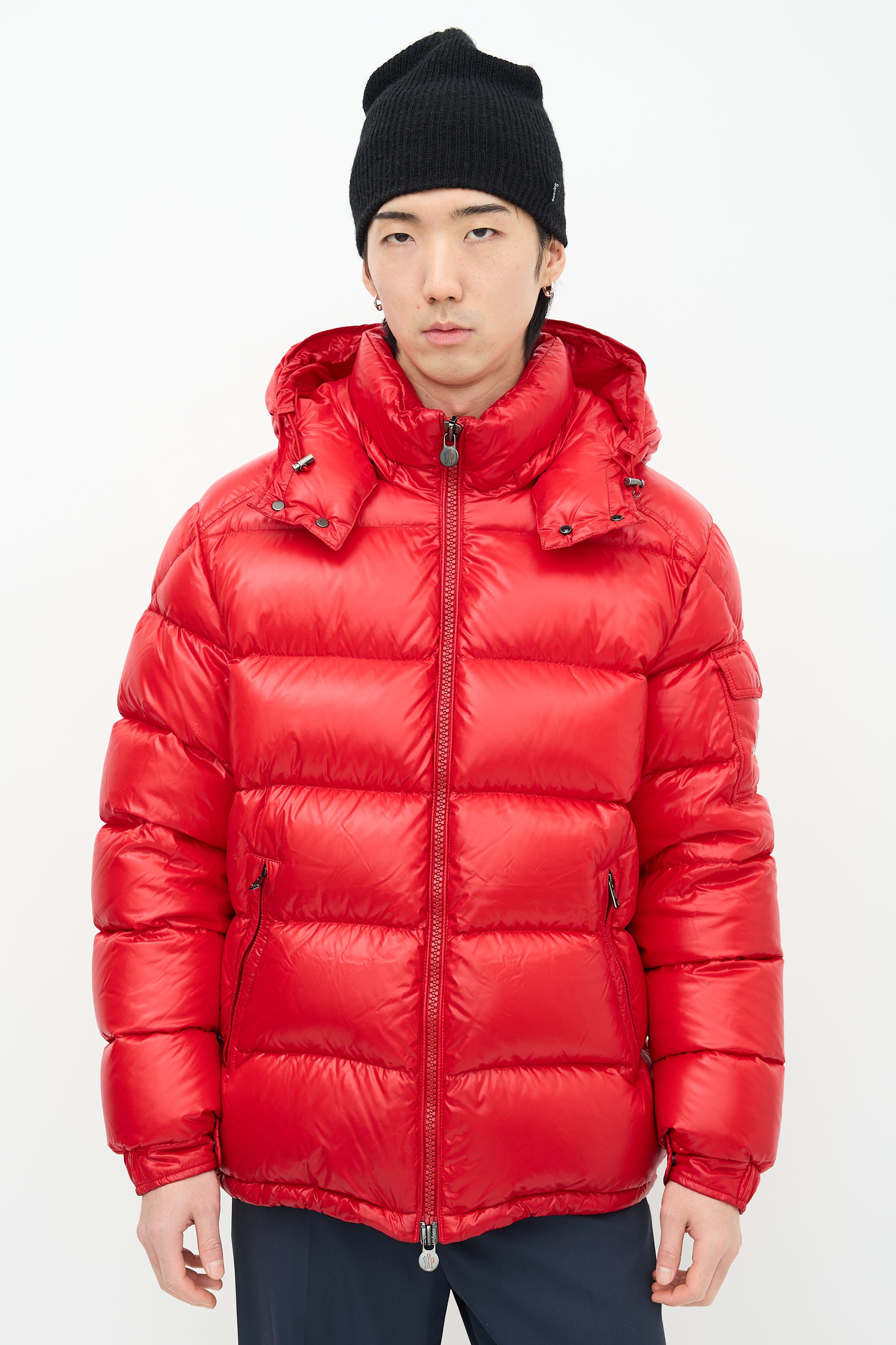Pre-owned Moncler red quilted nylon Maya Down jacket featuring funnel collar with detachable drawstring hood, zip up front, snap buttoned pocket with embroidered logo patch at arm, two zip pockets at waist, and elasticized snap buttoned cuffs. Lined.