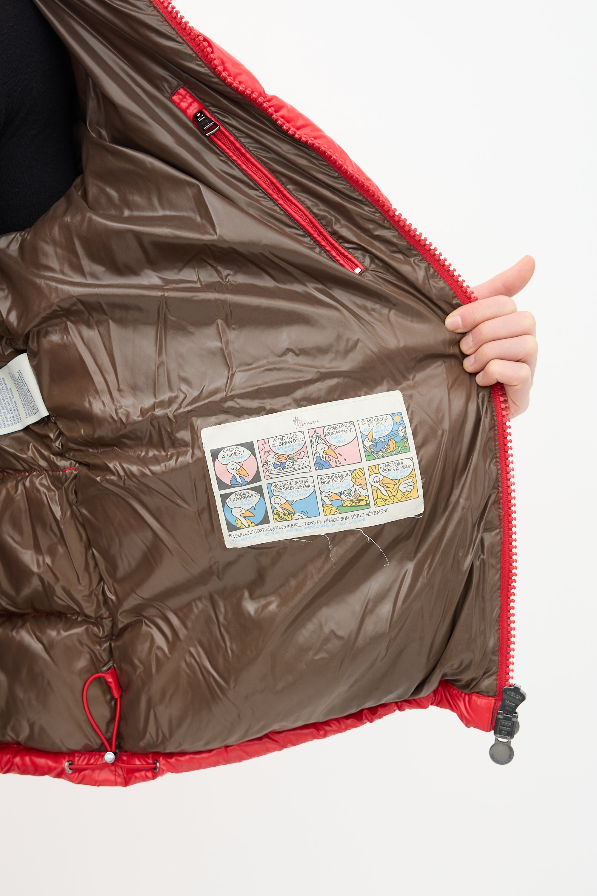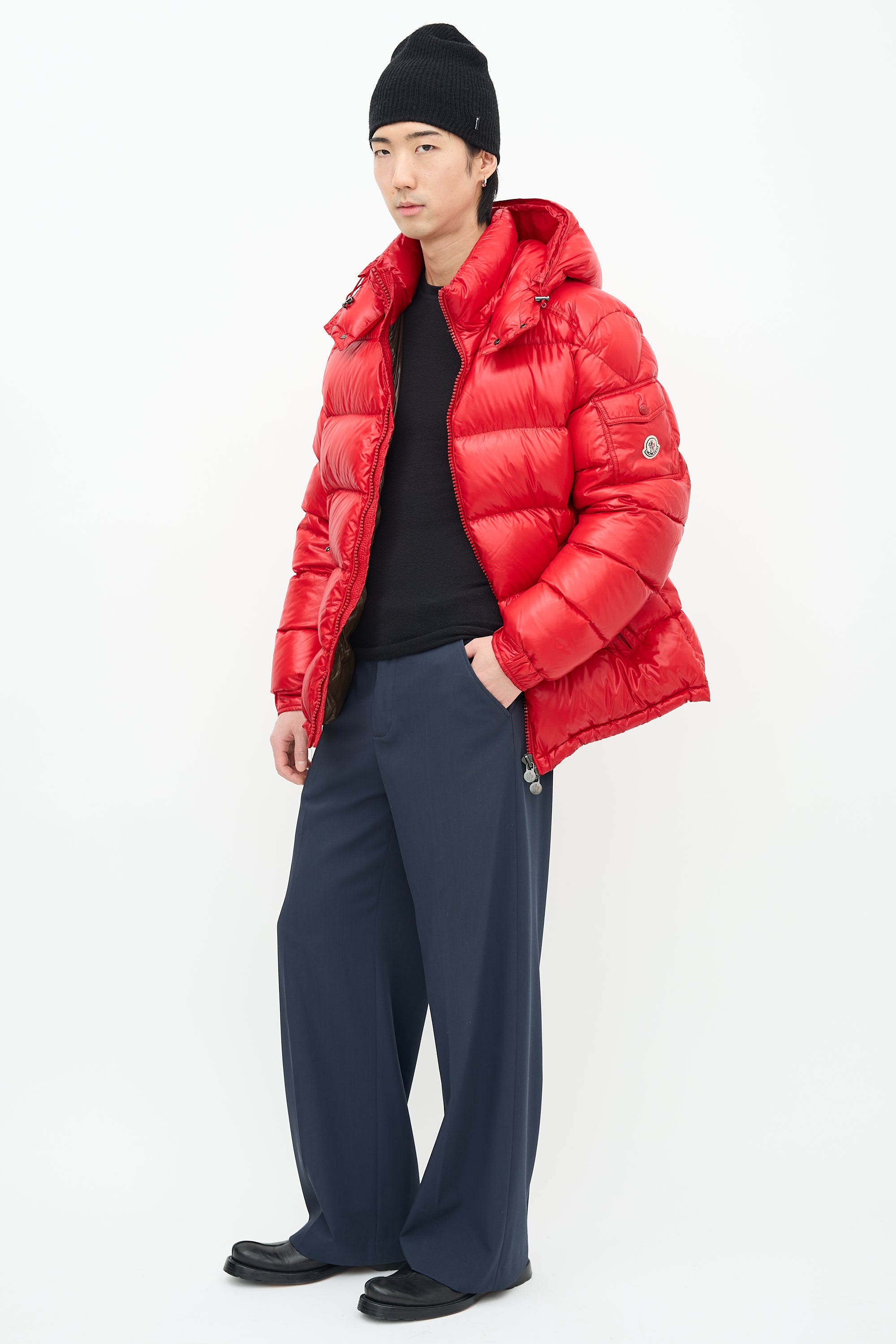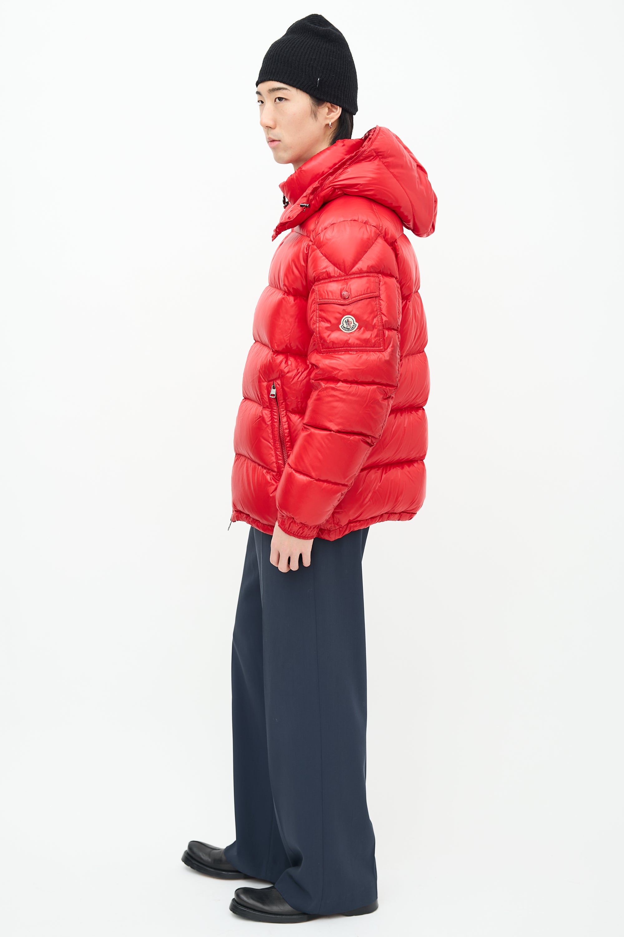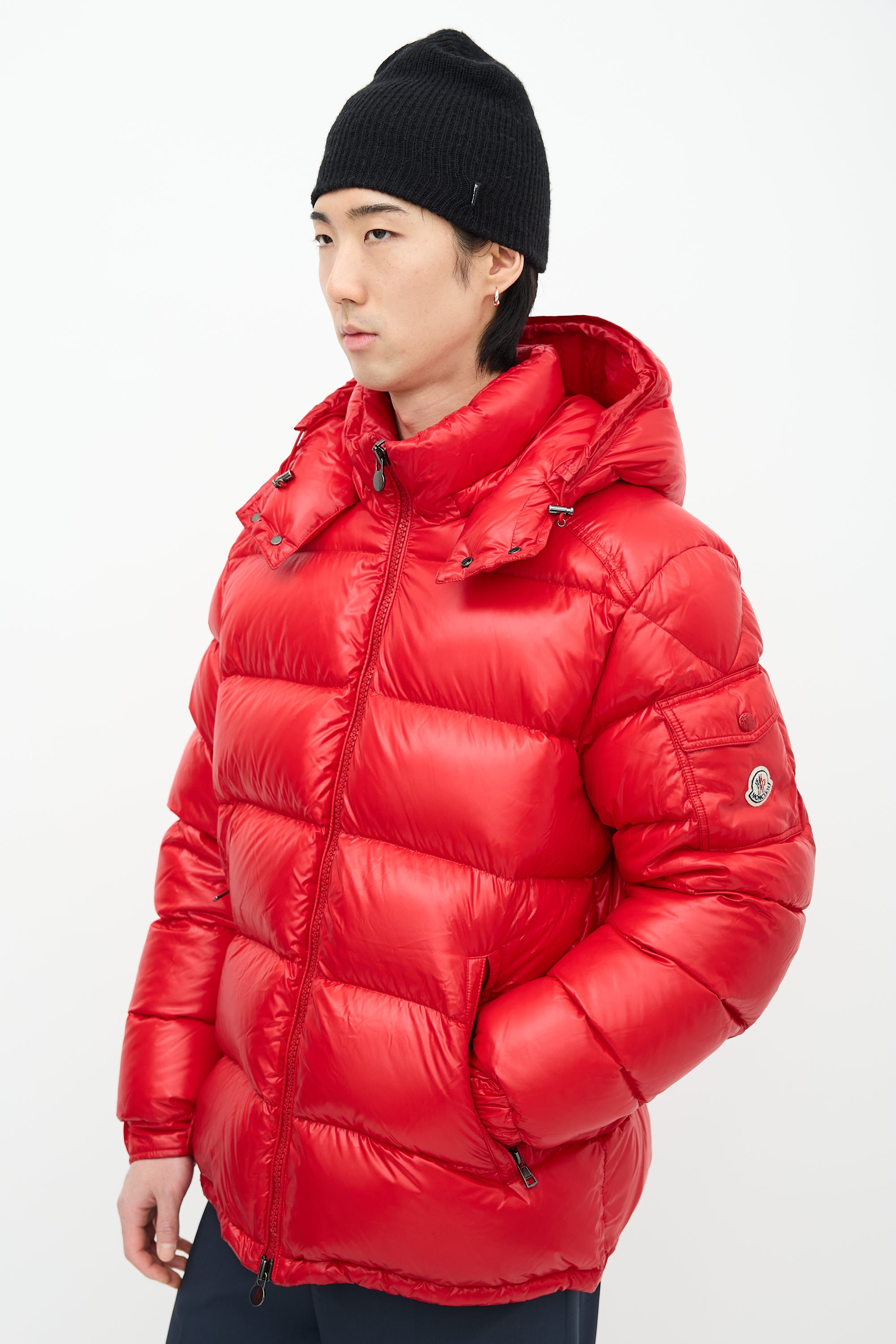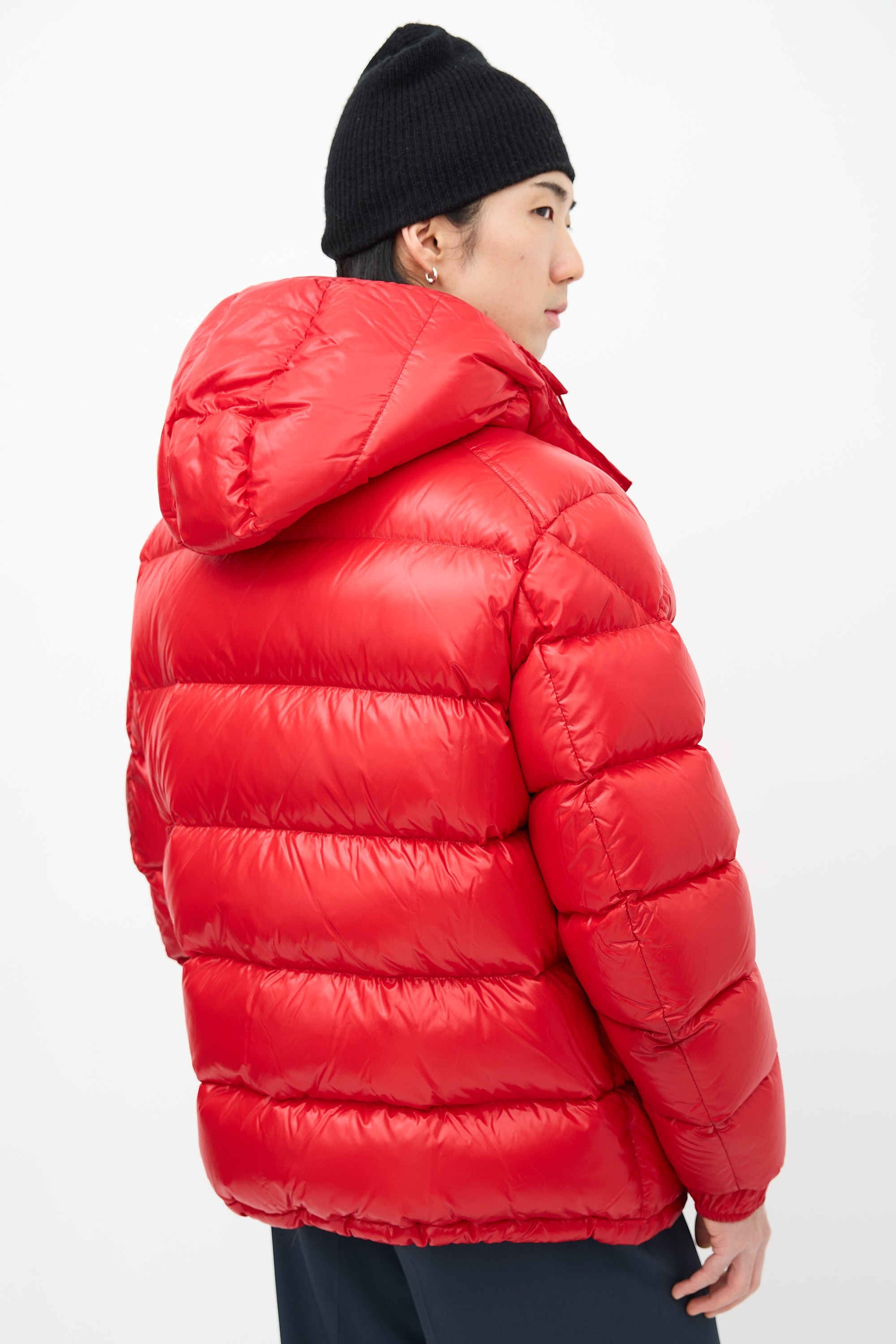 Pre-owned Moncler red quilted nylon Maya Down jacket featuring funnel collar with detachable drawstring hood, zip up front, snap buttoned pocket with embroidered logo patch at arm, two zip pockets at waist, and elasticized snap buttoned cuffs. Lined.