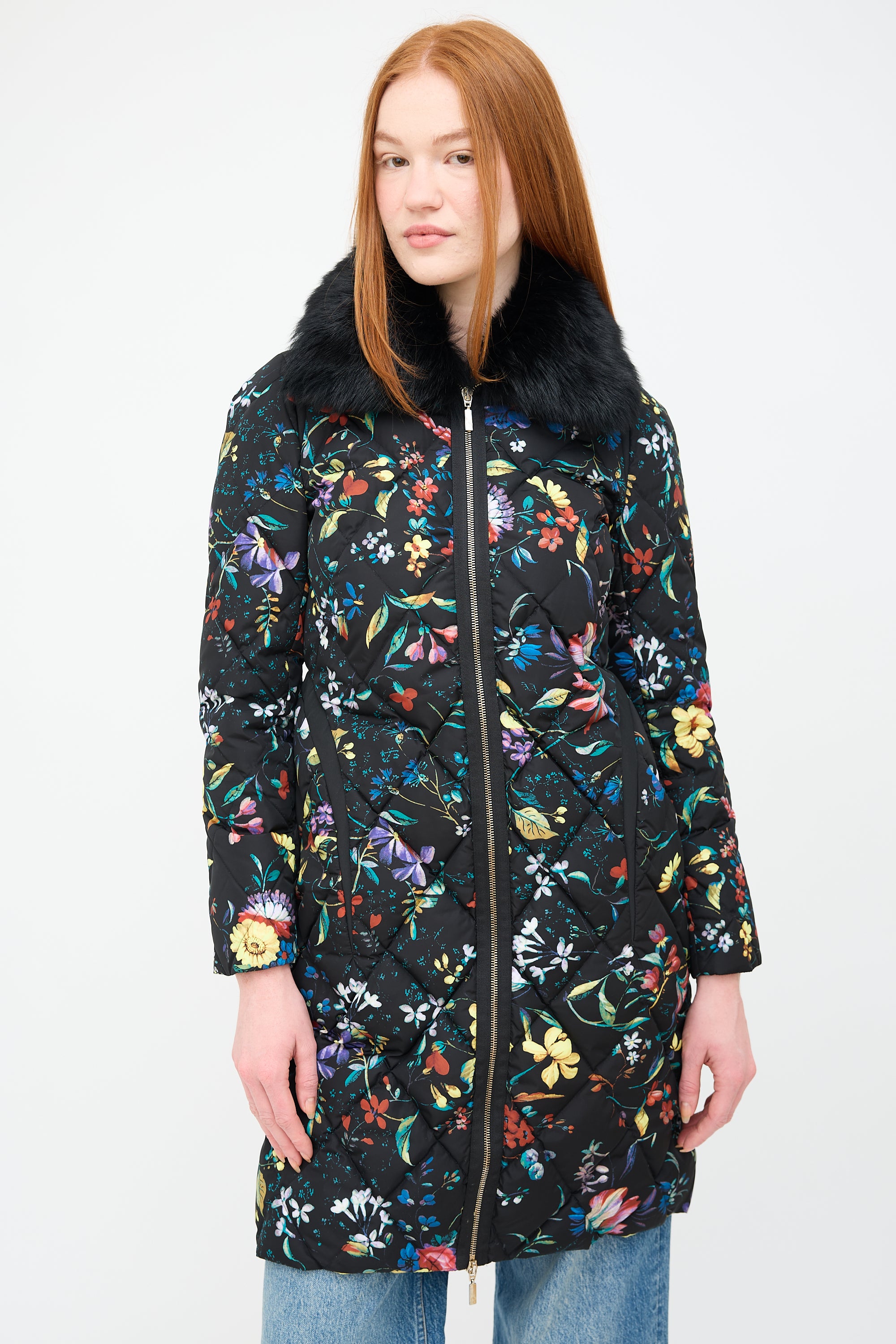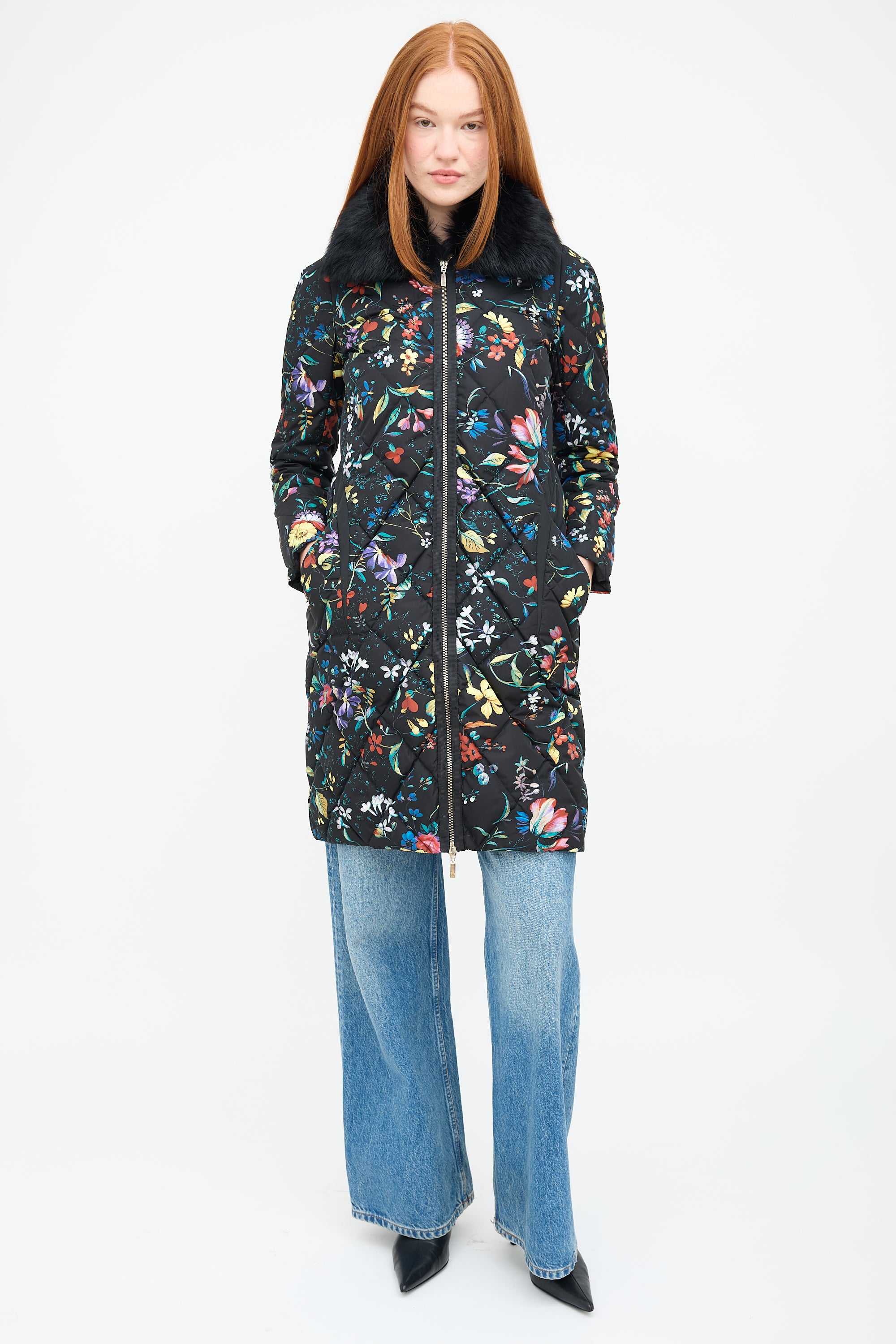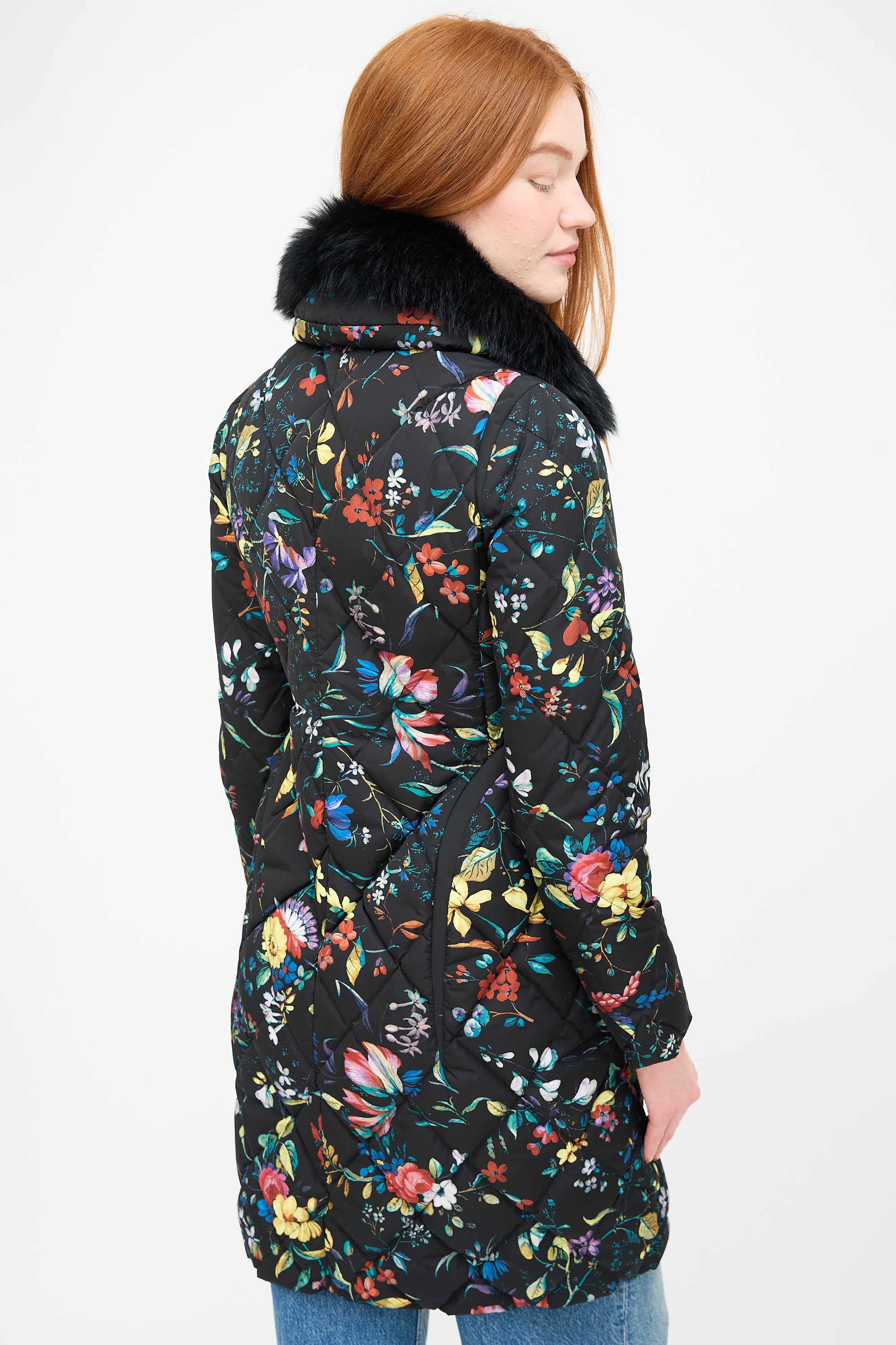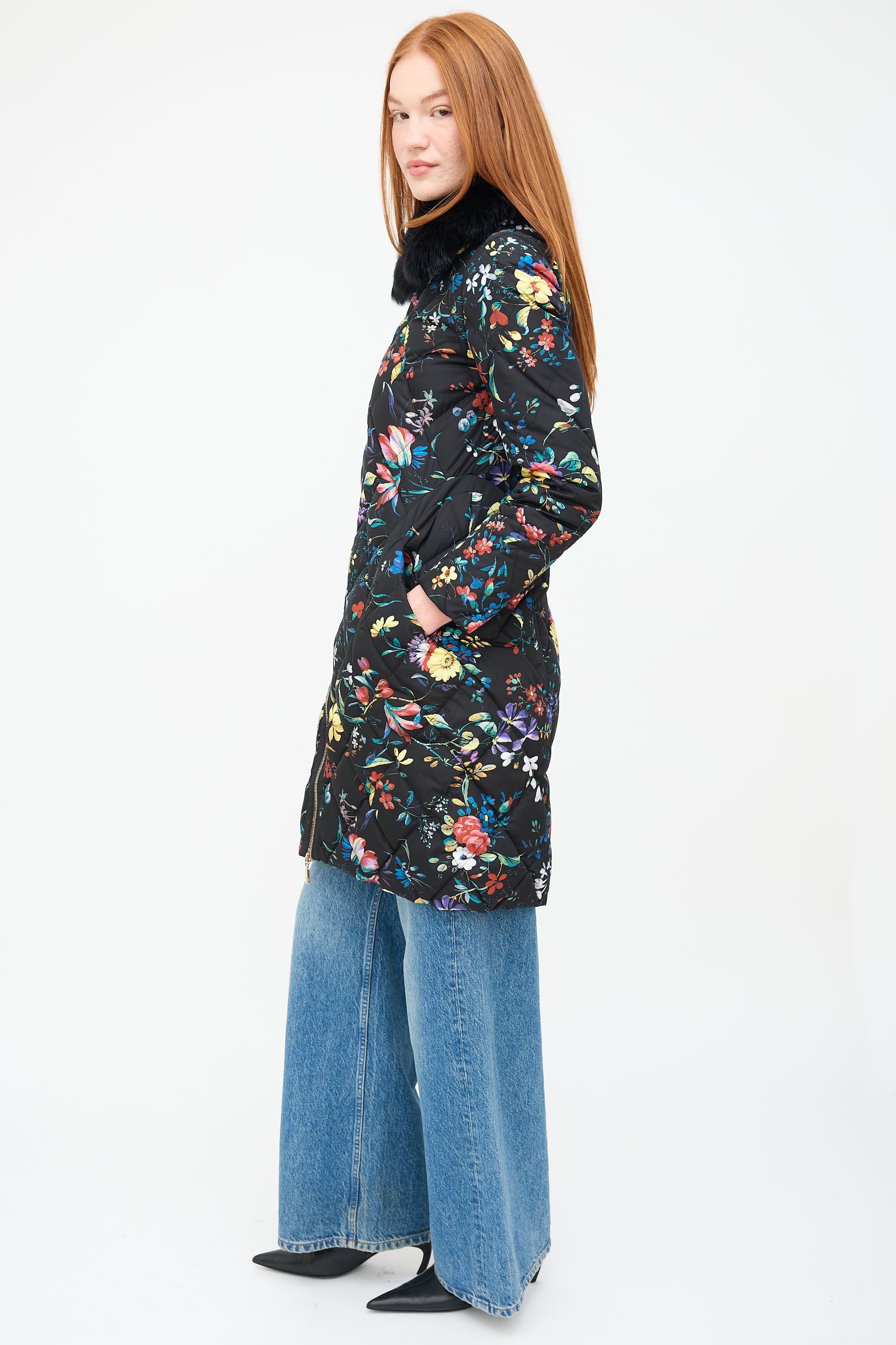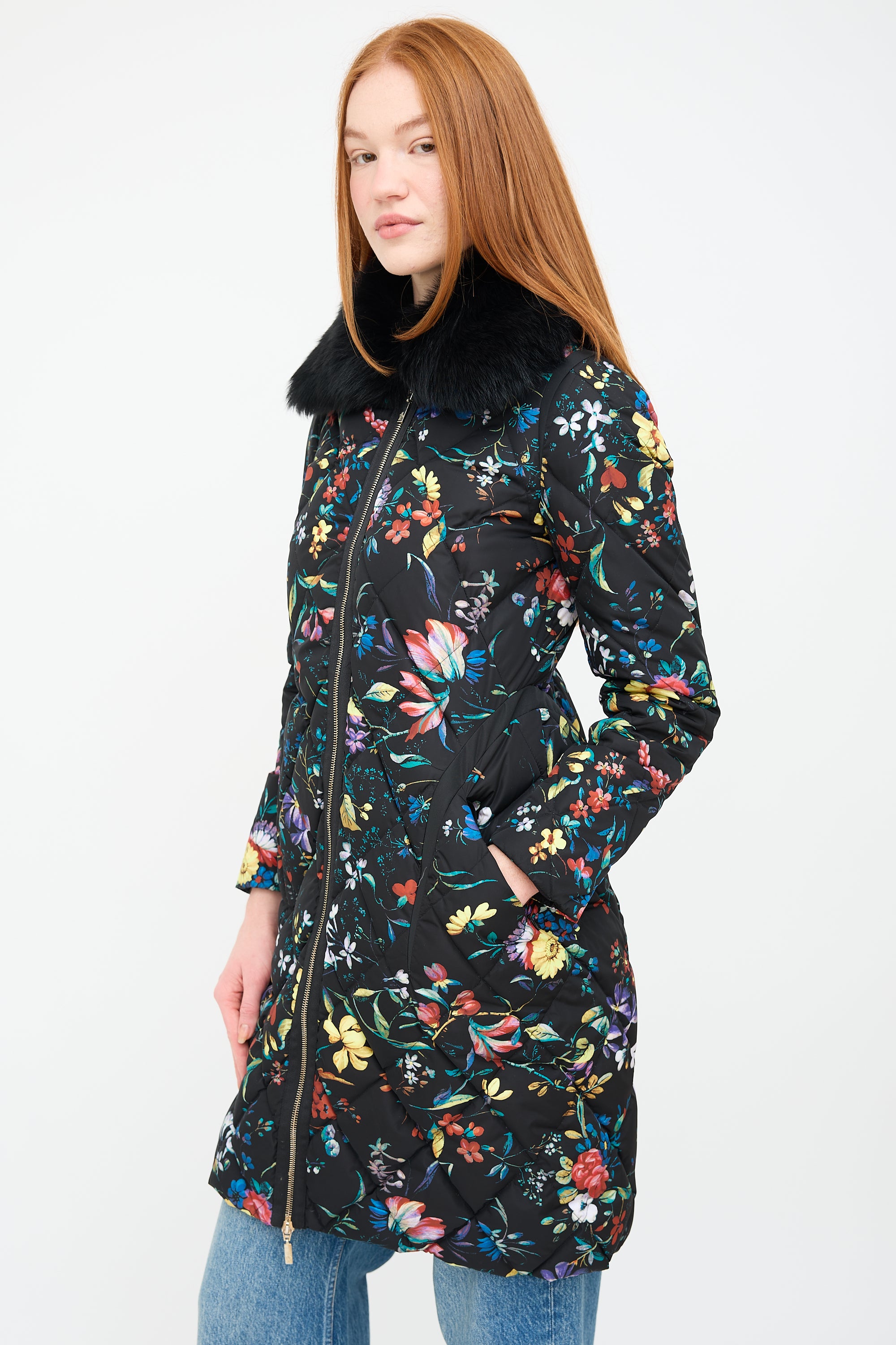 Pre-owned Moncler x Erdem black and multicolour floral coat featuring funnel collar with detachable black fur collar, zip up front, two zip pockets at sides, and one interior welt pocket. Lined.