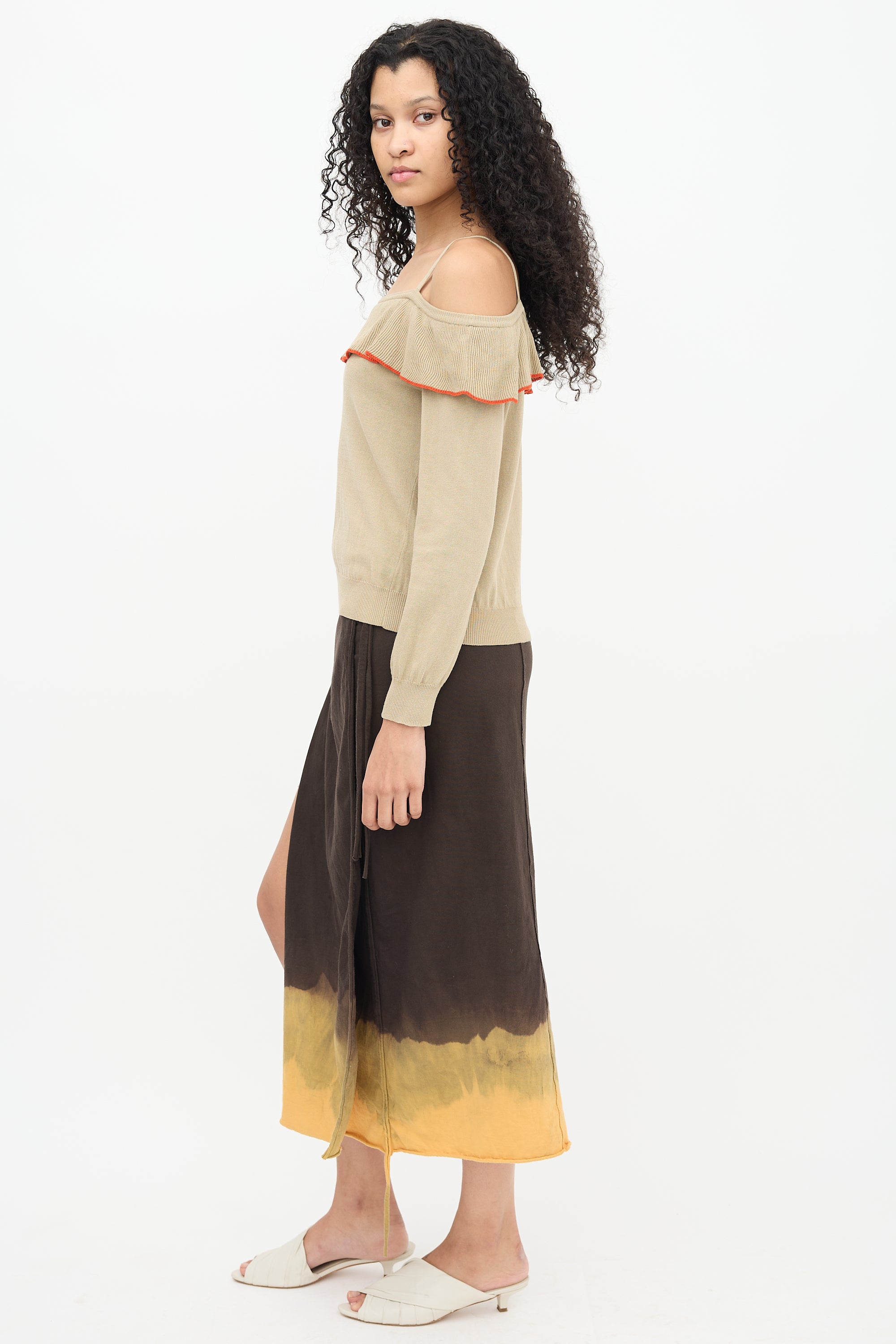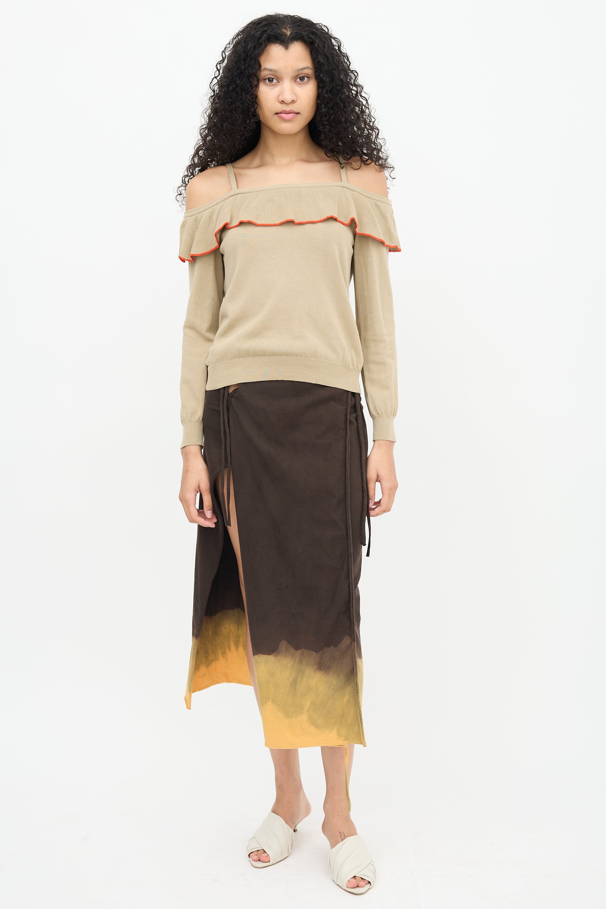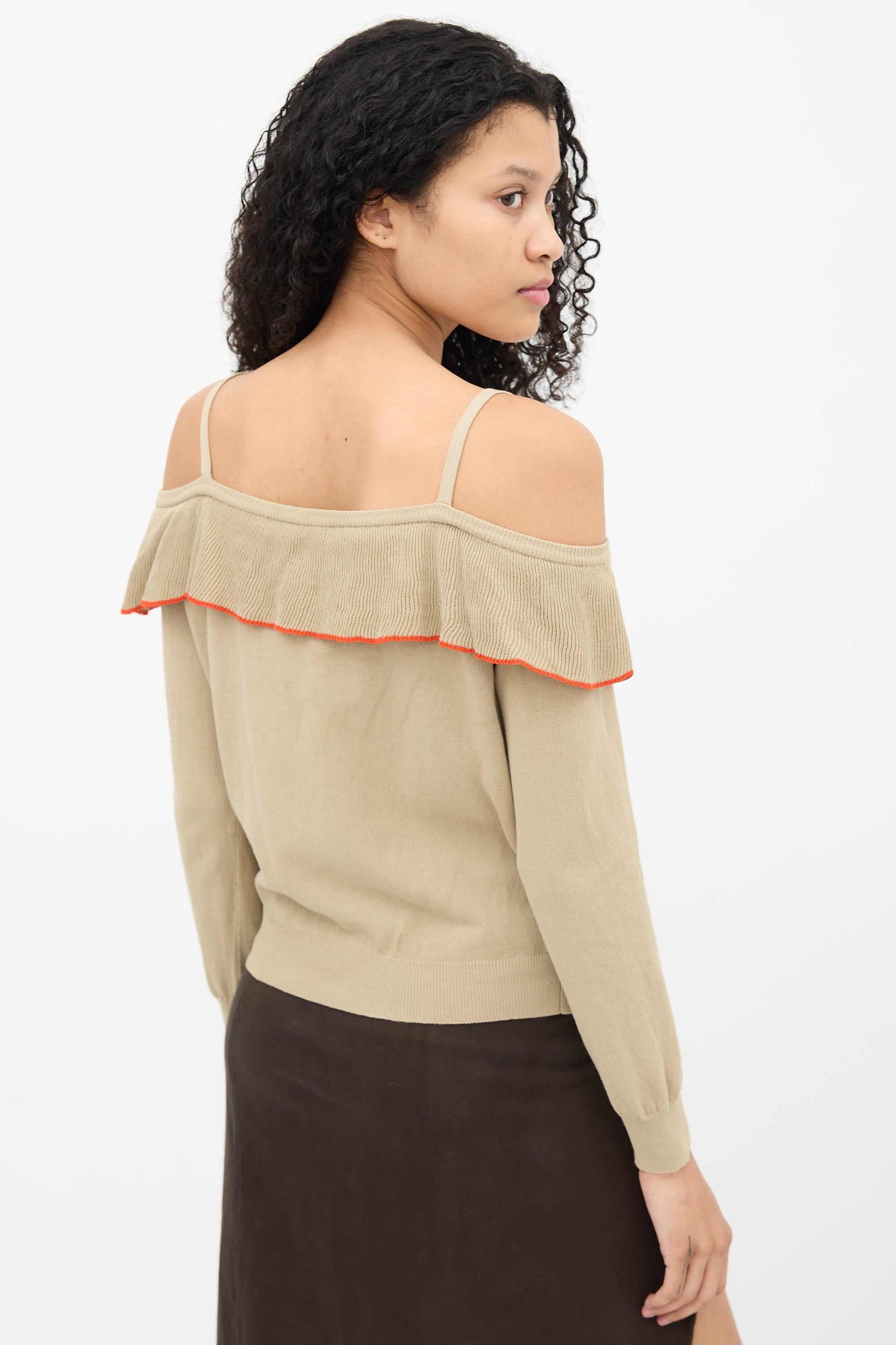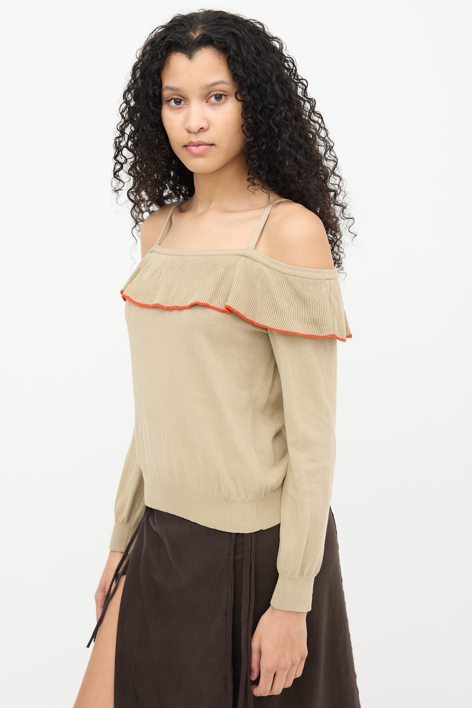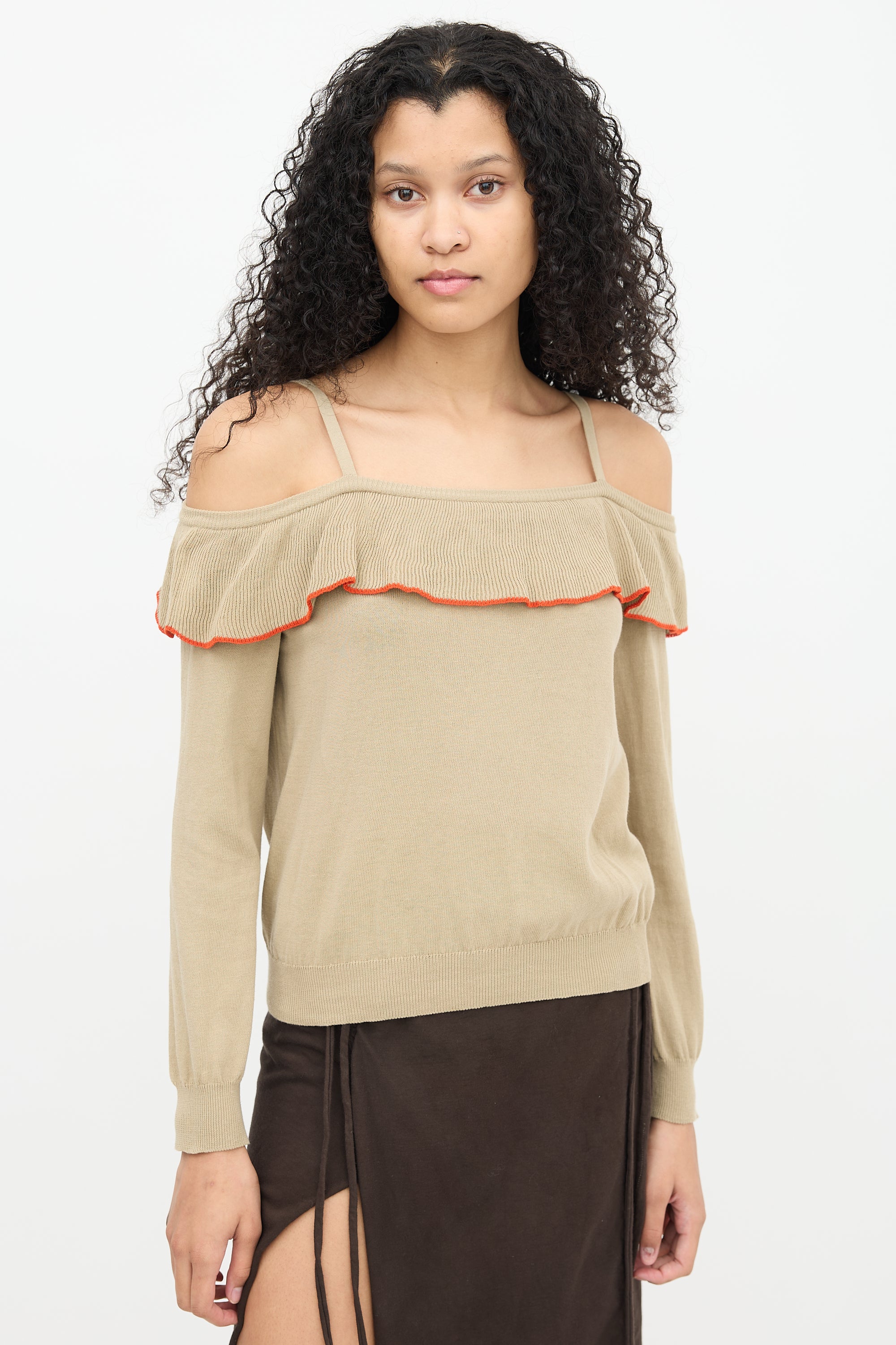 Pre-owned Moschino beige knit top featuring long sleeves with a cold shoulder design, ruffled bust with orange trim, and ribbed hem and cuffs.