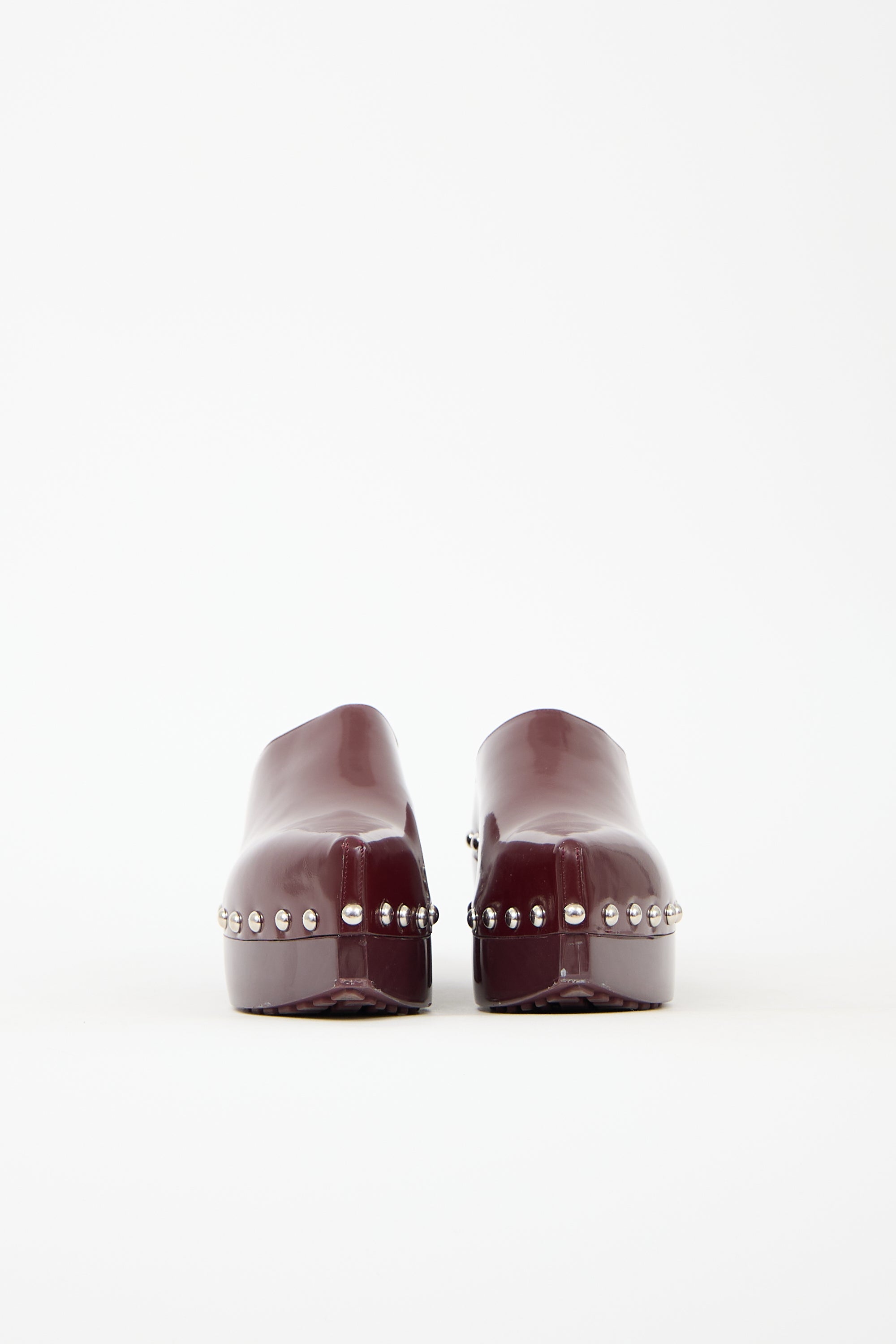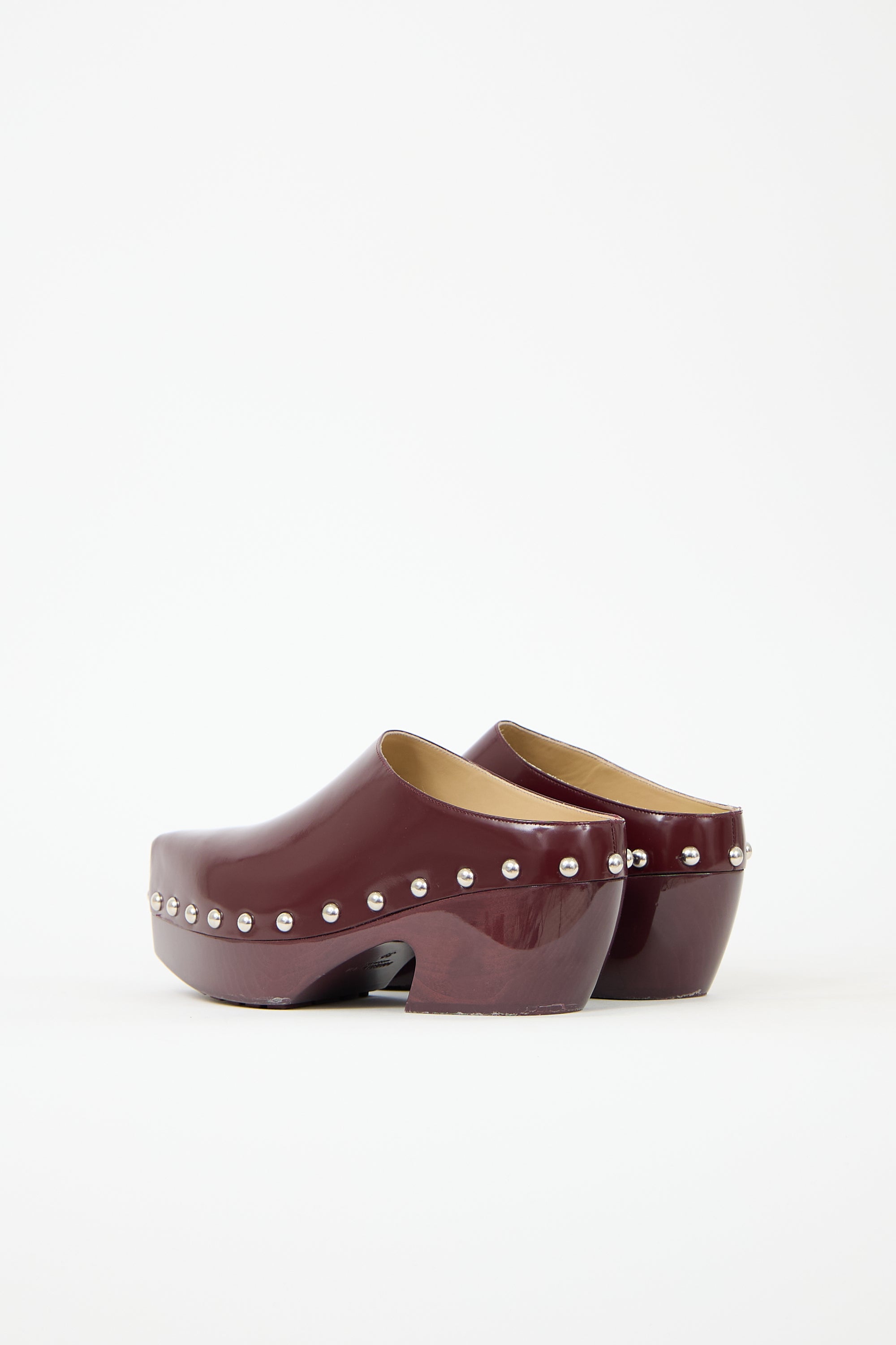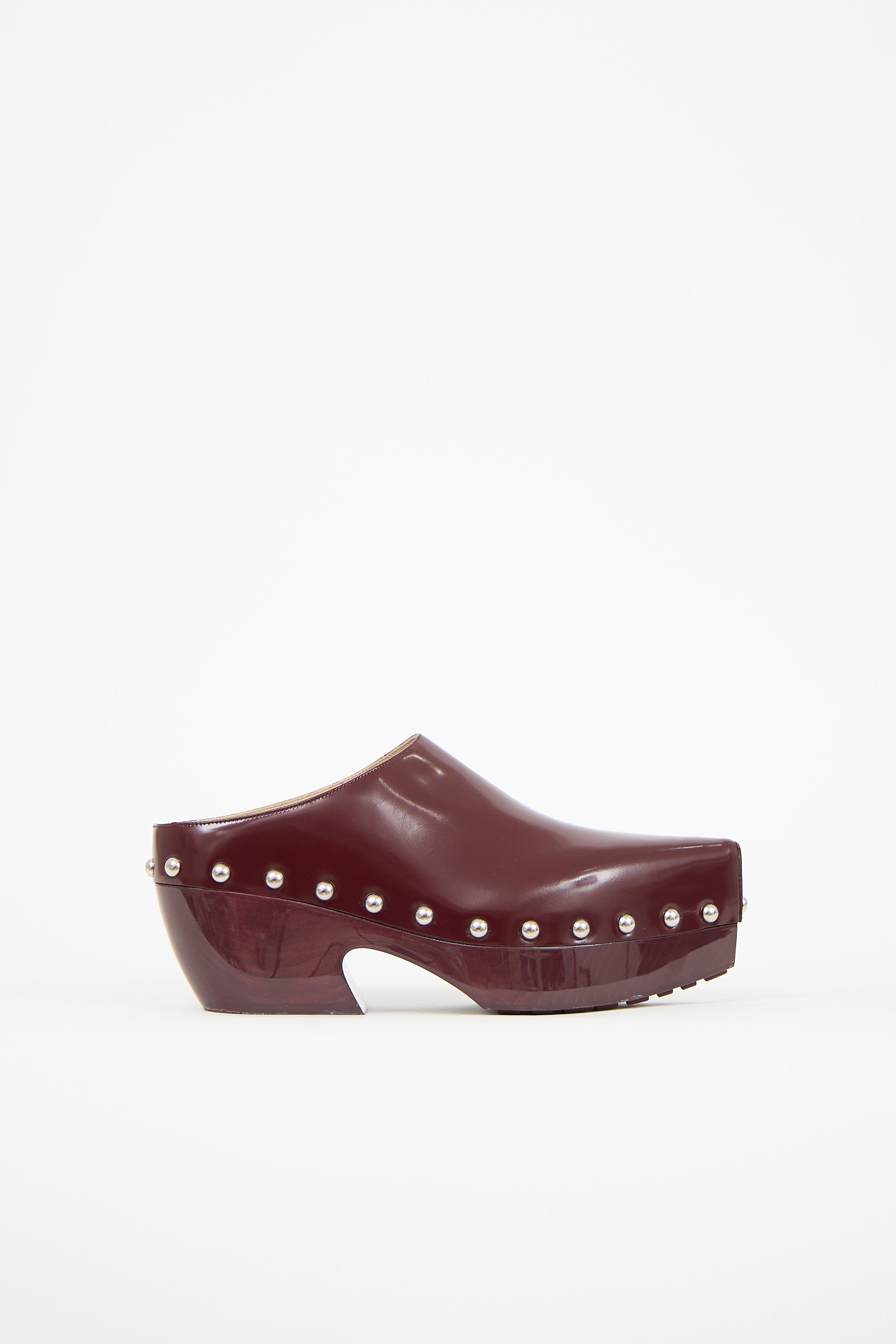 Pre-owned Bottega Veneta burgundy patent leather 60 clogs featuring pointed toe, slip on entry, silver tone studs along midsole, and stacked curve heel. Come with original dust bags.
